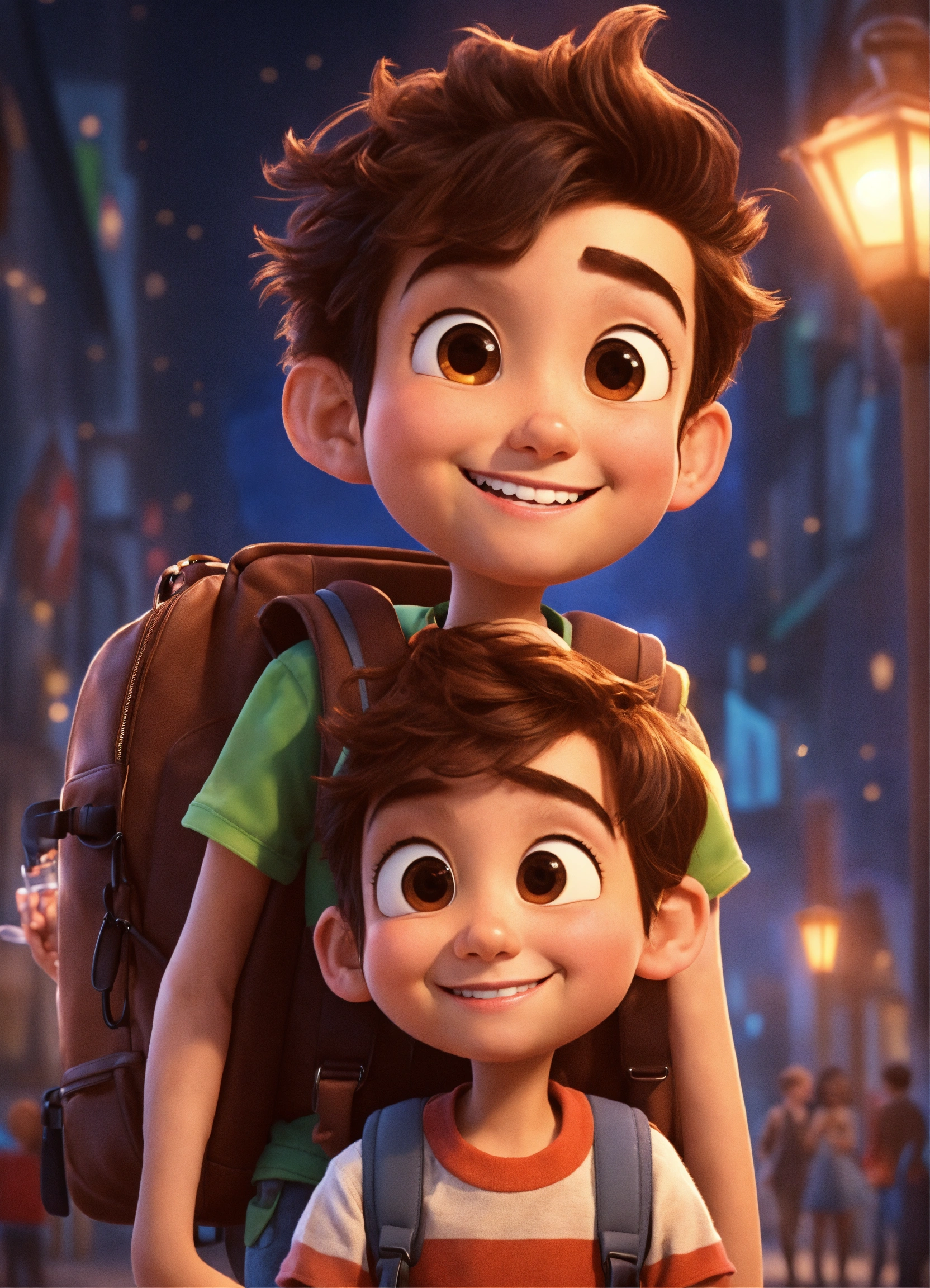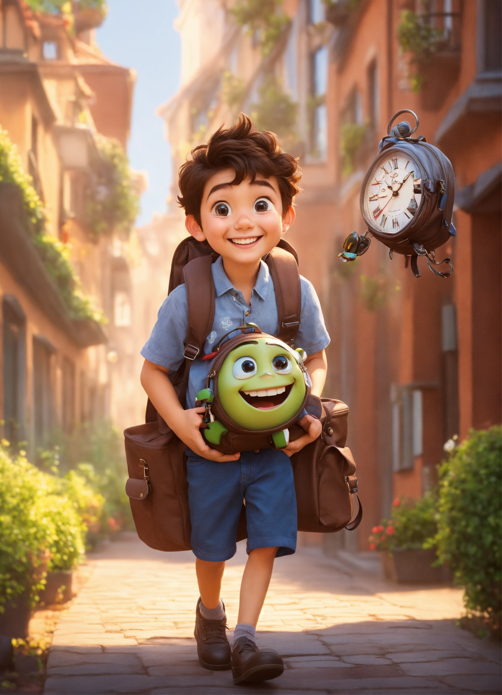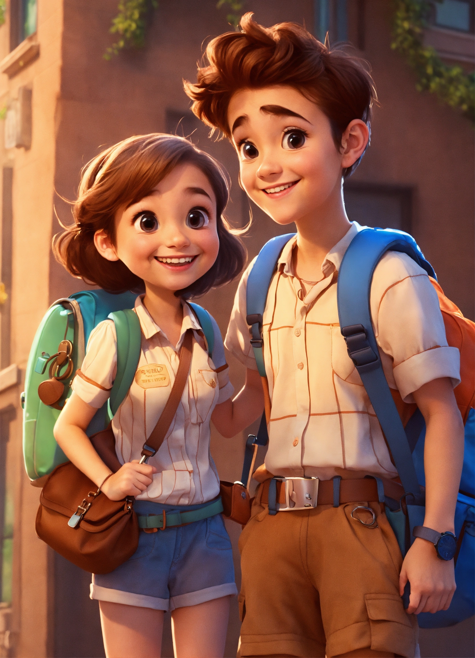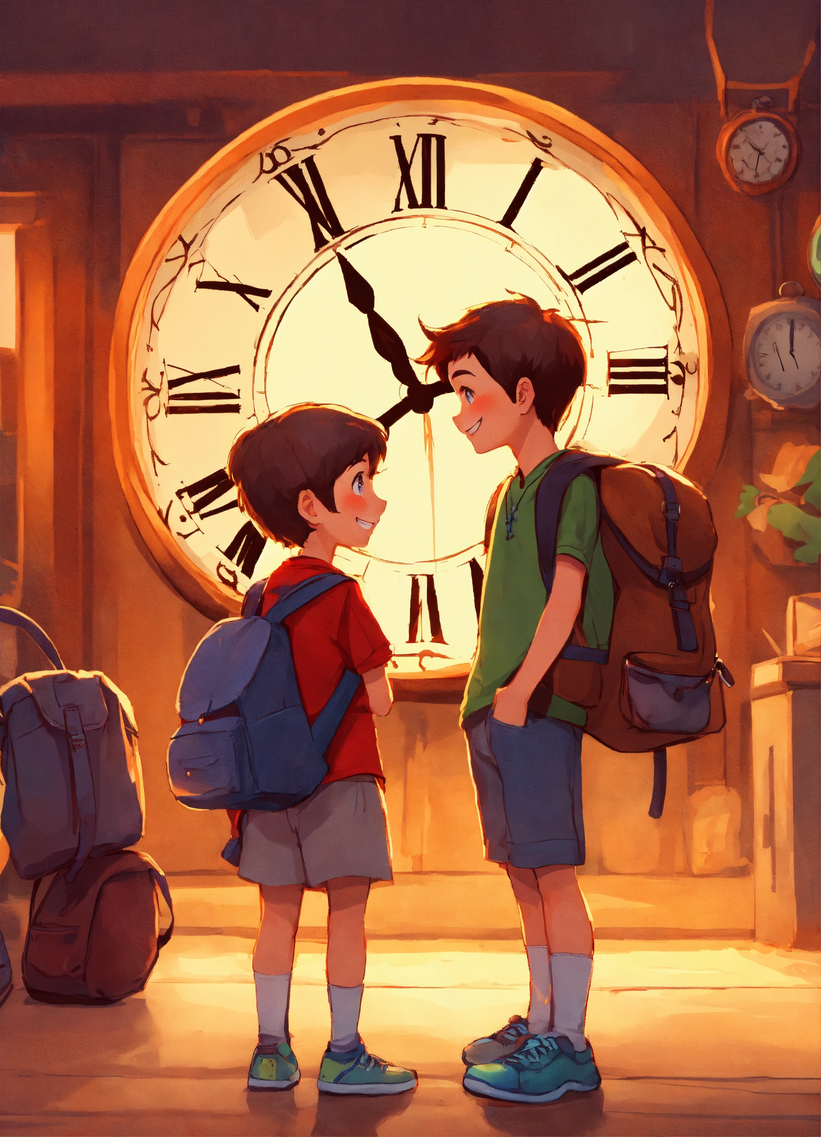 Cute boy smiling, bag on his back. next to him is a cute girl smiling, a bag on her back. holding a large clock watch. i want pixar style