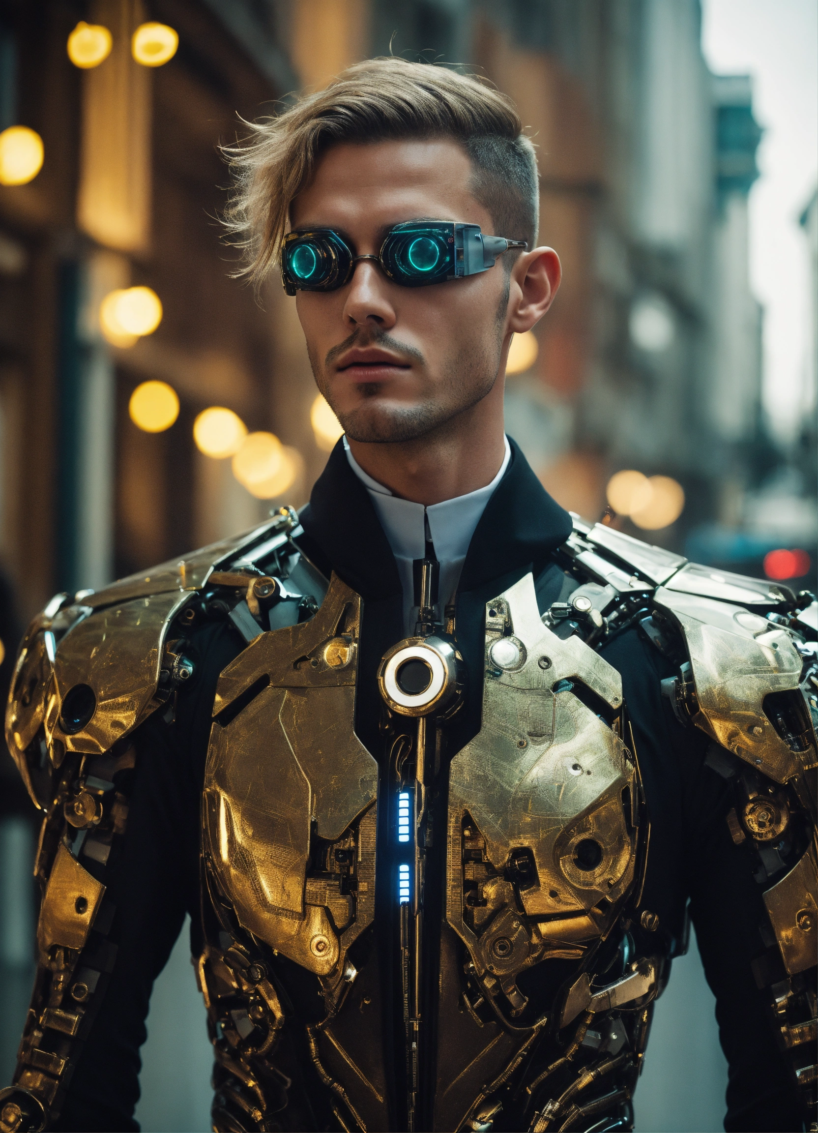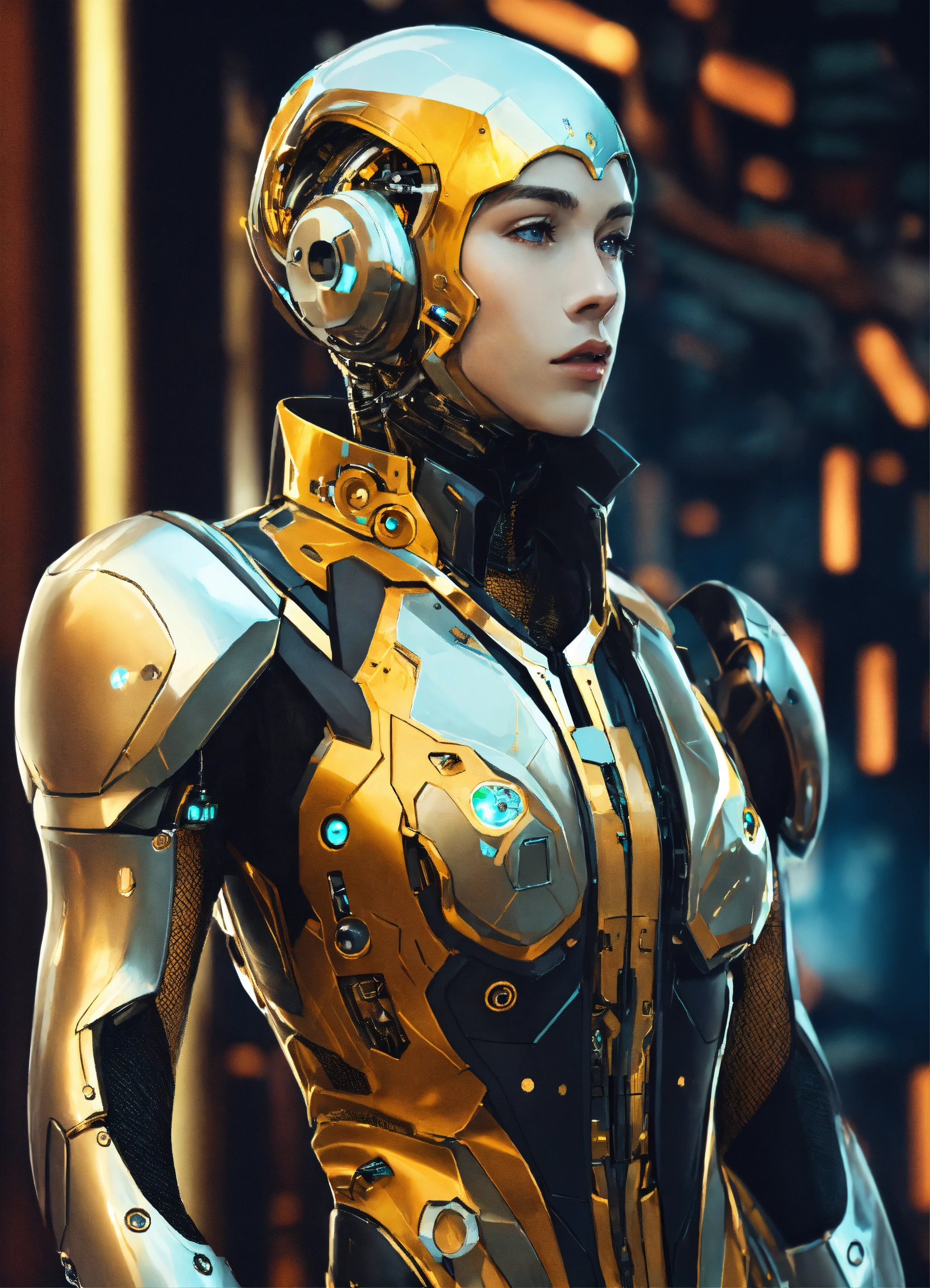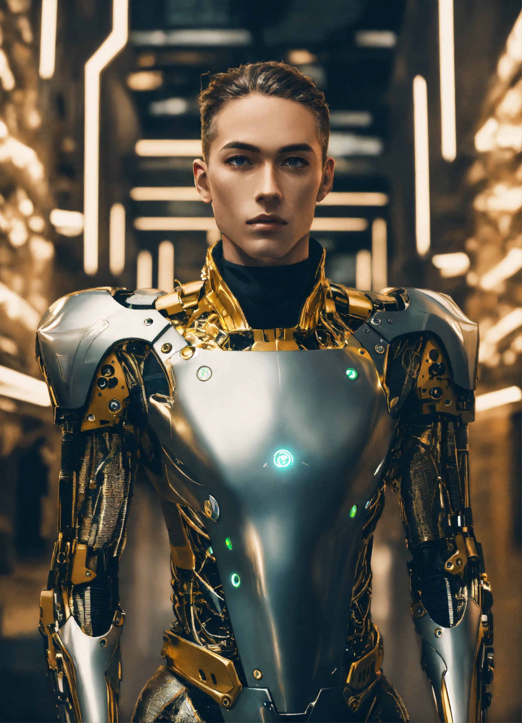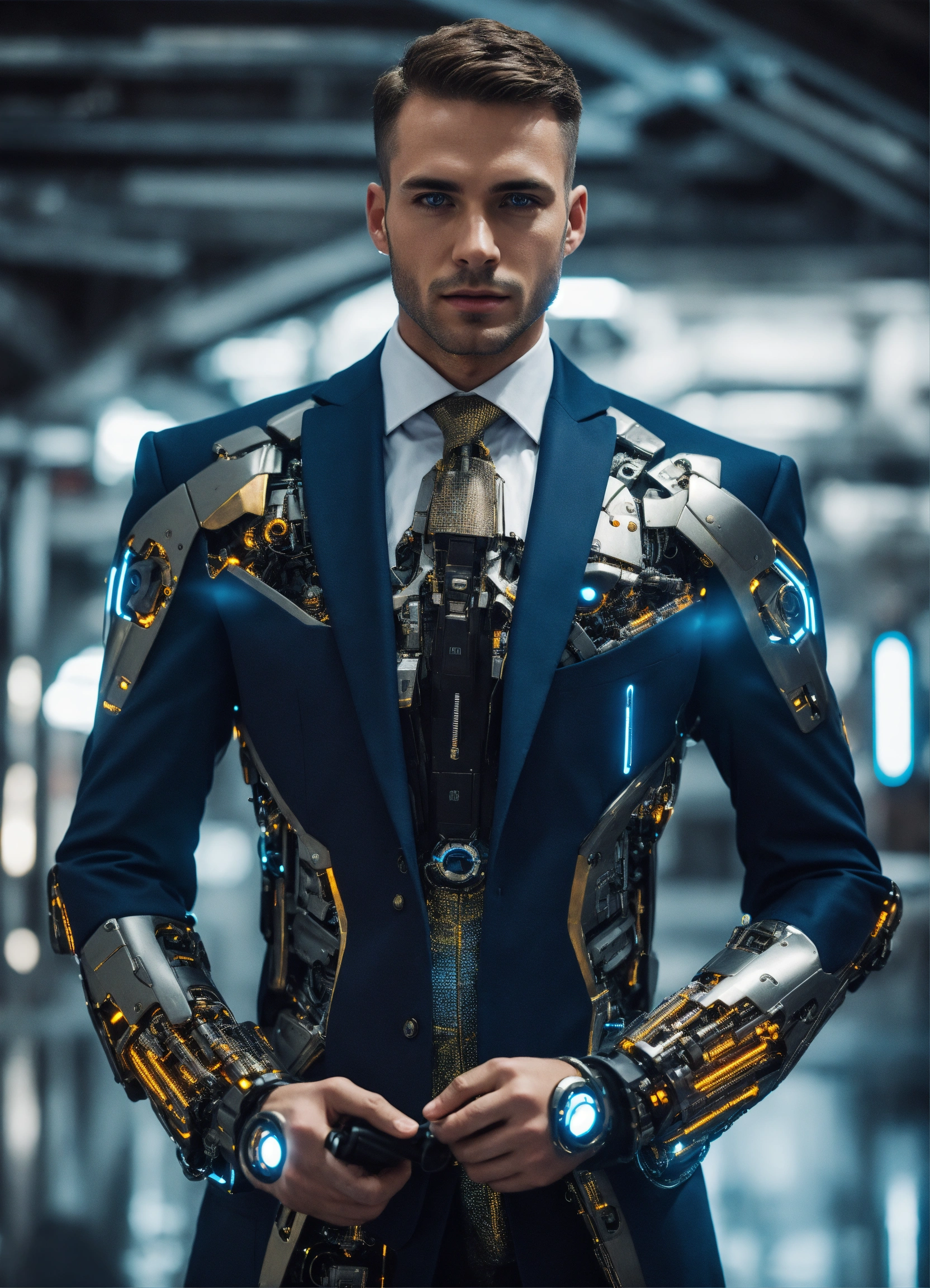 Beautiful futuristic men cyborg wear with an élégant suit and speak in front of you