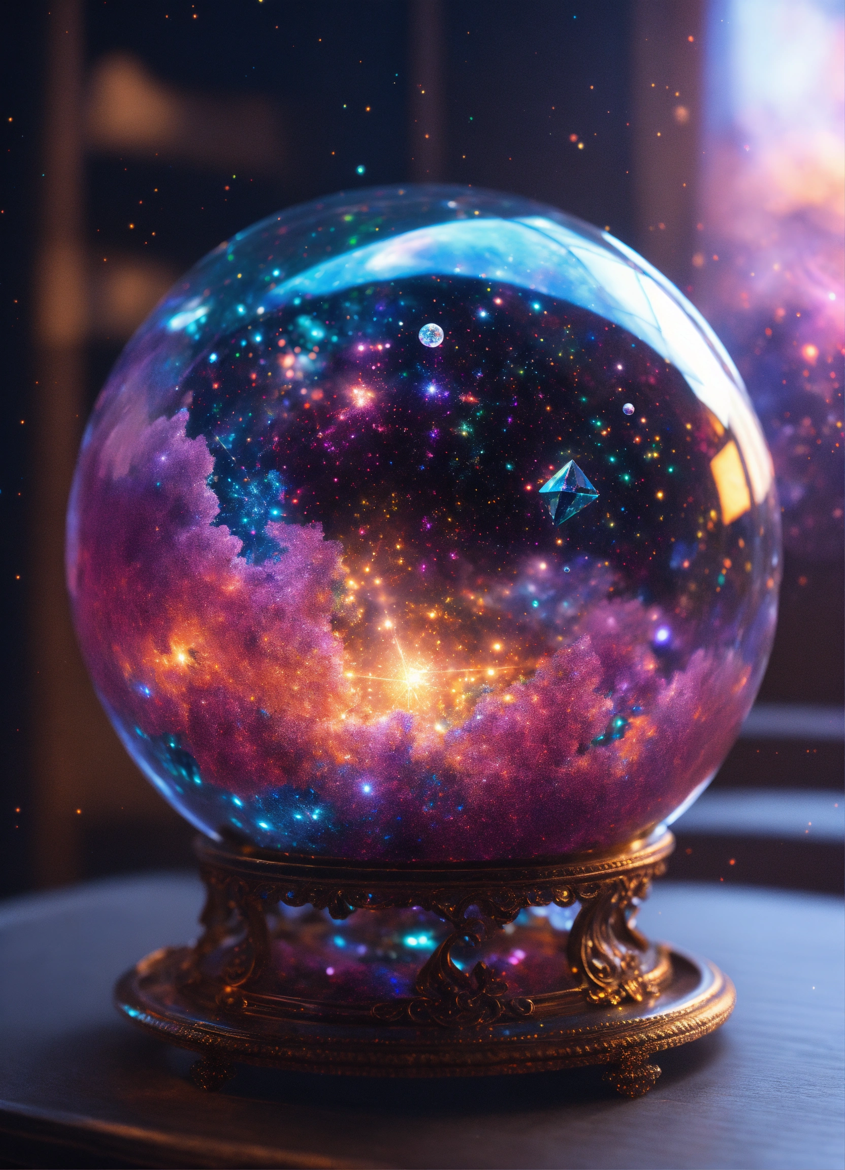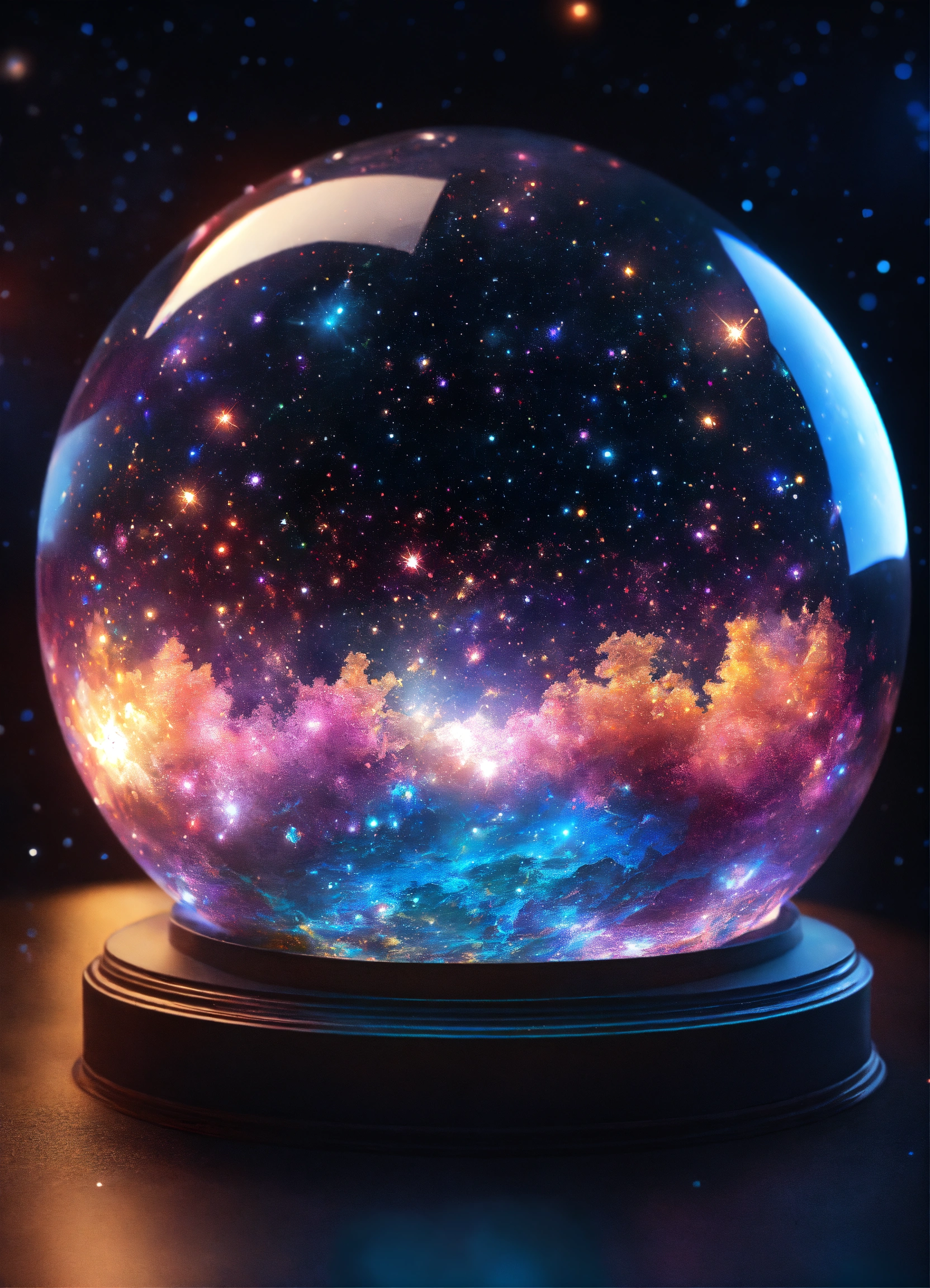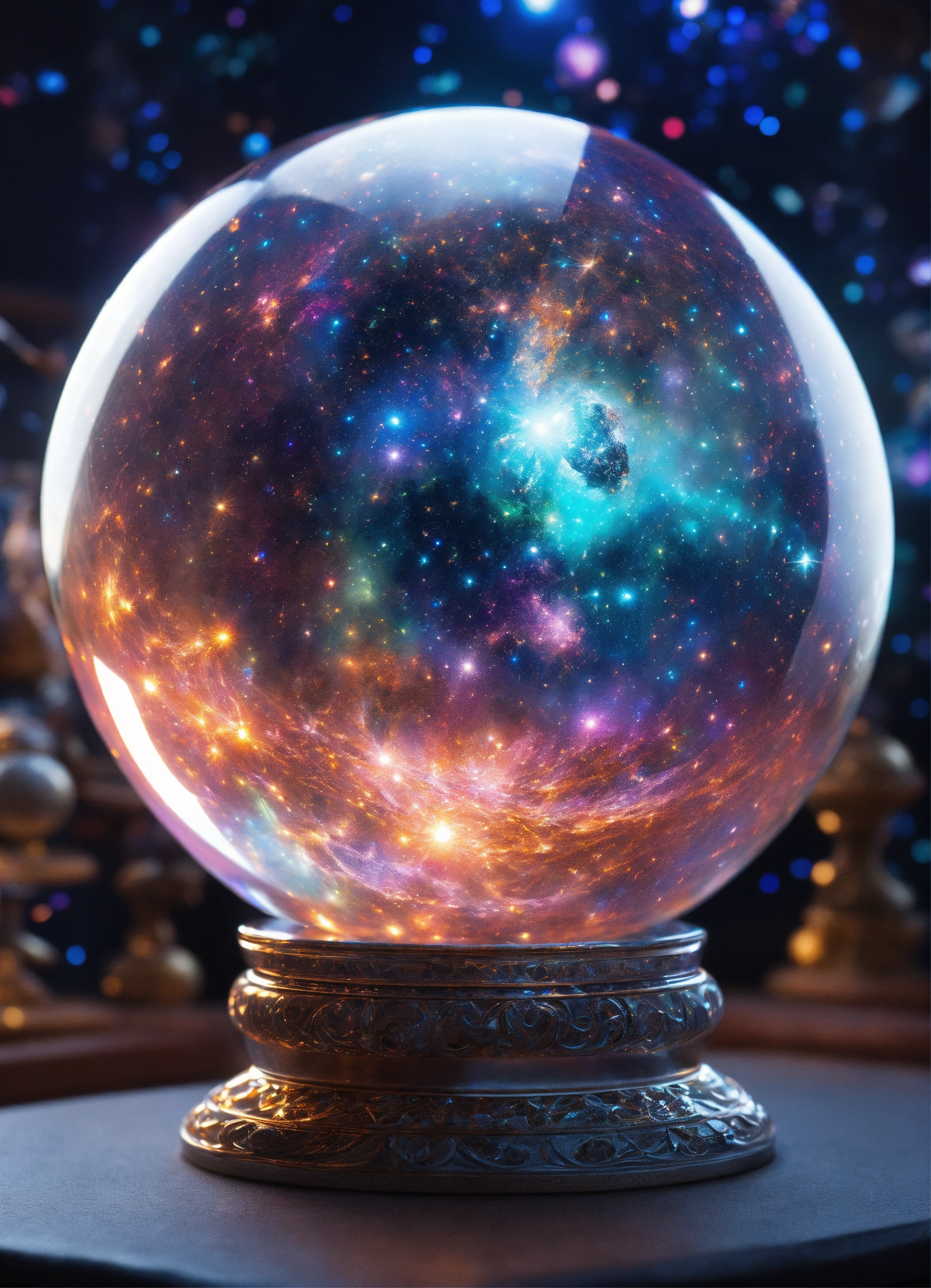 A hyperdetailed crystal sphere with a hyperdetailed universe in it, the universe glows in a holographic 3d effect full of stars