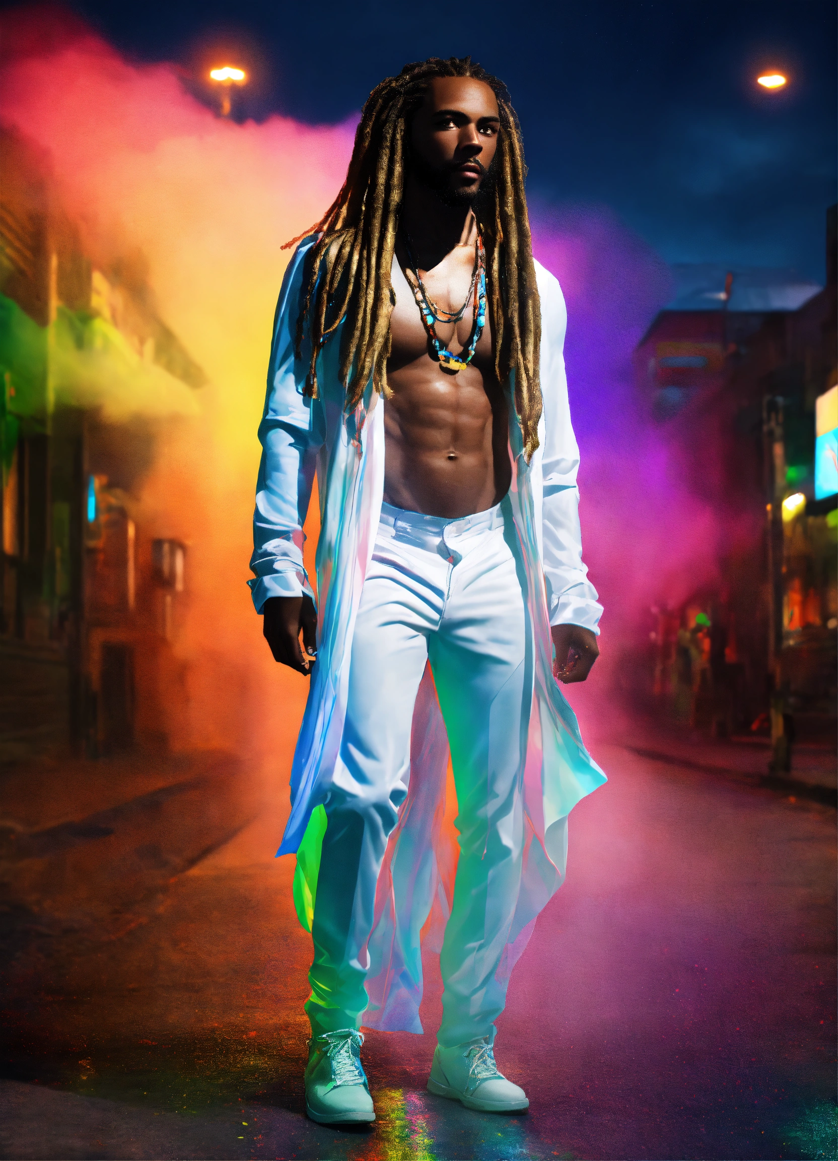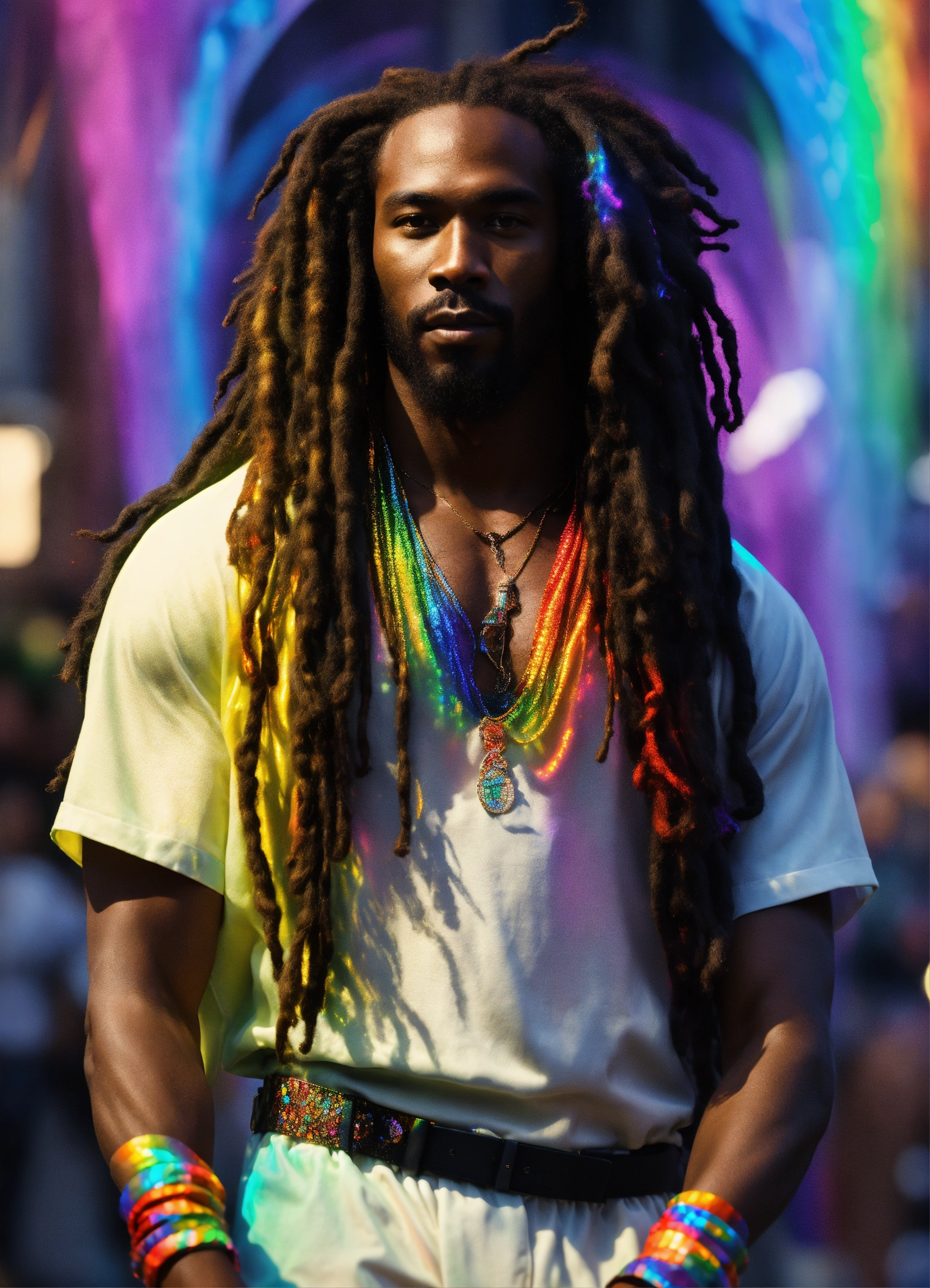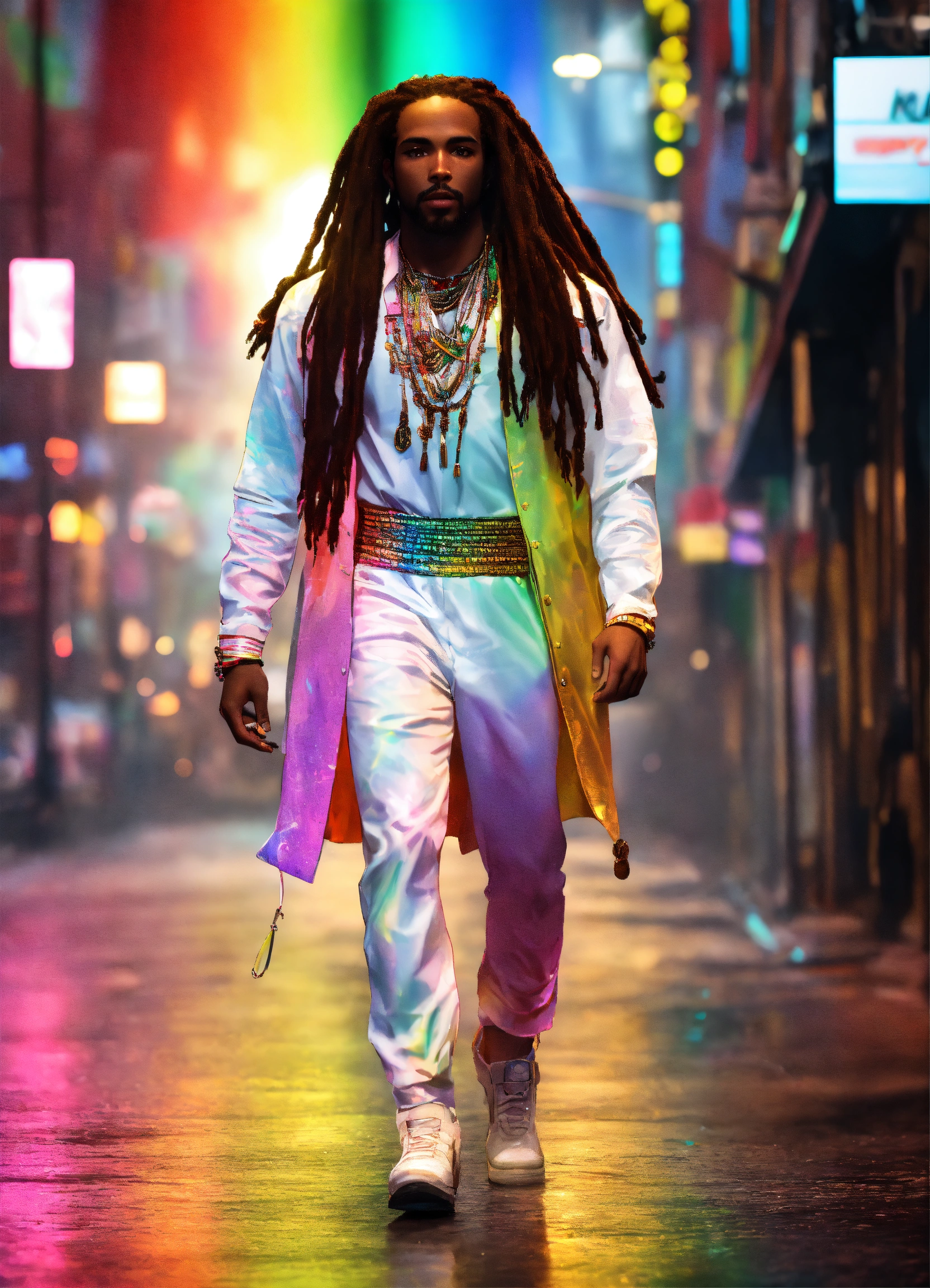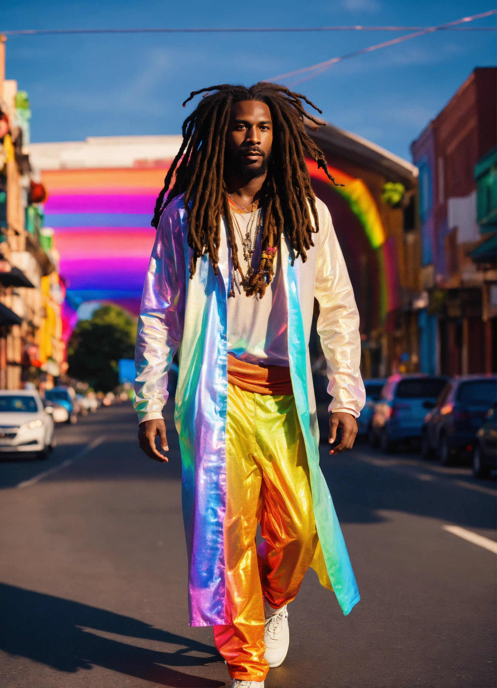 Hologram of a black man with long flowing dreadlocks, well-built, virile, 6' 5" tall, he has iridescent black skin that reflects all the colors of the rainbow, full body shot, striding up the street confidently, looking directly into camera, wearing white iridescent clothing, african style iridescent clothing that reflects all the colors of the rainbow, 3d render