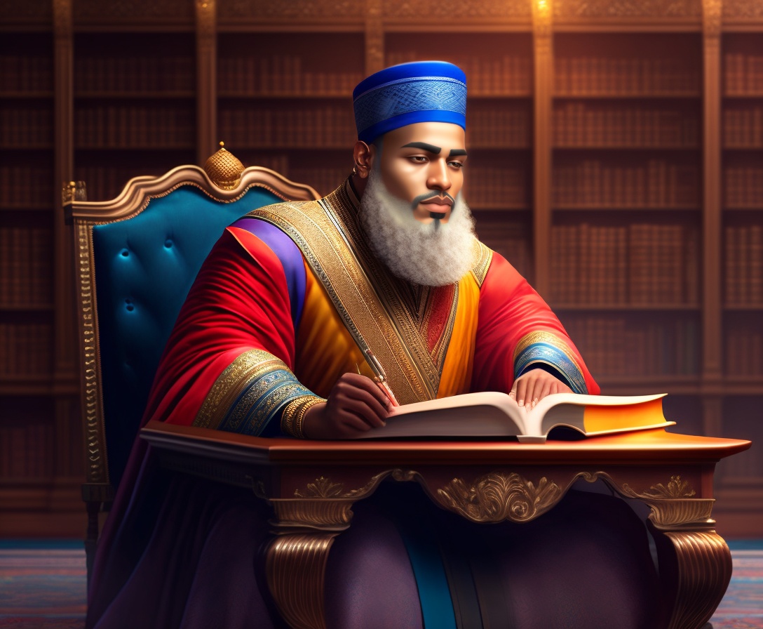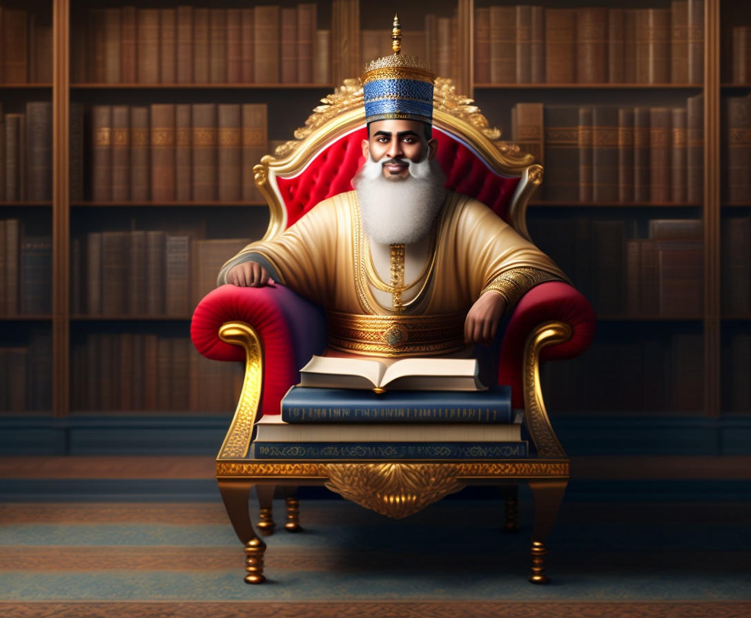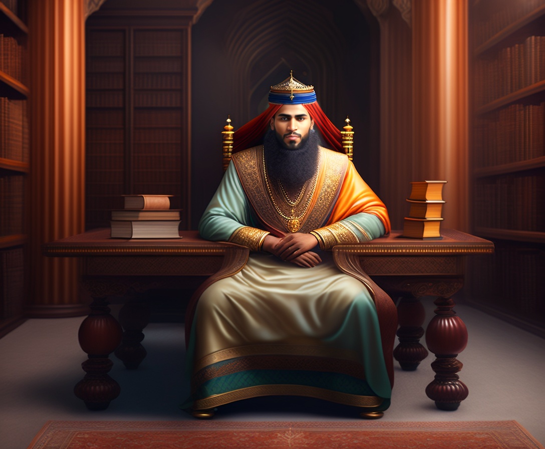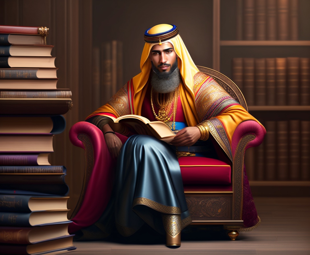Portrait of a muslim king man sitting on a chair with table of islamic books