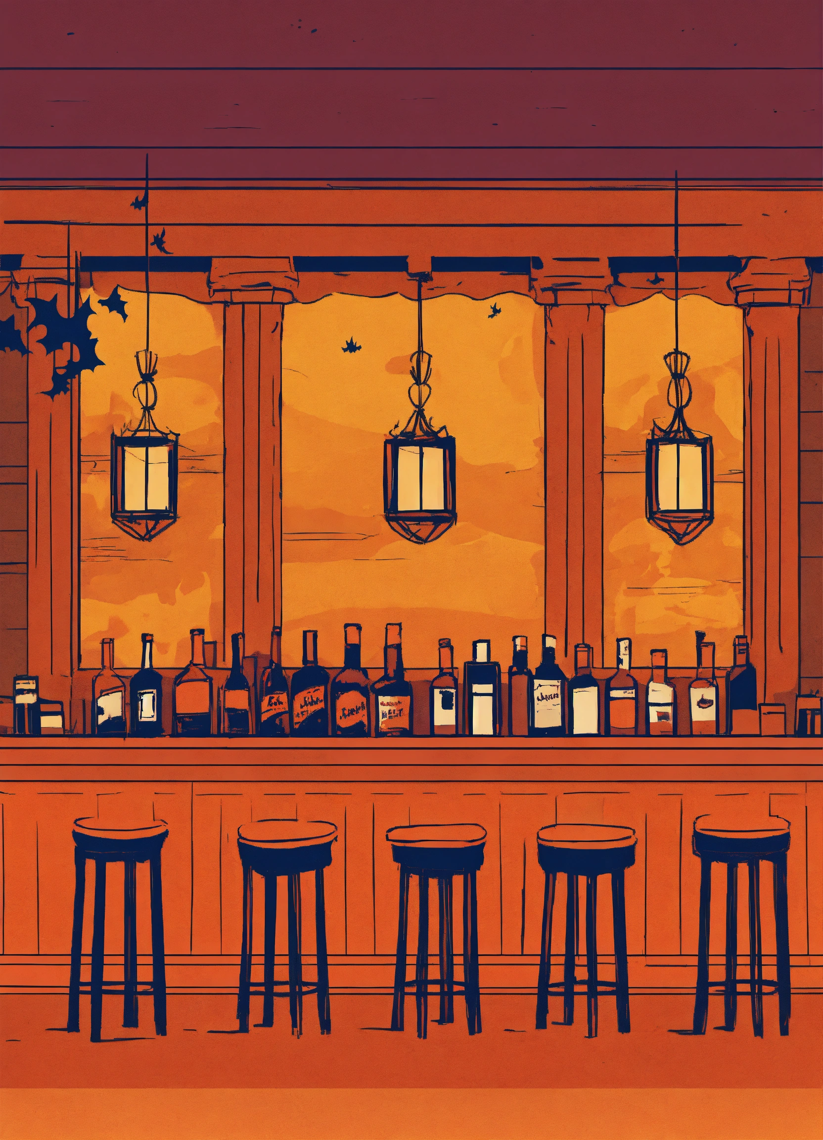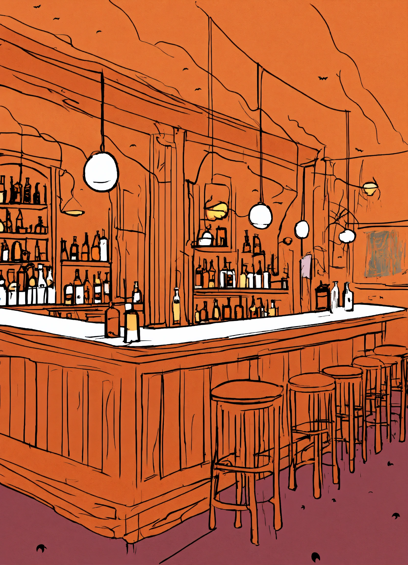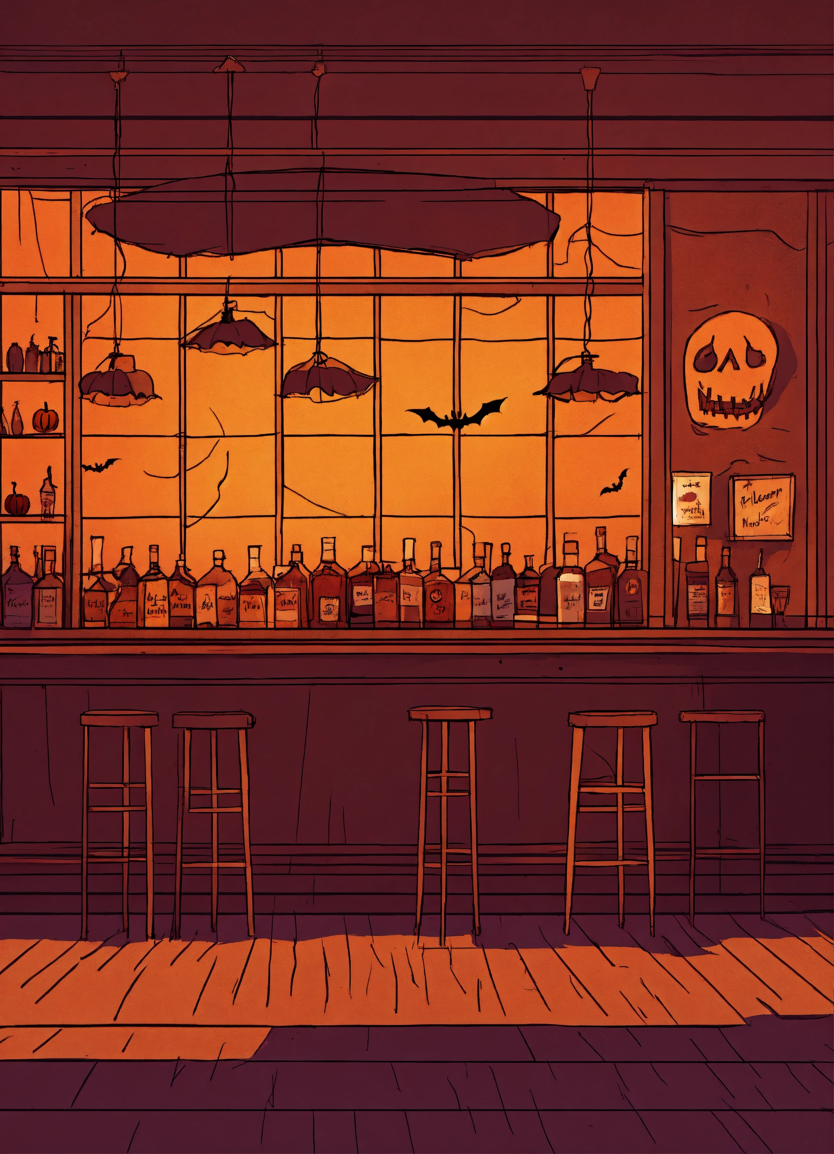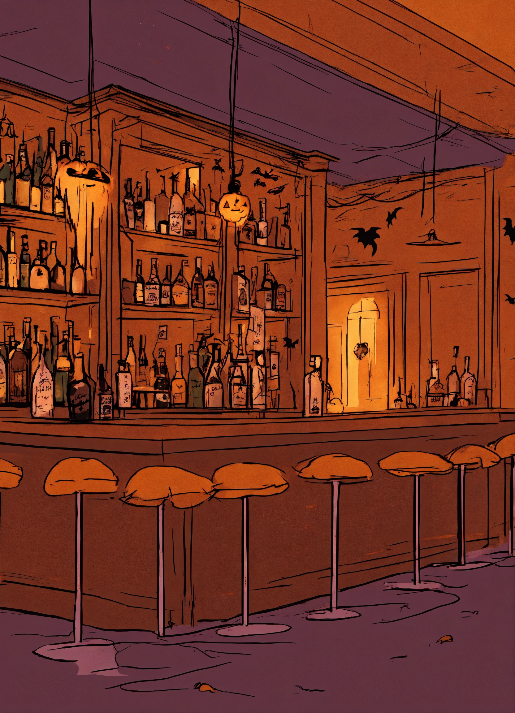 Minimalist sketch of a haunted bar during halloween. creep, spooky, haunted, ghoulish, greg rutkowski, autumn, fall, halloween, scary
