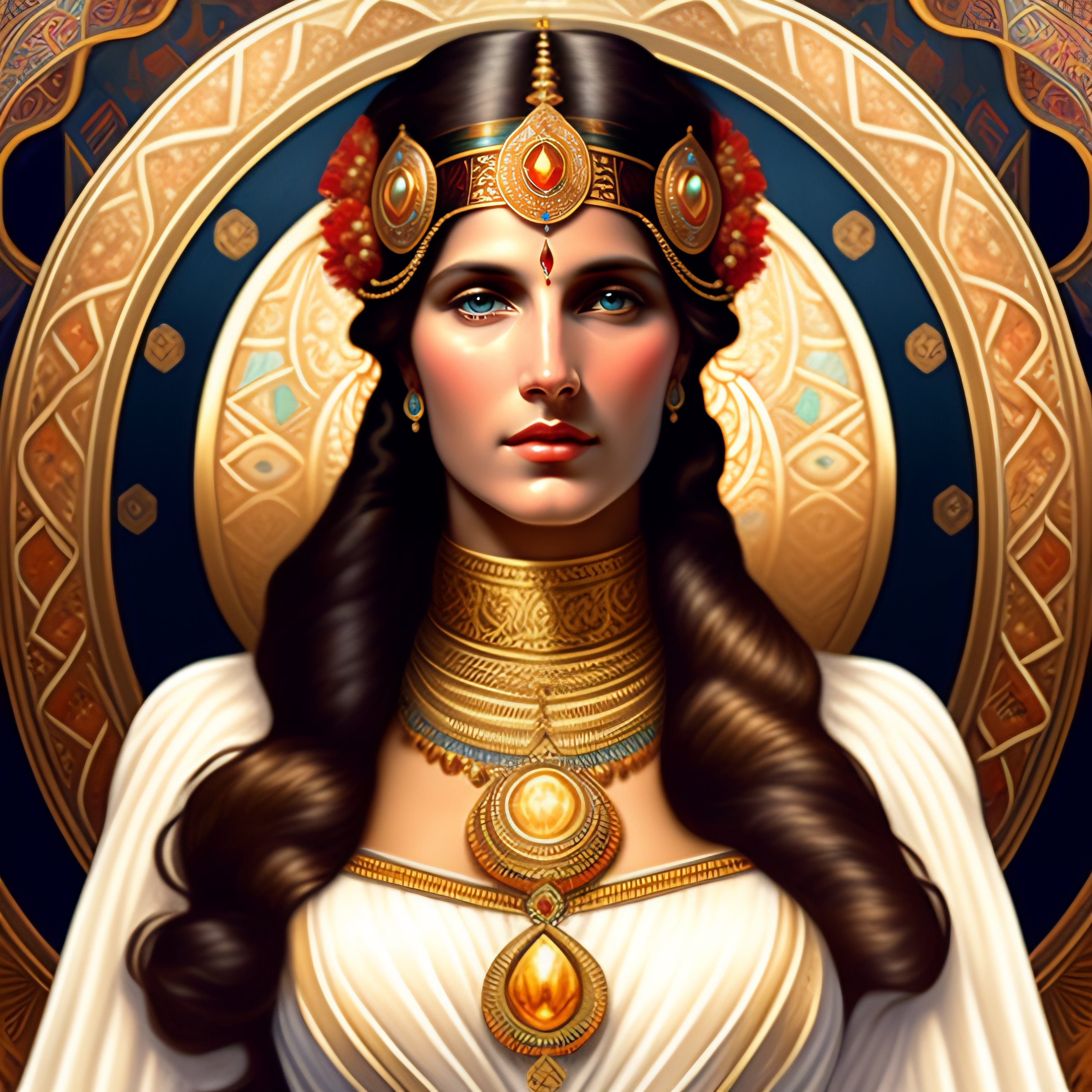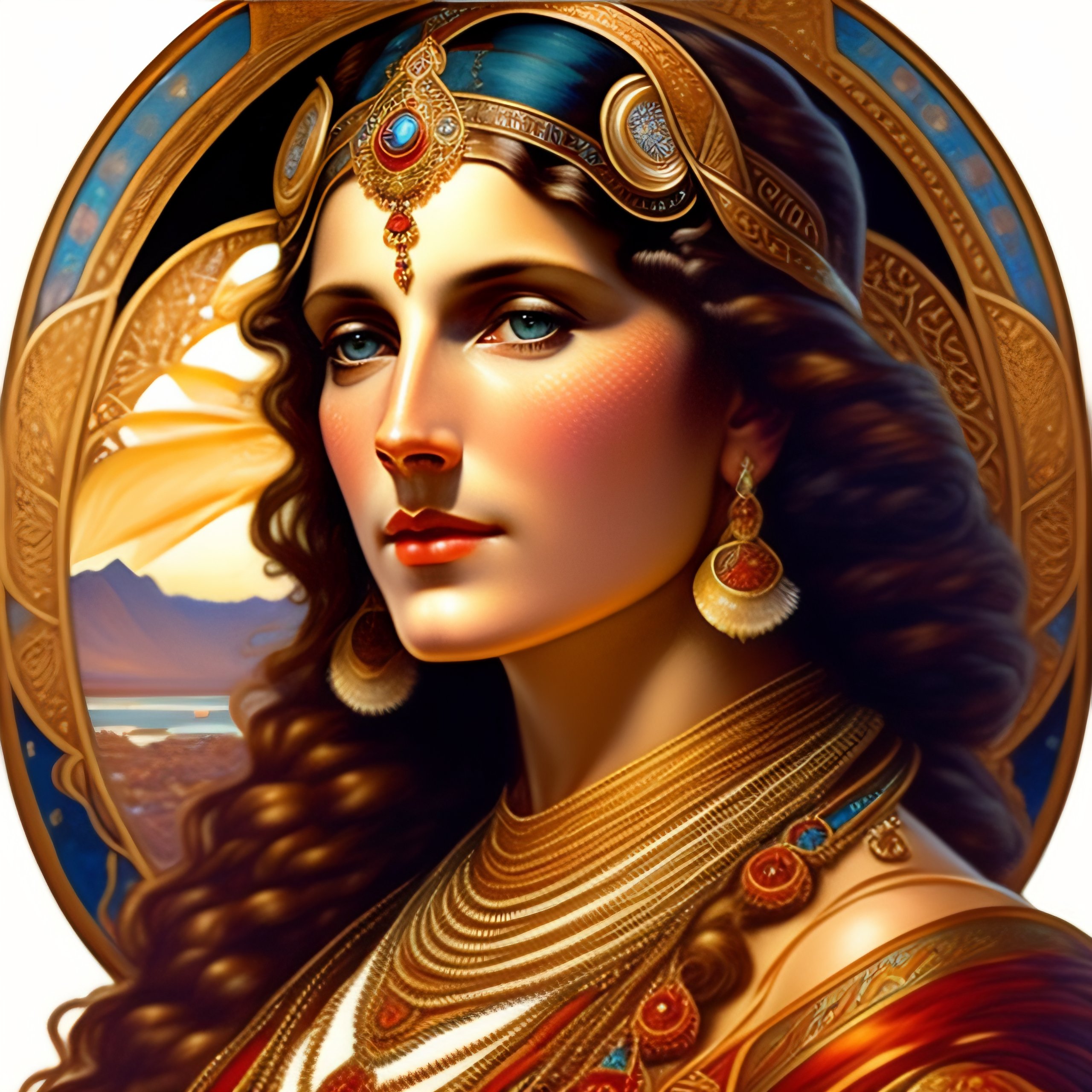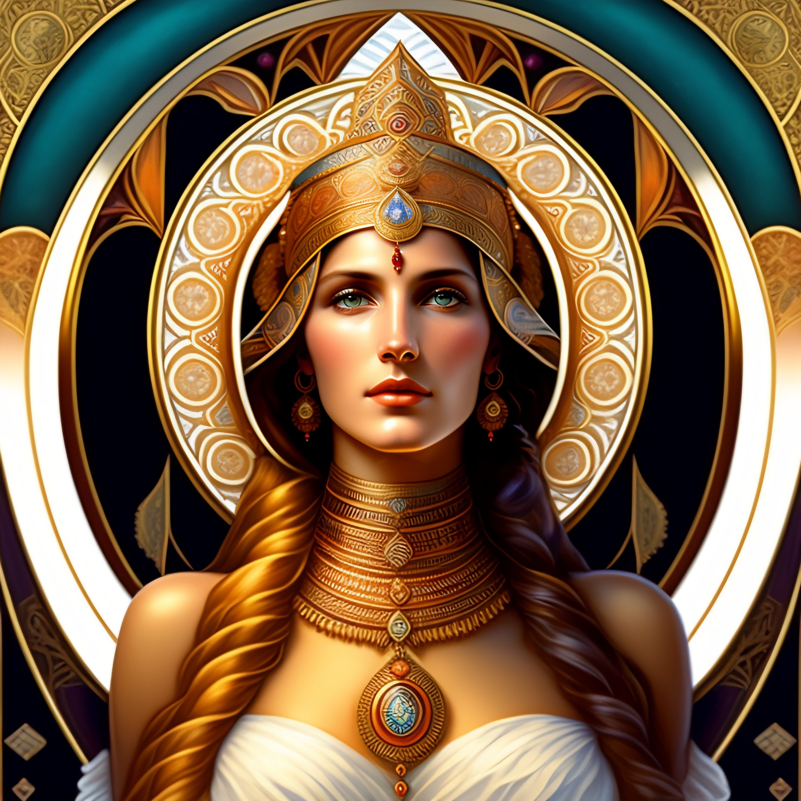 Portrait of a beautiful white woman indian jewelry wearing ironman suit surrounded by sky by alphonse mucha, art art nouveau, detailed, intricate, 8k, quality, masterpiece, artwork, flat colors