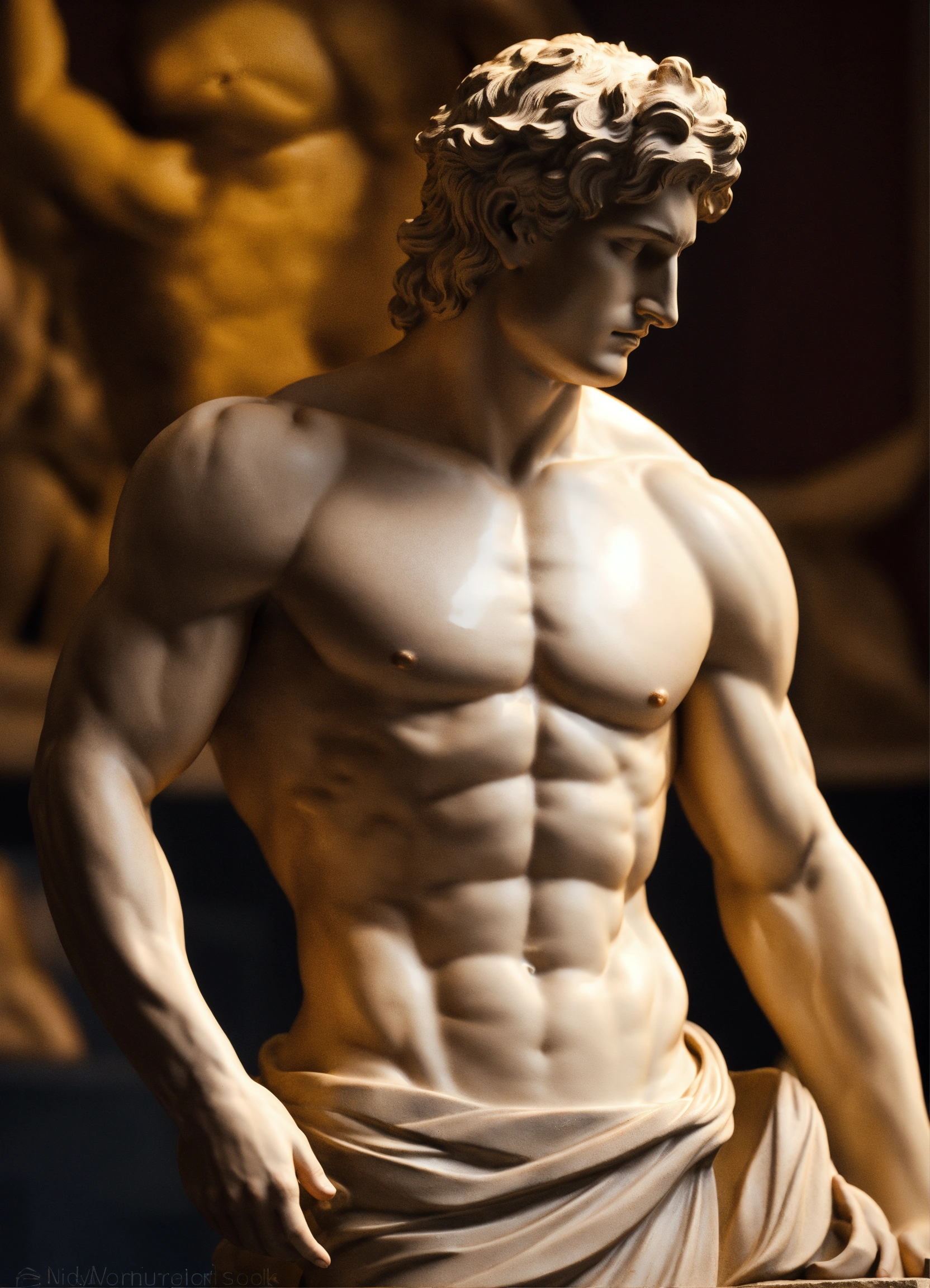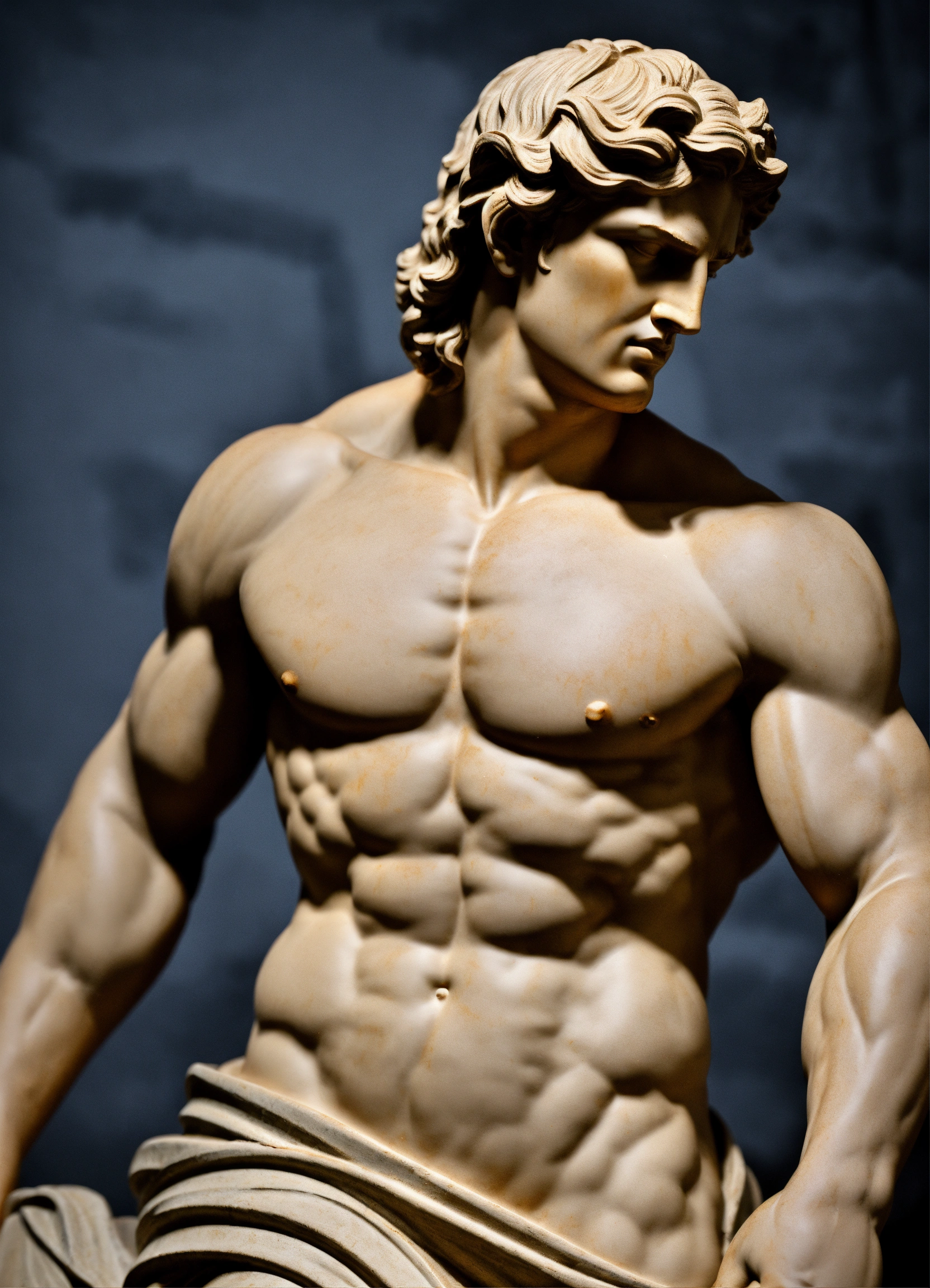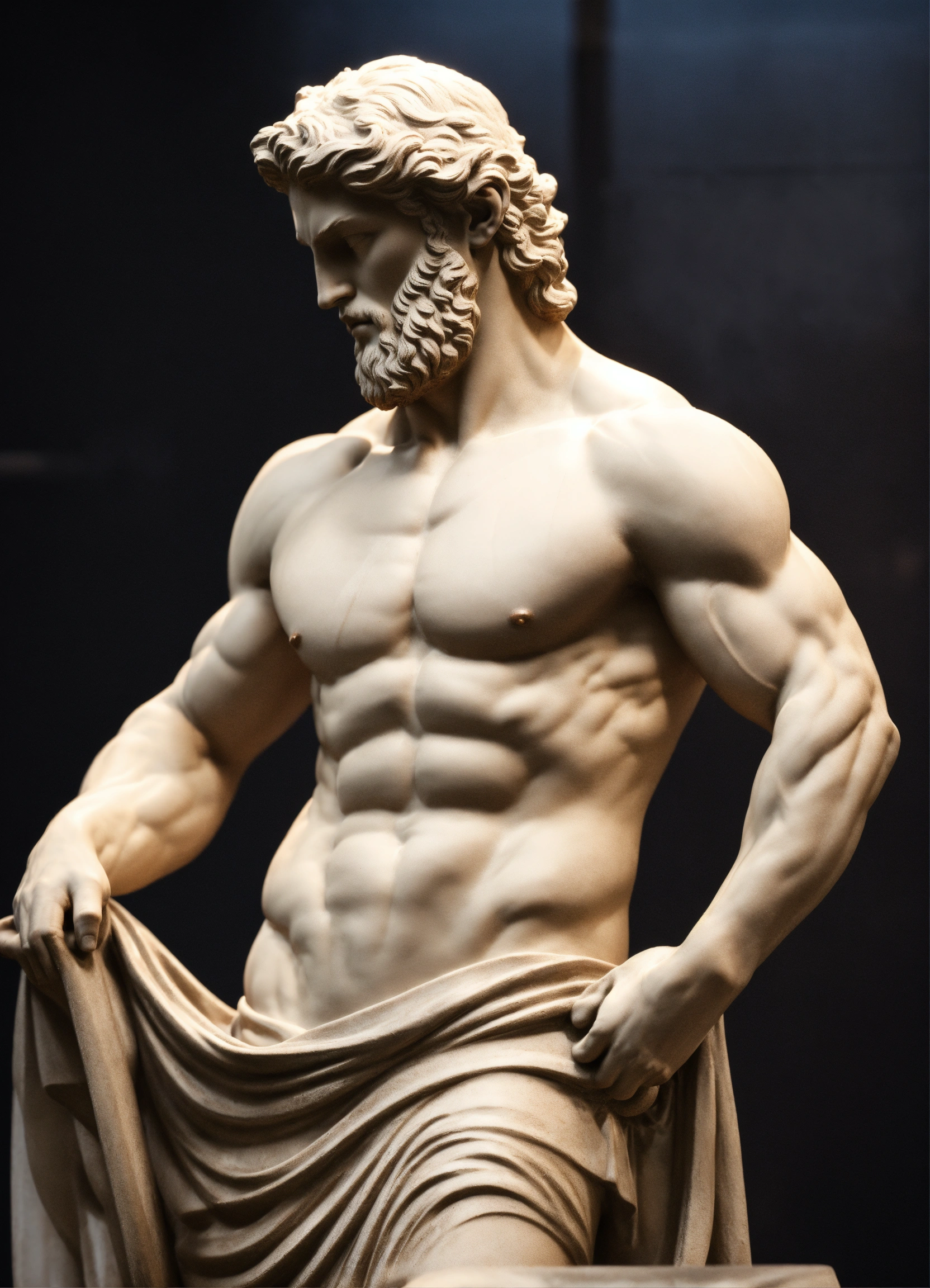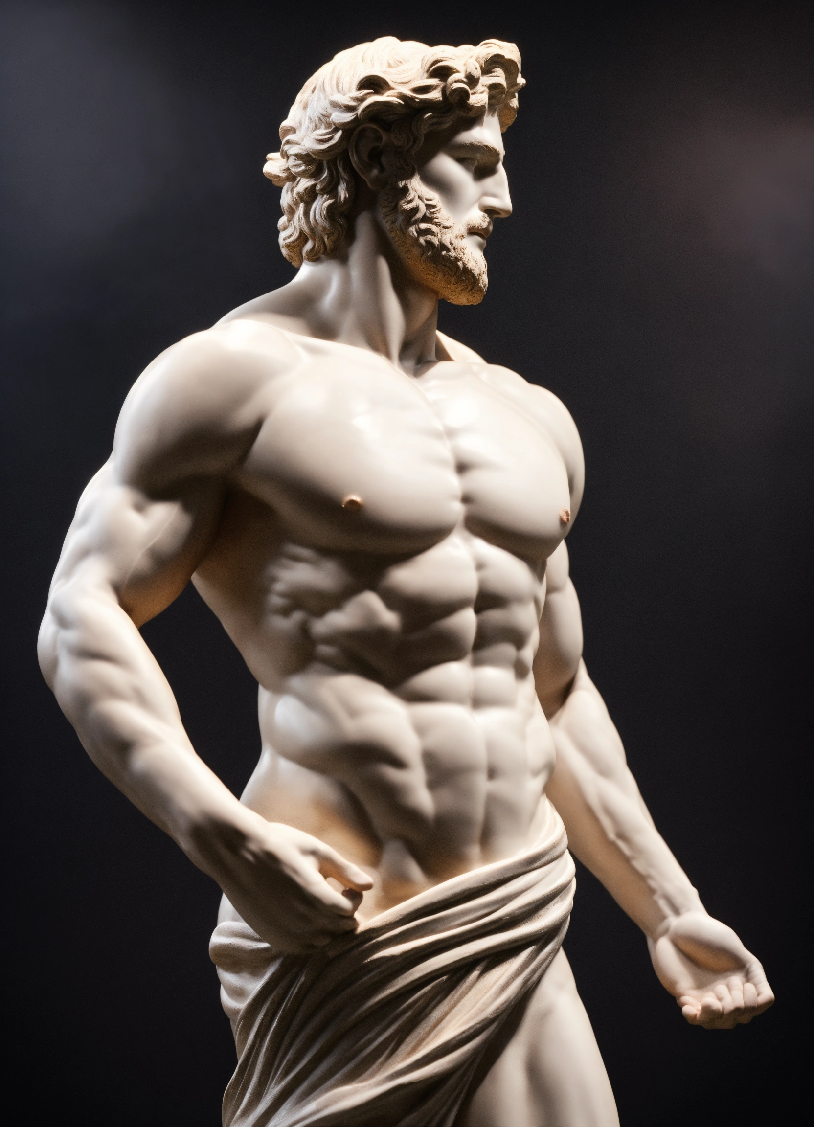 Simple muscular greek god statue with middelparting hair with white boddy with dark backround back position
