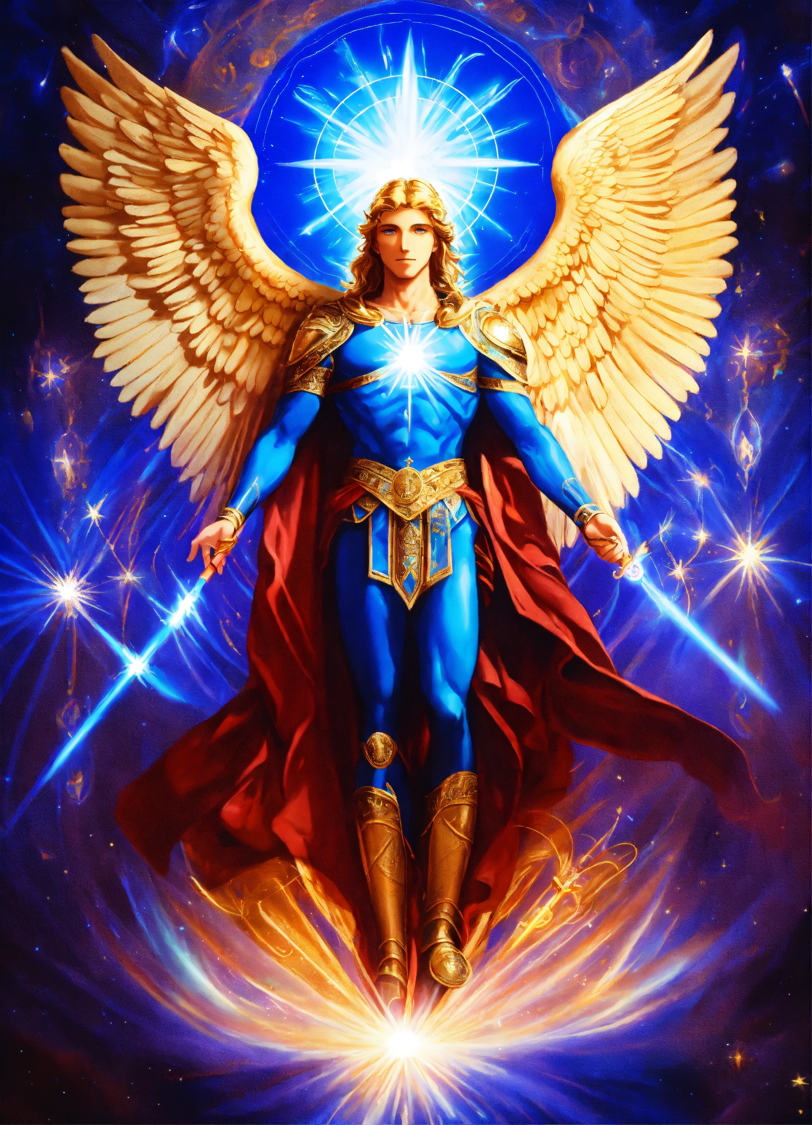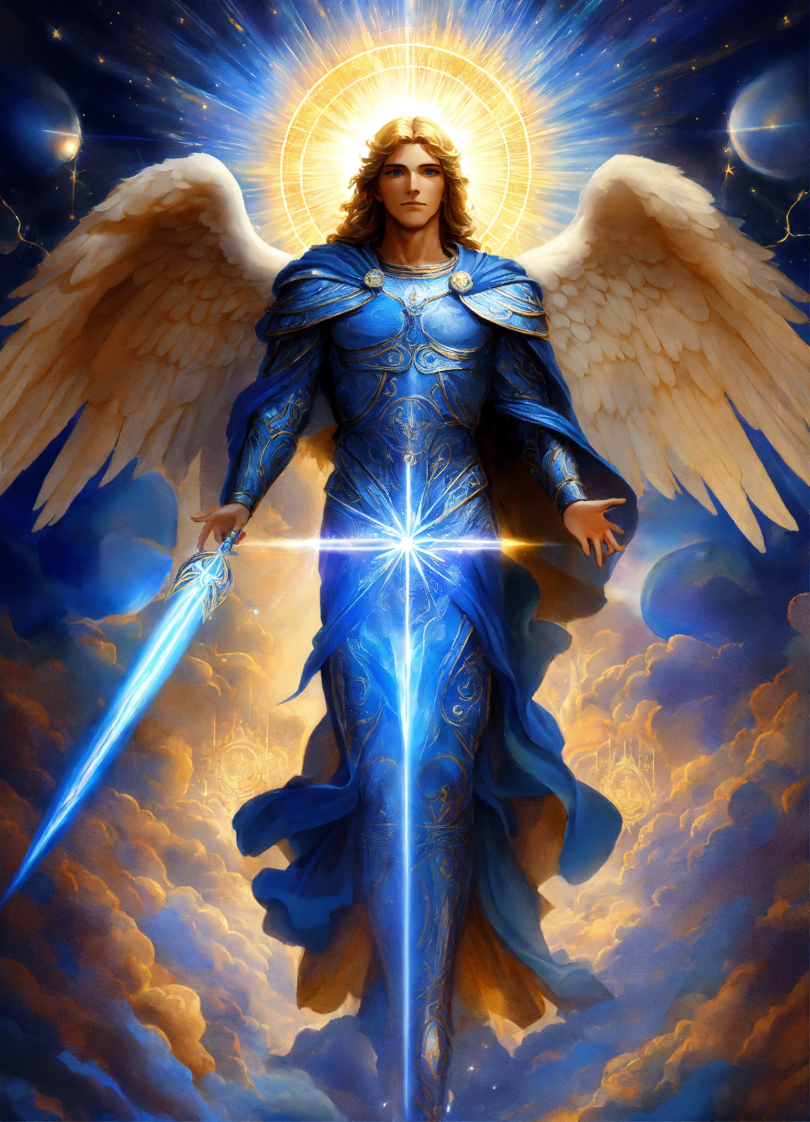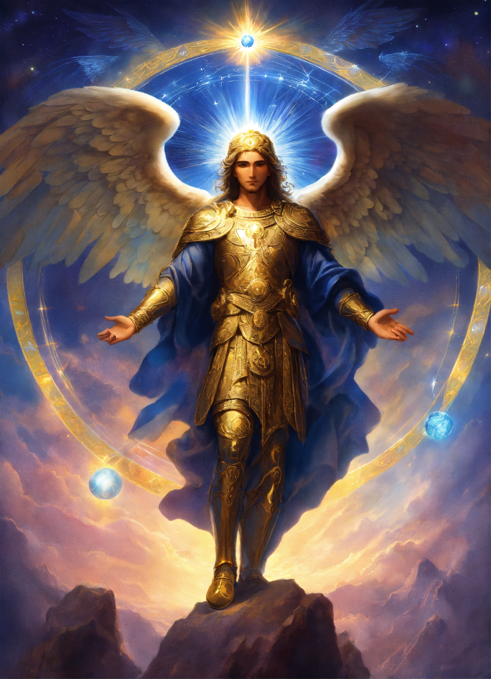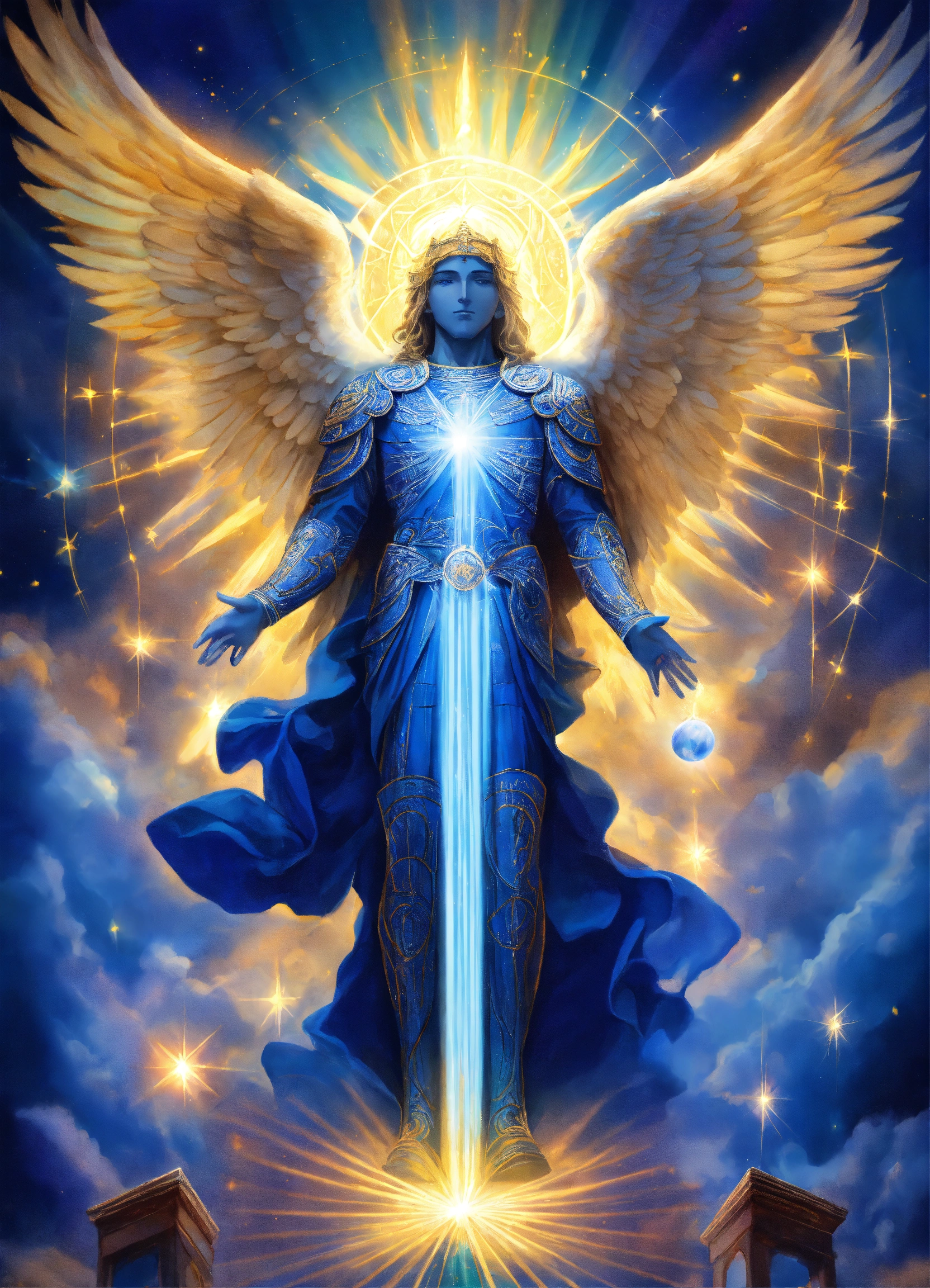 Archangel michael with an elderly visage, sacred emblem presence, prismatic aurora lights, blue beams, surrounded by divine messengers, saphir an indigo blue beams of light, lightballs, sacred emblem.
