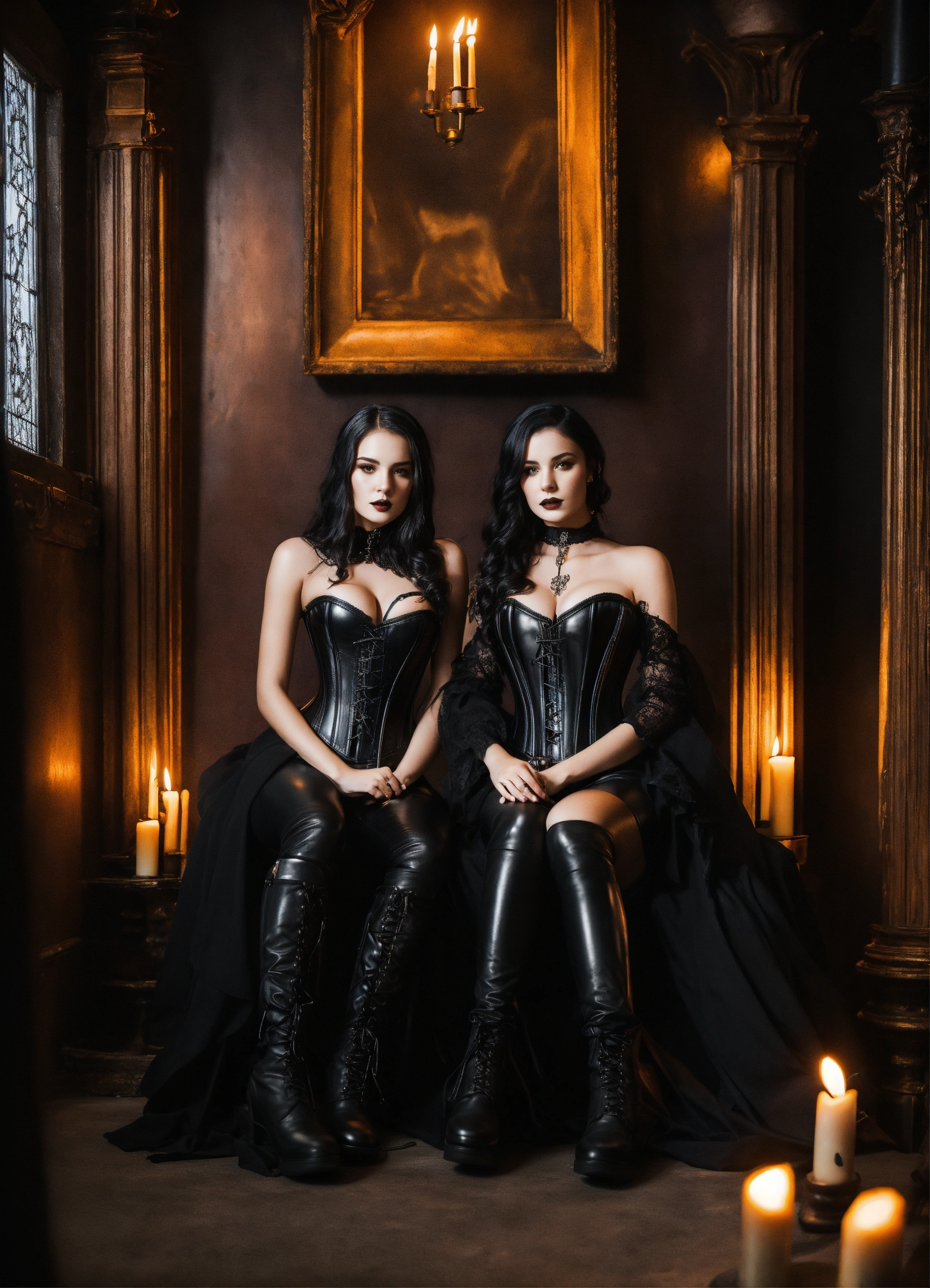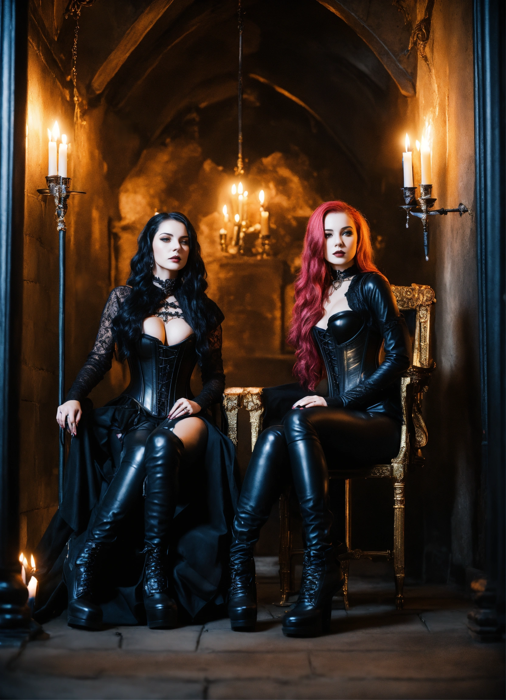 Two stunning young gothic women sitting on thrones in a candle lit basement wearing a black leather corset and black leather pants, hyper-realistic, photographic portrait