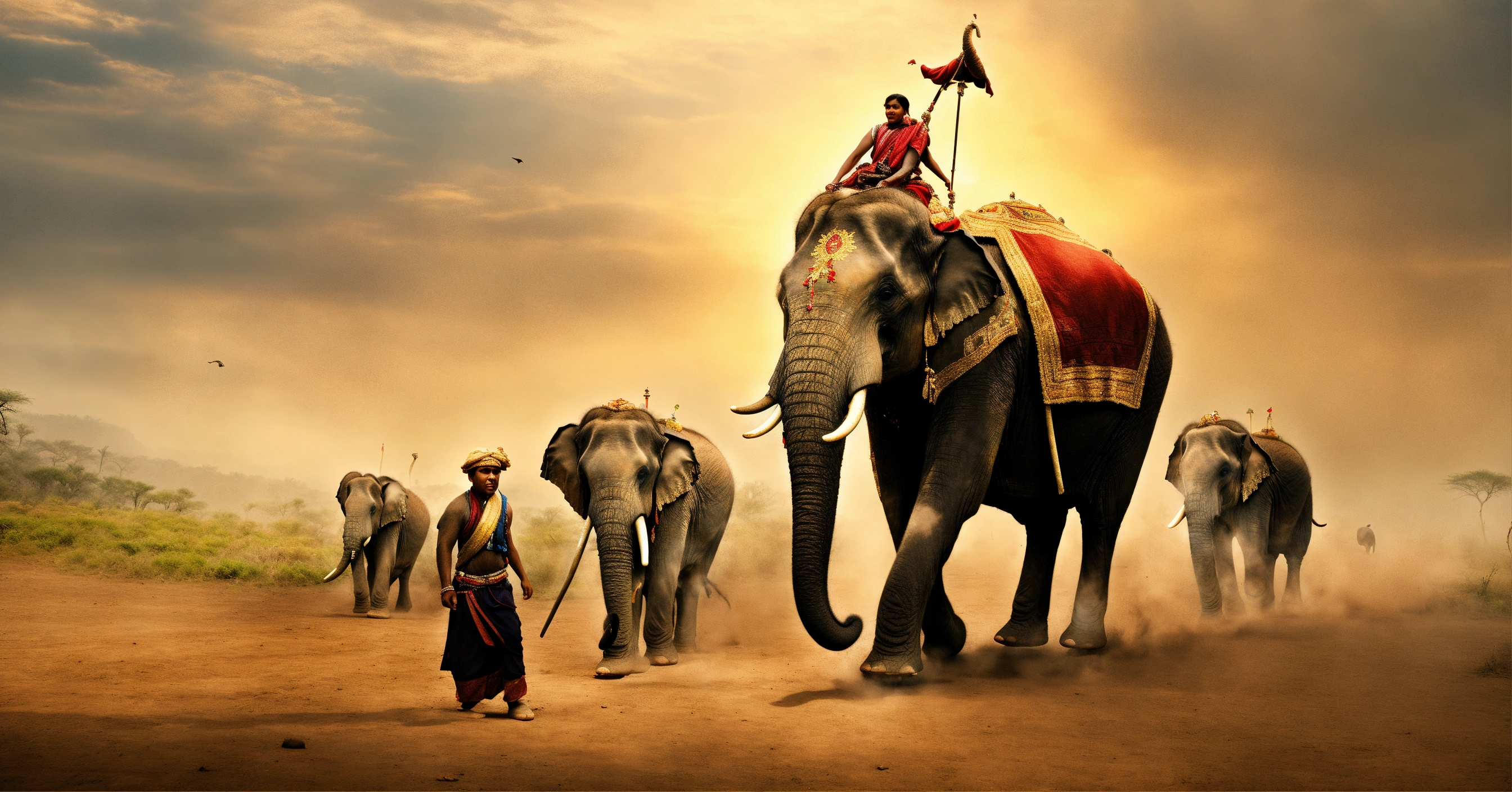 Ancient people ride elephant fighting elephants