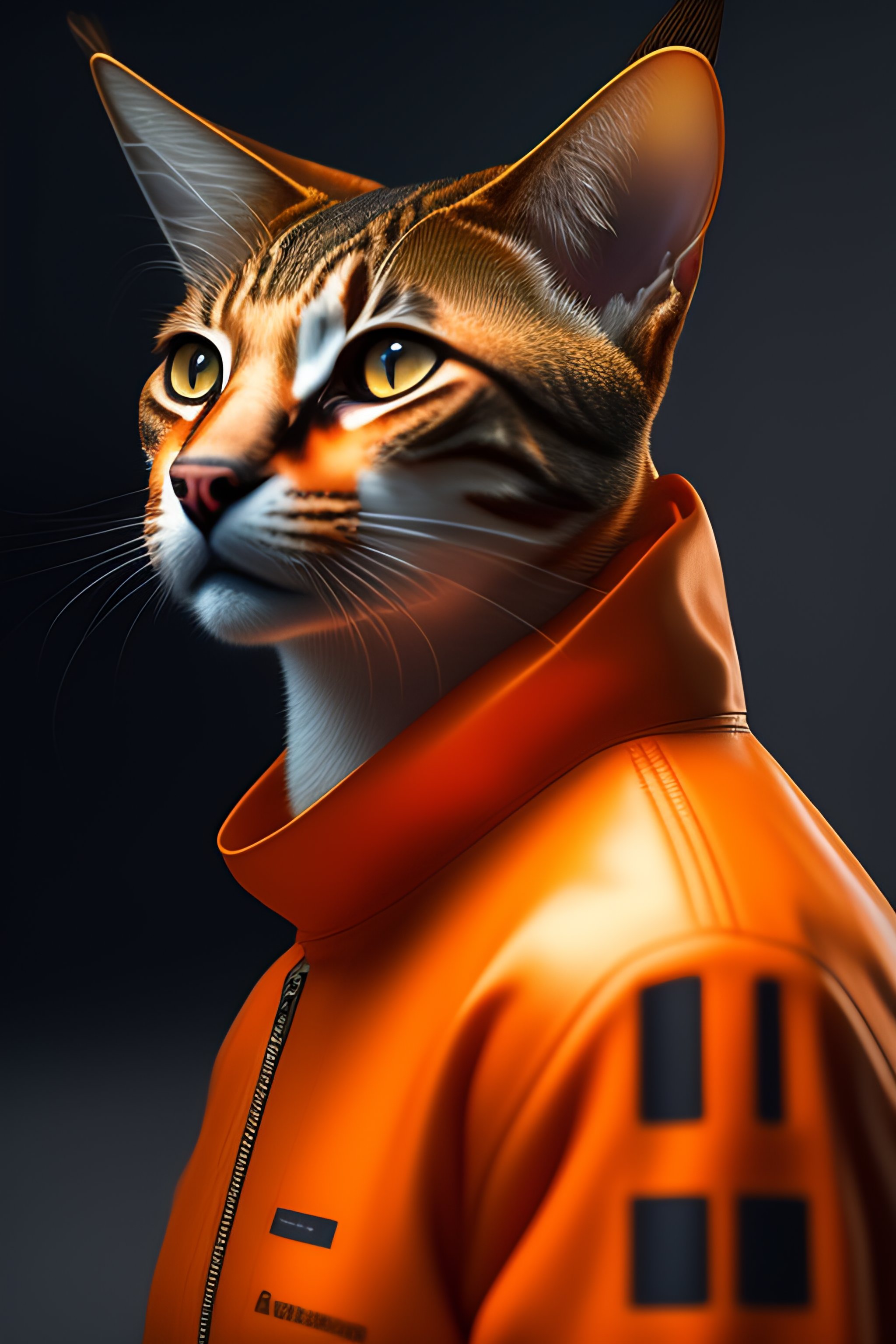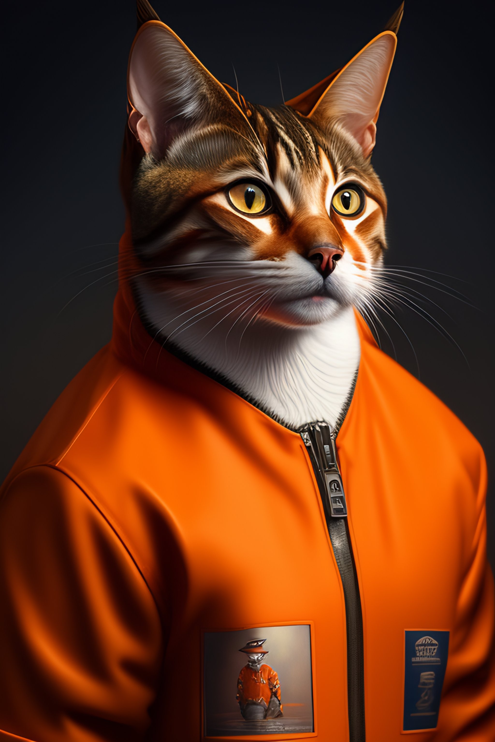 Mugshot of a tabby cat wearing orange prison inmate jumpsuit locked up in an asylum prison mugshot, ultra realistic, concept art, intricate details, eerie, highly detailed, photorealistic, octane render, 8 k, unreal engine. art by artgerm and greg rutkowski and charlie bowater and magali villeneuve and alphonse mucha
