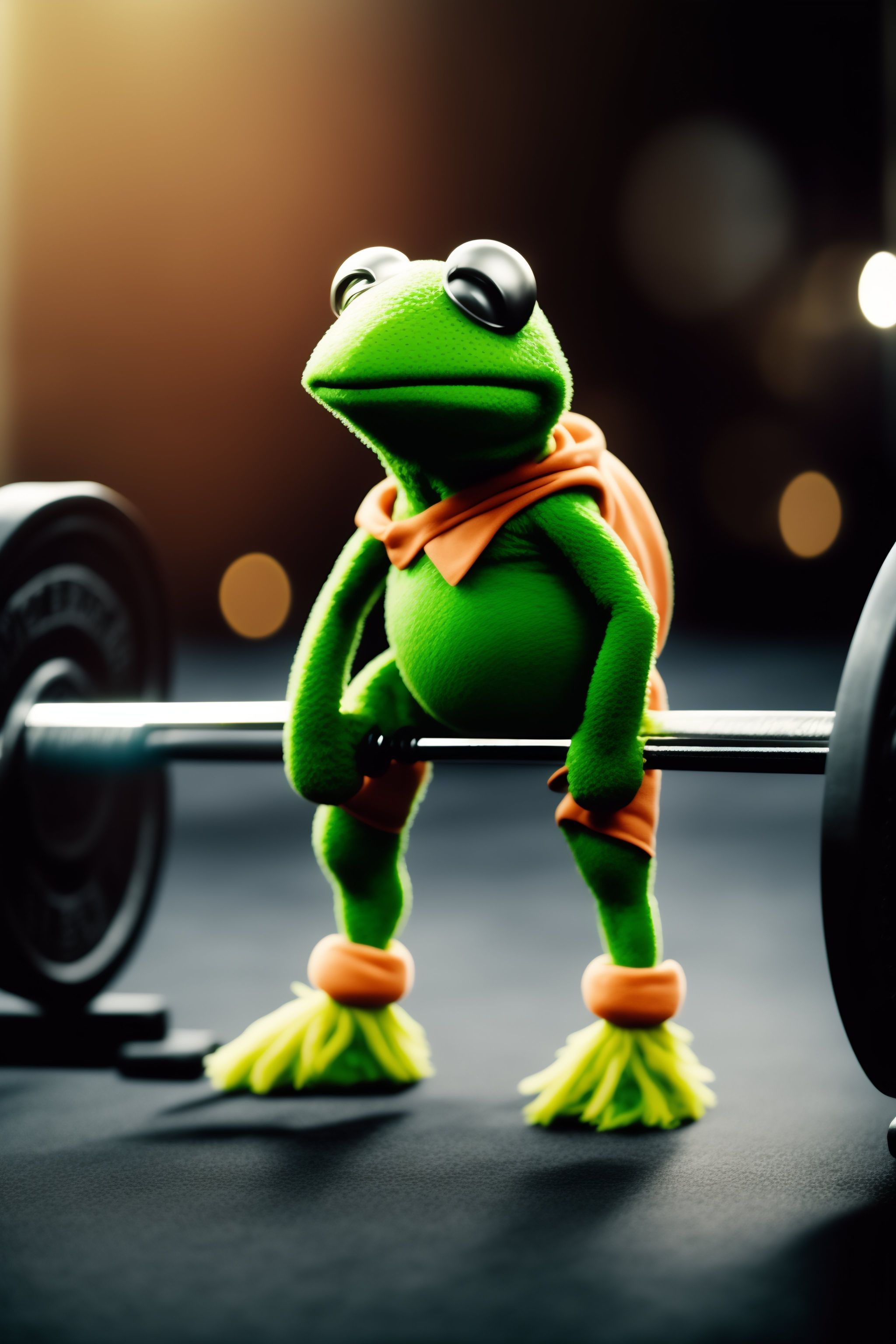 Kermit the frog doing deadlifts at a luxury gym
