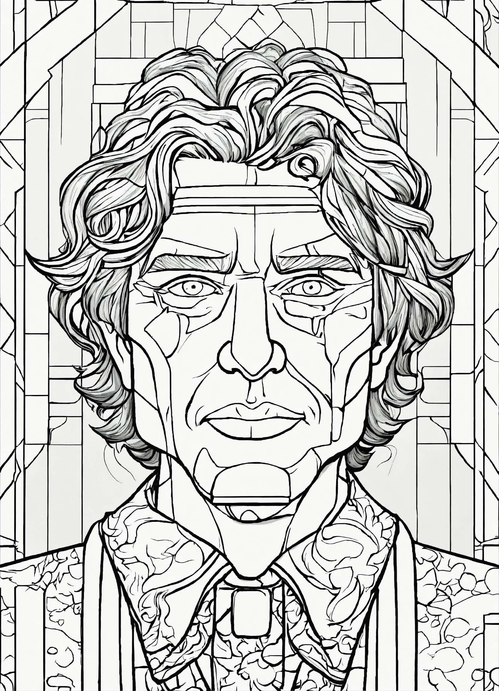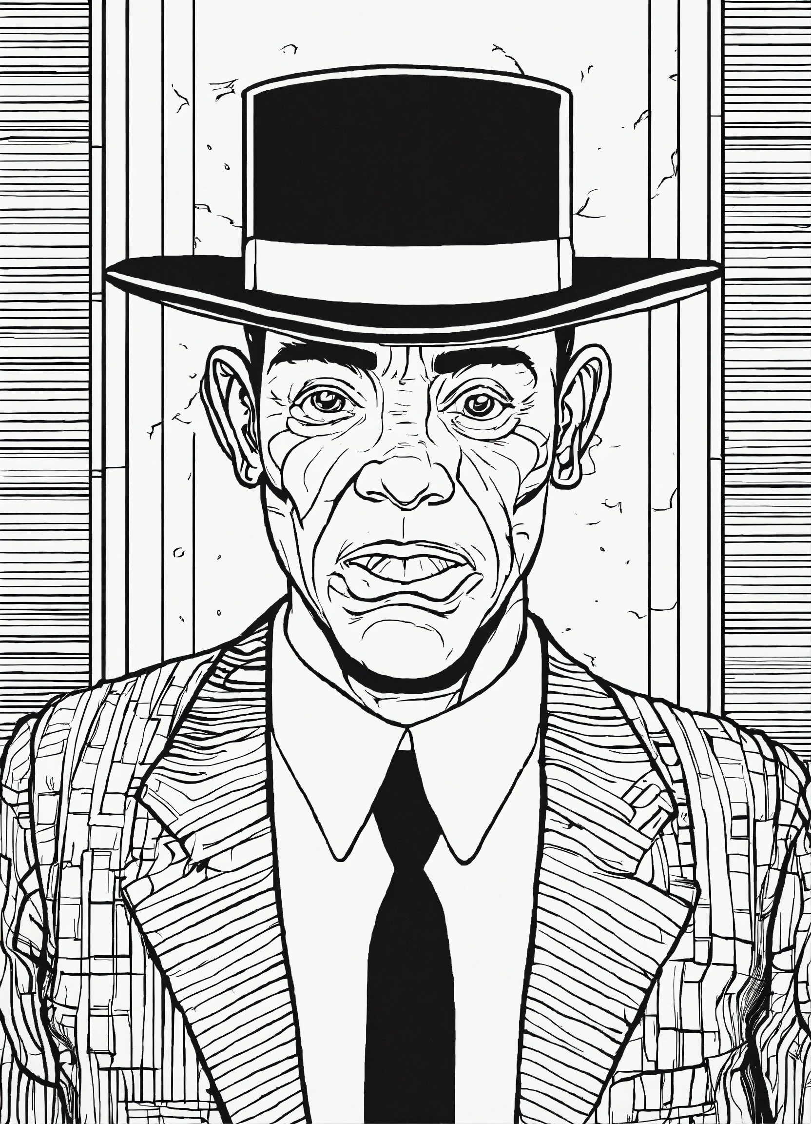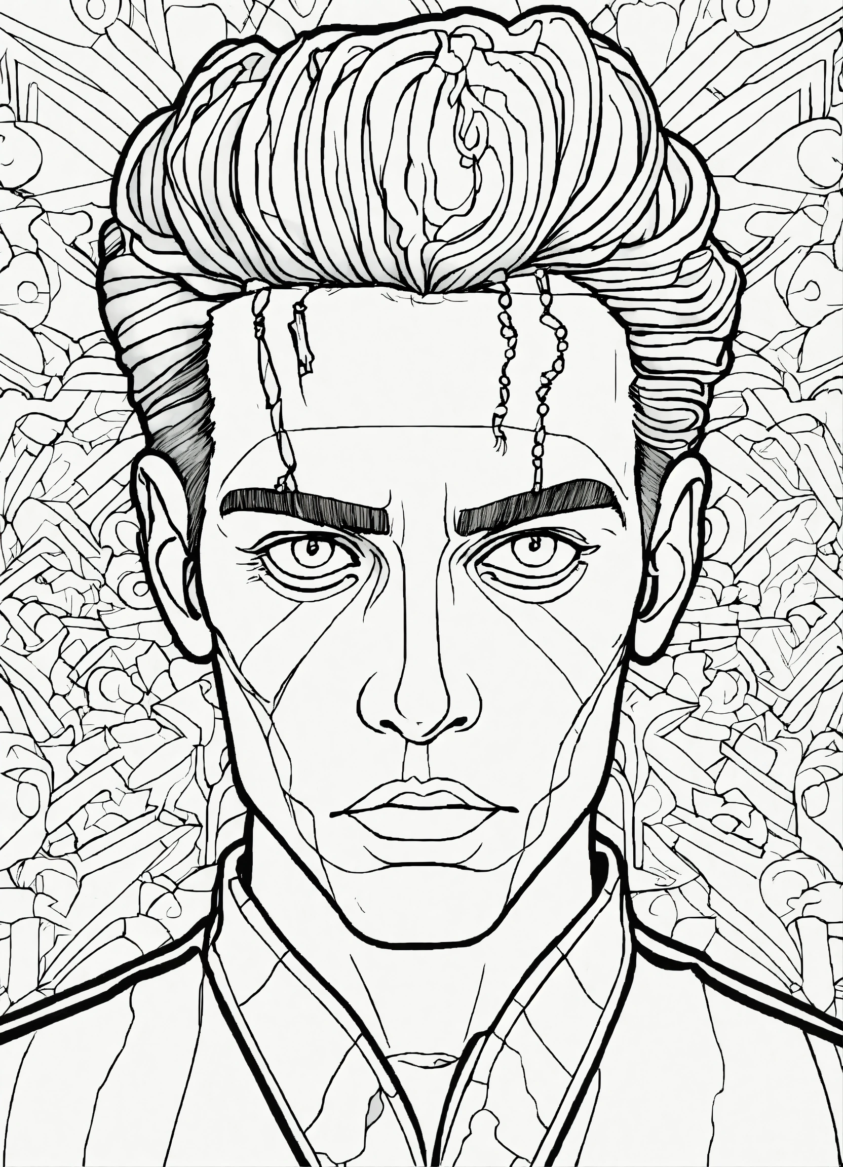 Coloring page for adults, bold lines, dark lines, mad magazine character moron face, black and white, cartoon, symmetrical, white background, clean line art, fine line art