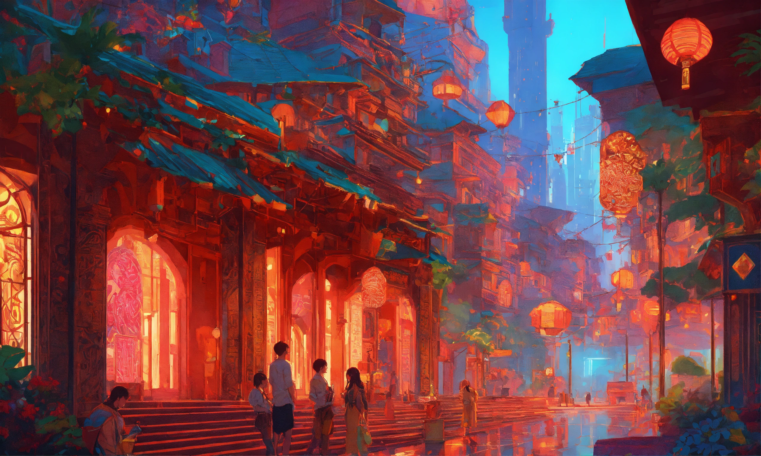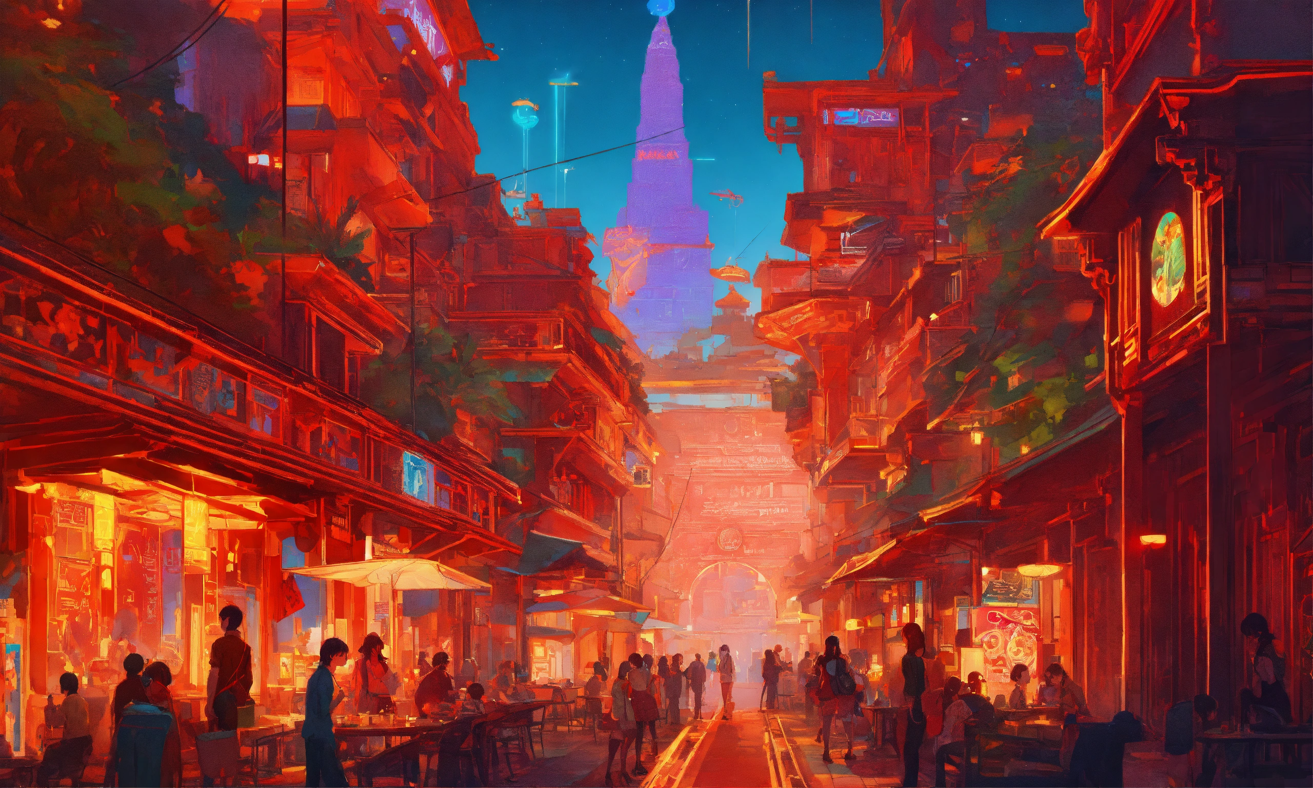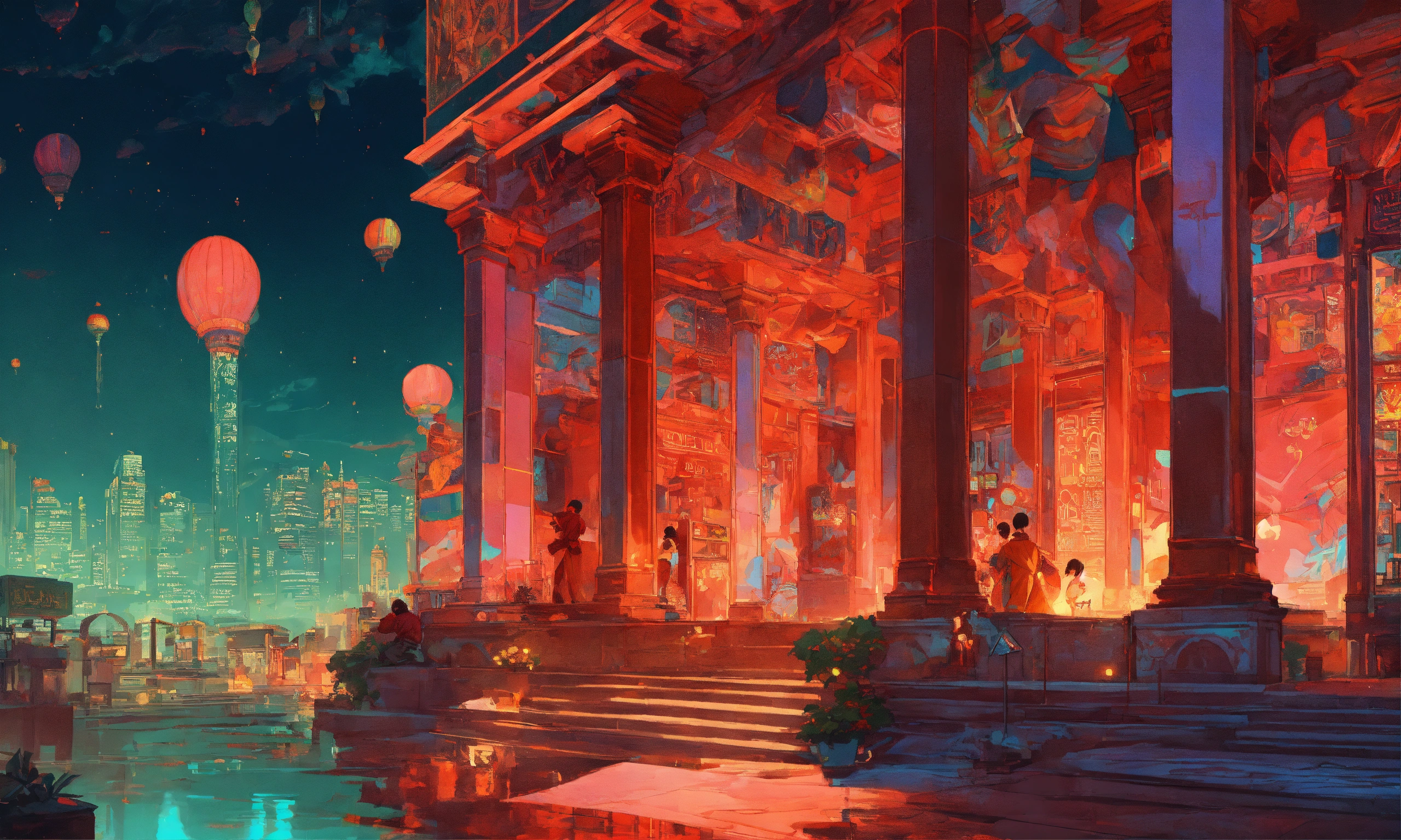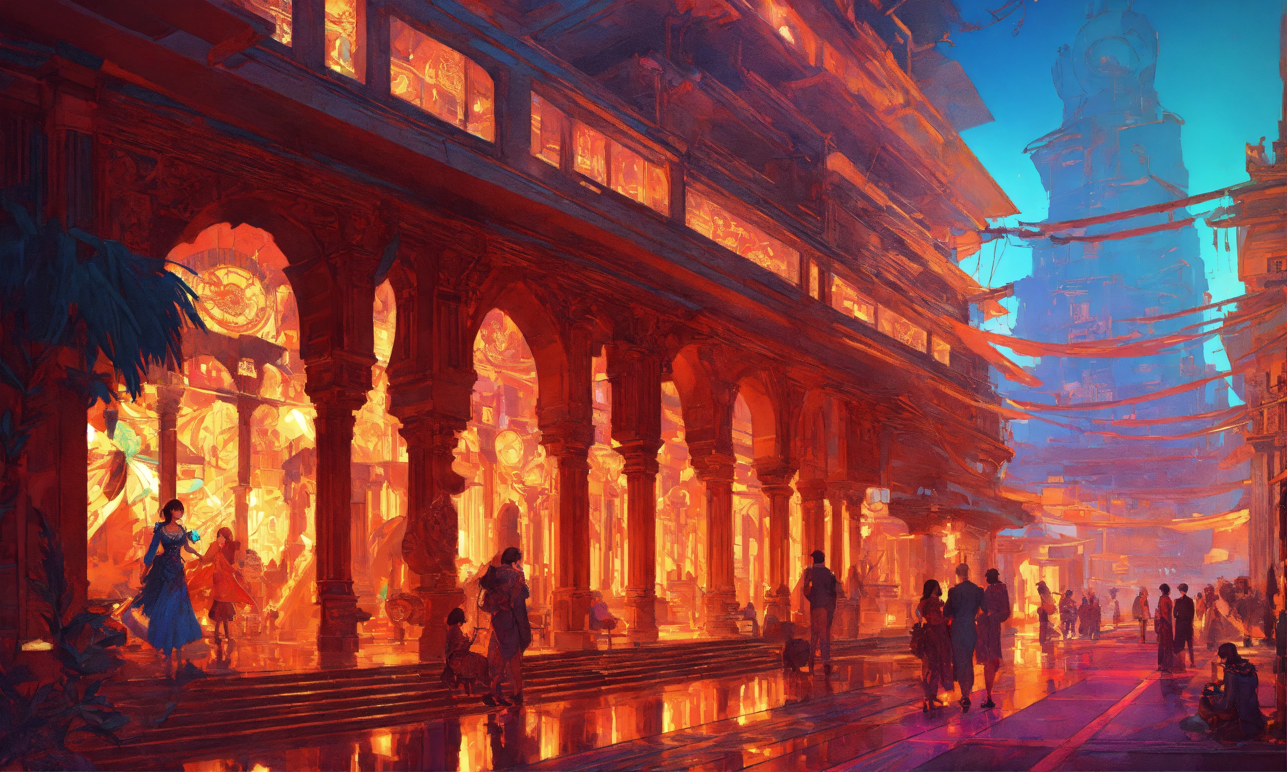 Fantasy city, egyptian architecture, red and gold, ernst haeckel maria sibylla merian. tristan eaton, victo ngai, artgerm, rhads, ross draws, kaethe butcher, hajime sorayama, greg tocchini, virgil finlay, fantasy, colors, neon lights, digital painting, pixiv, by ilya kuvshinov, neon lights, 3d, perspective