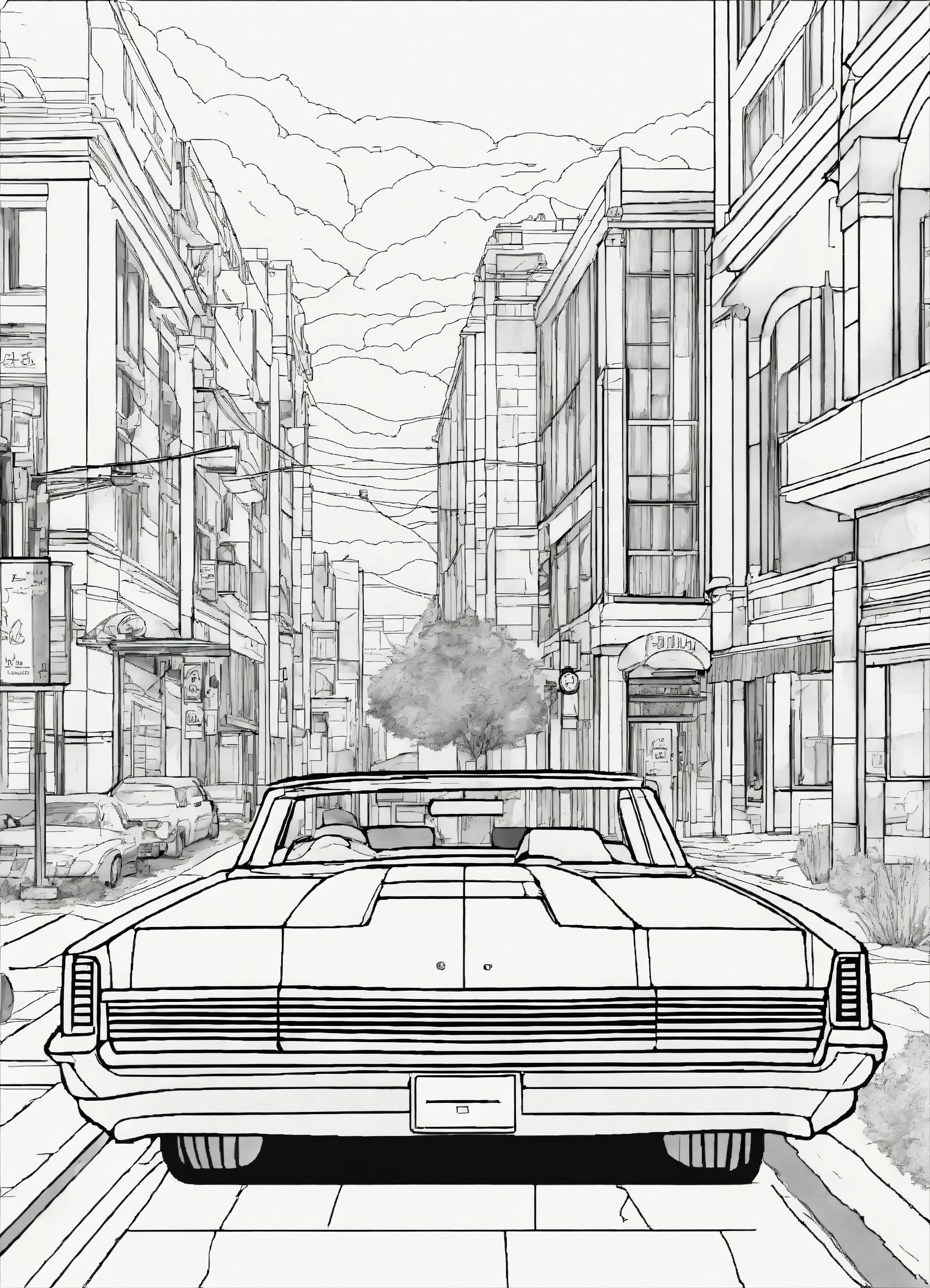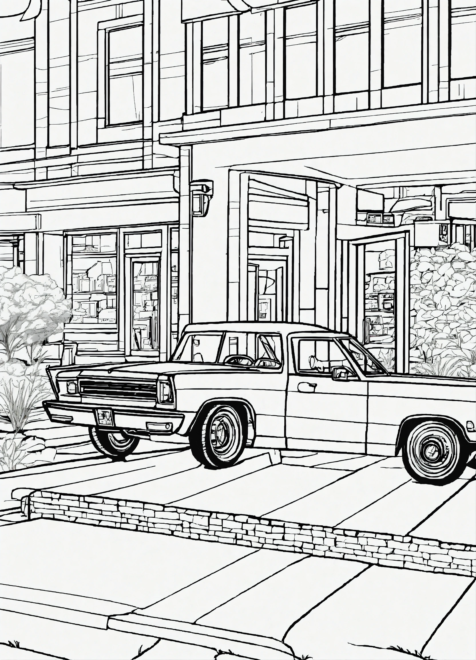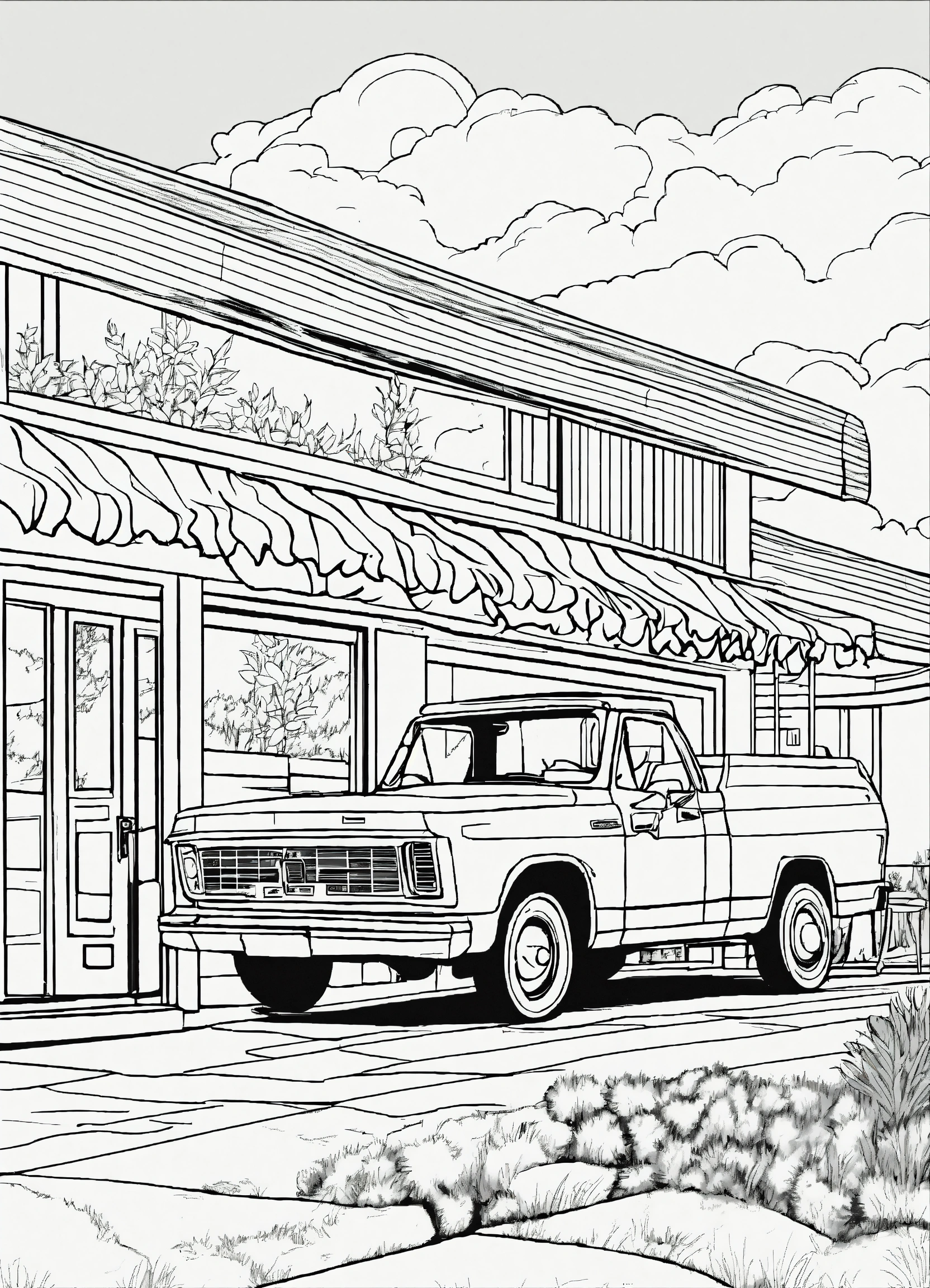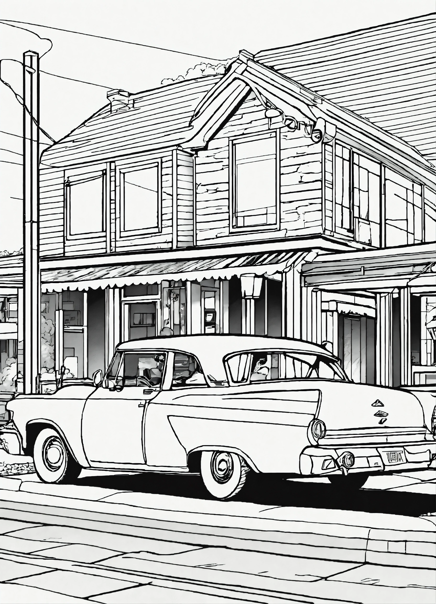Coloring page for adults, bold lines, dark lines, drive-thru service, unconventional, white background, clean line art, fine line art