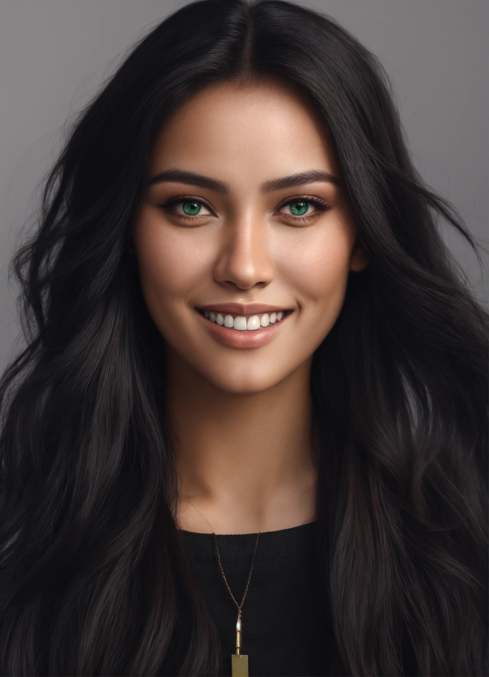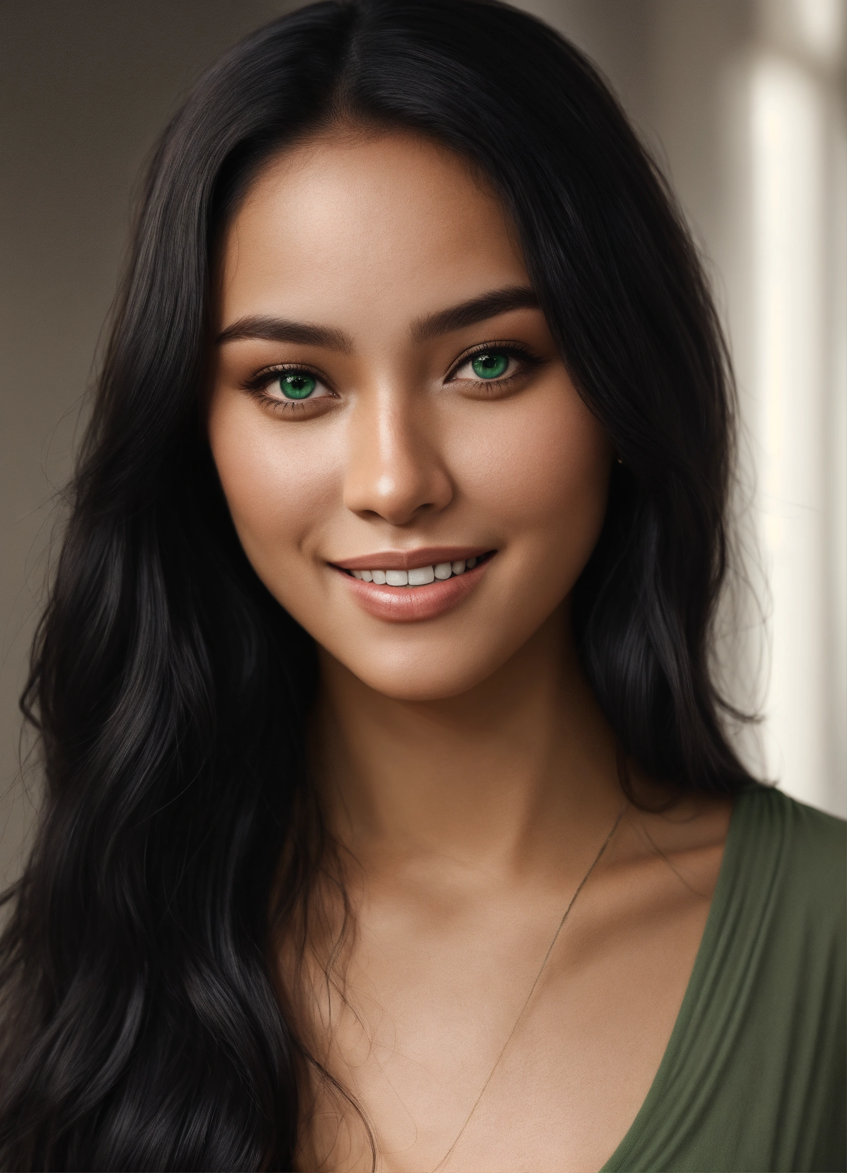 Photorealistic, smiling, very beautiful mixed raced girl, green eyes, long black hair, wearing black clothes, neutral colours, model, white neutral background, photorealistic, 8k, ultra realistic