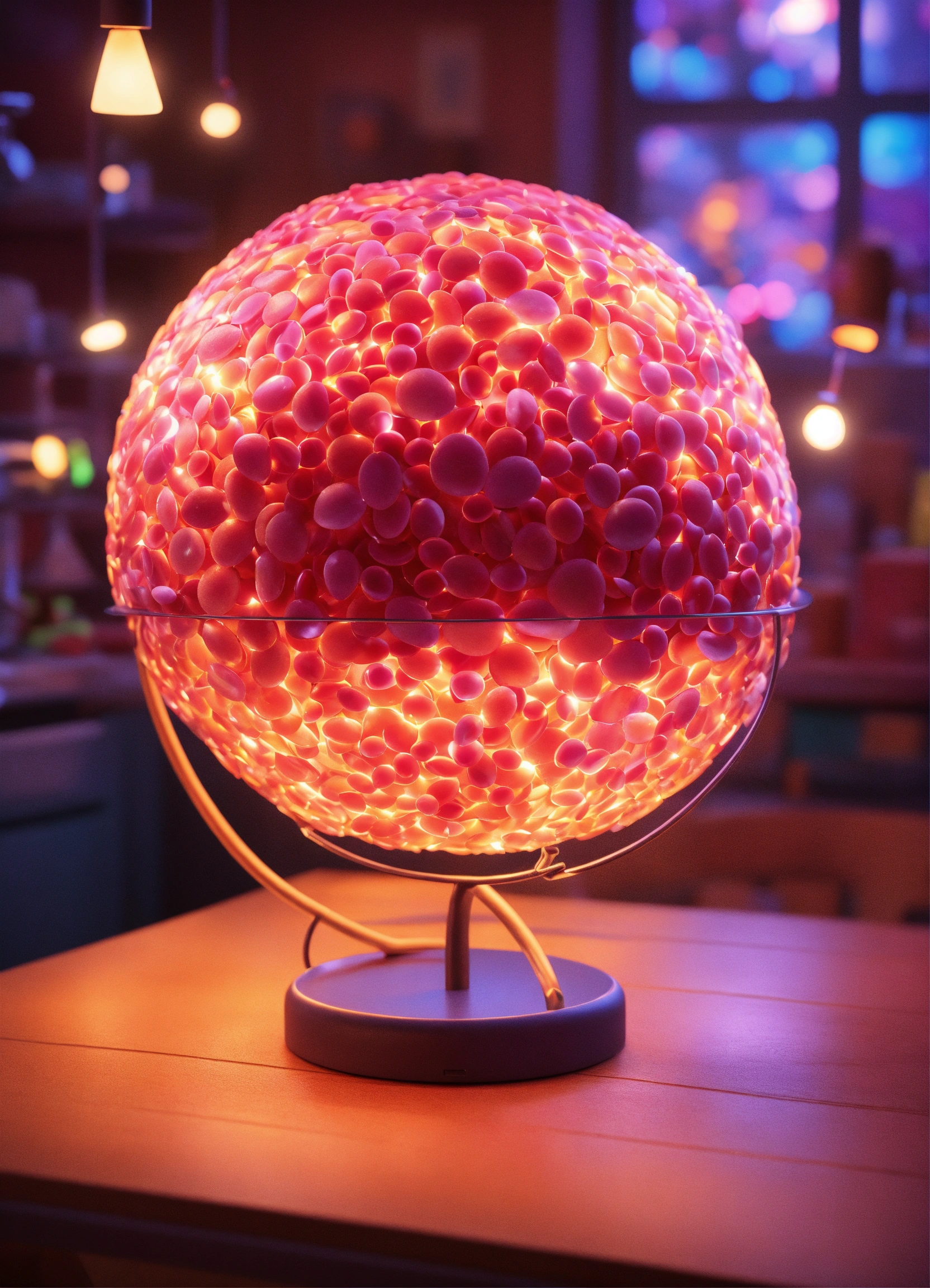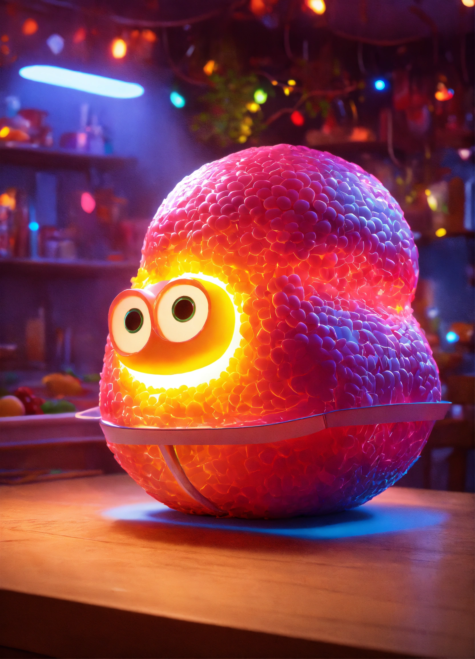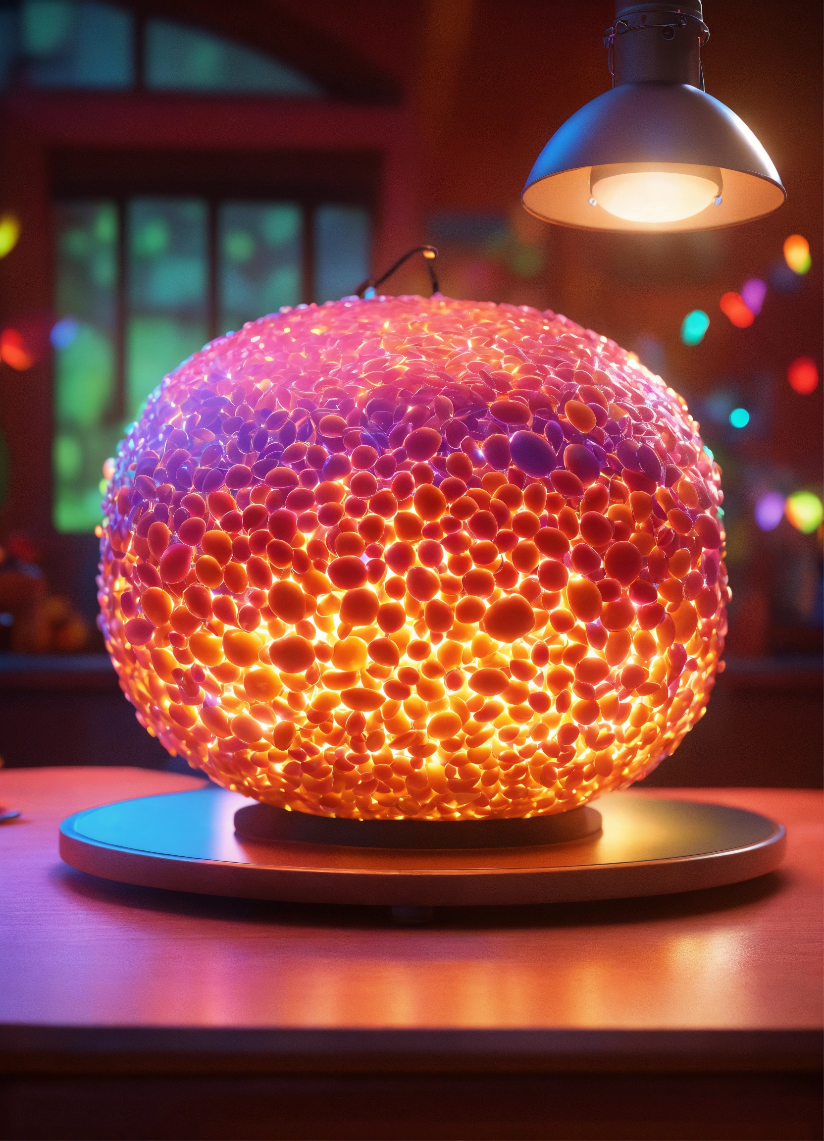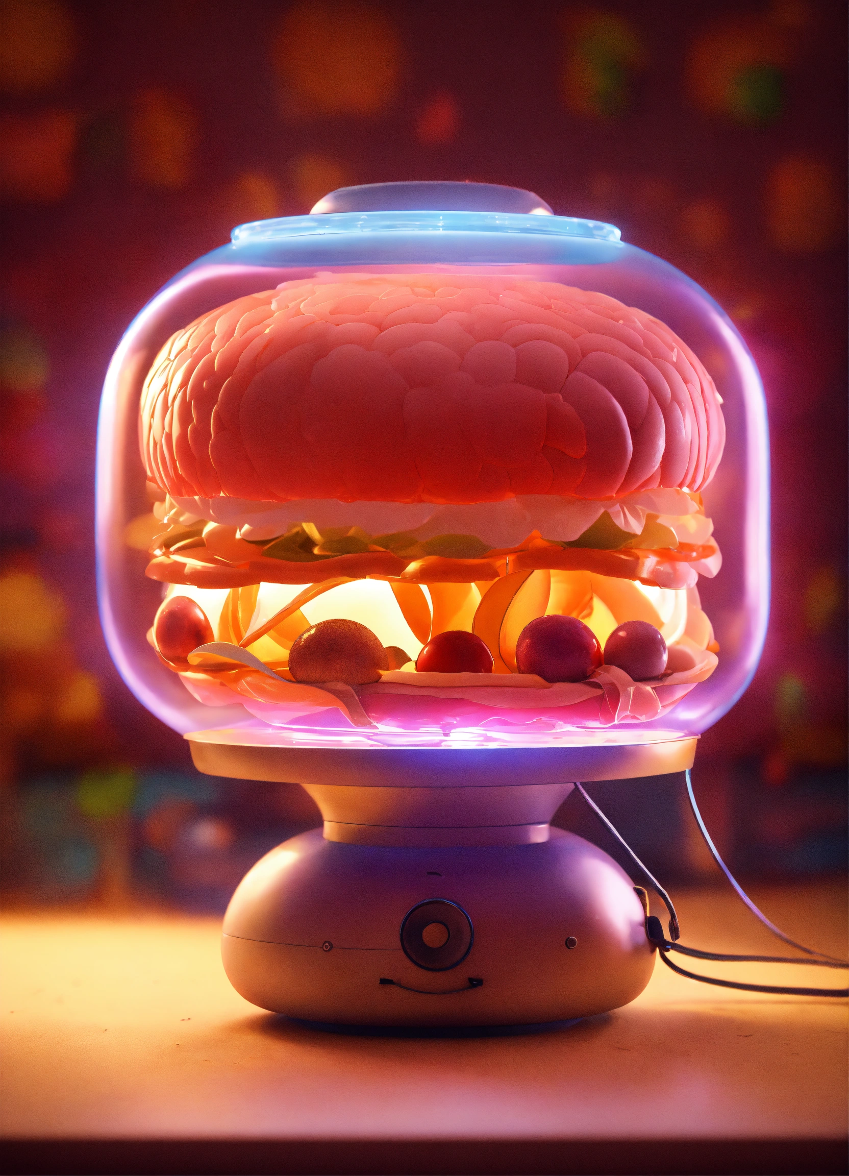 There is a 3d model of a stomach on a table, with lights around it. realistic colorful photo in pixar style.