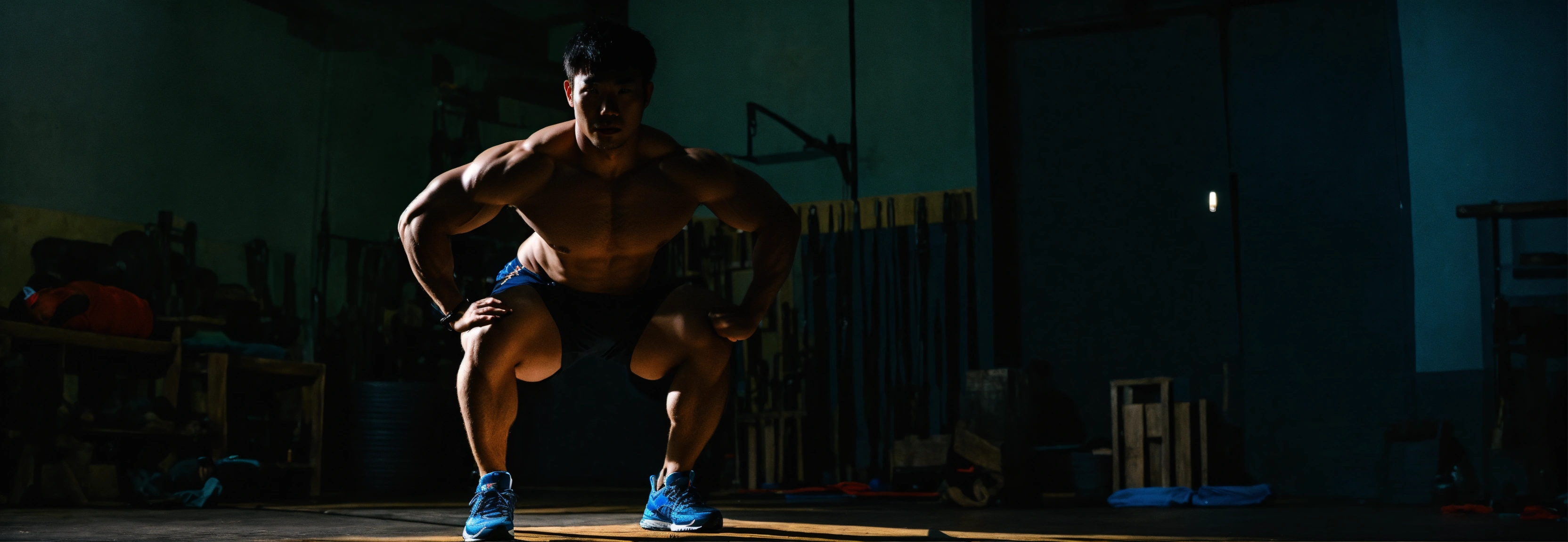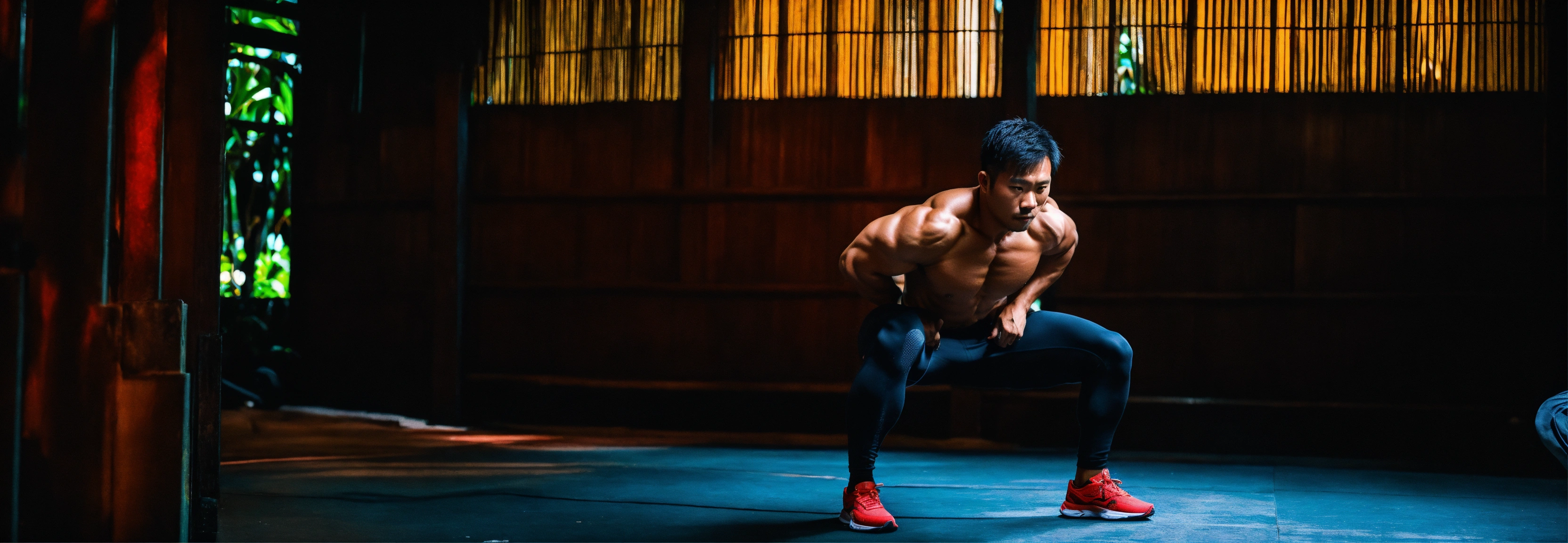 A muscular 33 year old men asian who in real life is called justine vicky with only on one arm who practices the squat exercise in bali in a dark and dark room