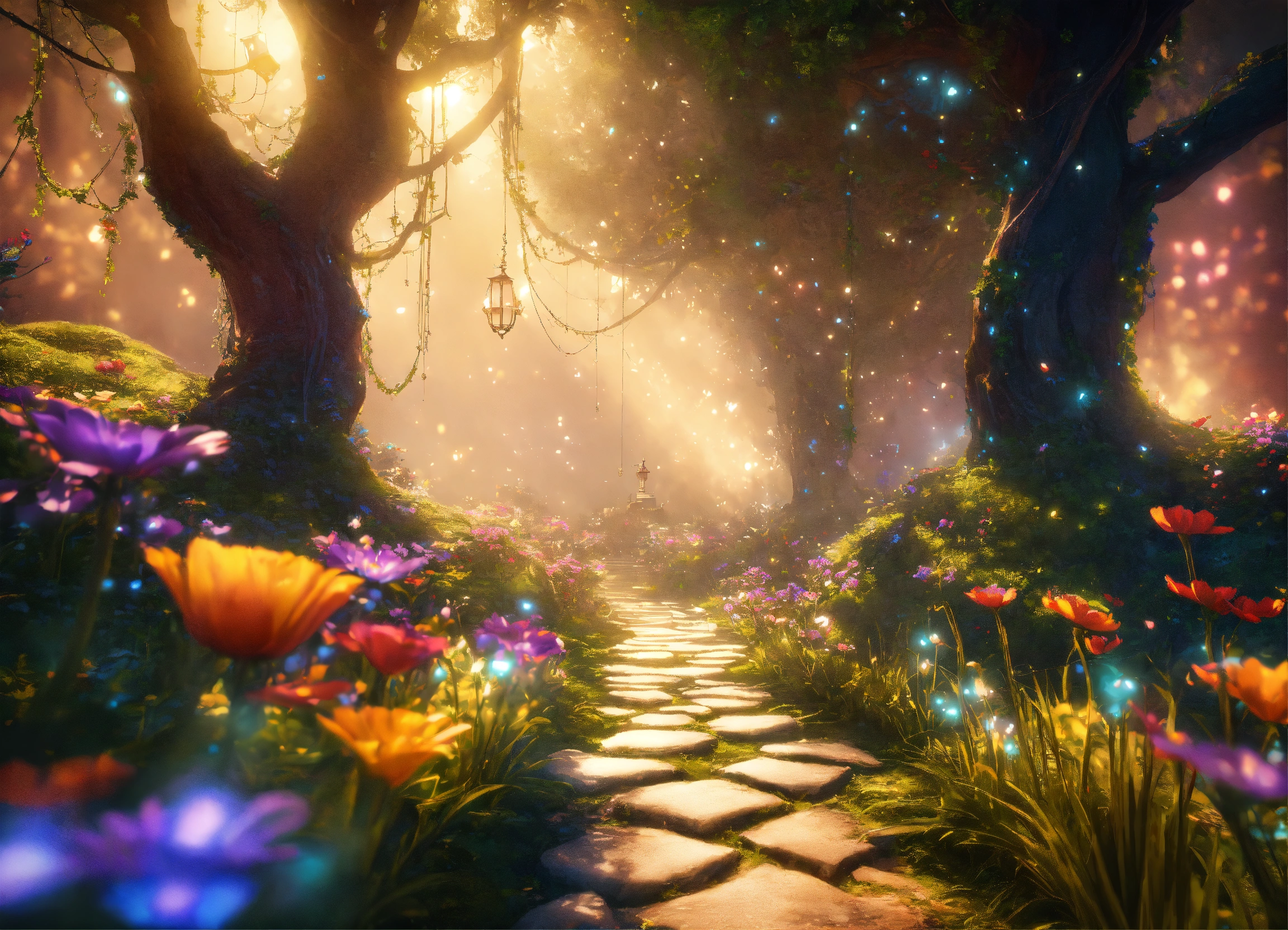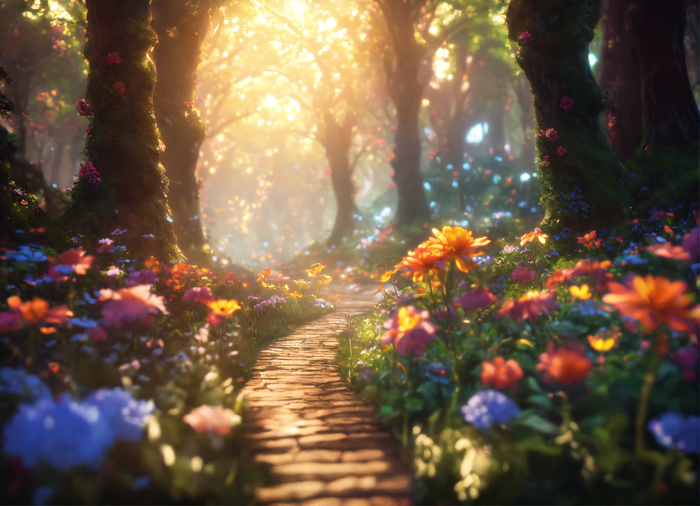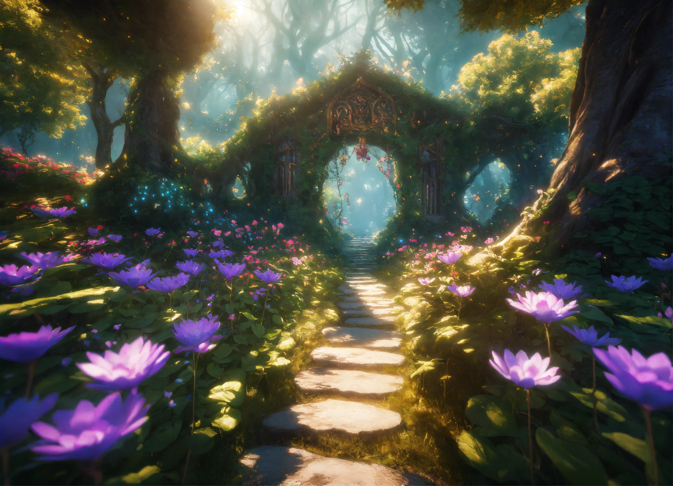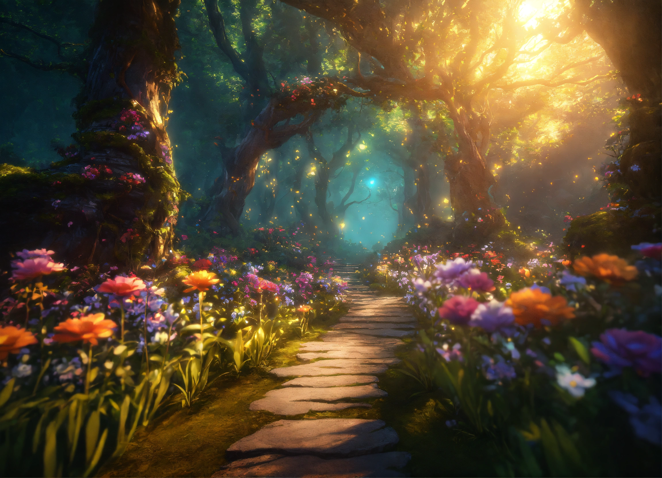 A path through enchanted woods with gigantic enchanted flowers, surreal, intricate details, epic scene, beautiful ethereal illumination, fantastic tale, magical, unreal engine