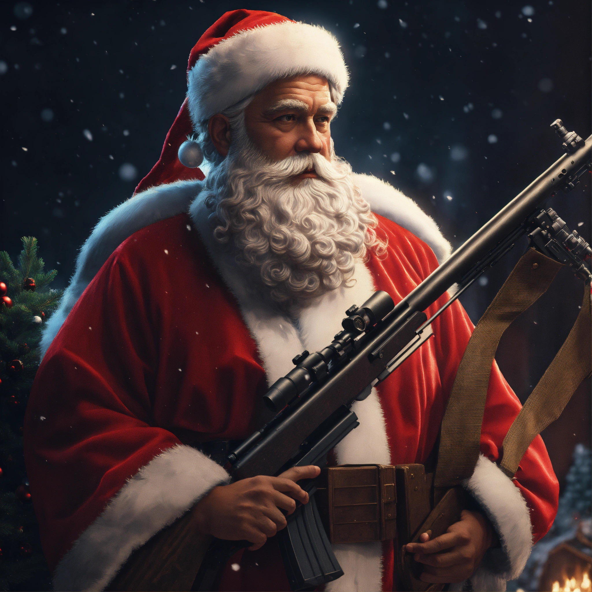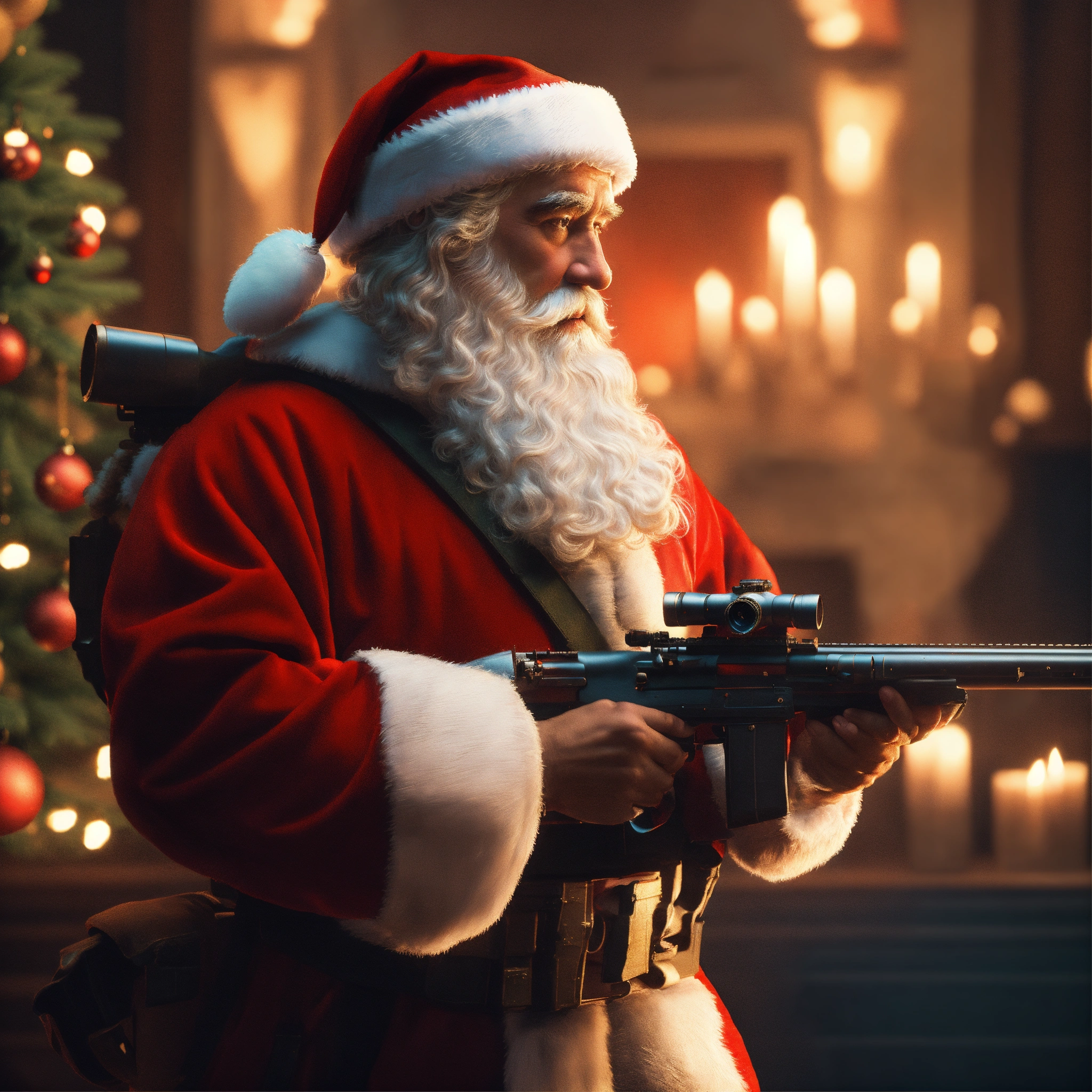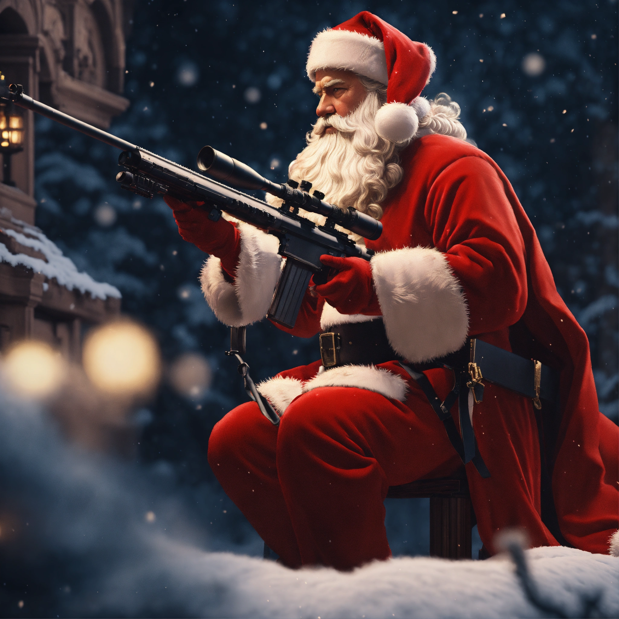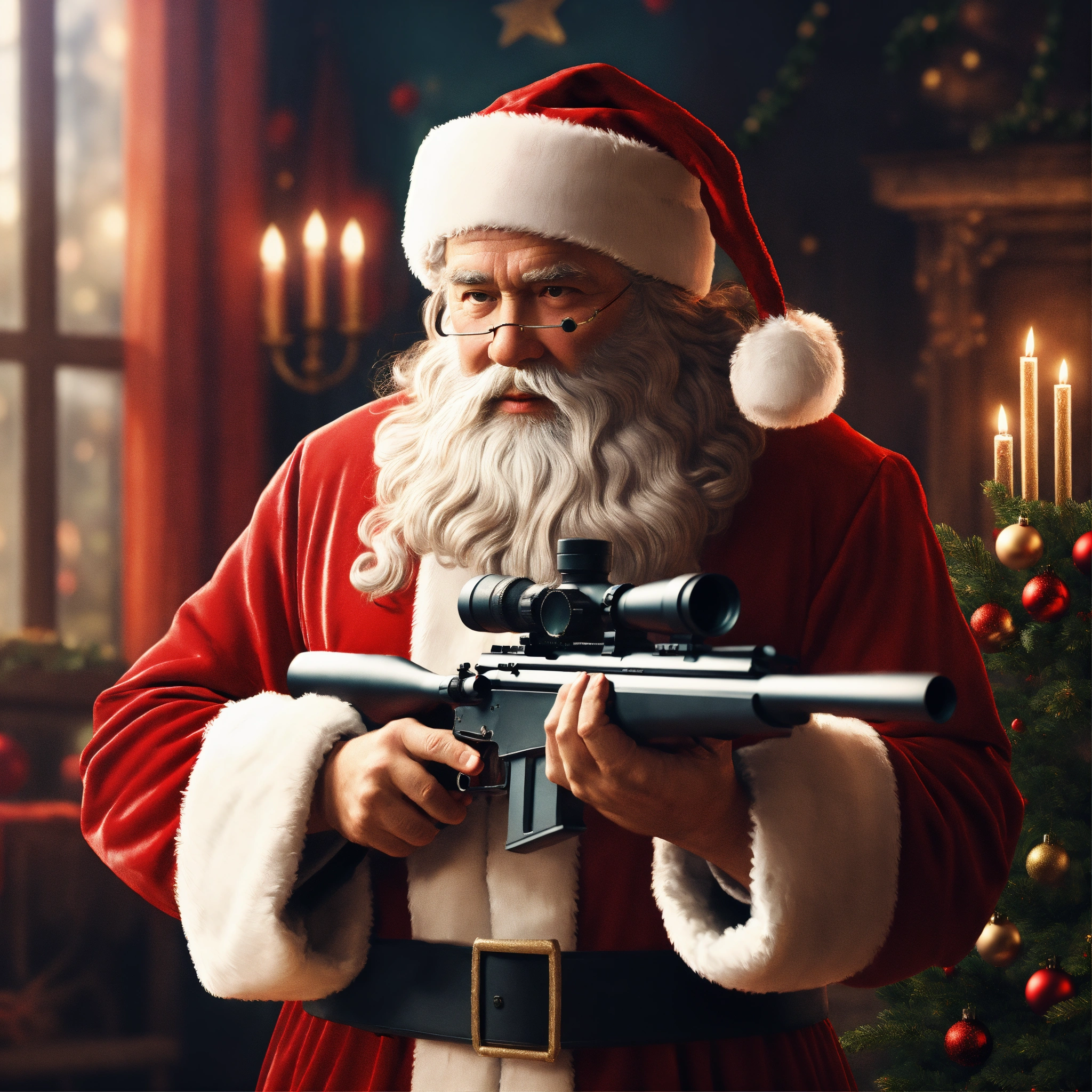 A classical painting of santa clause holding sniper rifle, right profile view, cinematic shot, classical painting style, christmas color scheme aesthetic, 8k cinematic, unreal engine render, ultra realistic, cinematic noise