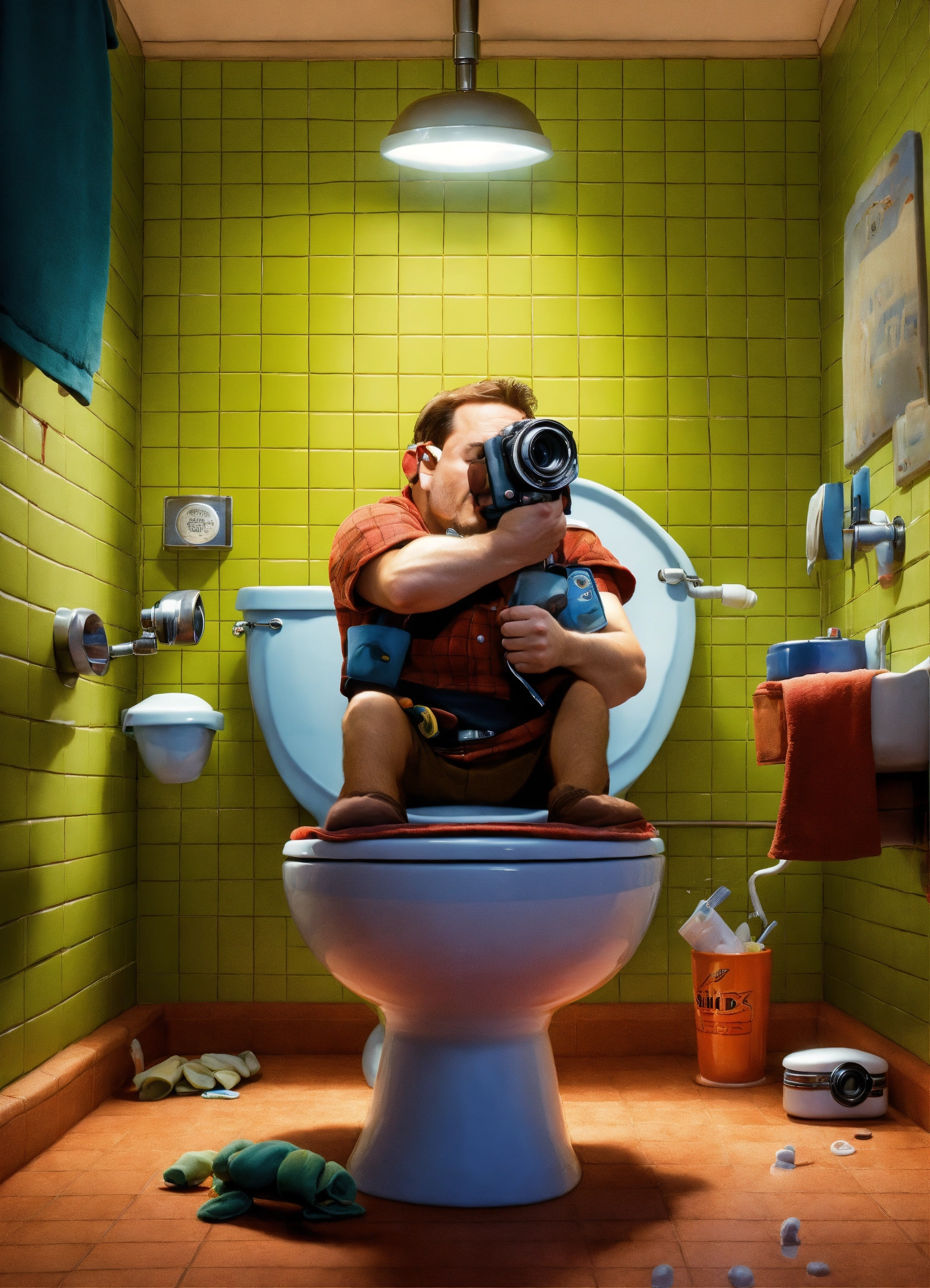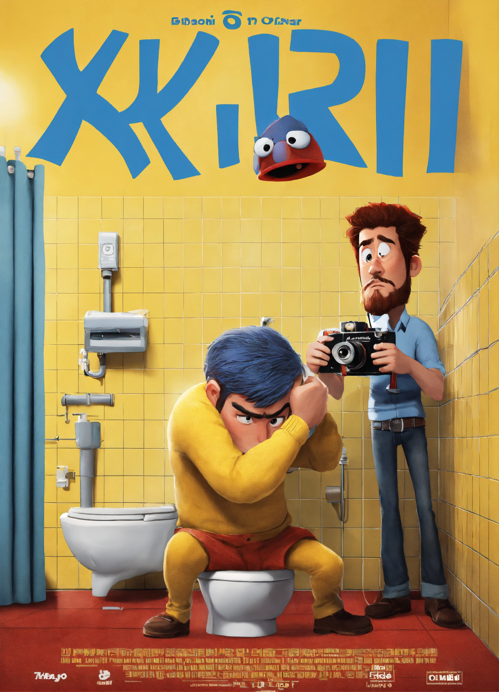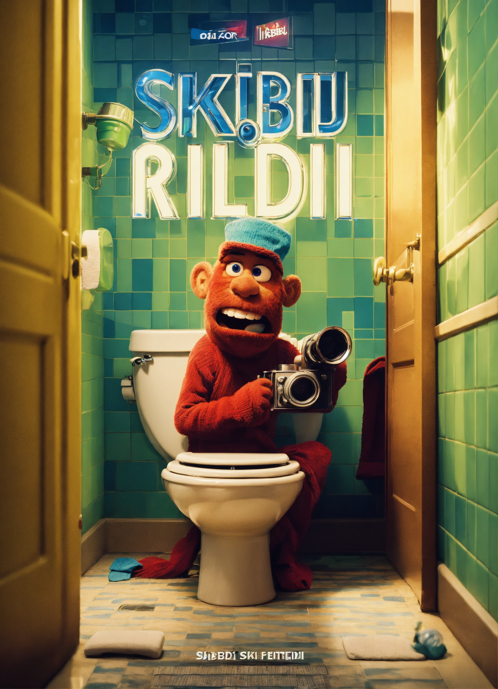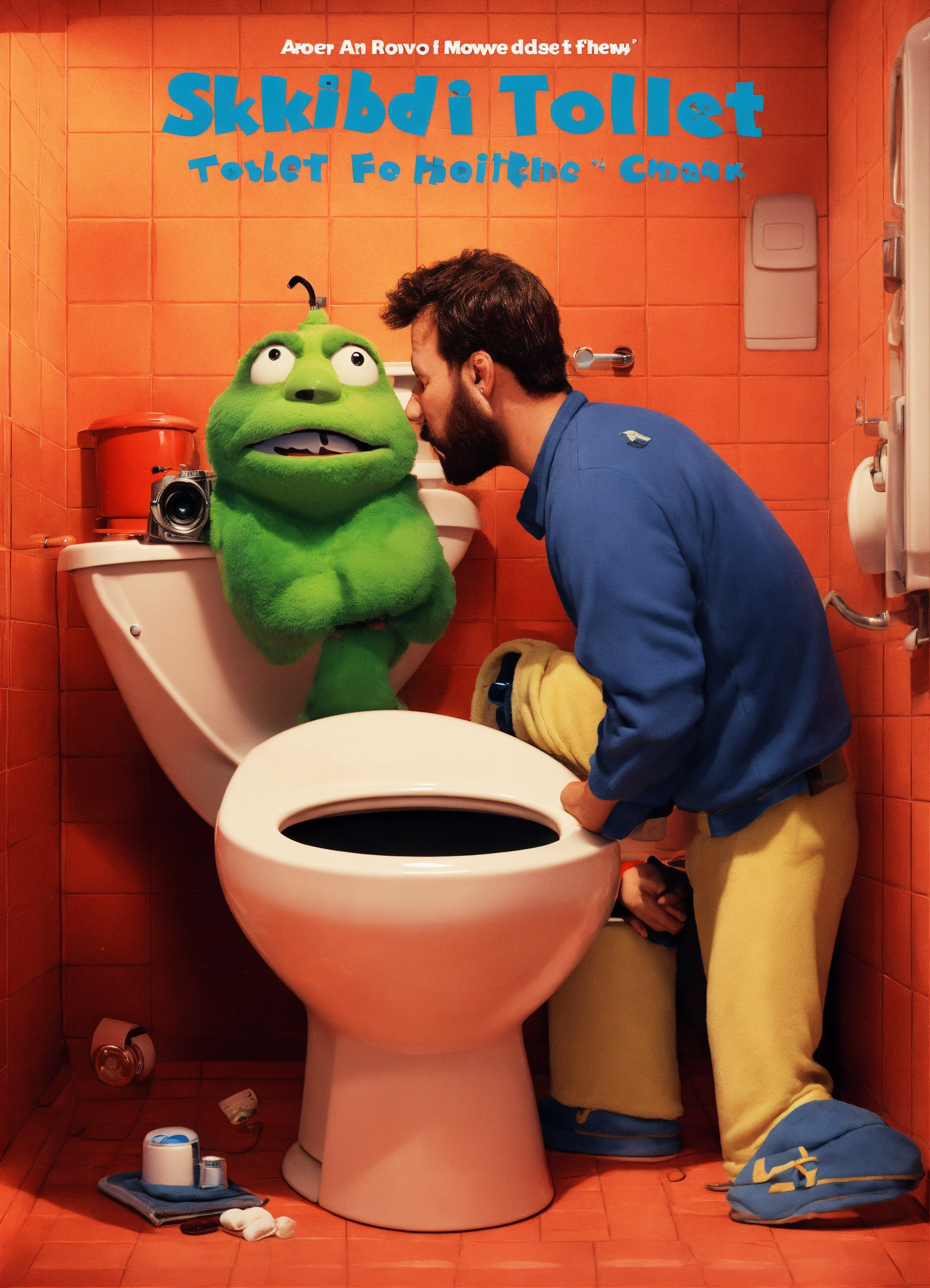 A pixar movie cover of a mans head in a toilet titled "skibidi toilet" and a man with a camera for a head fighting him