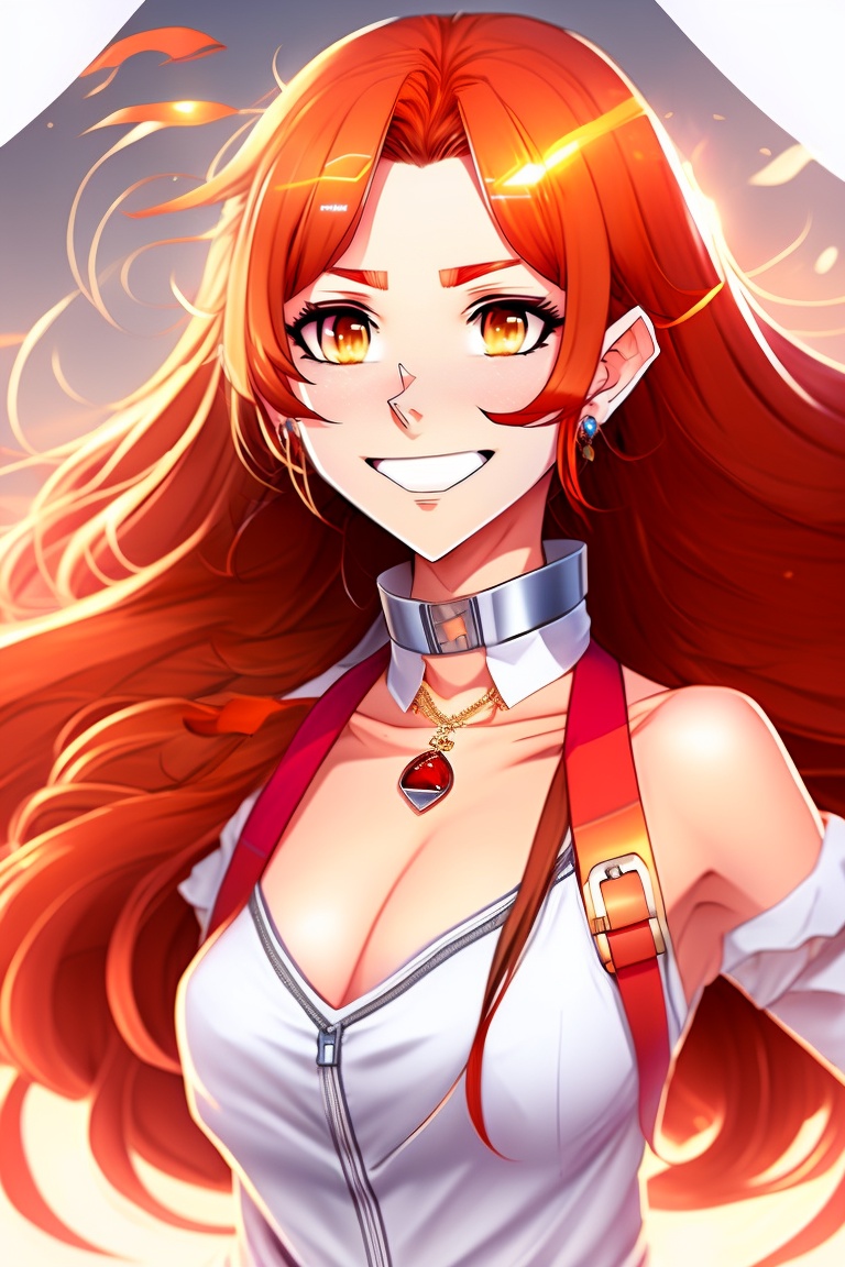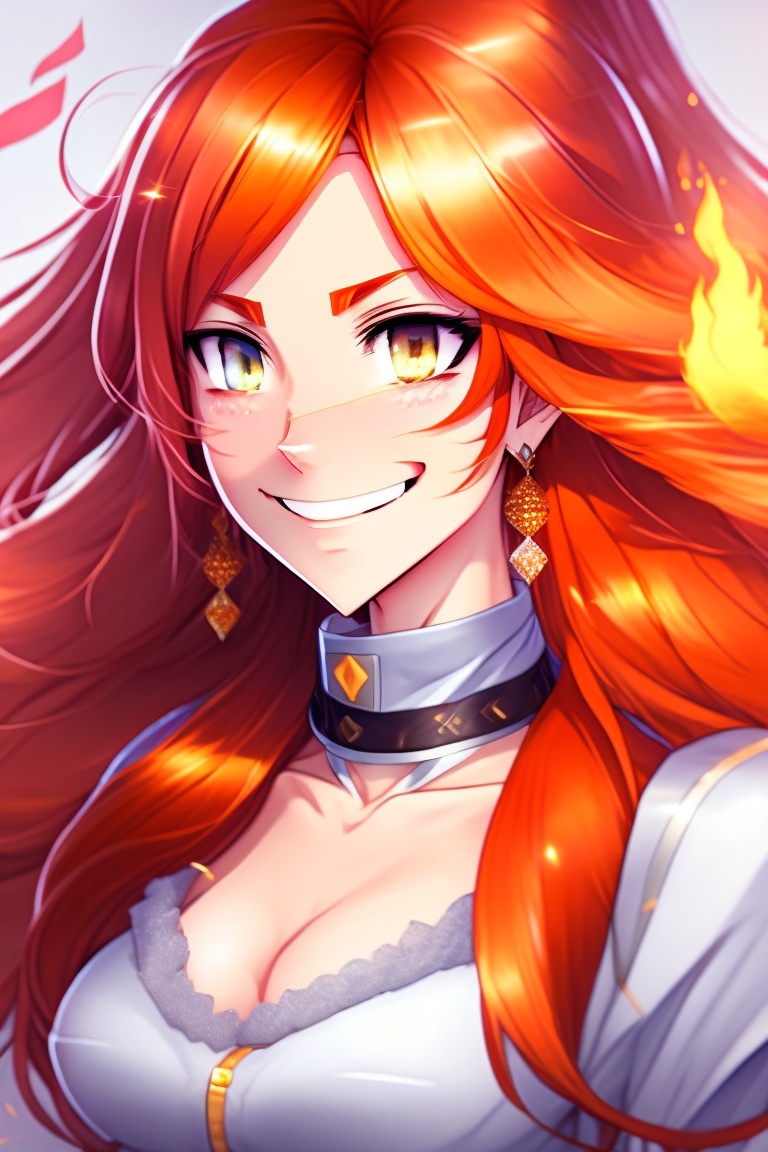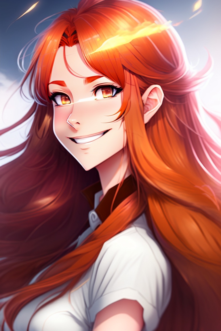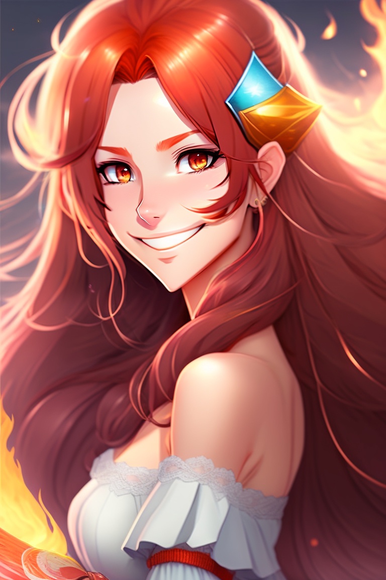 Manga girl with long red hair and lips, big eyes in fire, smiling with a shining smile.with fairy tail girls style