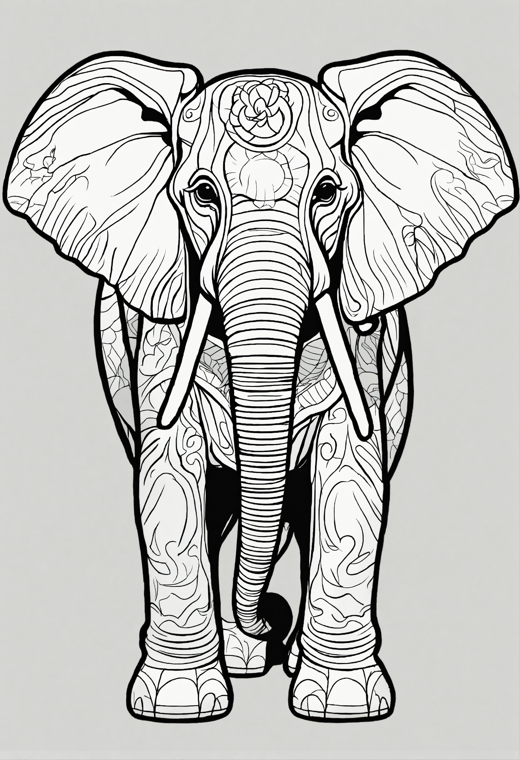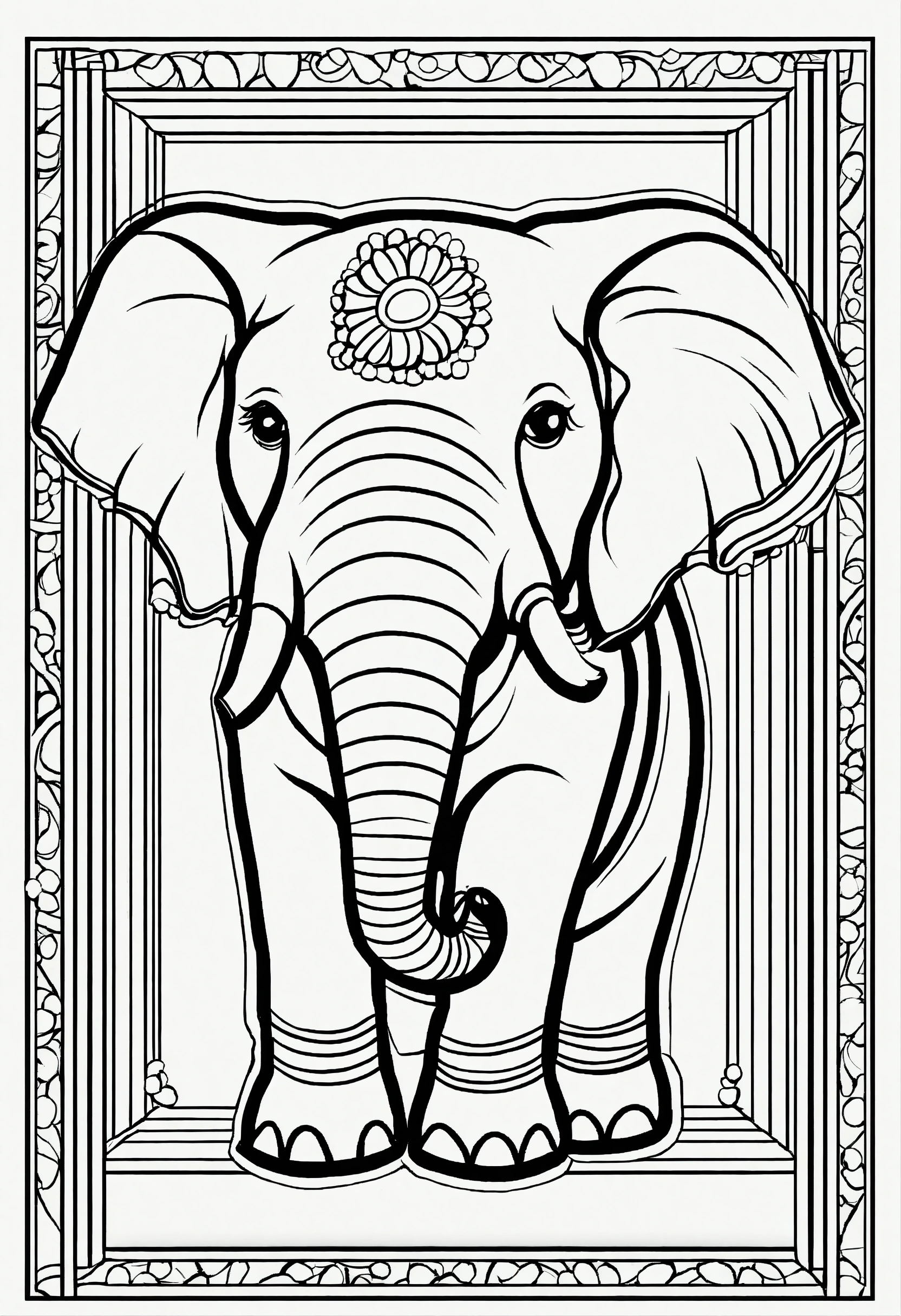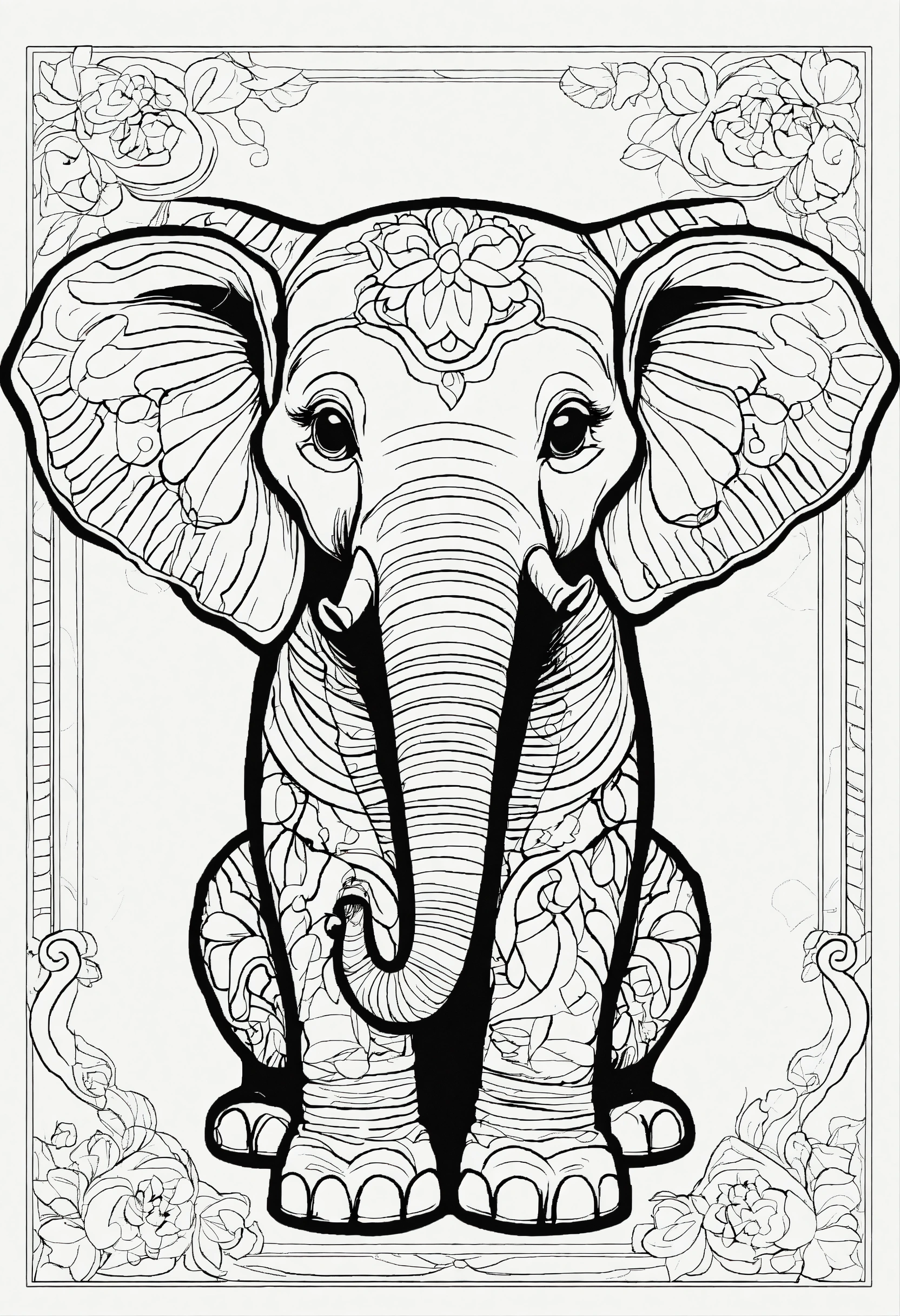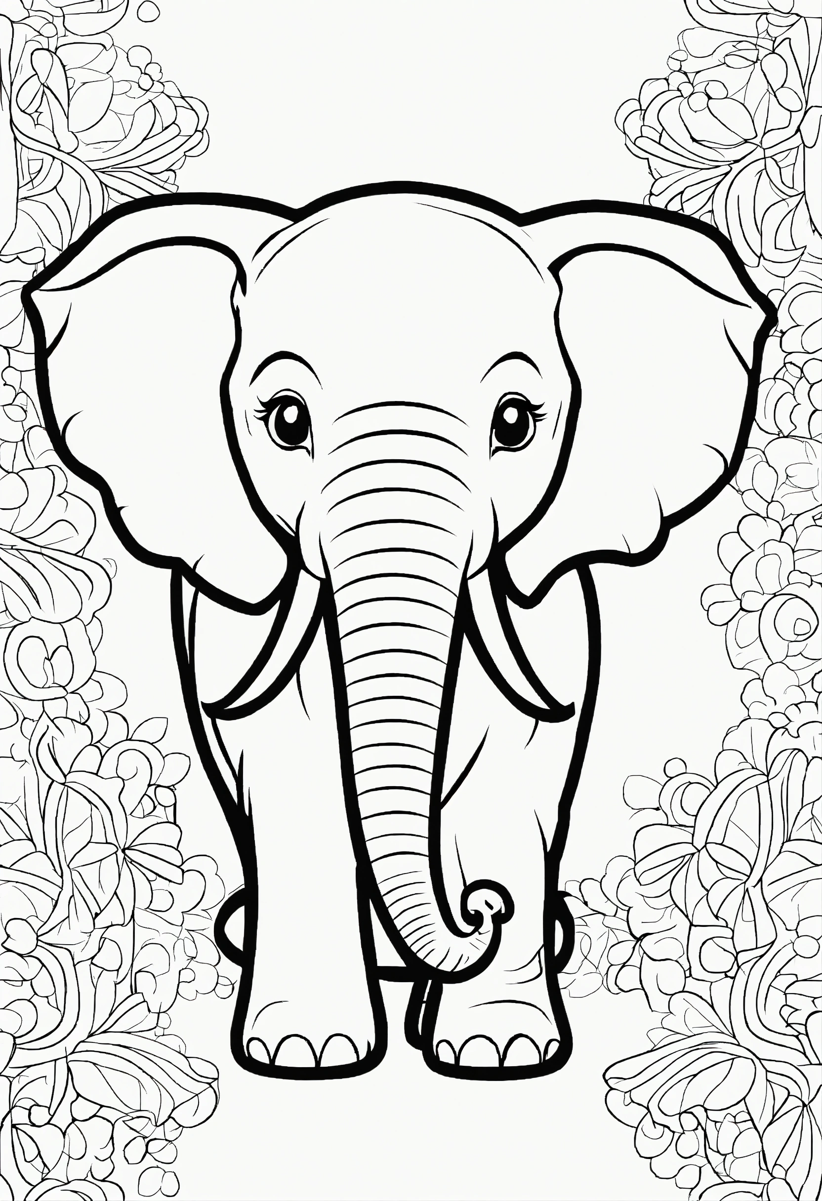 Coloring book for toddlers, simple lines drawings, no lines inside of the drawing, baby elephant, cartoon, full body, outline of the drawing in bold line, symmetrical, white background., no background image.