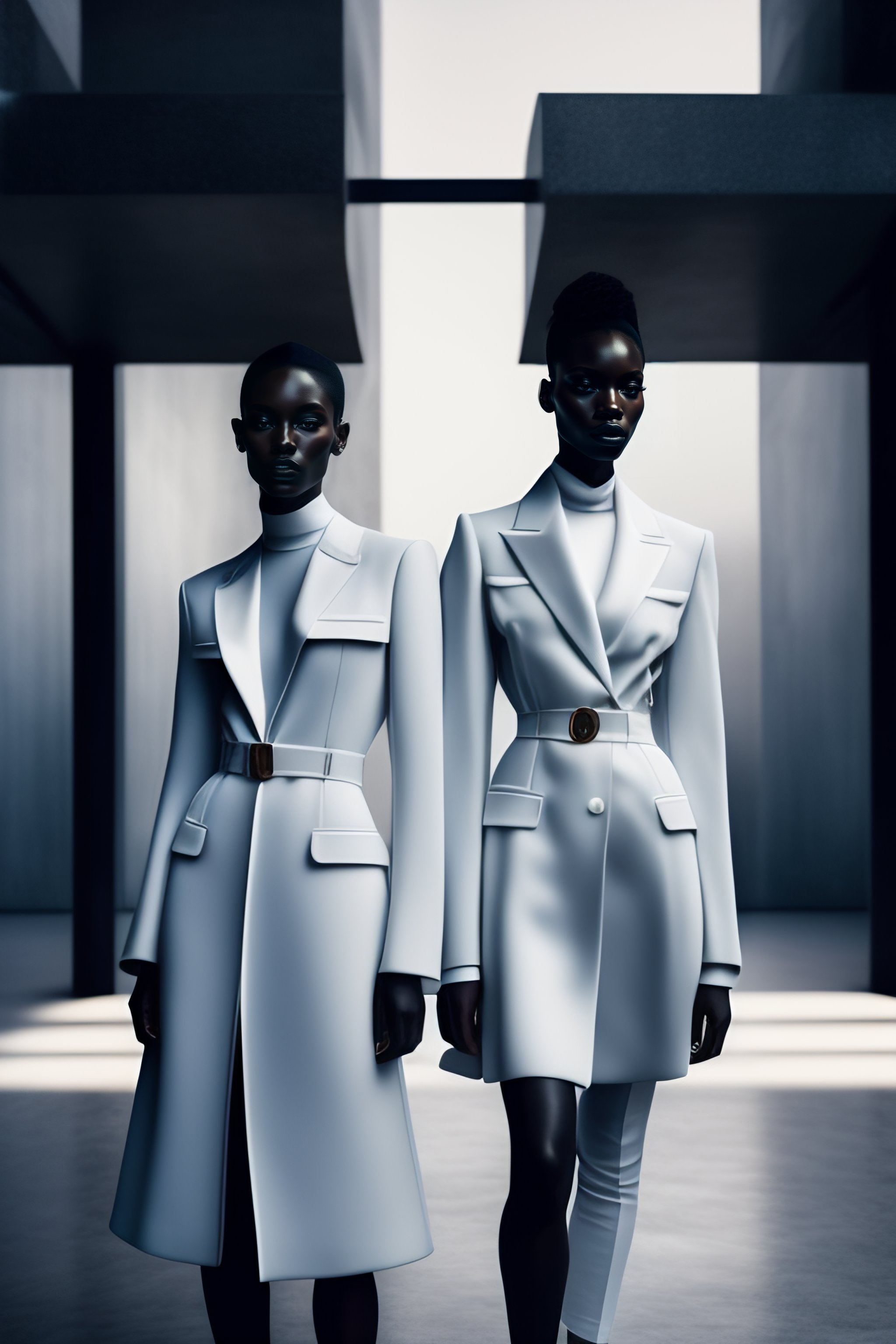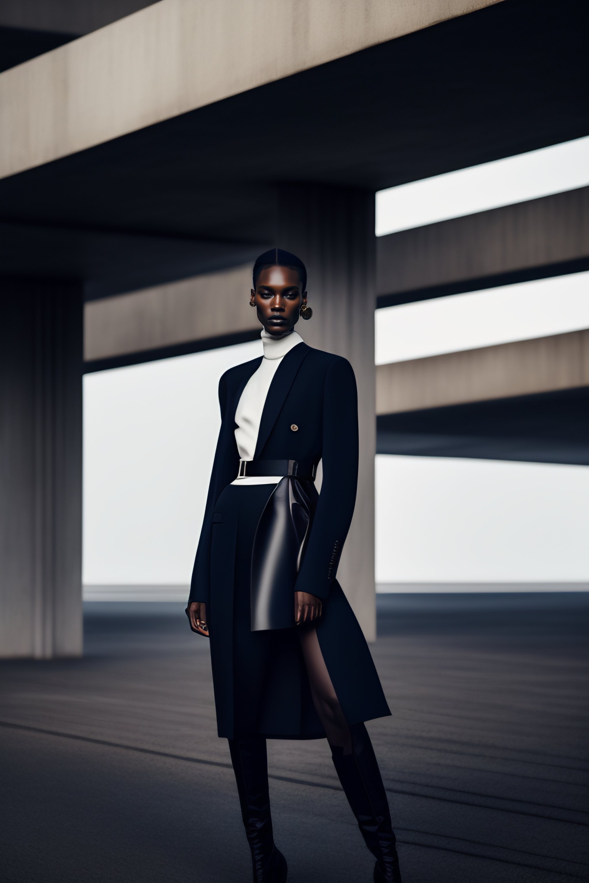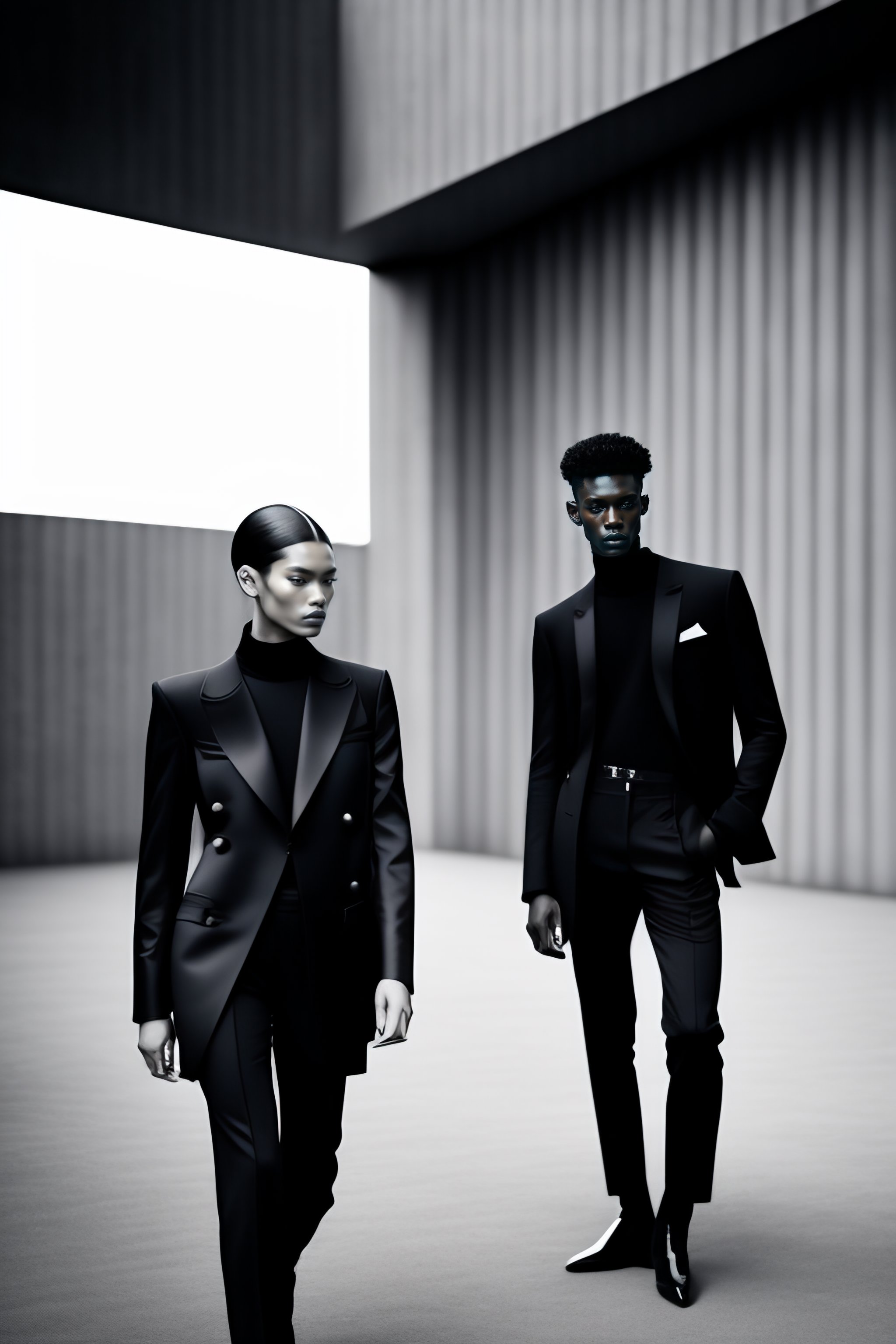 Yves saint laurent style photoshoot, models posing in brutalist style architecture, wearing dark flowing clothing by demna gvasalia