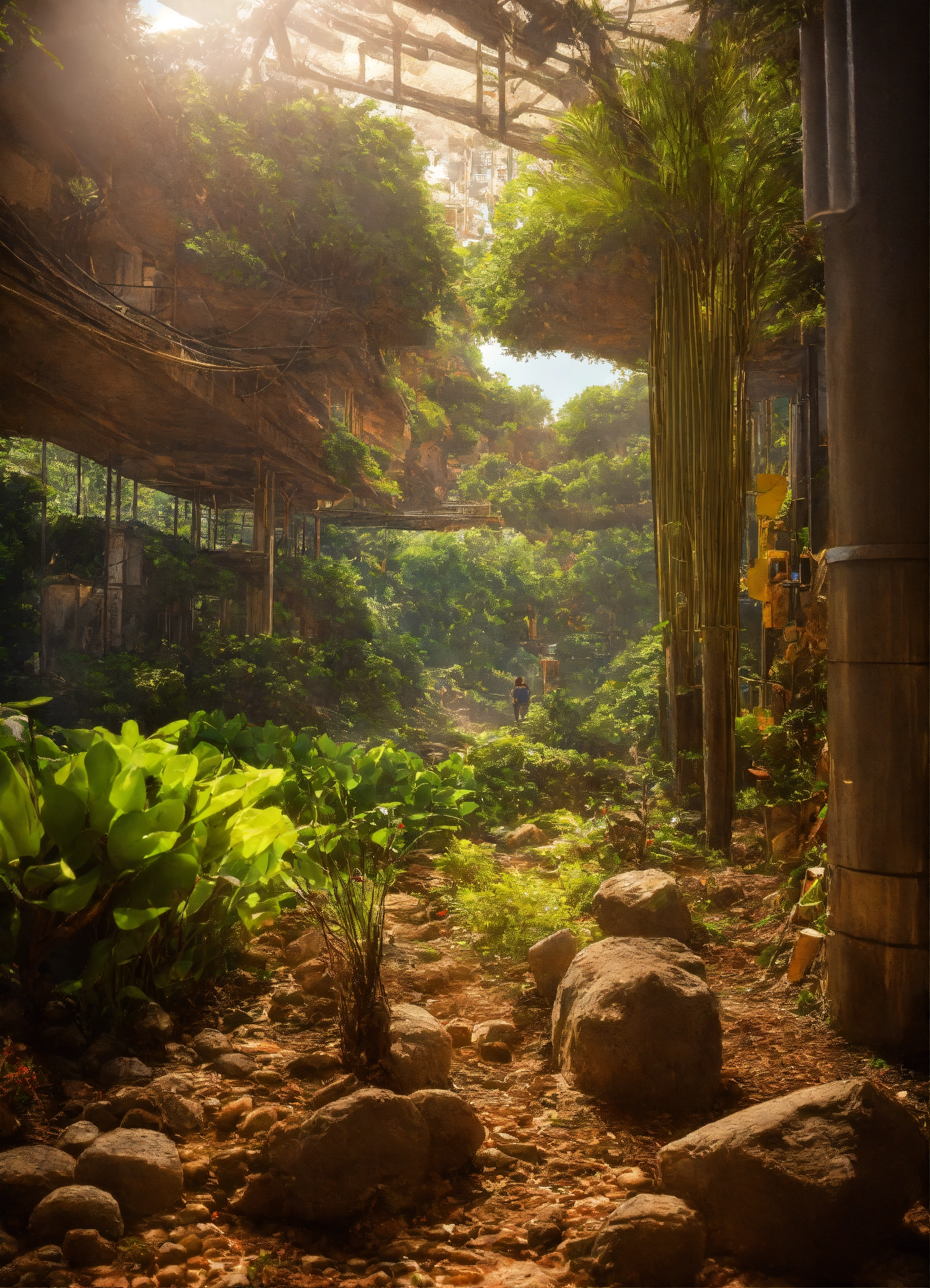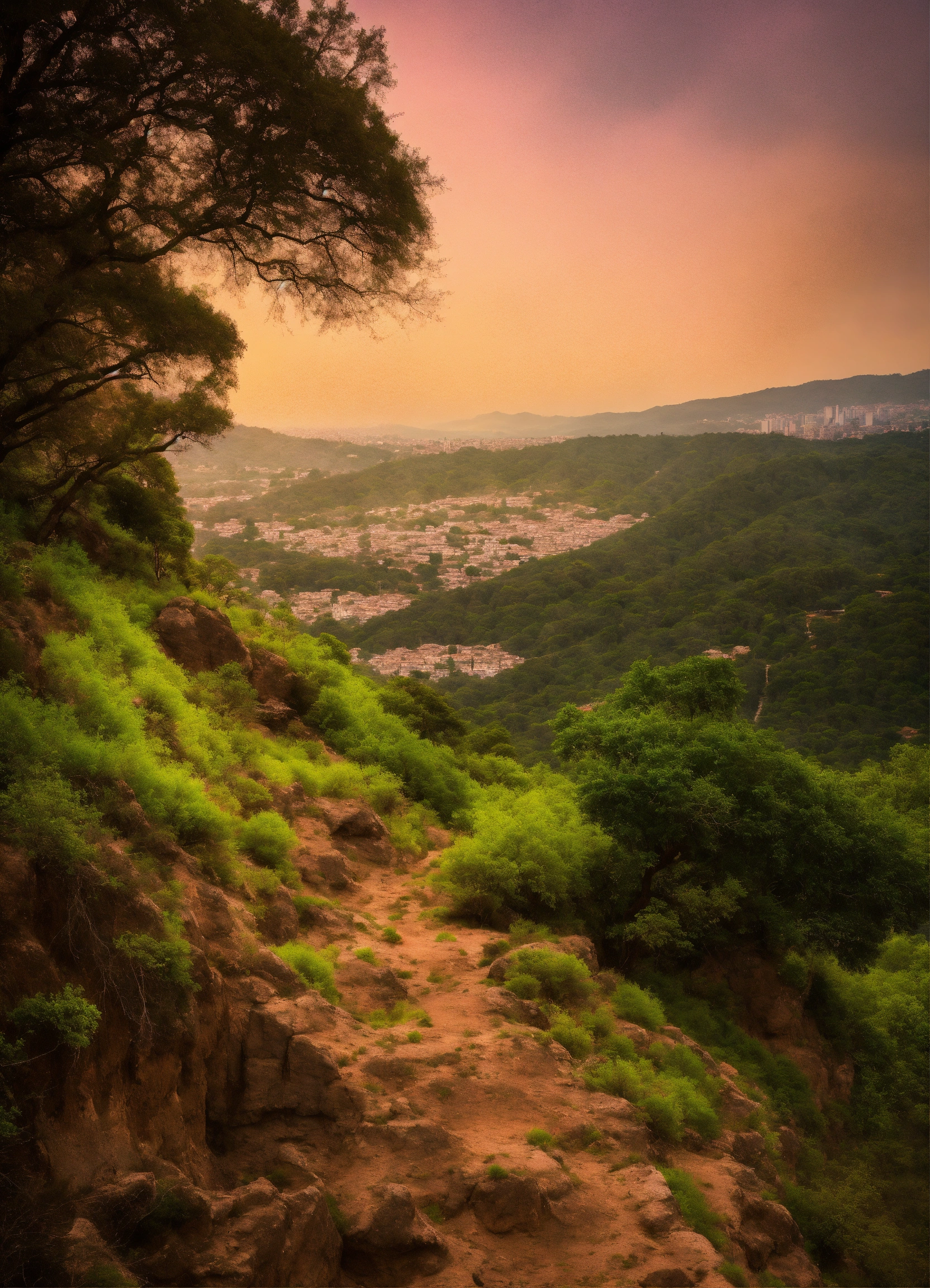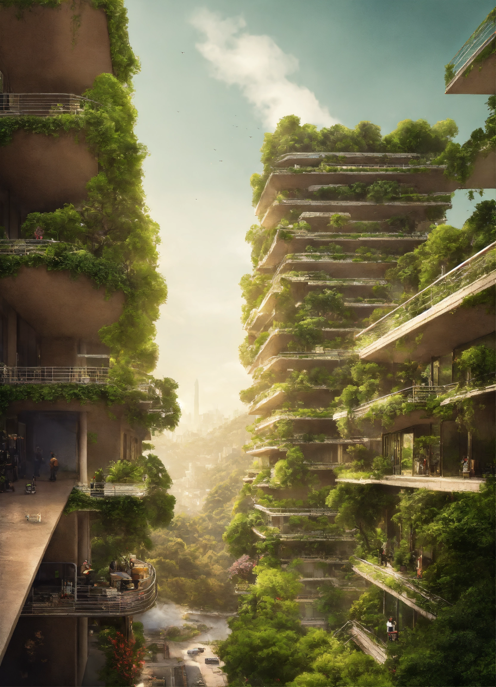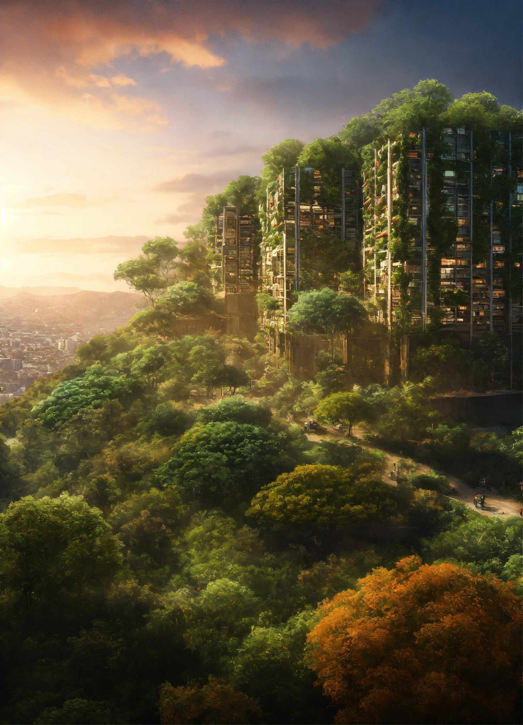 Foto profesional en formato horizontal, durante la mañana de paisaje de una ciudad ecologica, con mucha vegetación, y edificios no tan altos que se confunden con los arboles, en un valle rodeado de cerros bajas a la distancia, futurista, de una civilizacion humana que ha alcanzado un alto grado de tecnificación, en el año 2045 pero que ha logrado una integración armónica de energías renovables y sustentabilidad ecologica tomado con leica, juego de sombras, magnífica iluminación, sutiles tonos pastel, 8k