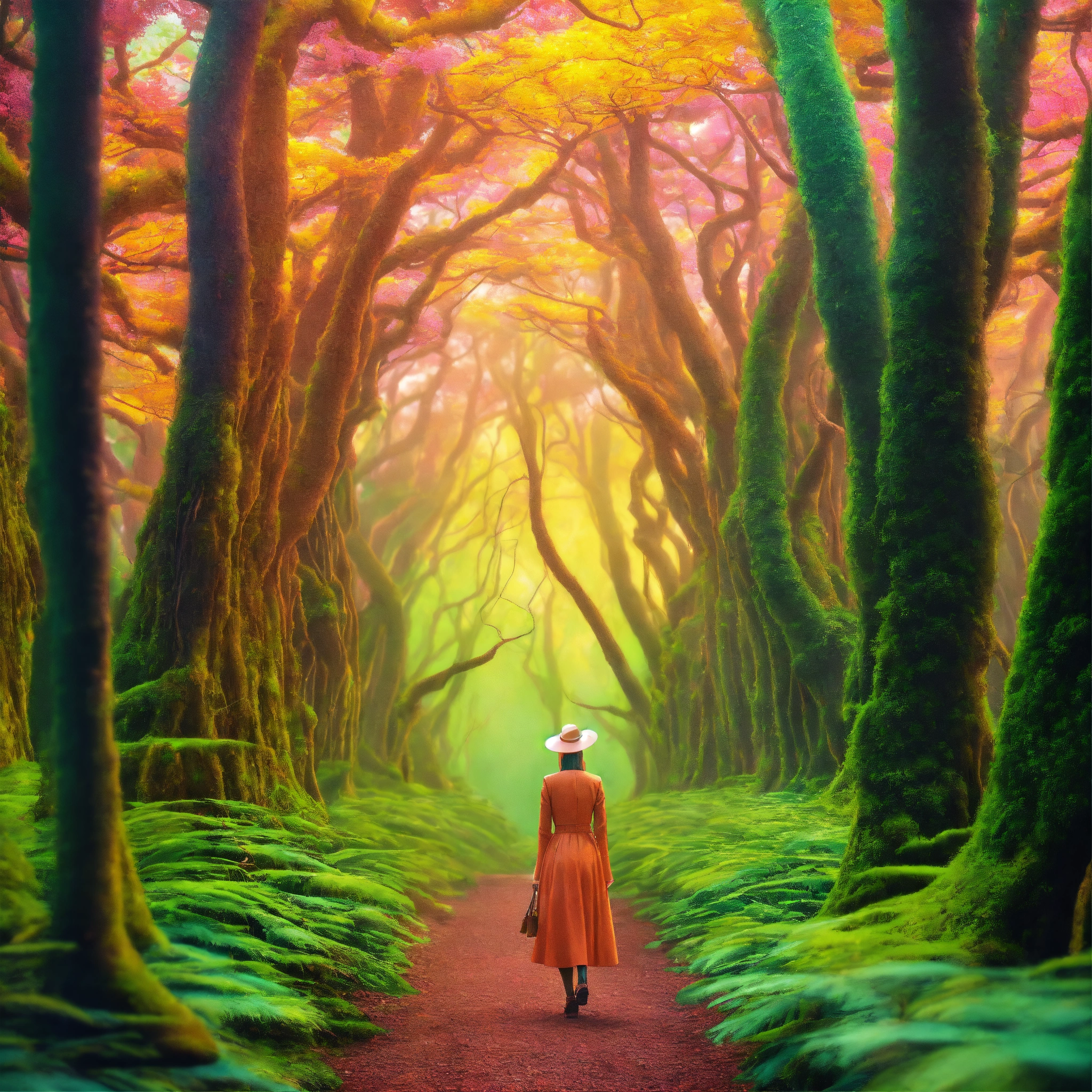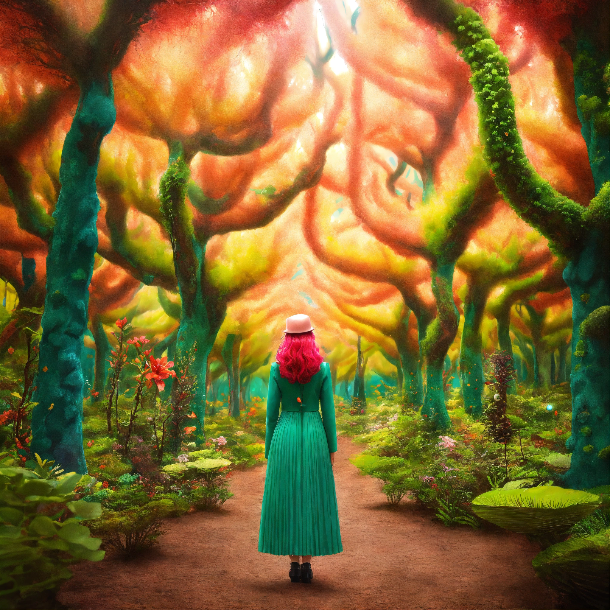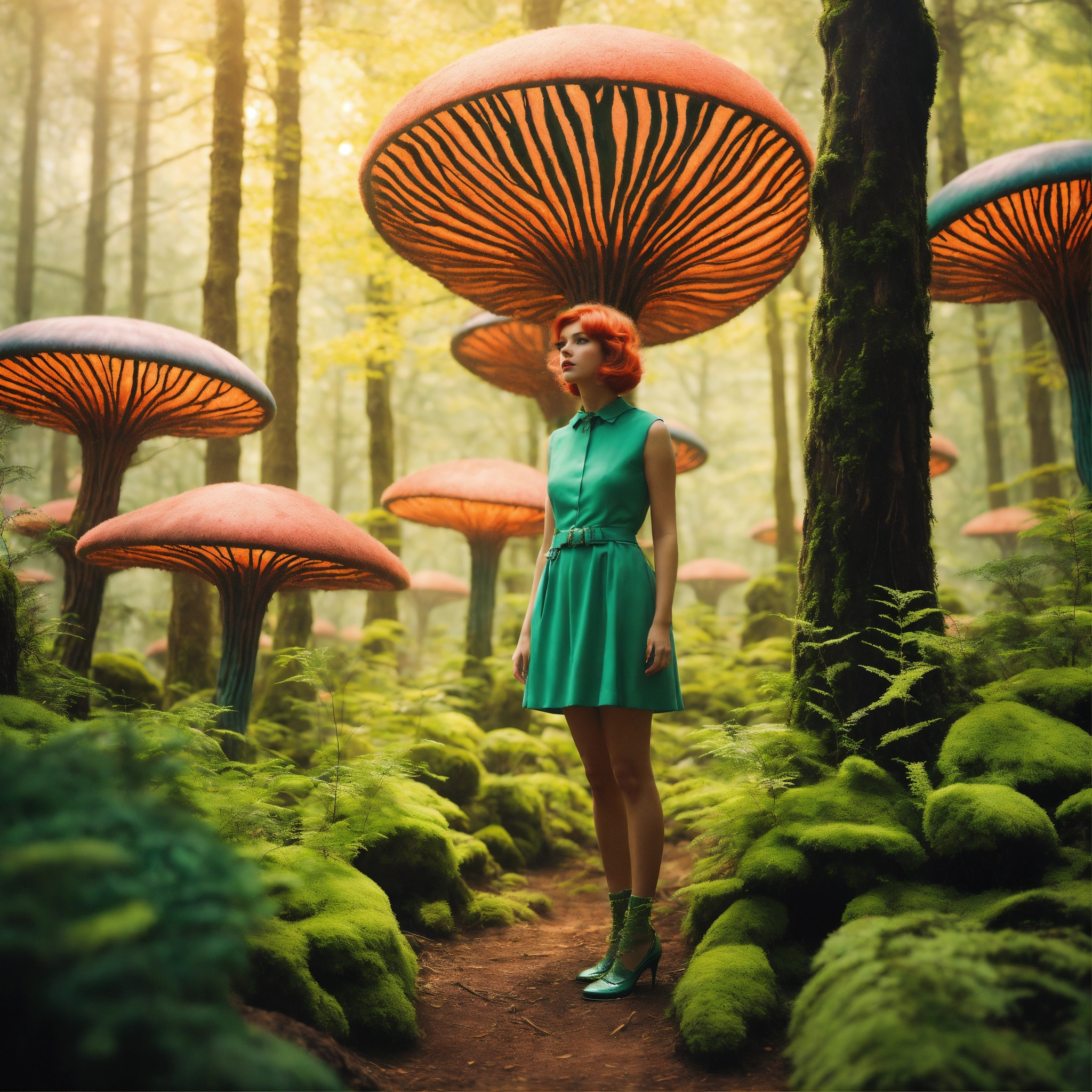 Whimsical alien forest imagine a surreal forest where the trees have peculiar, alien features. the woman strolls through this retro forest, her hair blending with the whimsical, luminescent flora. alien creatures can watch her curiously, wes anderson colour, photo-realistic