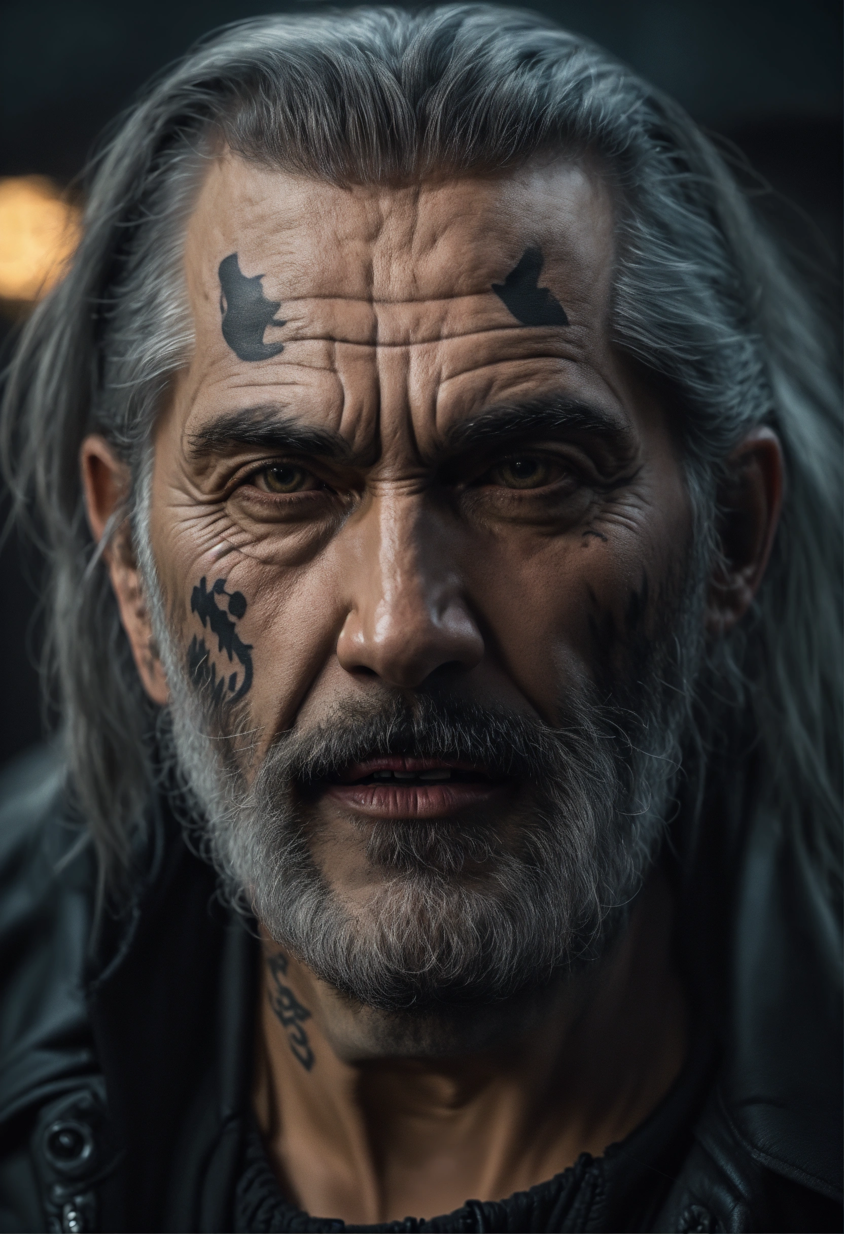 A realistic photo of a scary 50-year-old romanian man, with long gray hair in a ponytail, scary intimidating face, ugly features, with tattoo, wearing a black jacket, in a dark werehous, hyperdetailed, hyperrealistic, 8k