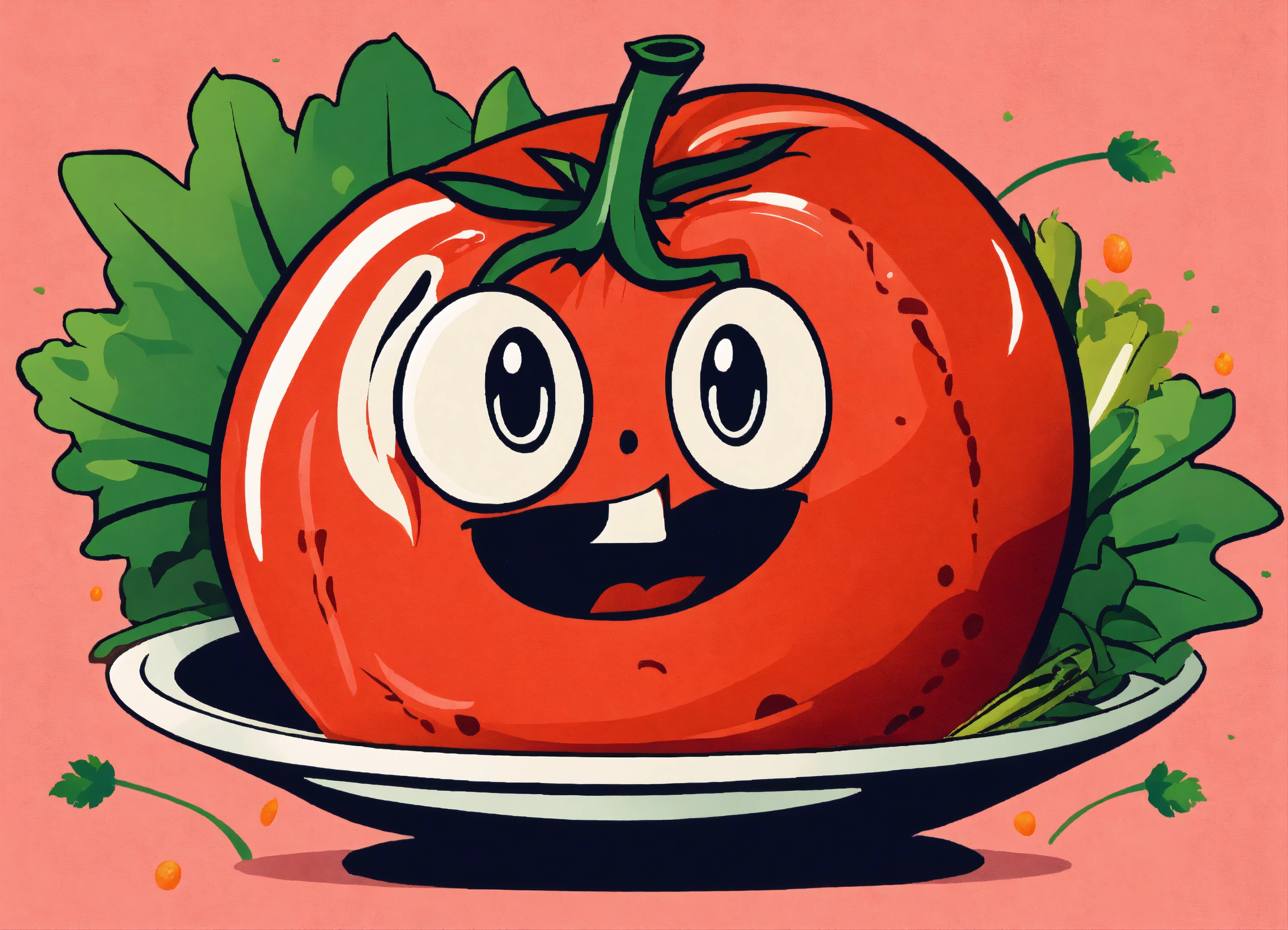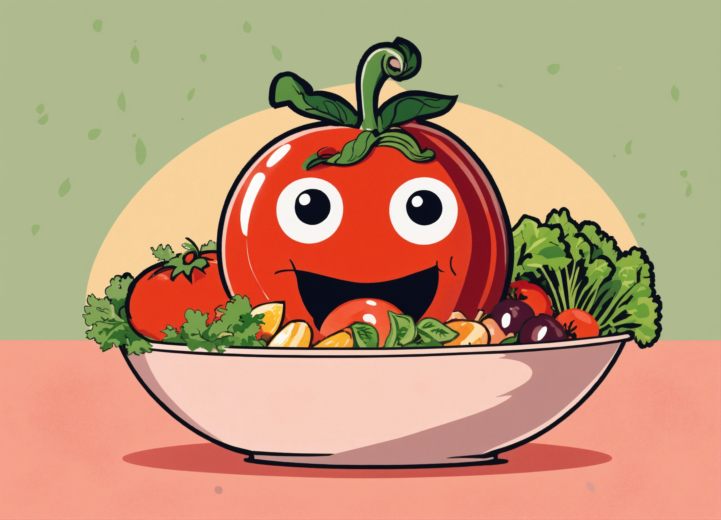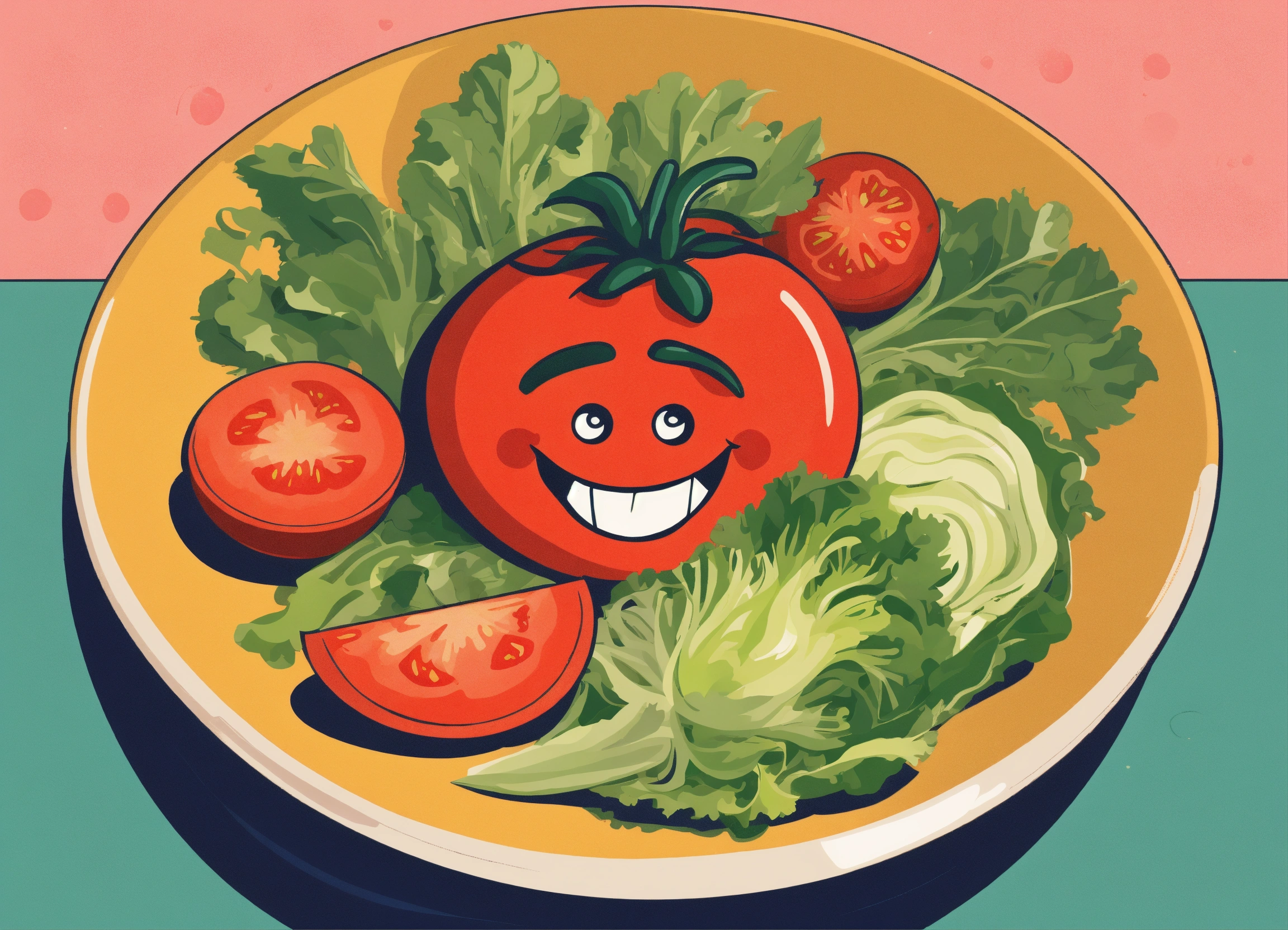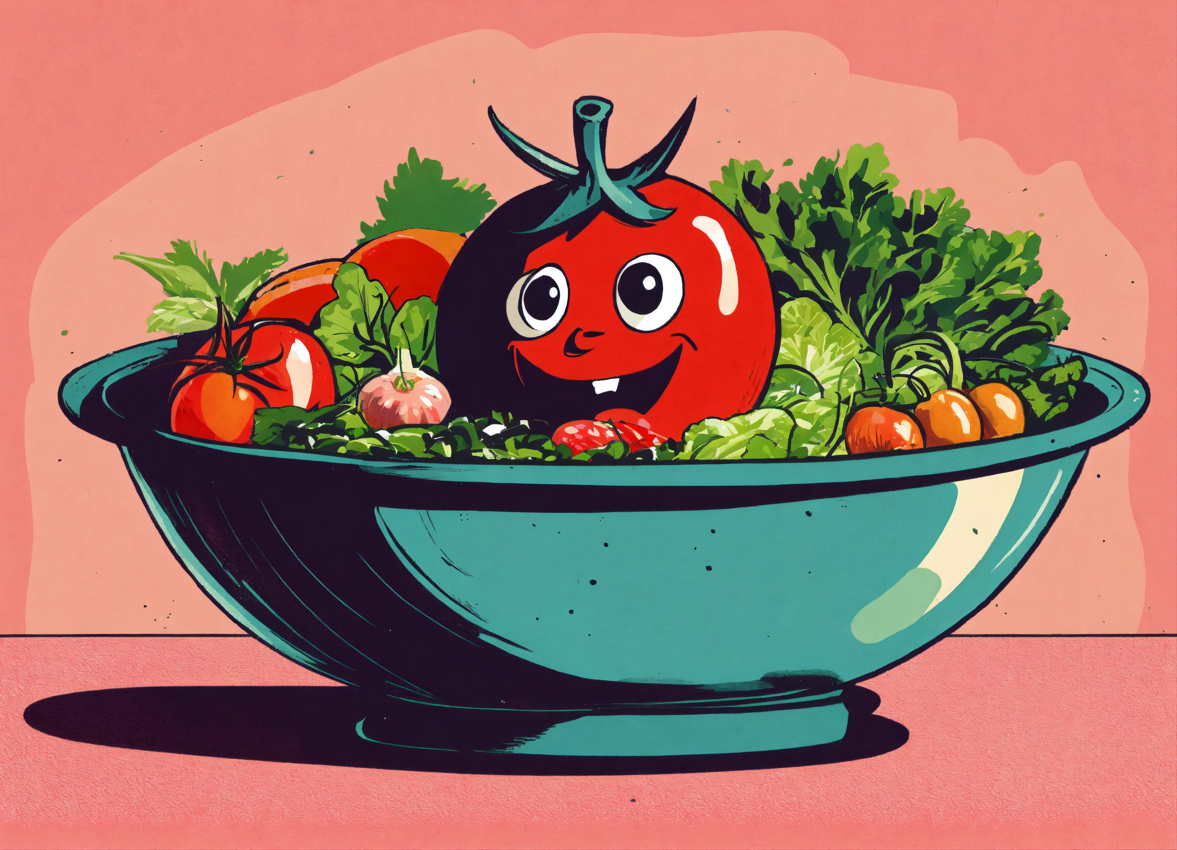 1960's style graphic design art illustration, create a humorous image of a blushing tomato looking surprised and embarrassed while peeking at a salad bowl with various veggies and dressing