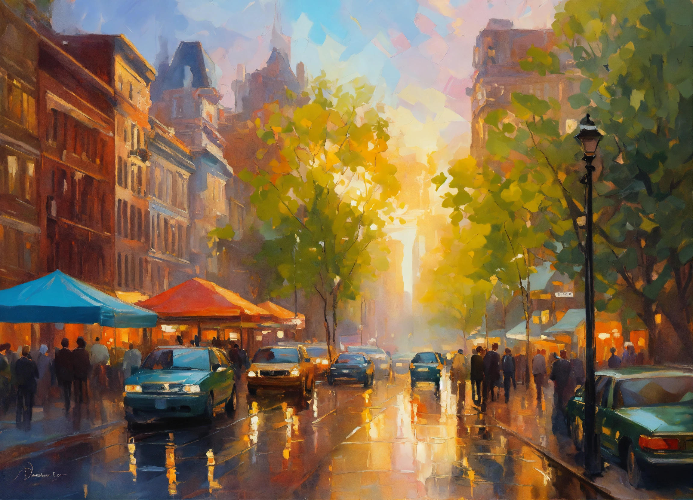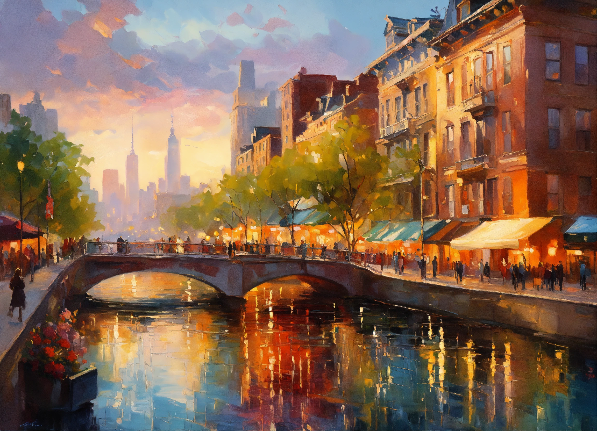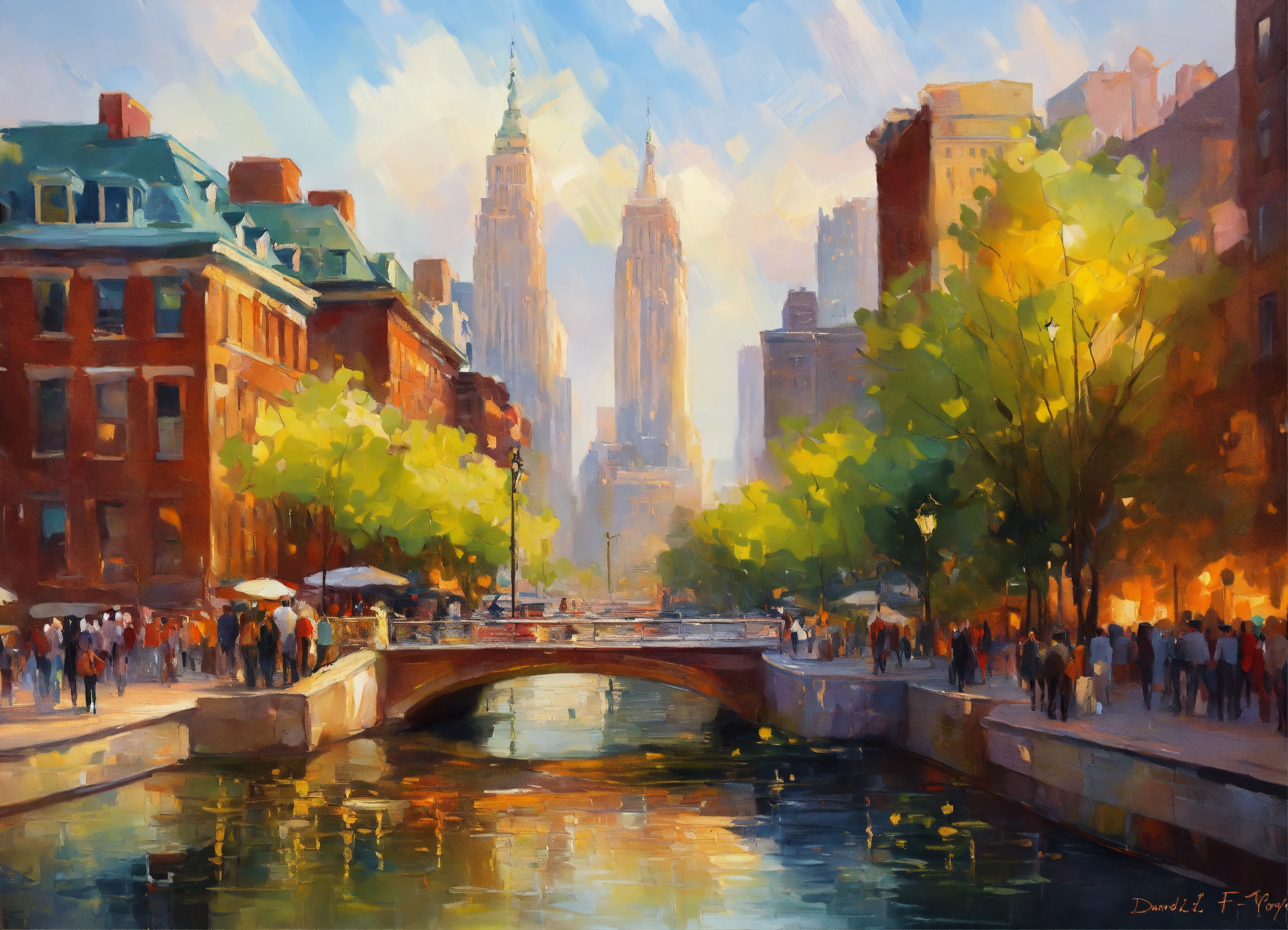 A colorful art illustration of the cityscape, new york city, view of a beautiful spring, paintings by daniel f. gerhartz and claude monet and leonid afremov, ultrarealistic.