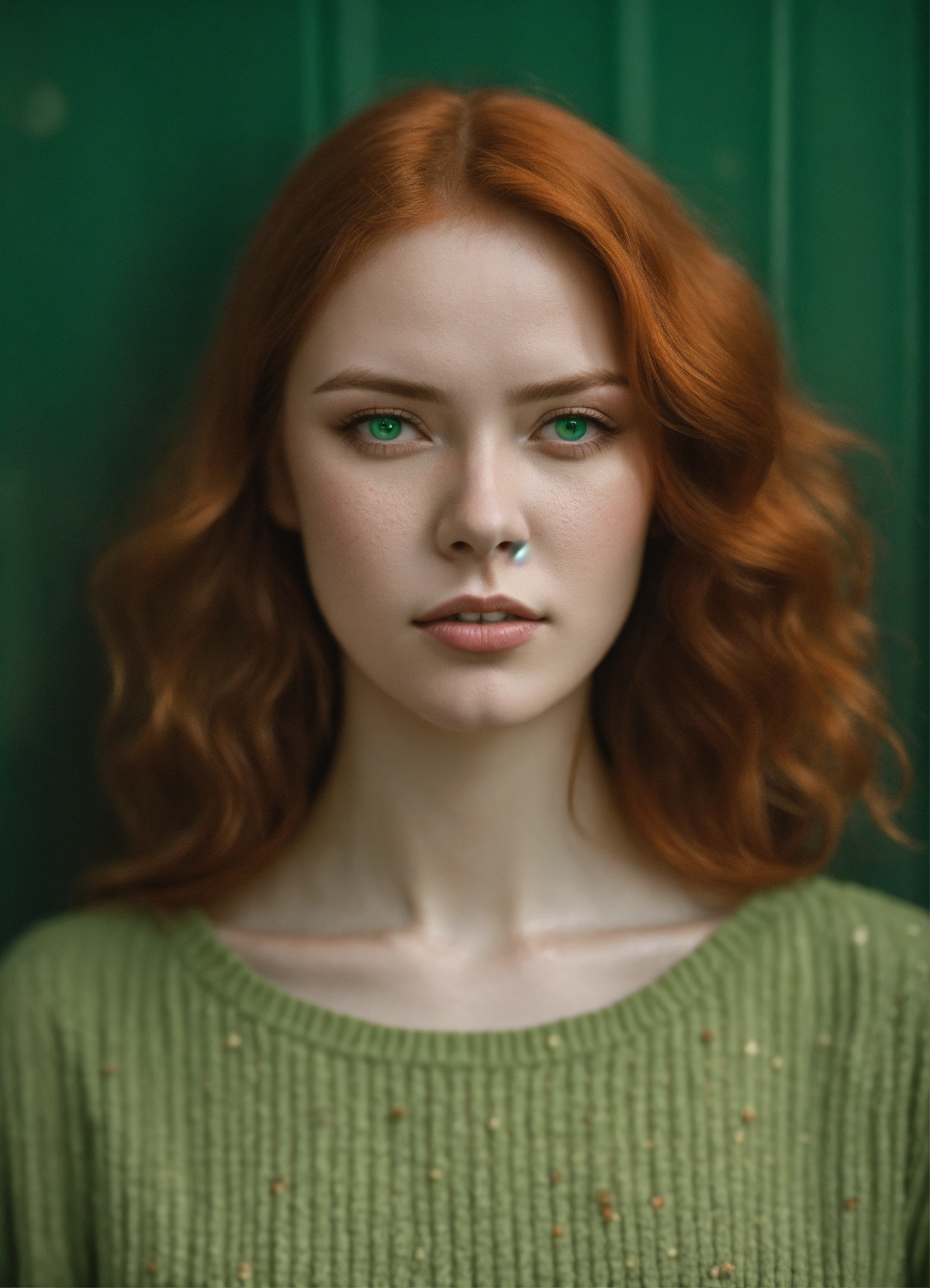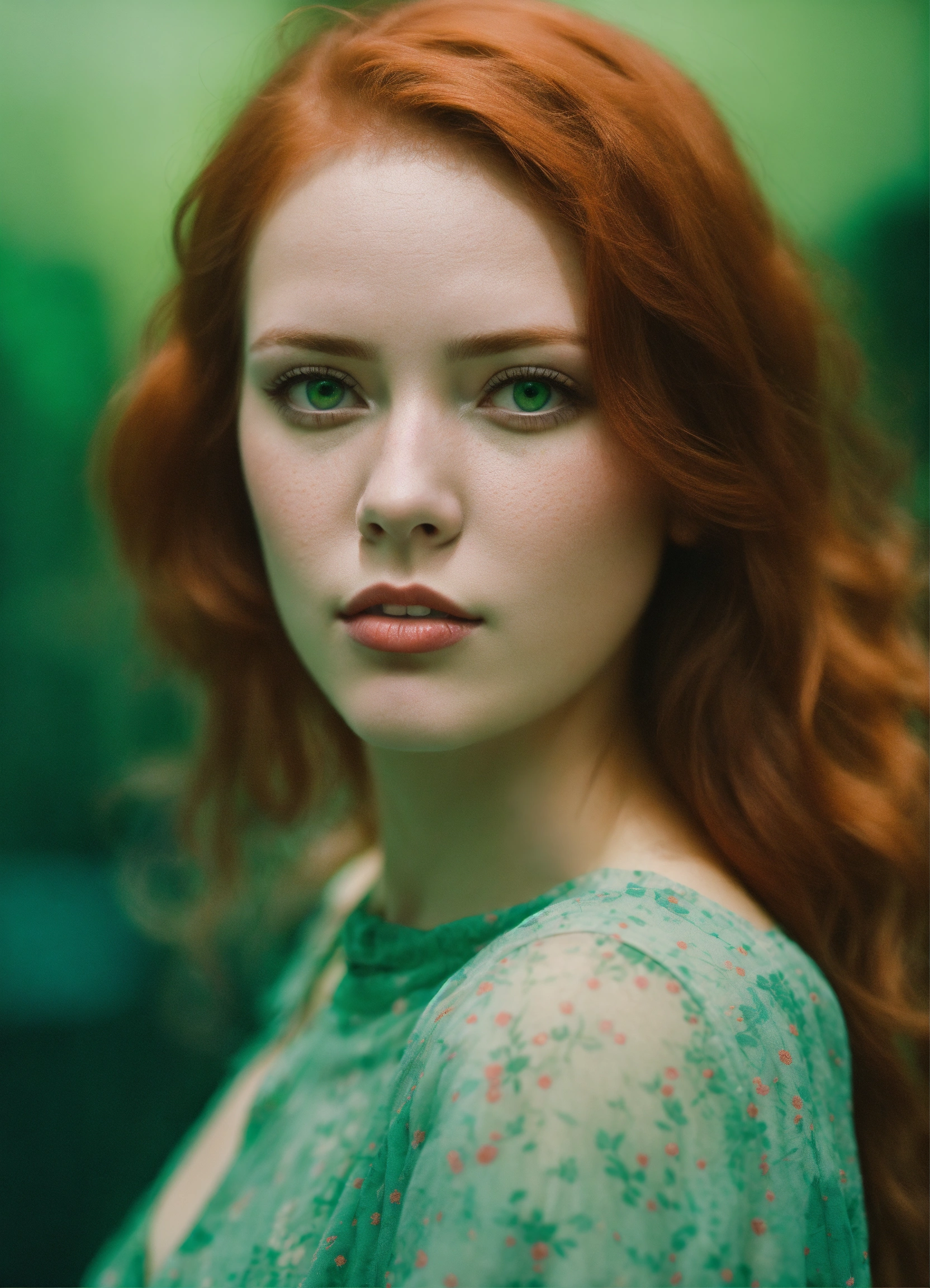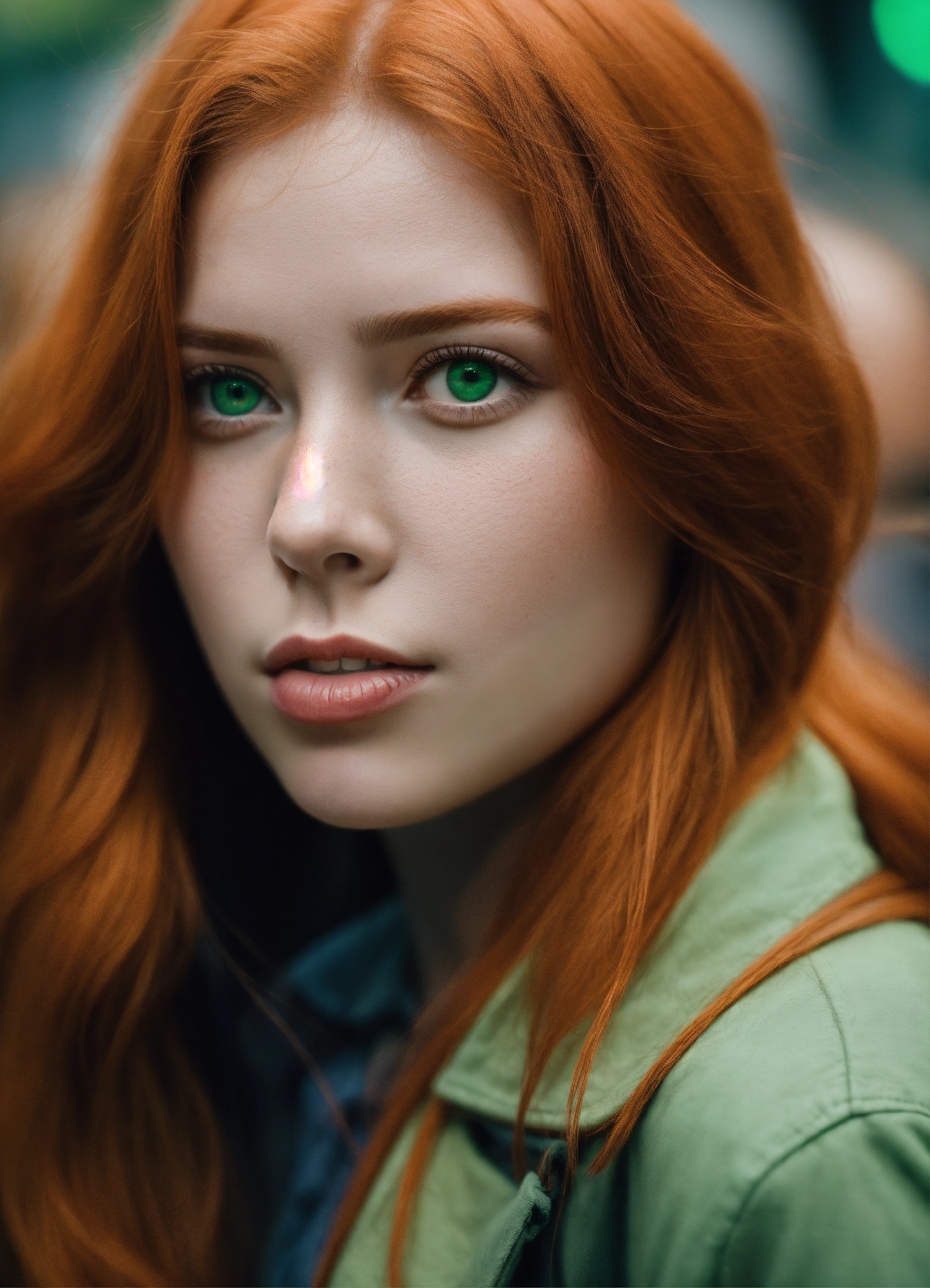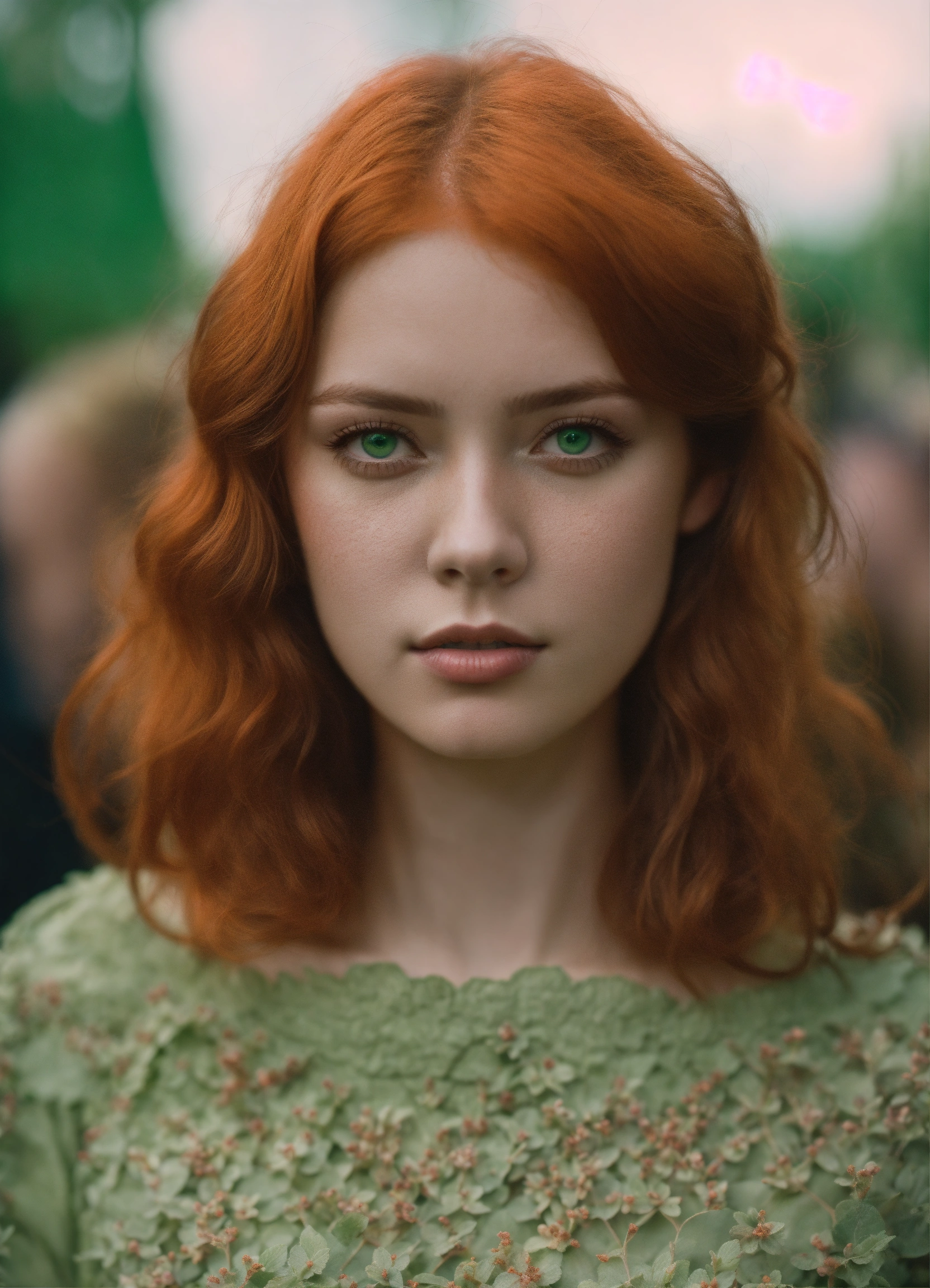Muted portrait of a red headed woman with green eyes, photography from the waist up titled "lost in the crowd", muted palette, soft colors, detailed, 8k