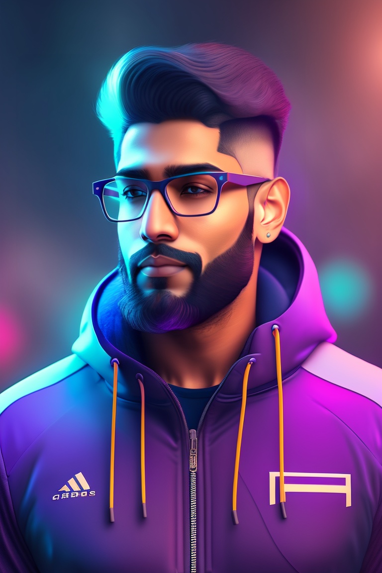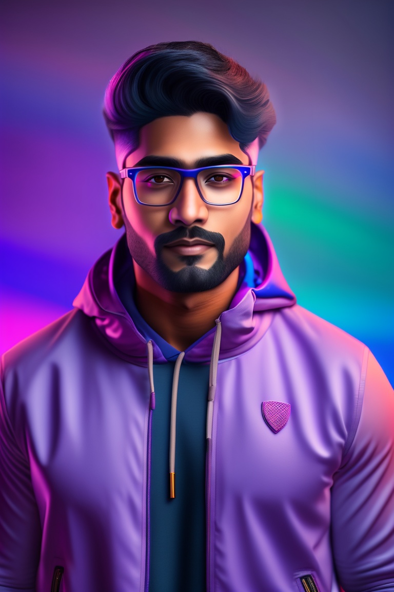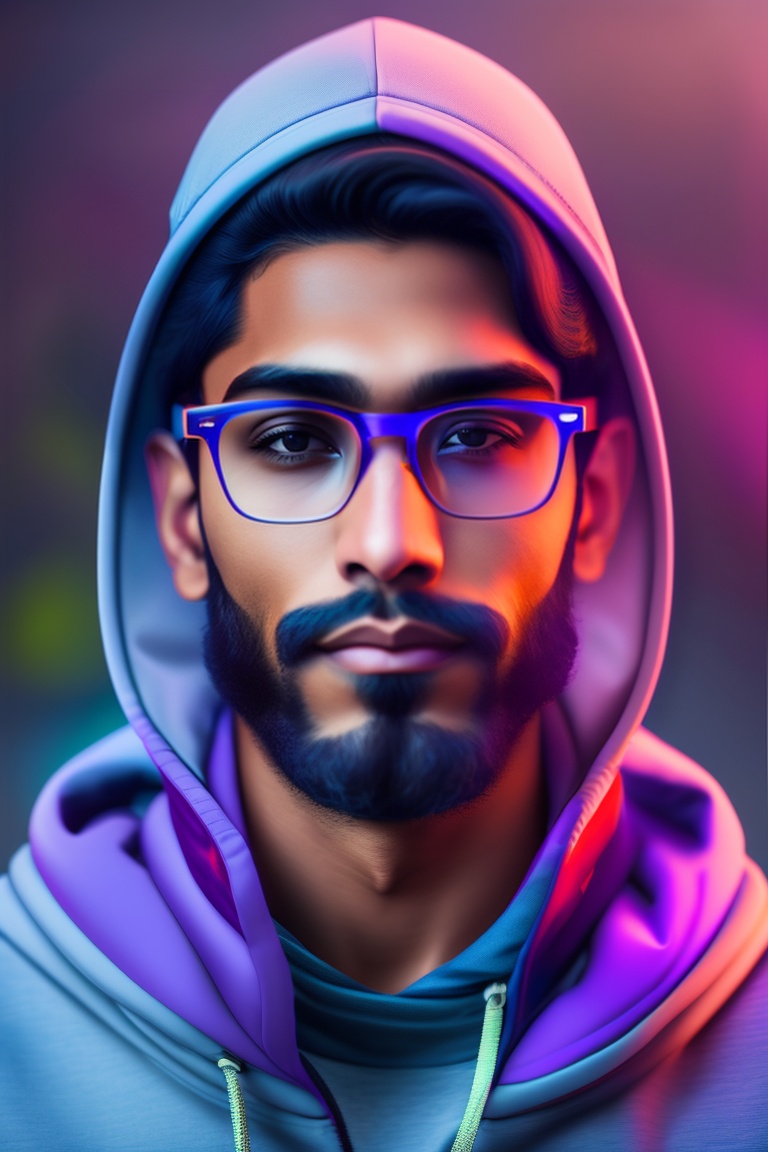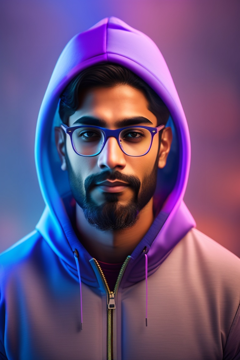 Indian man with glasses with aesthetic background and a light beard. fit and fair man, streamer setup and light blur background with blue and voilet color. man is wearing a hoodie.