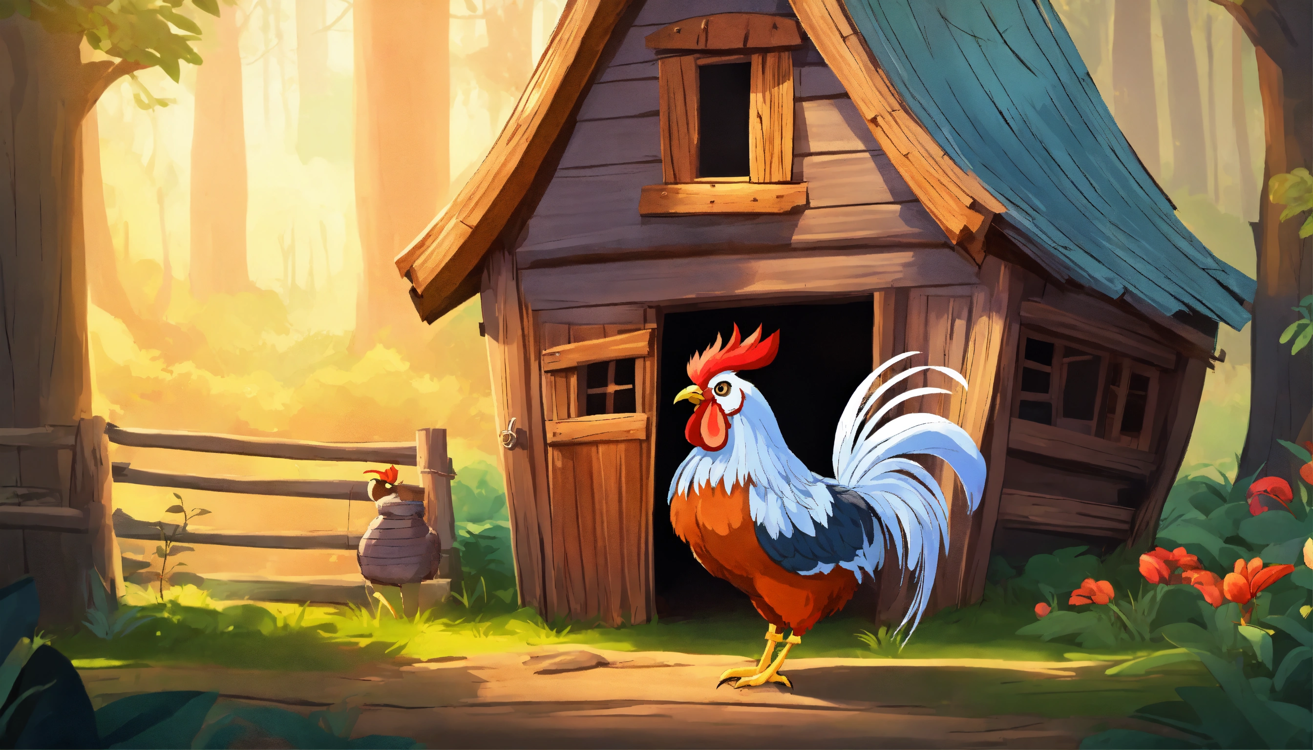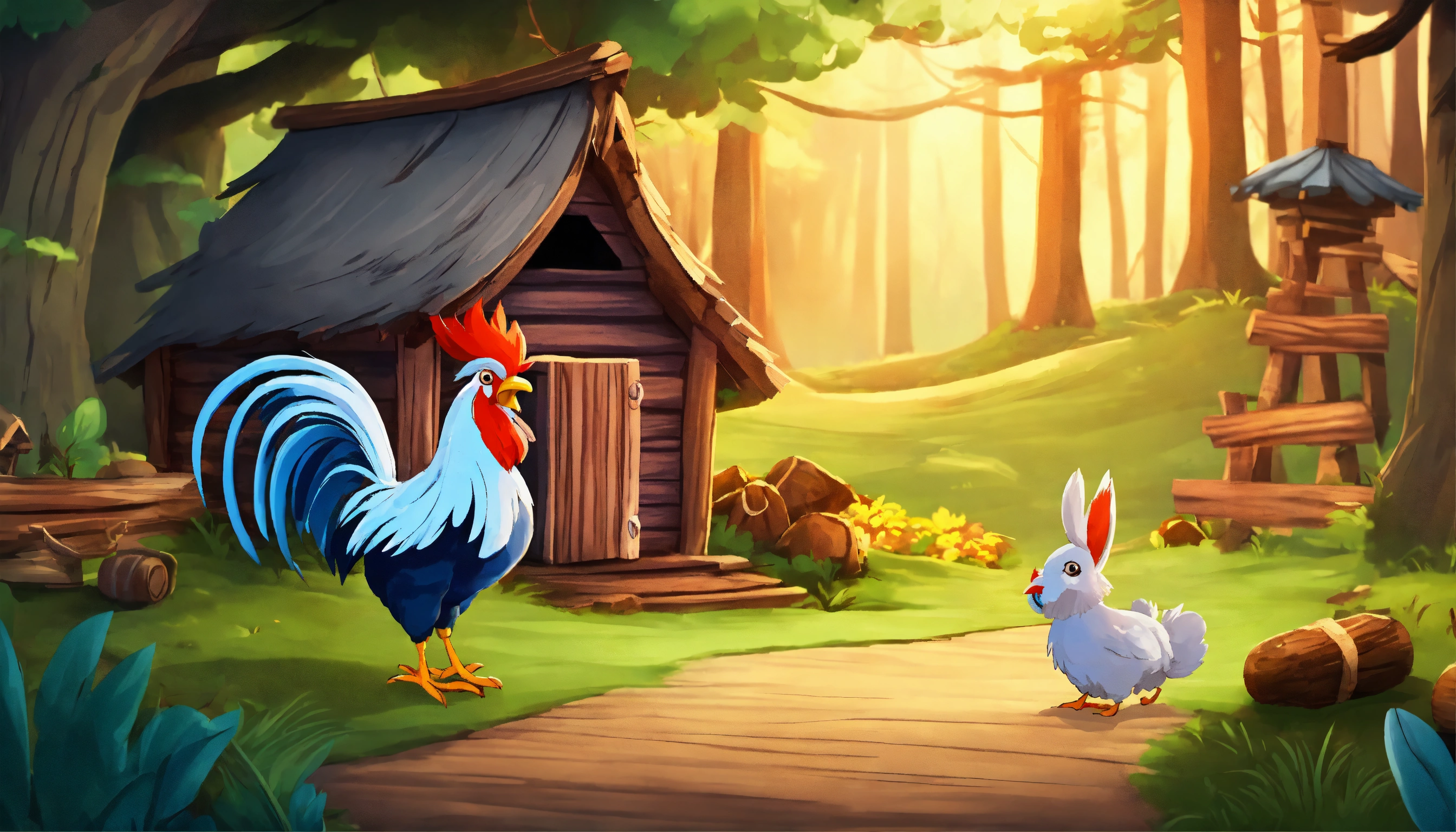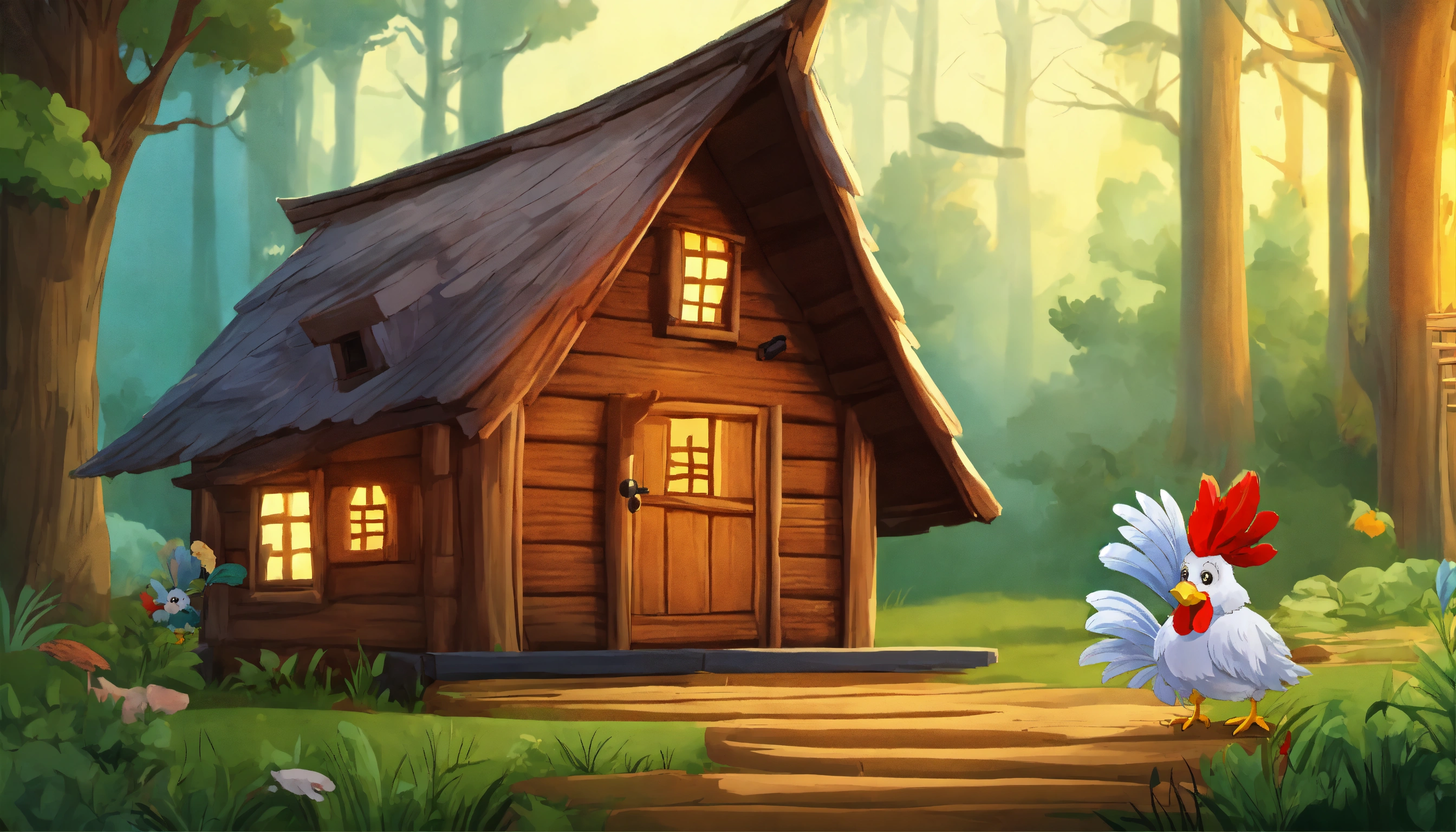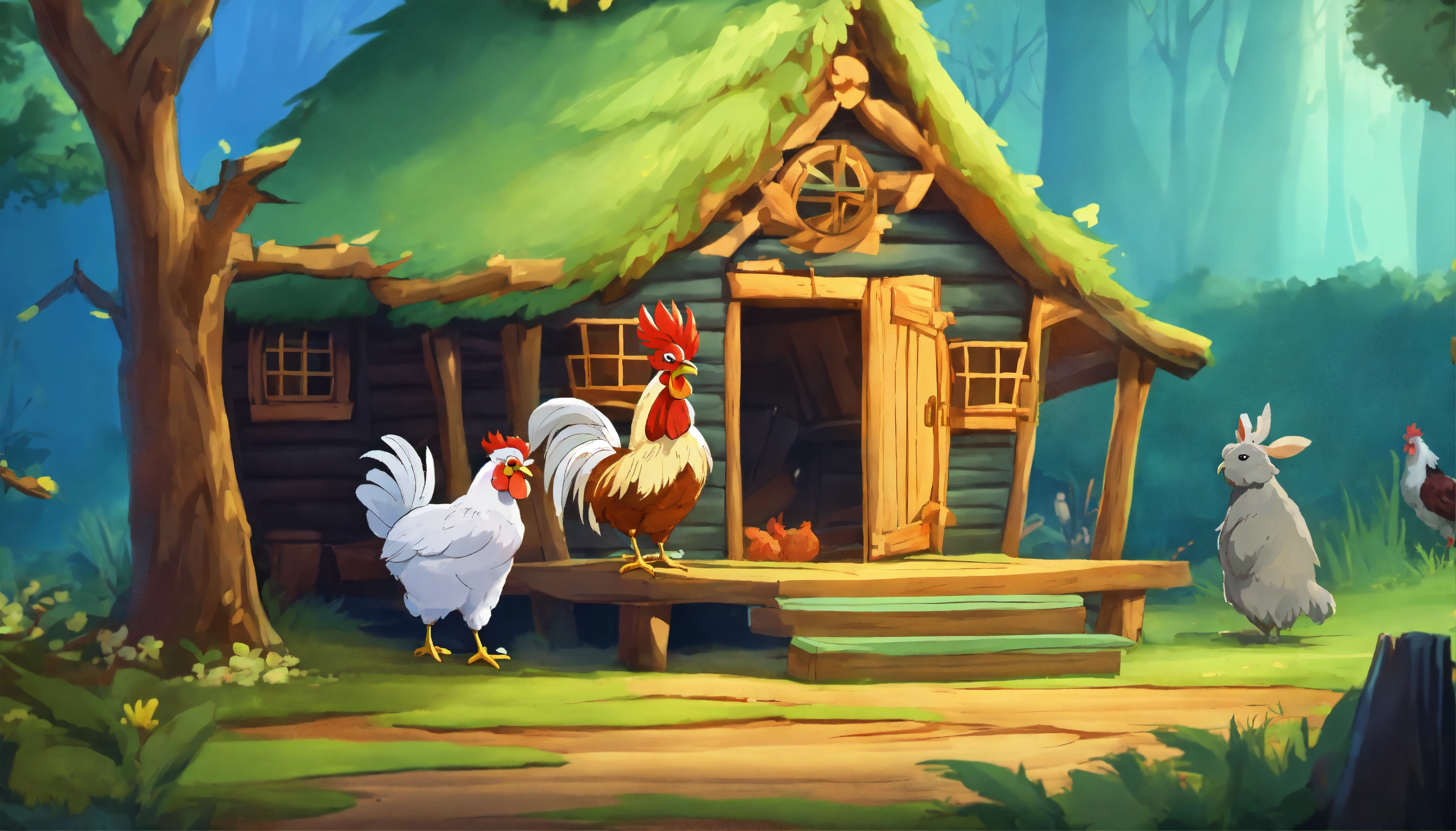Cartoon style rooster and a grey rabbit near the wooden hut in the magical wood