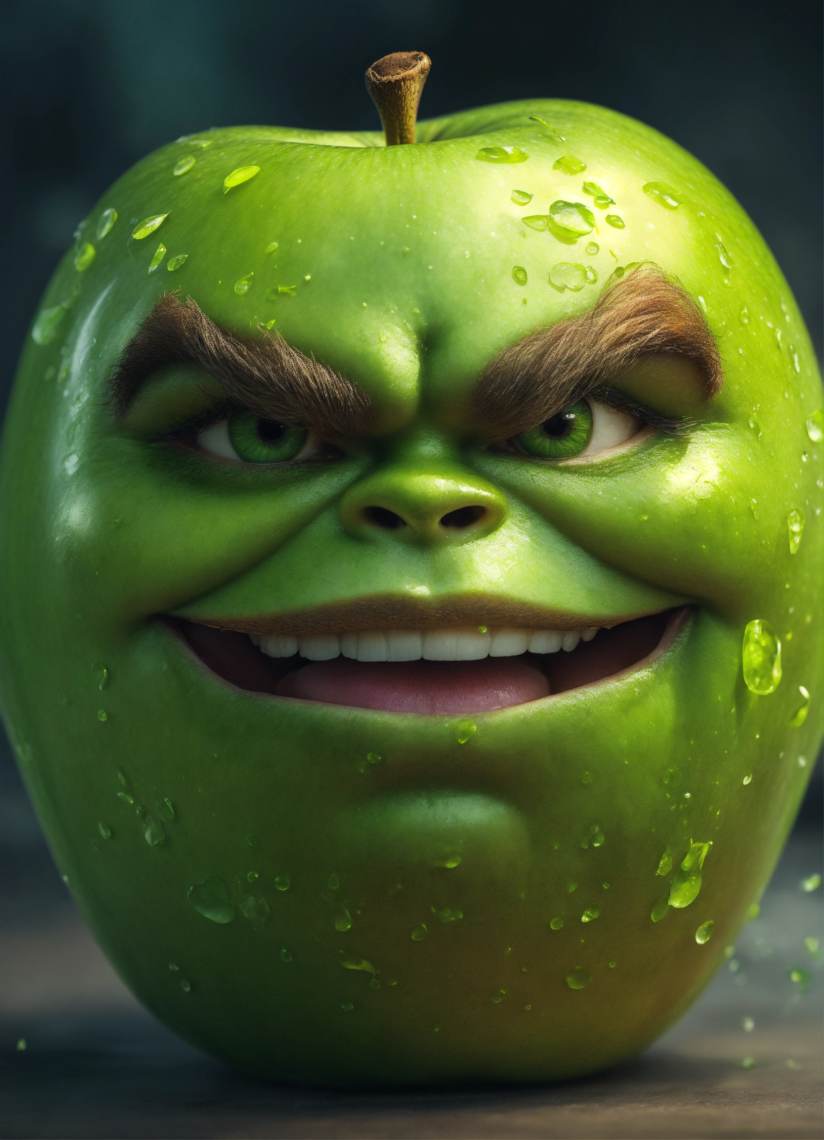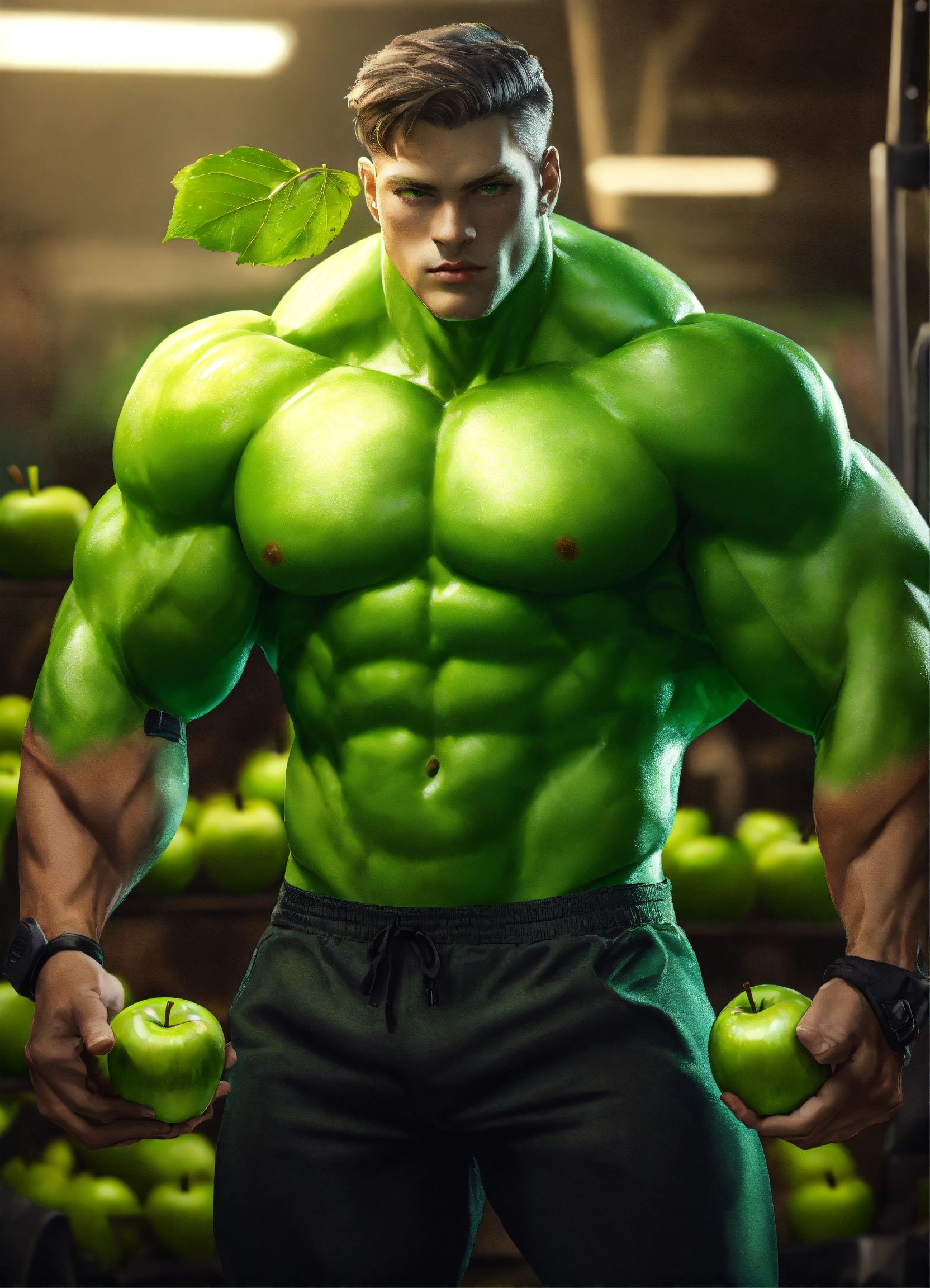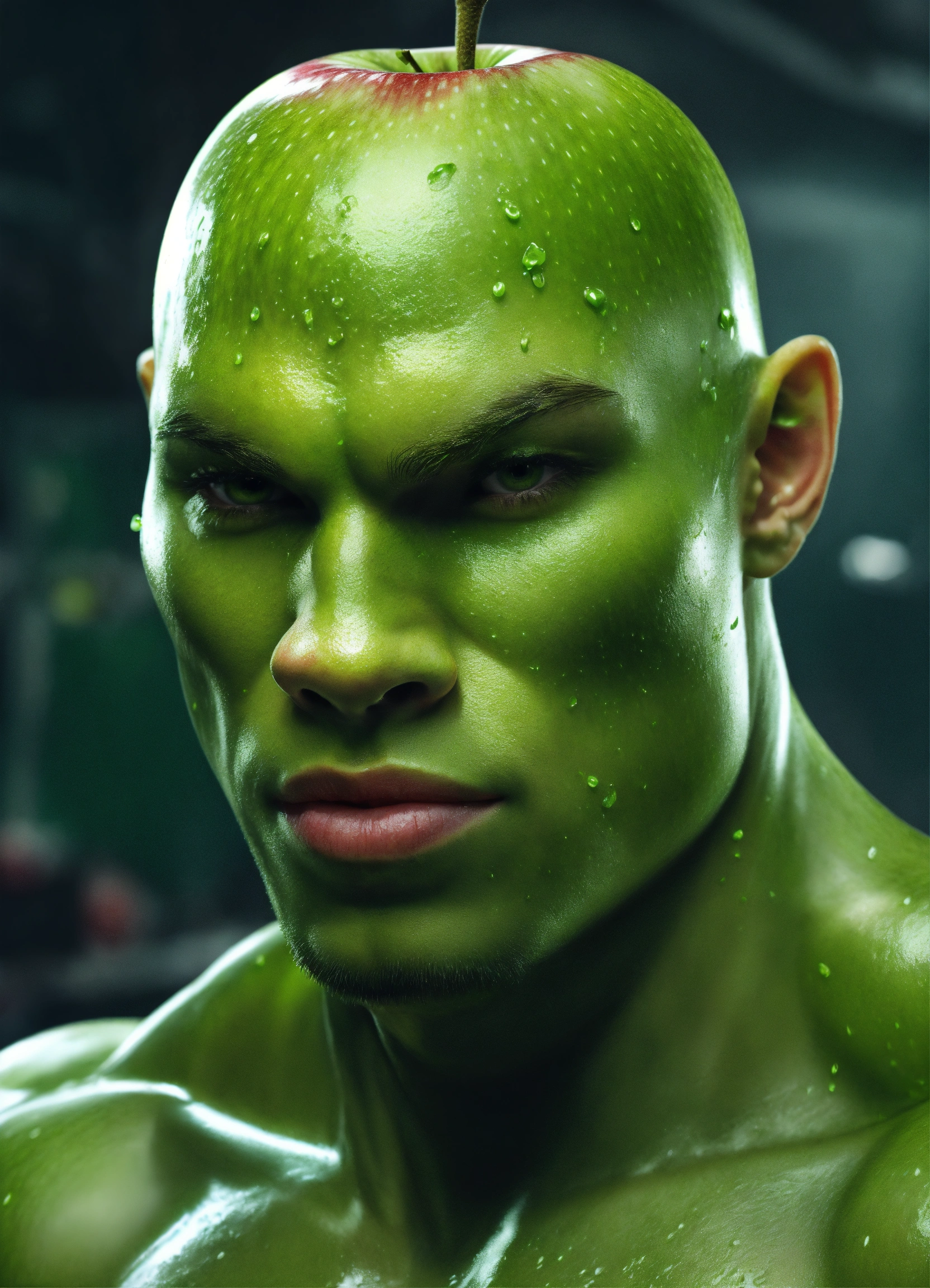 A humanized green apple with a hyper realistic face thats very muscular working out