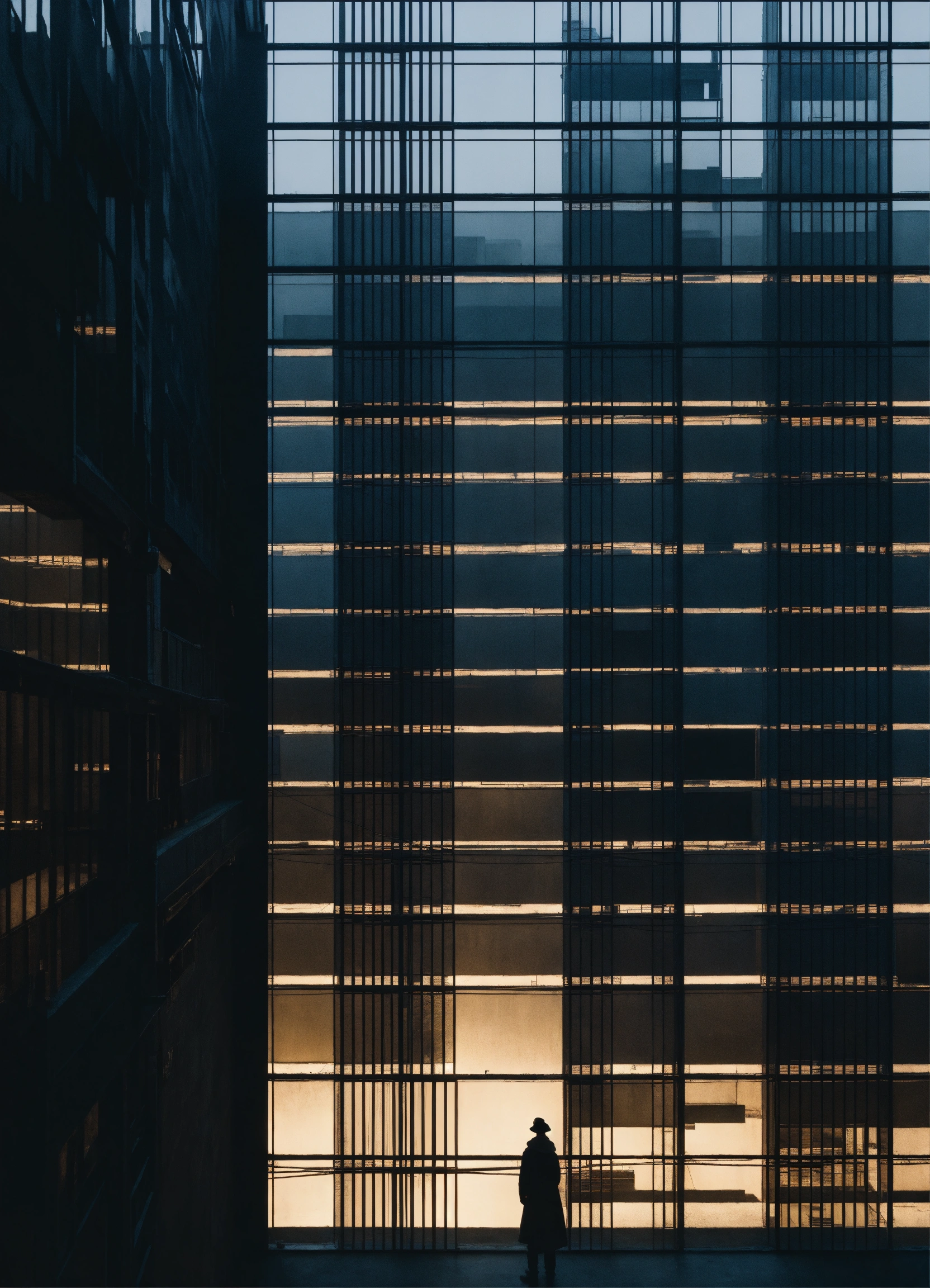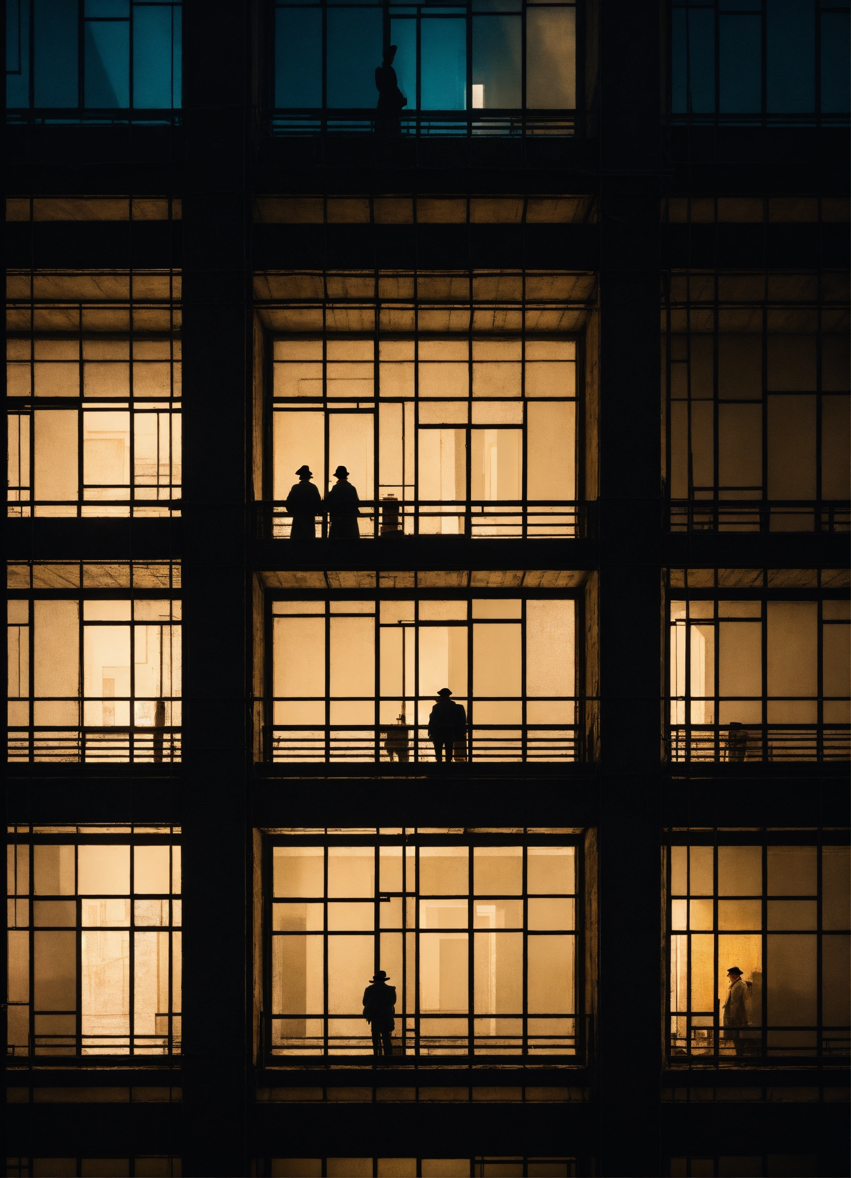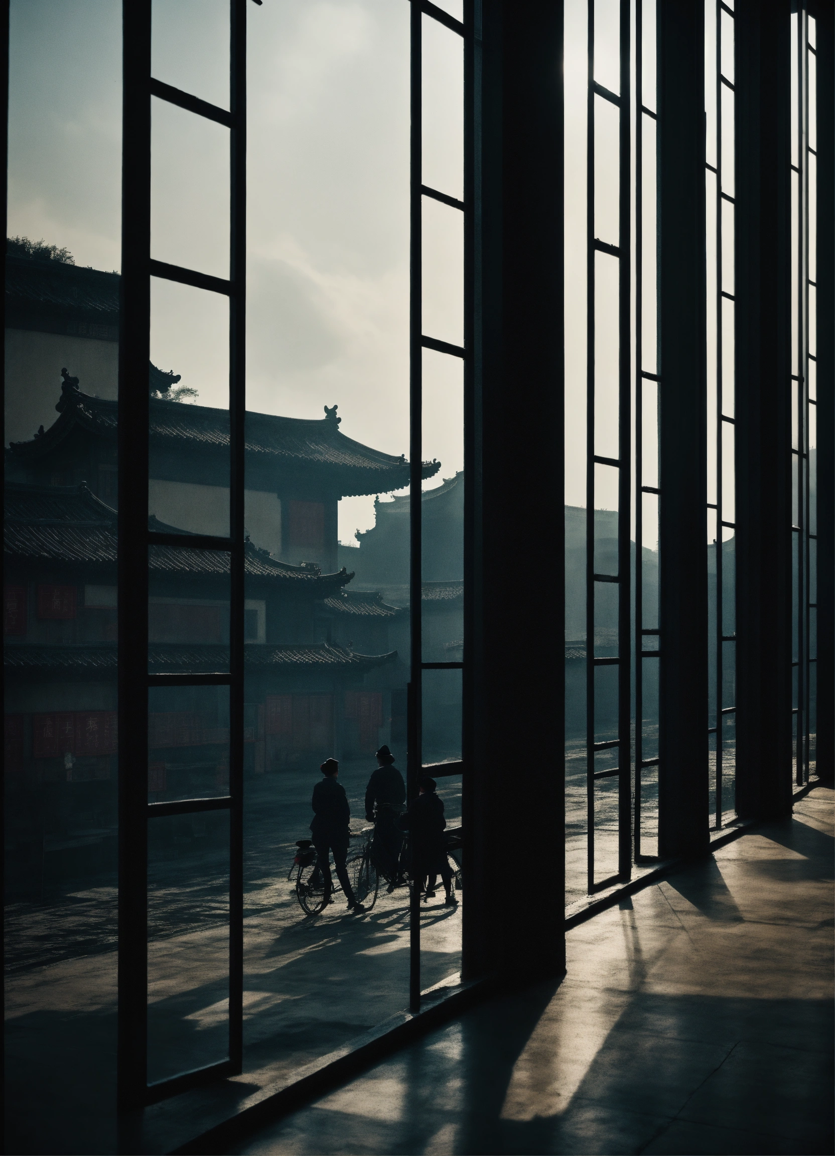 Some people look over tall building windows, in the style of dark palette chiaroscuro, rural china, coded patterns, sparse and simple, uhd image, urbancore, sovietwave, negative space, award-winning design