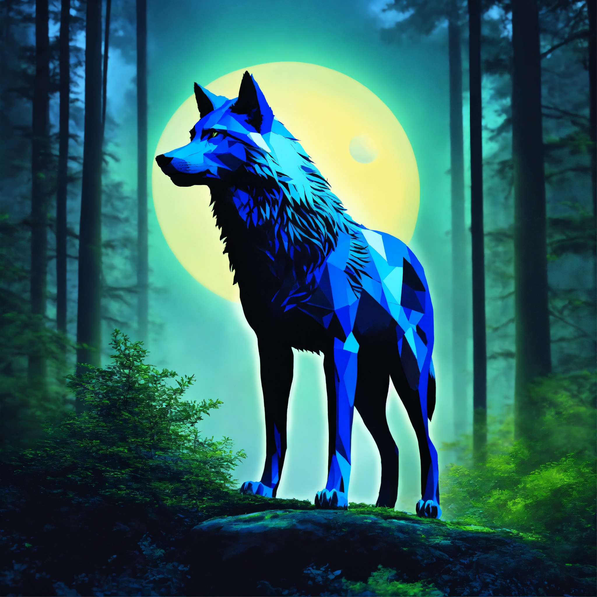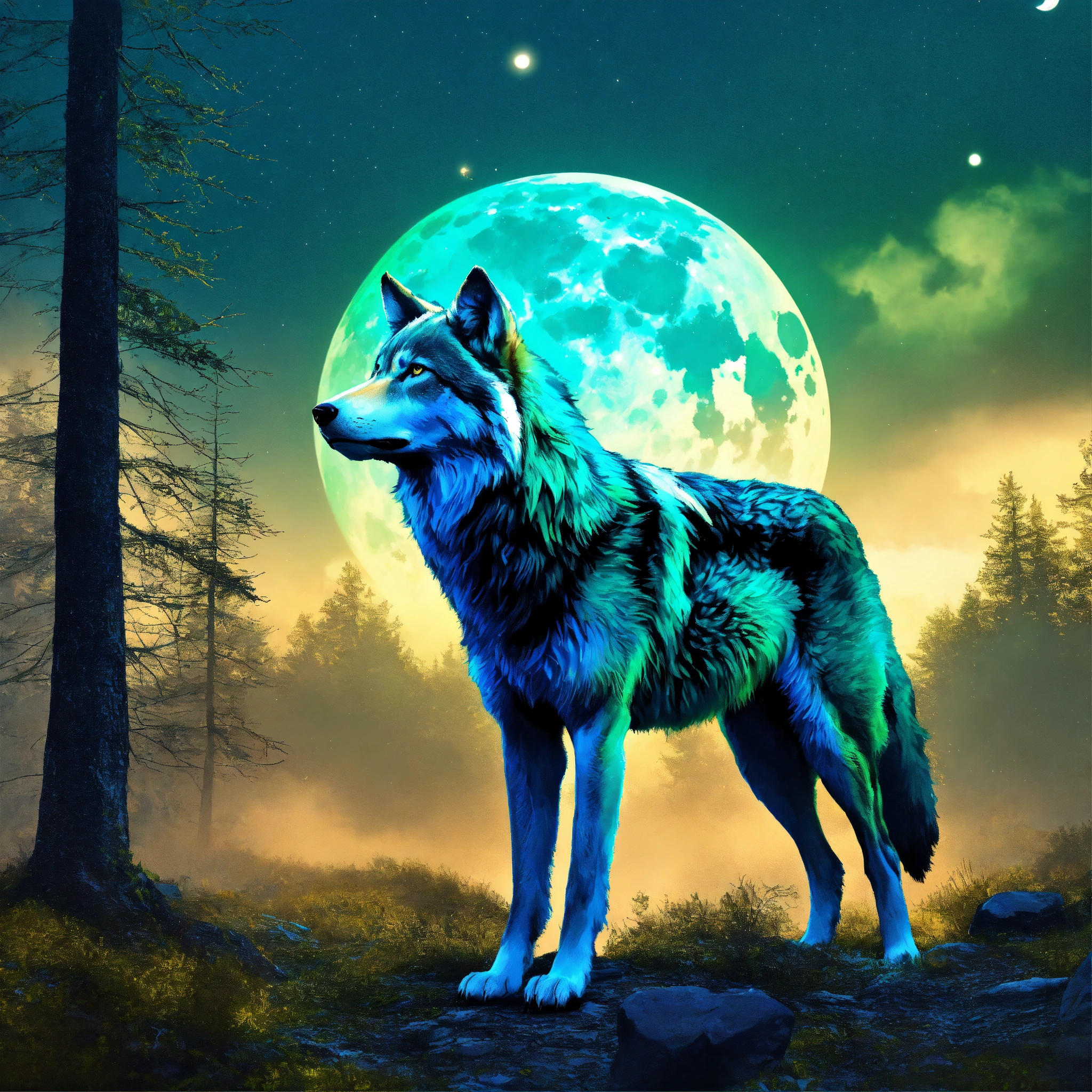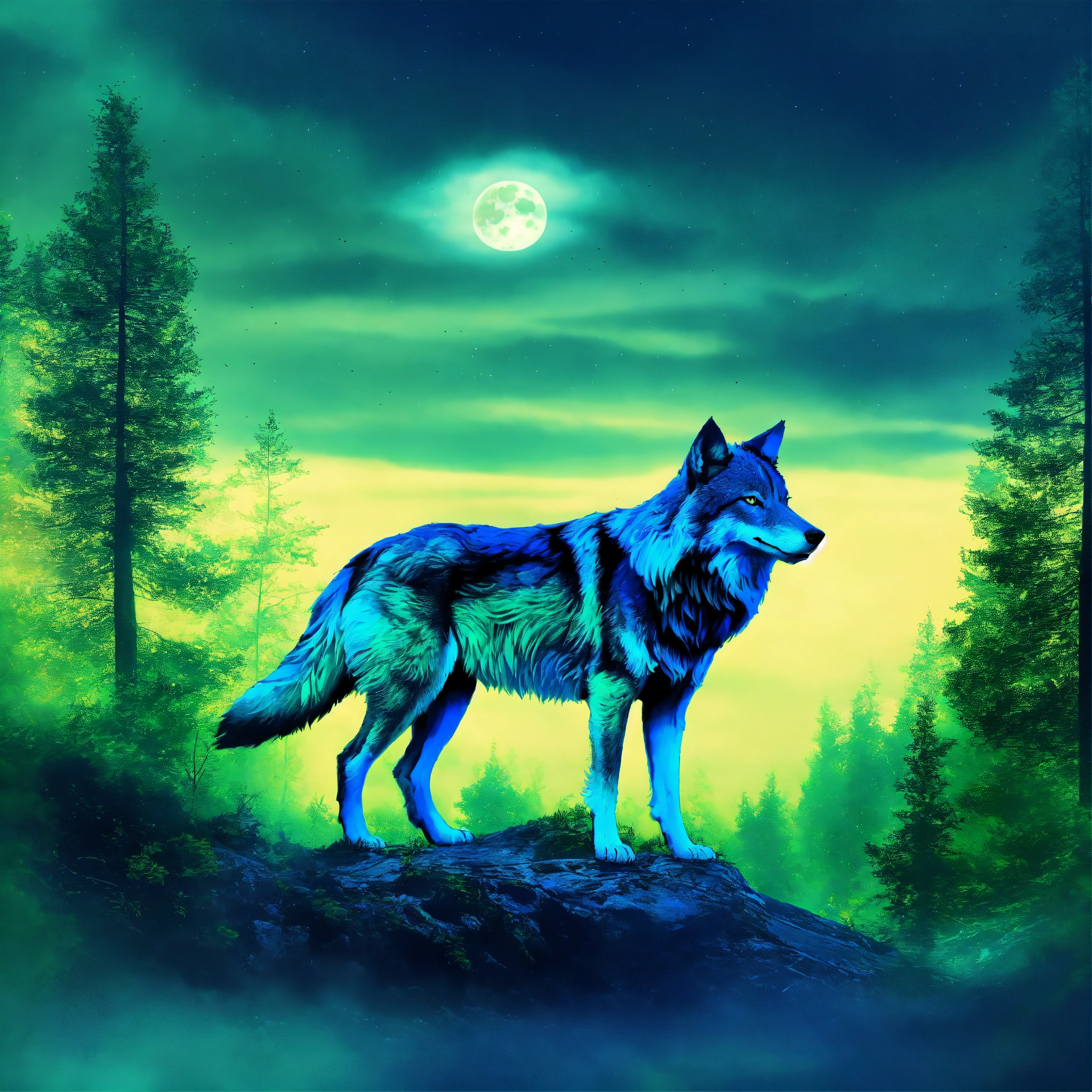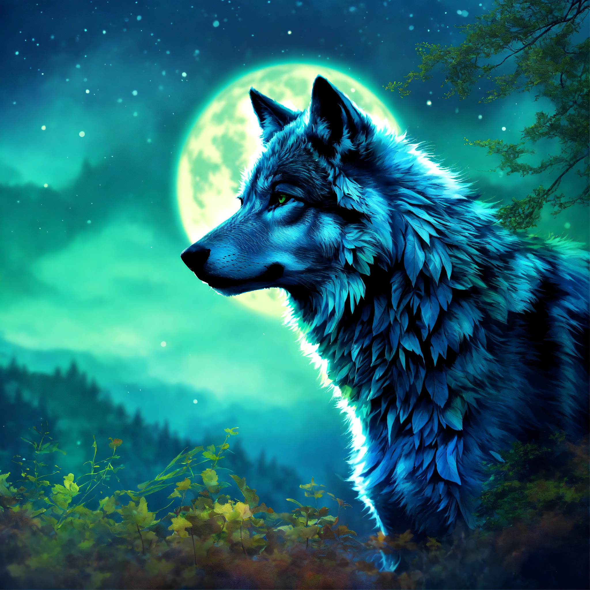 A surreal, dreamlike depiction of a wolf, created using a mix of digital art and collage. the wolf could be shown in a forest environment, but with elements of the natural world blurred or distorted to create a sense of uncertainty and mystery. the wolf's body could be made up of layered, organic shapes in shades of blue and green, with a subtle gradient effect used to create depth and dimension. the background could be a light blue sky with clouds, with a full moon visible t, 8k, extremely detailed, realistic photo, 4k realistic photo, hyper detailed