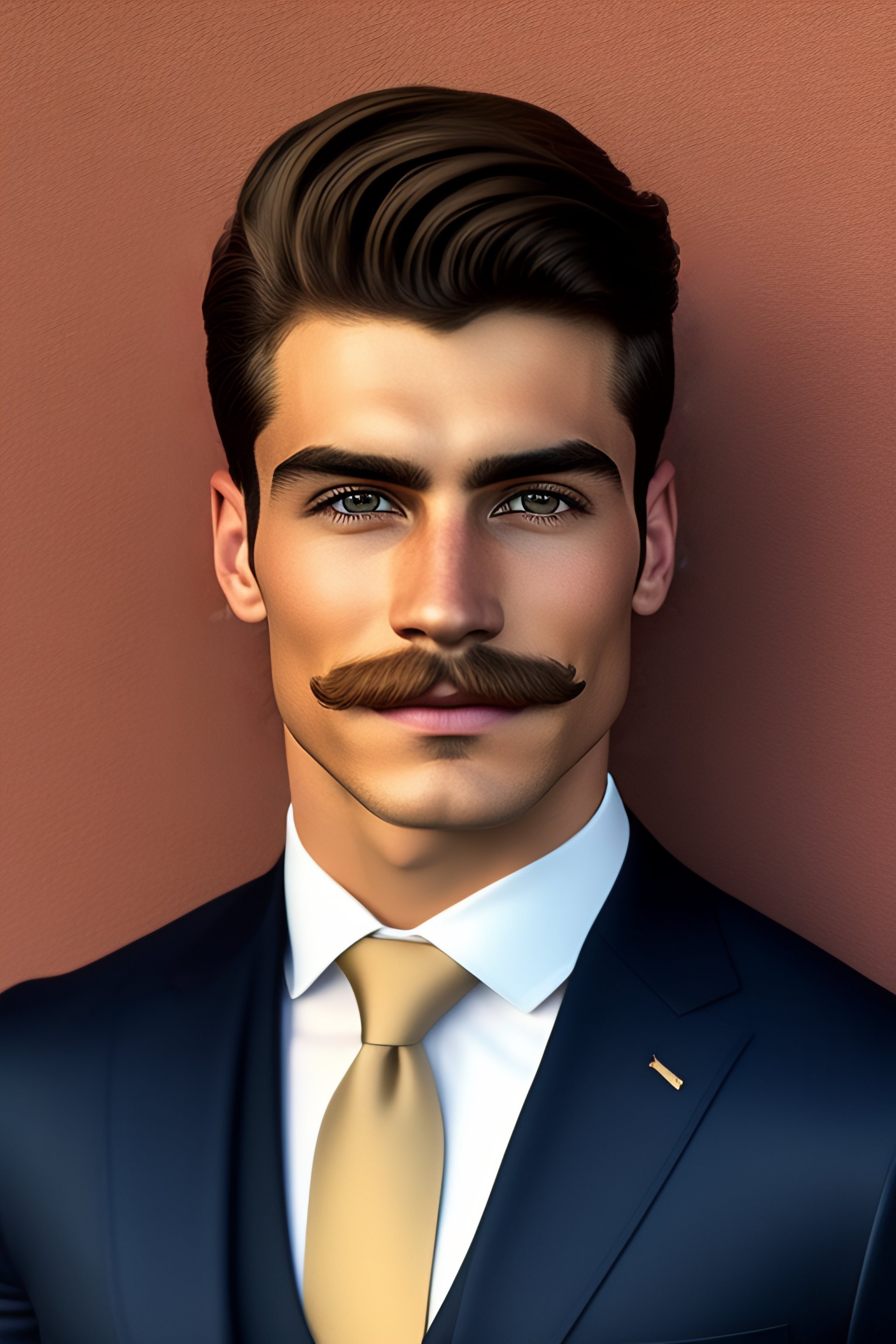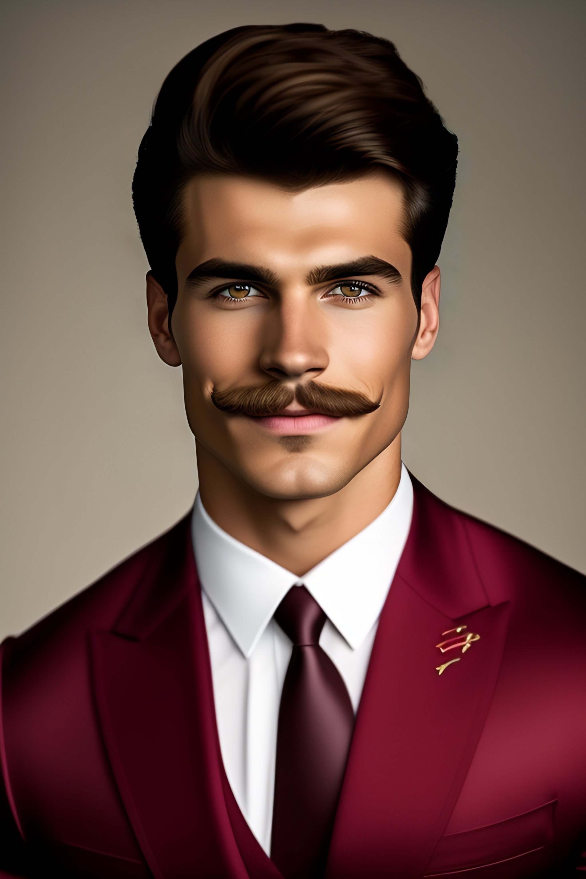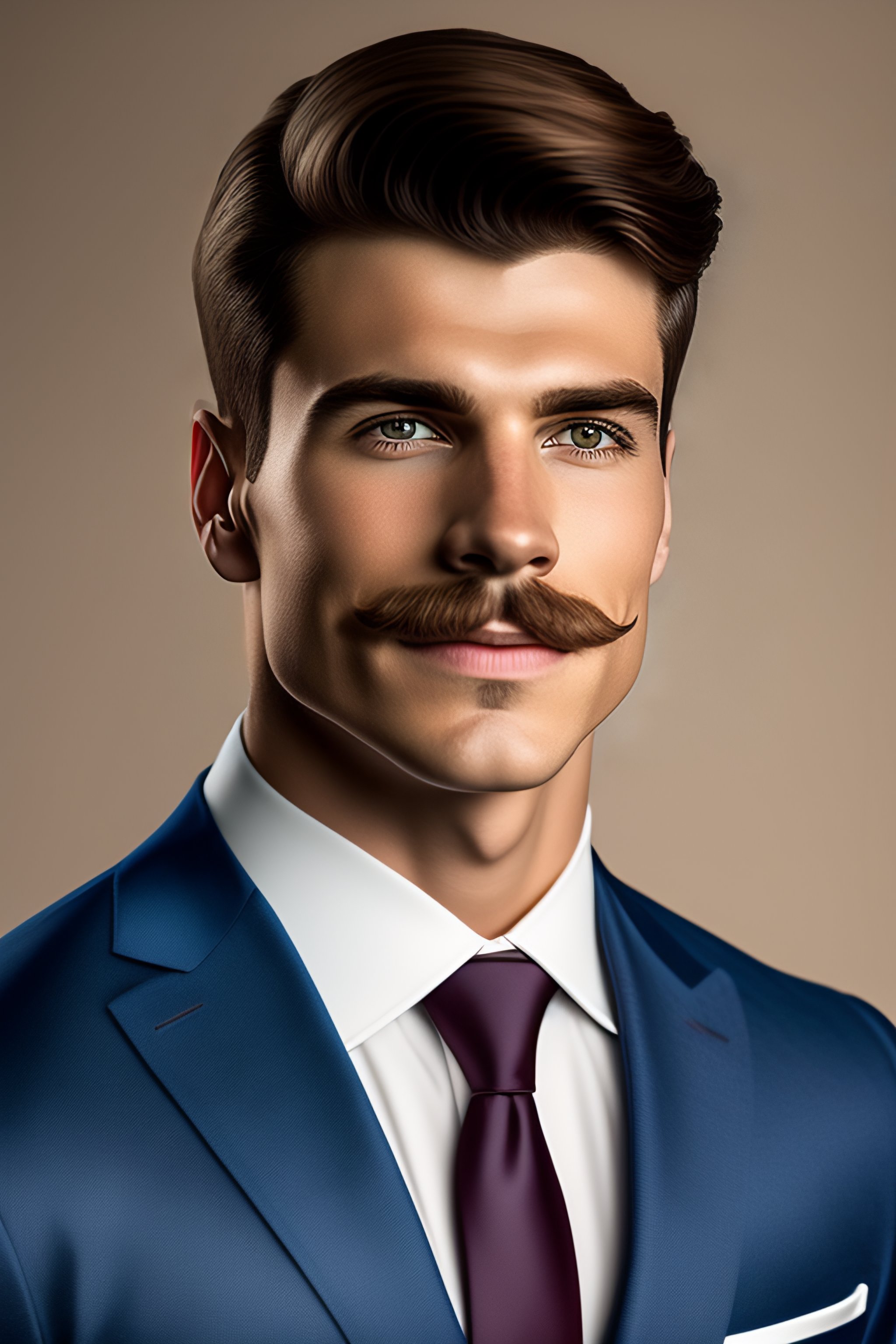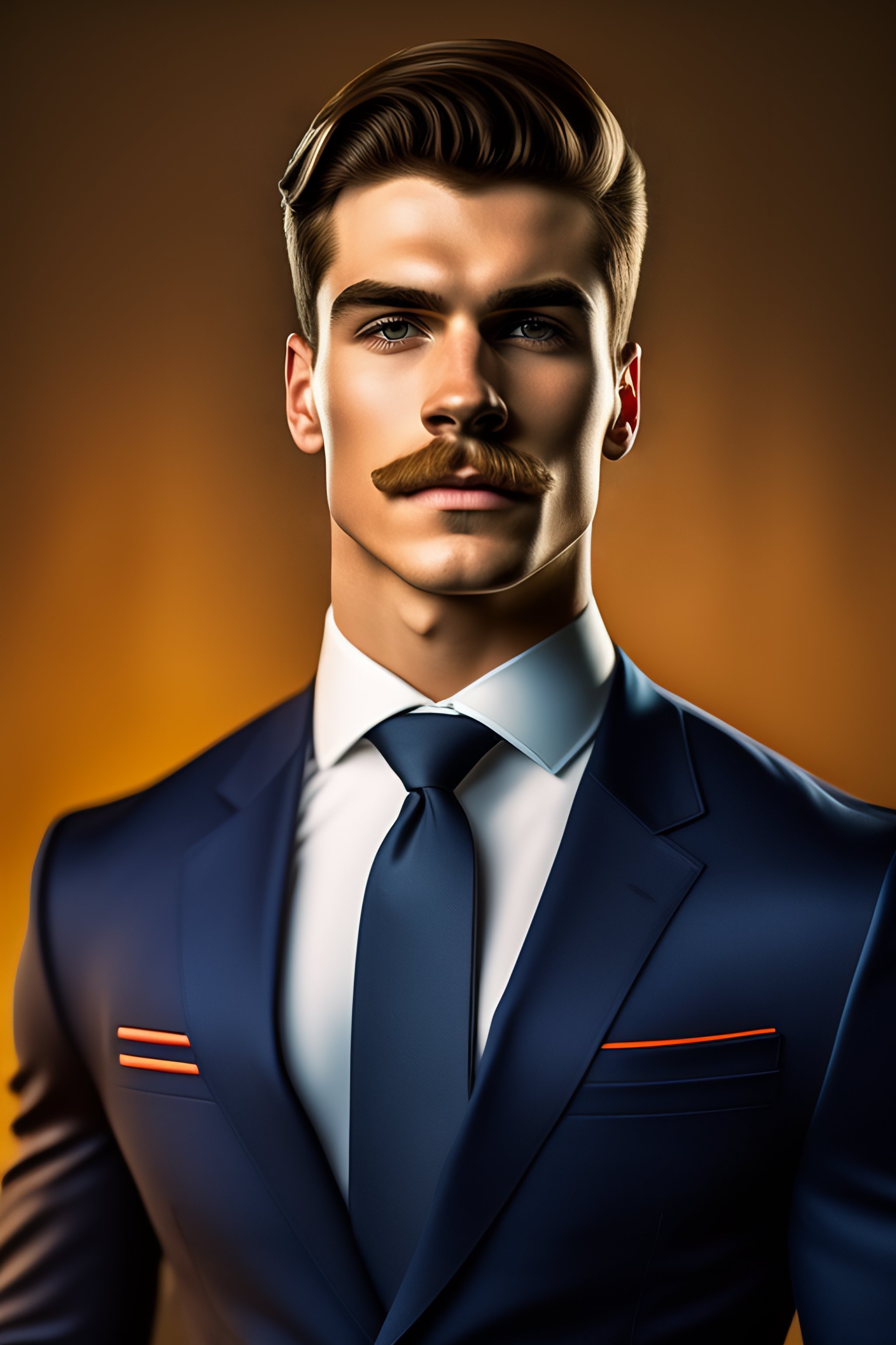 Portrait of handsome 18 year old superhero muscle man with short hair and a thick ned flanders mustache and a protruding dimpled chin in a tight italian suit
