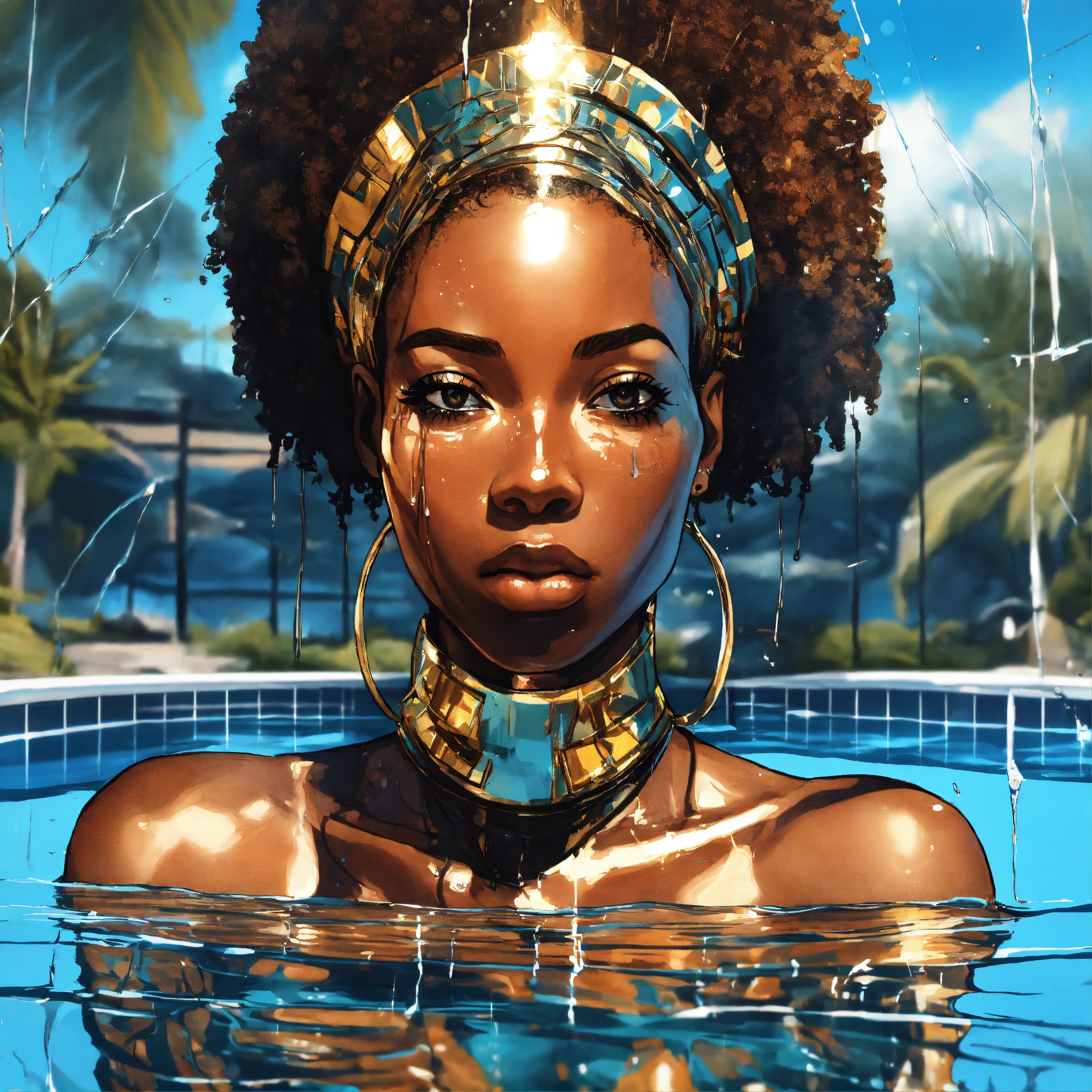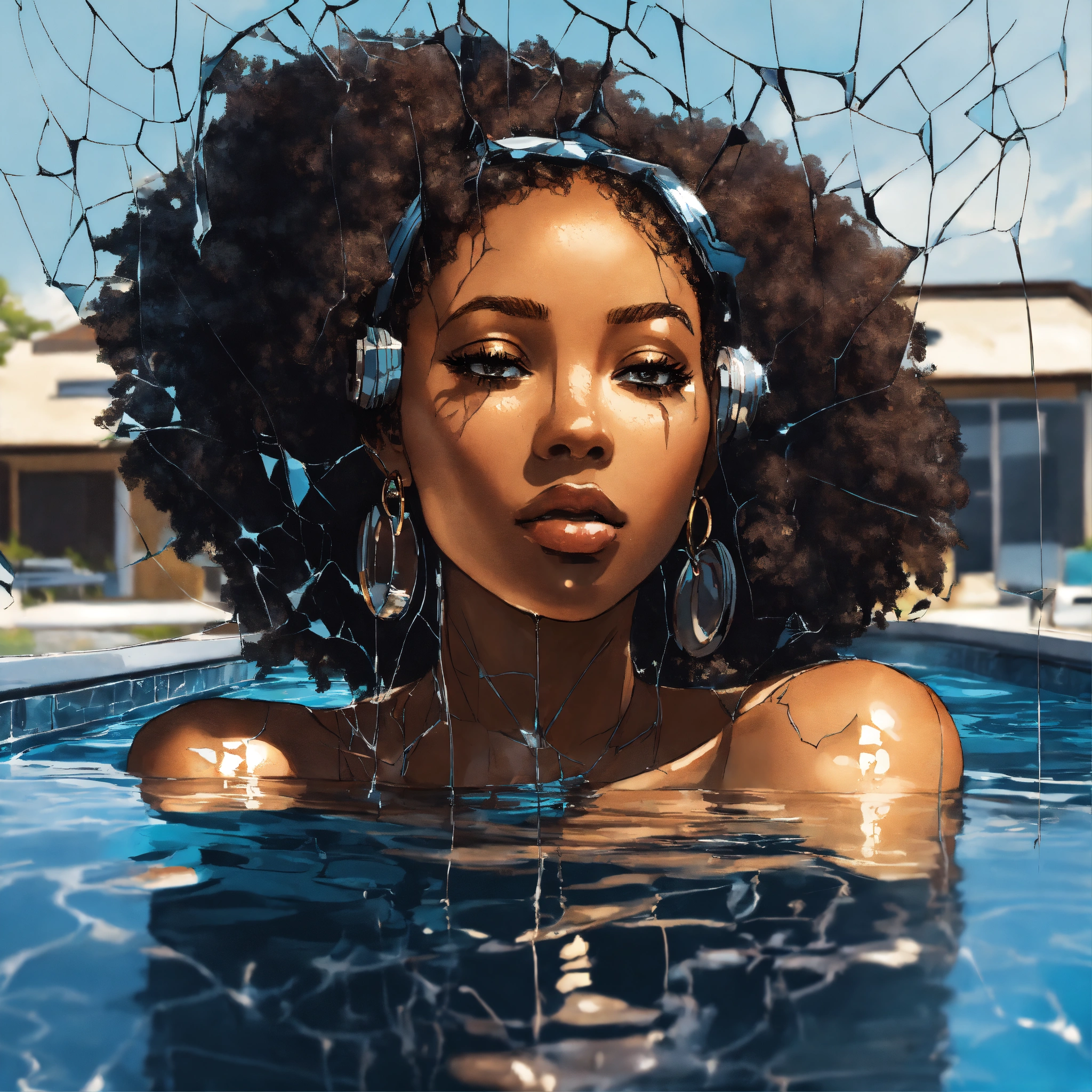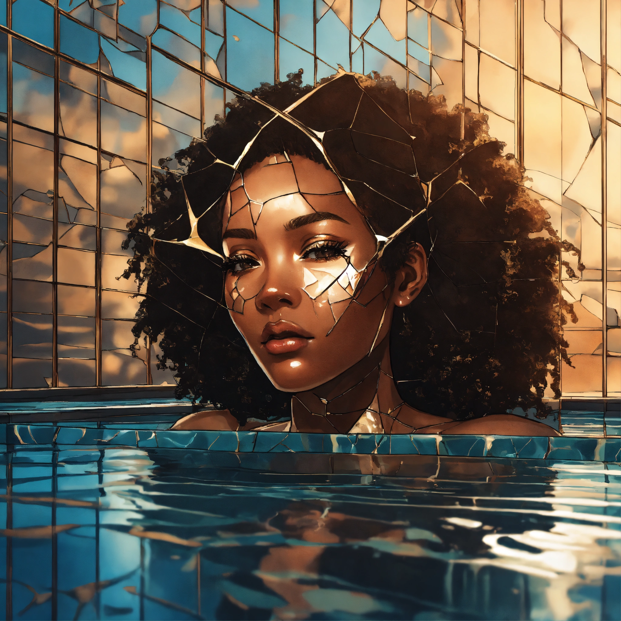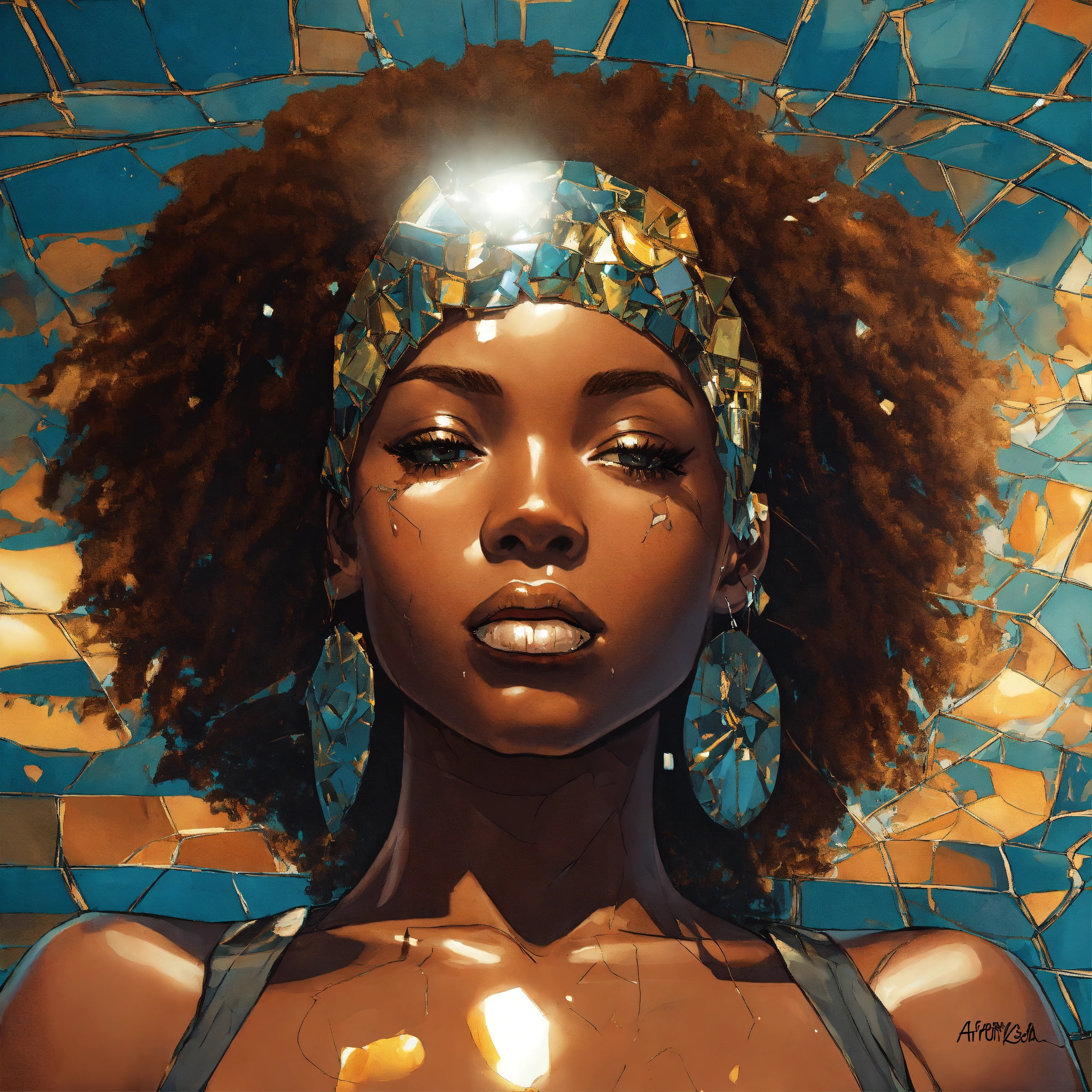 Shattered mind descending into pool liquid metal reflecting and afrocentric woman’s serene yet pleasant face, afrocentric woman, rule of thirds, manga