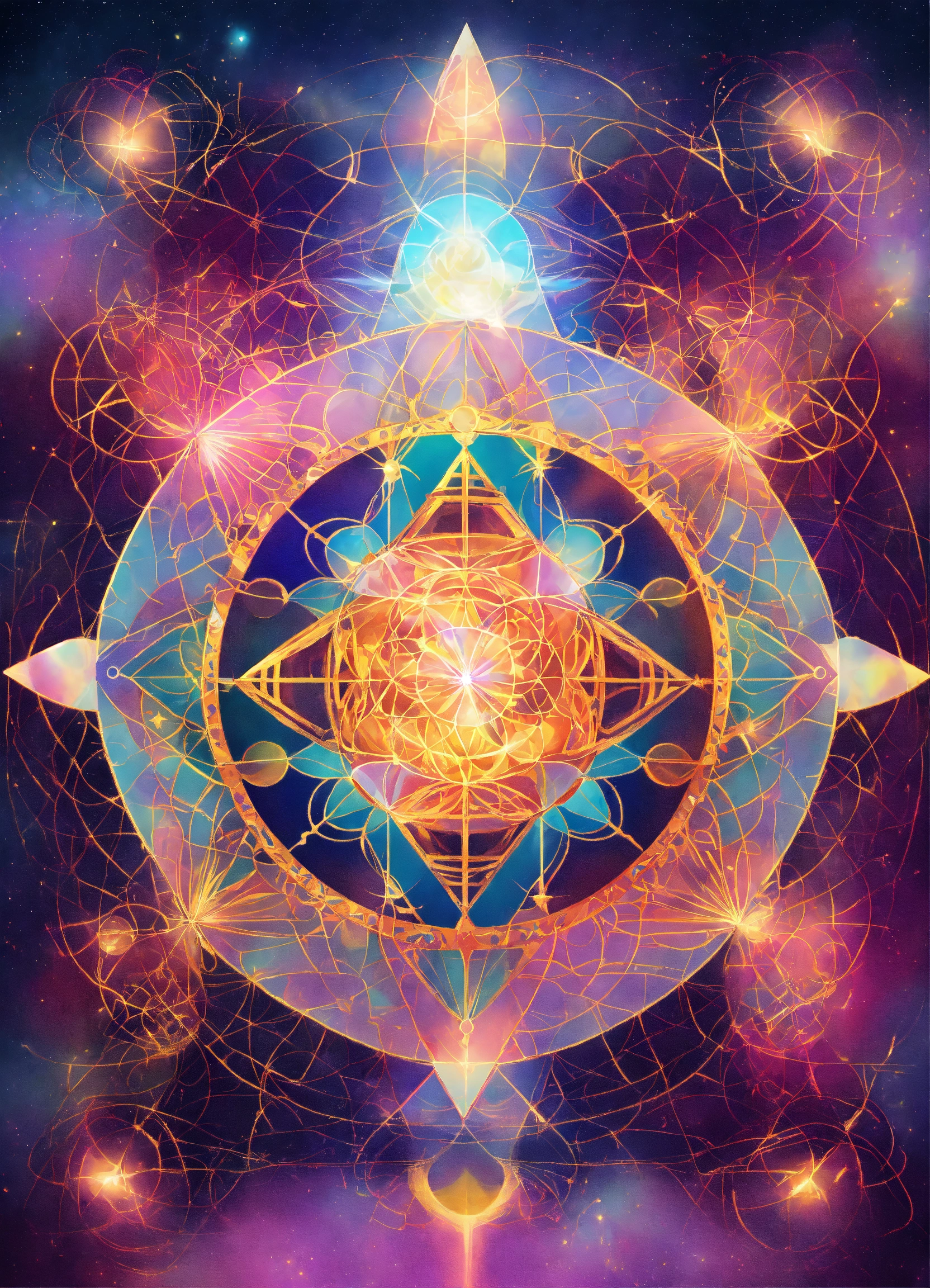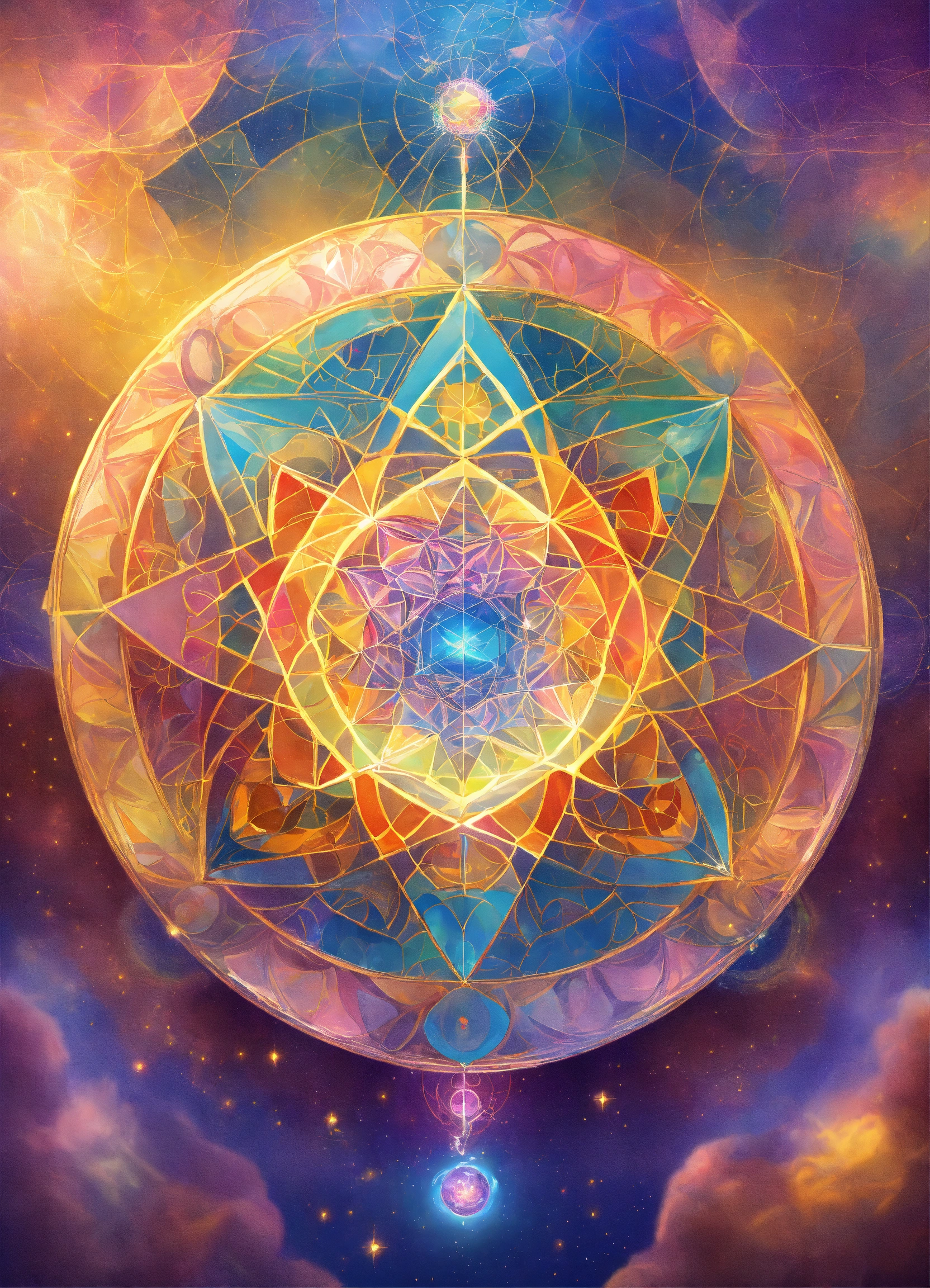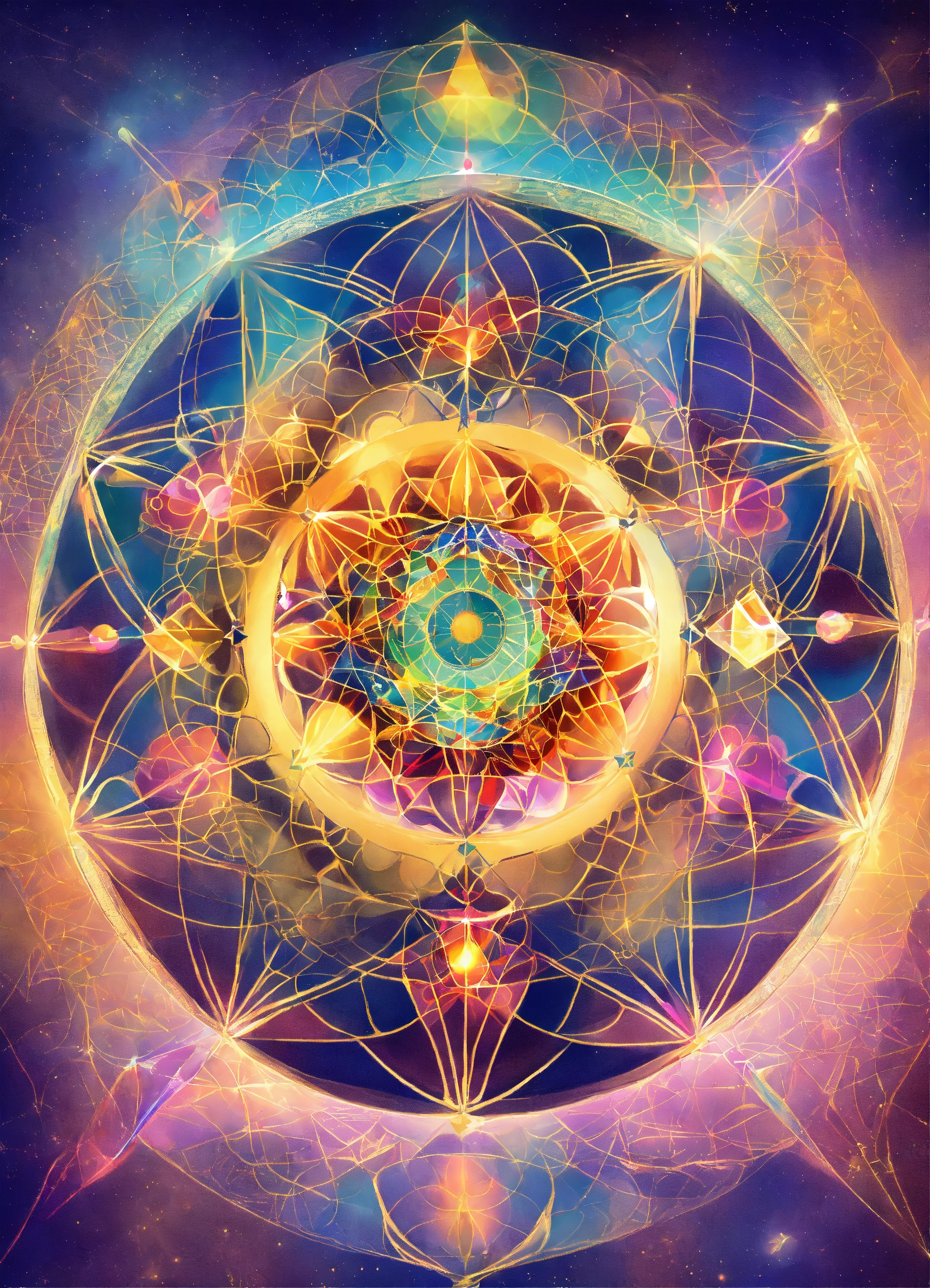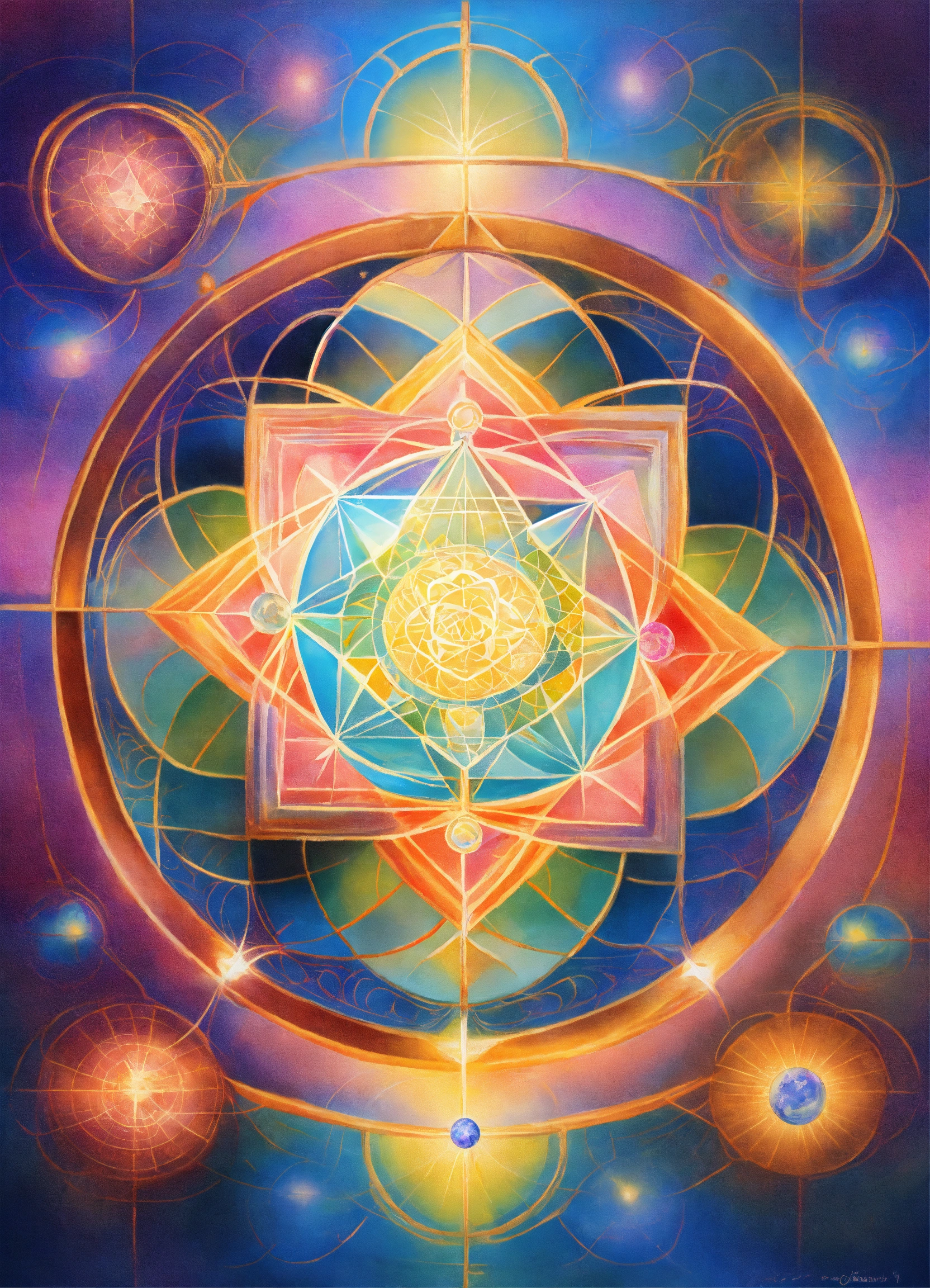 Activation santé symbole, connected to other universes, to the invisible worlds, pastel colors, shades multicolors, shinning light, sacred geometry