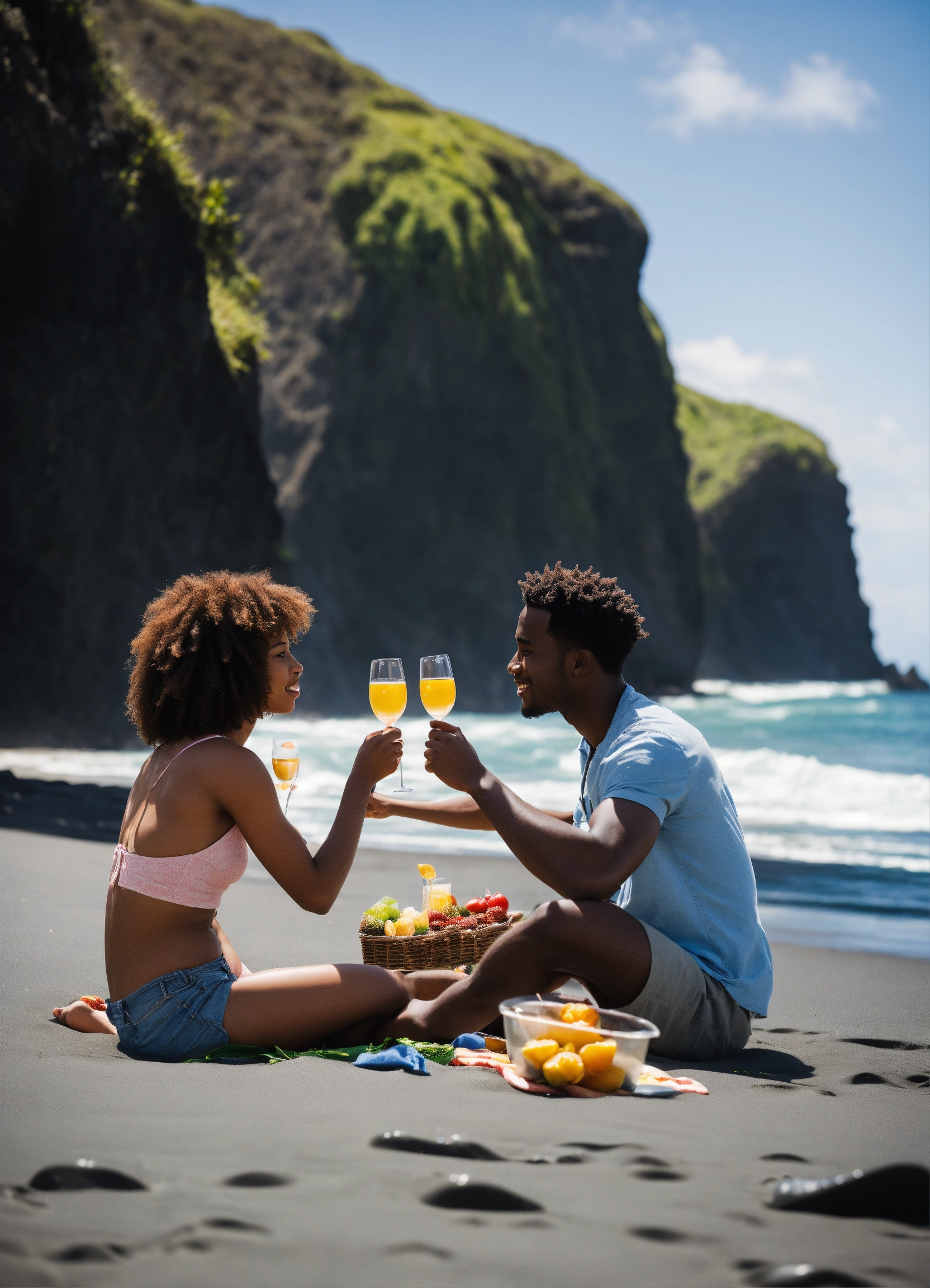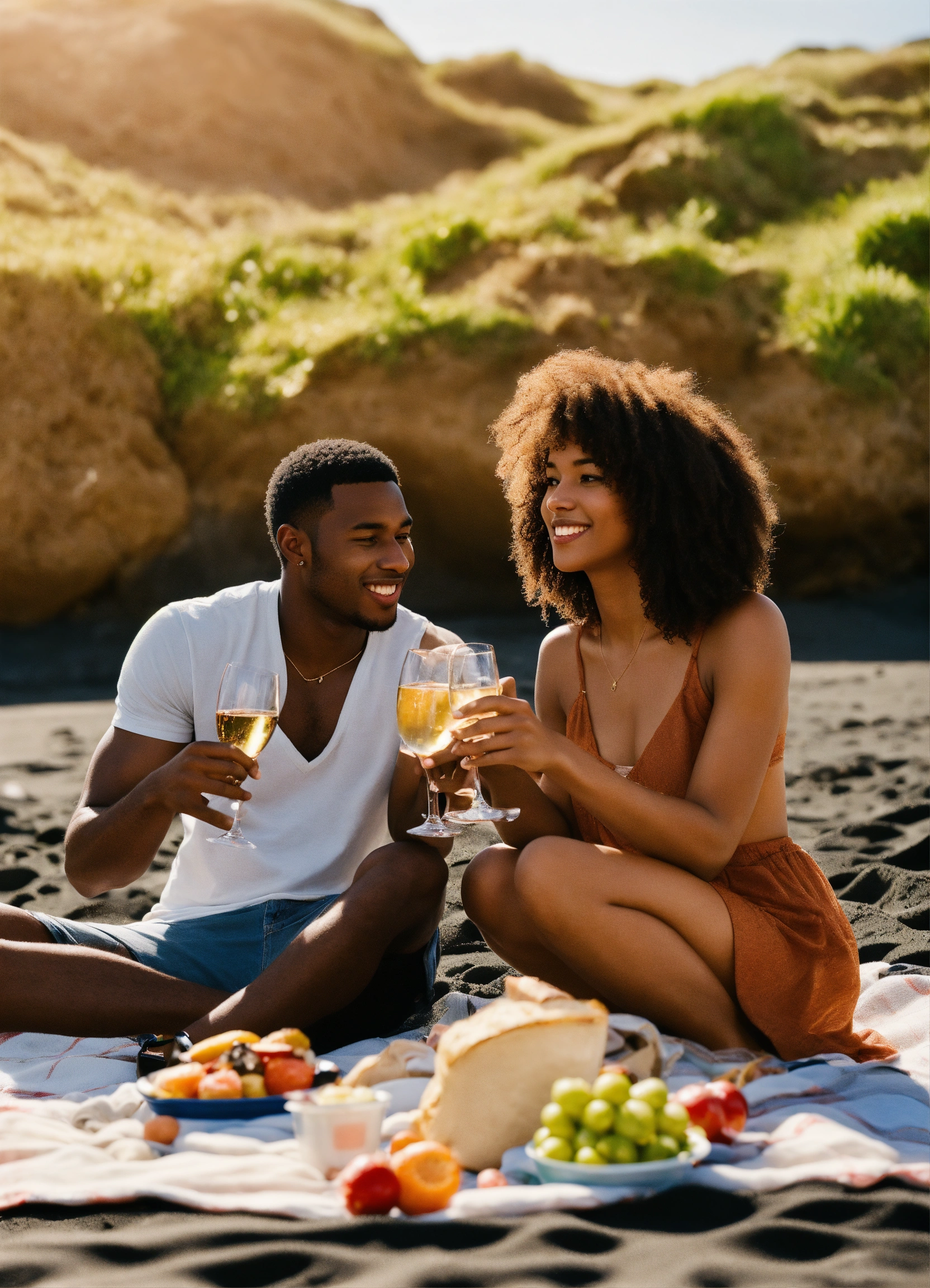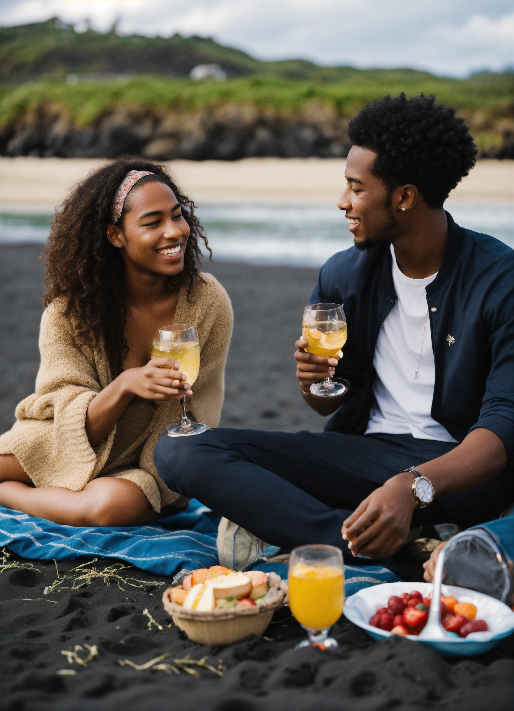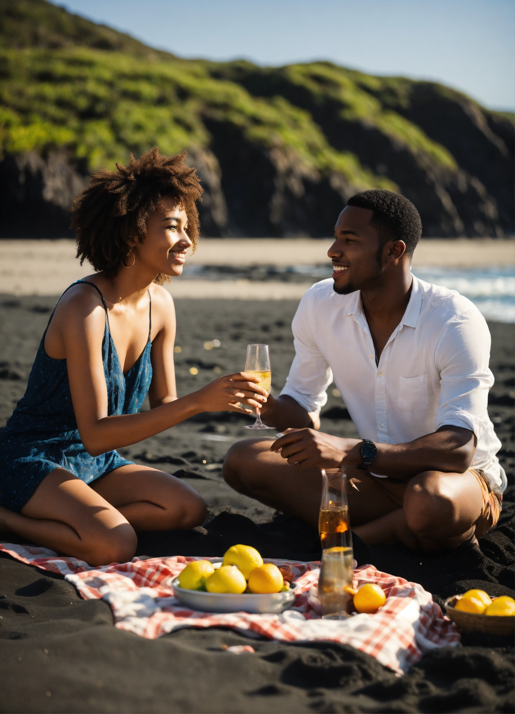Two people picnicking on a black sand beach, a young black man, a light-skinned mixed-race young woman., raising a toast.