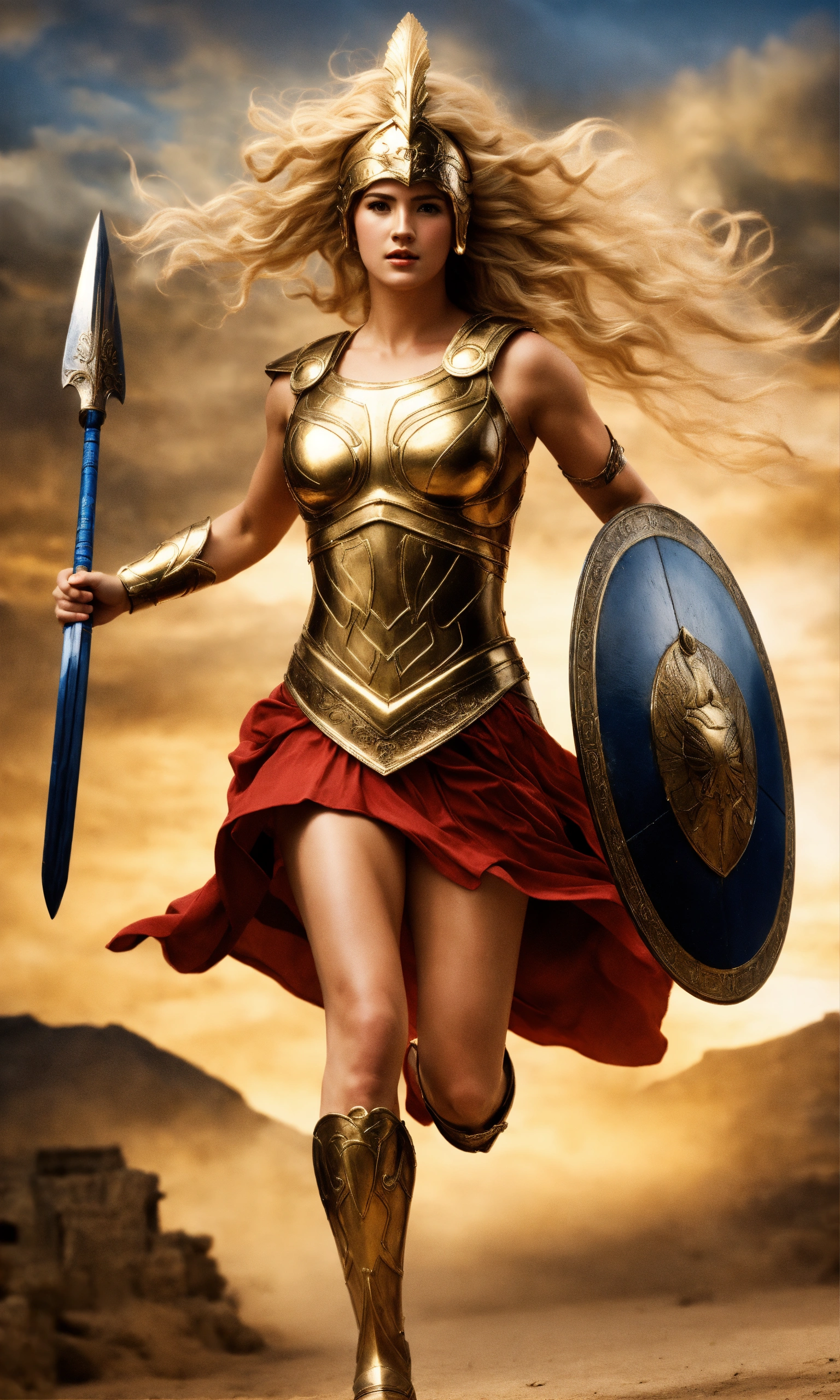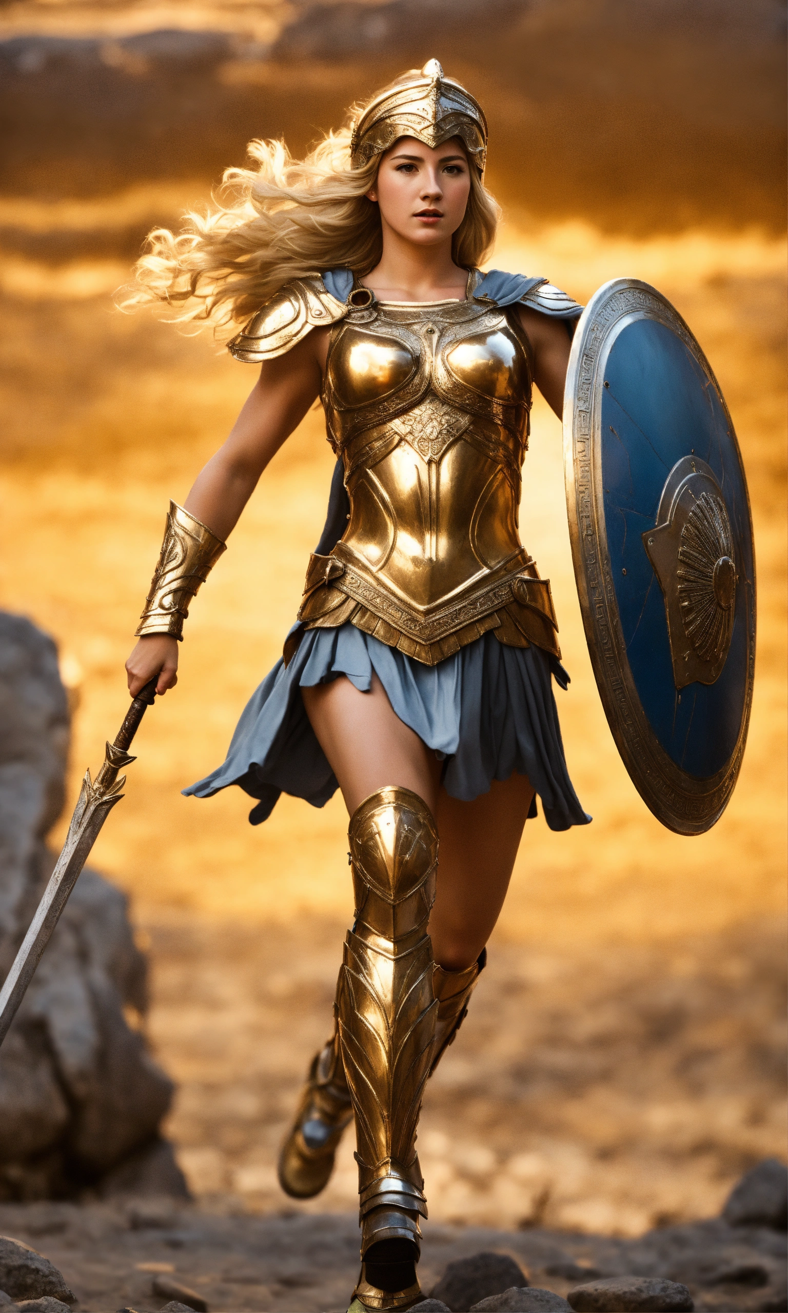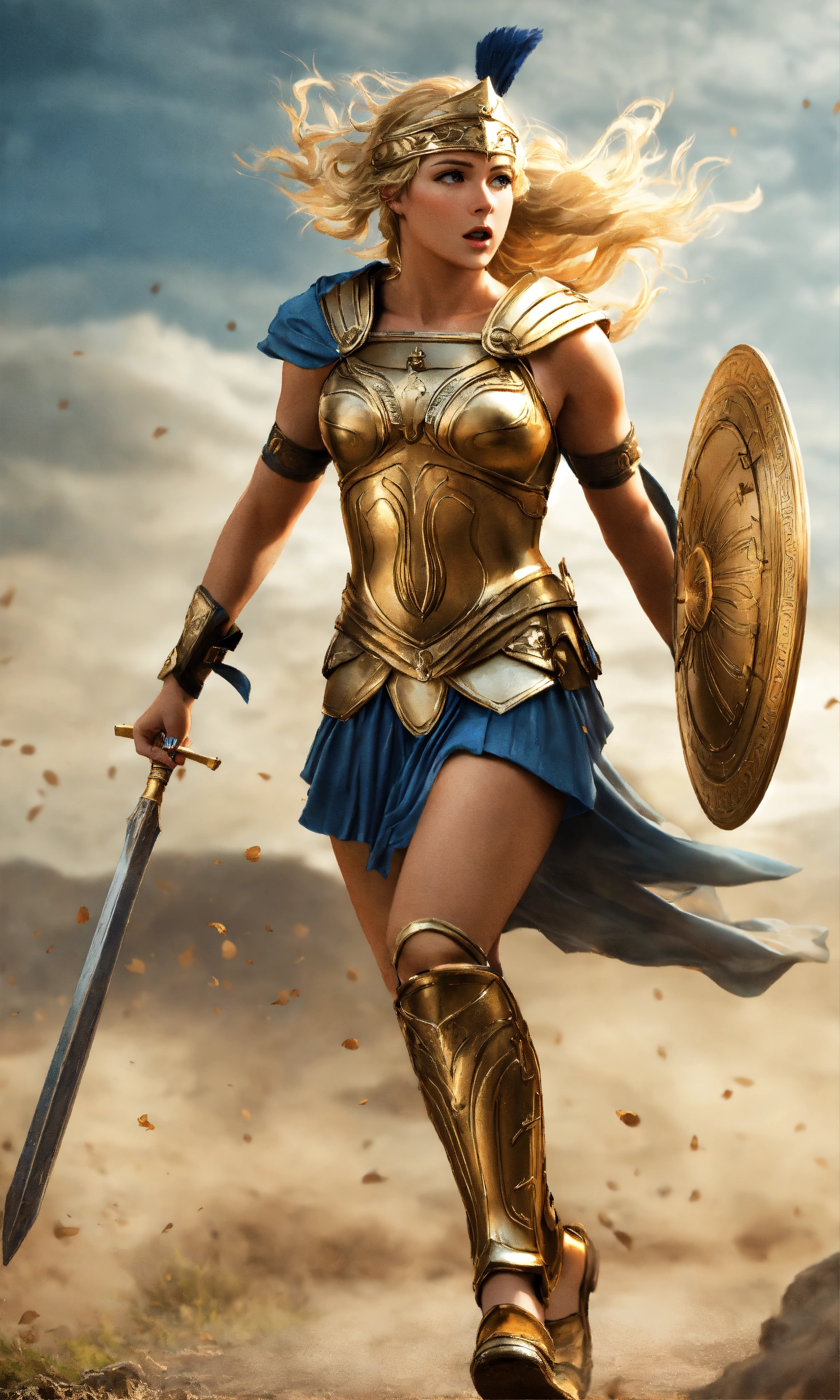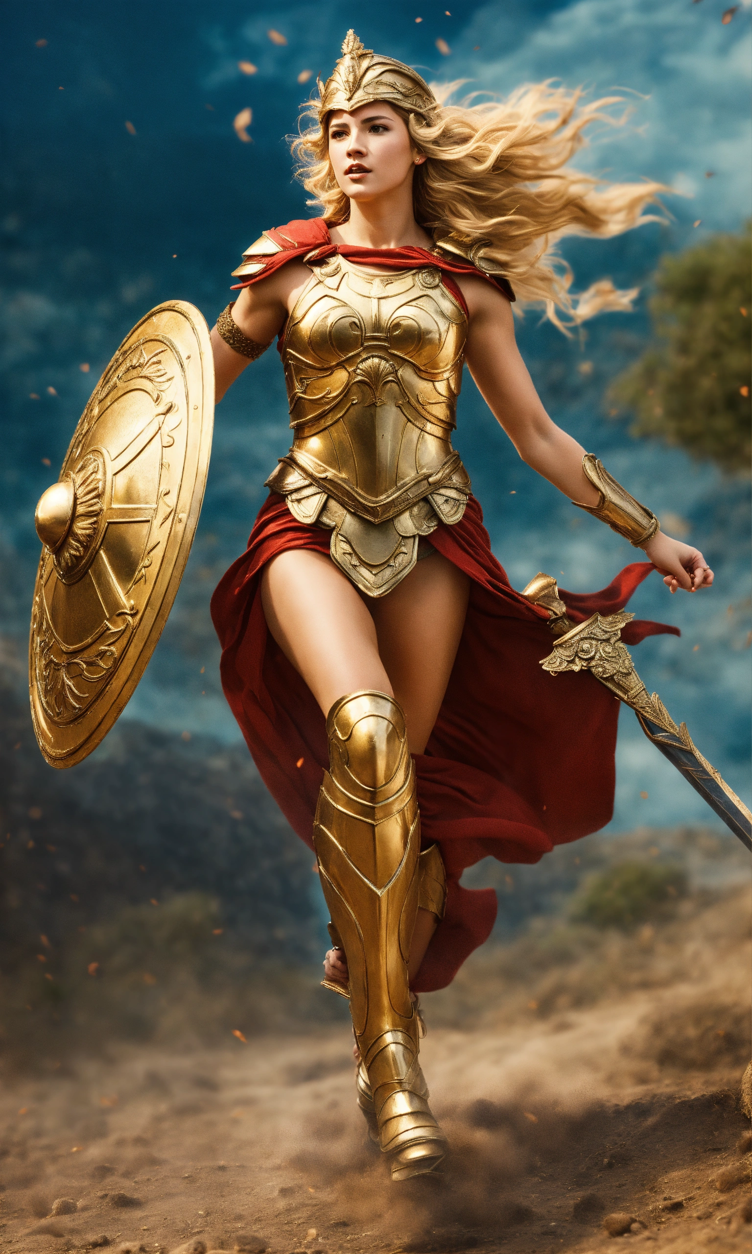 Full body of greek goddess athena with blonde hair, armor, running, taken with a 50mm lens, hyper-realistic