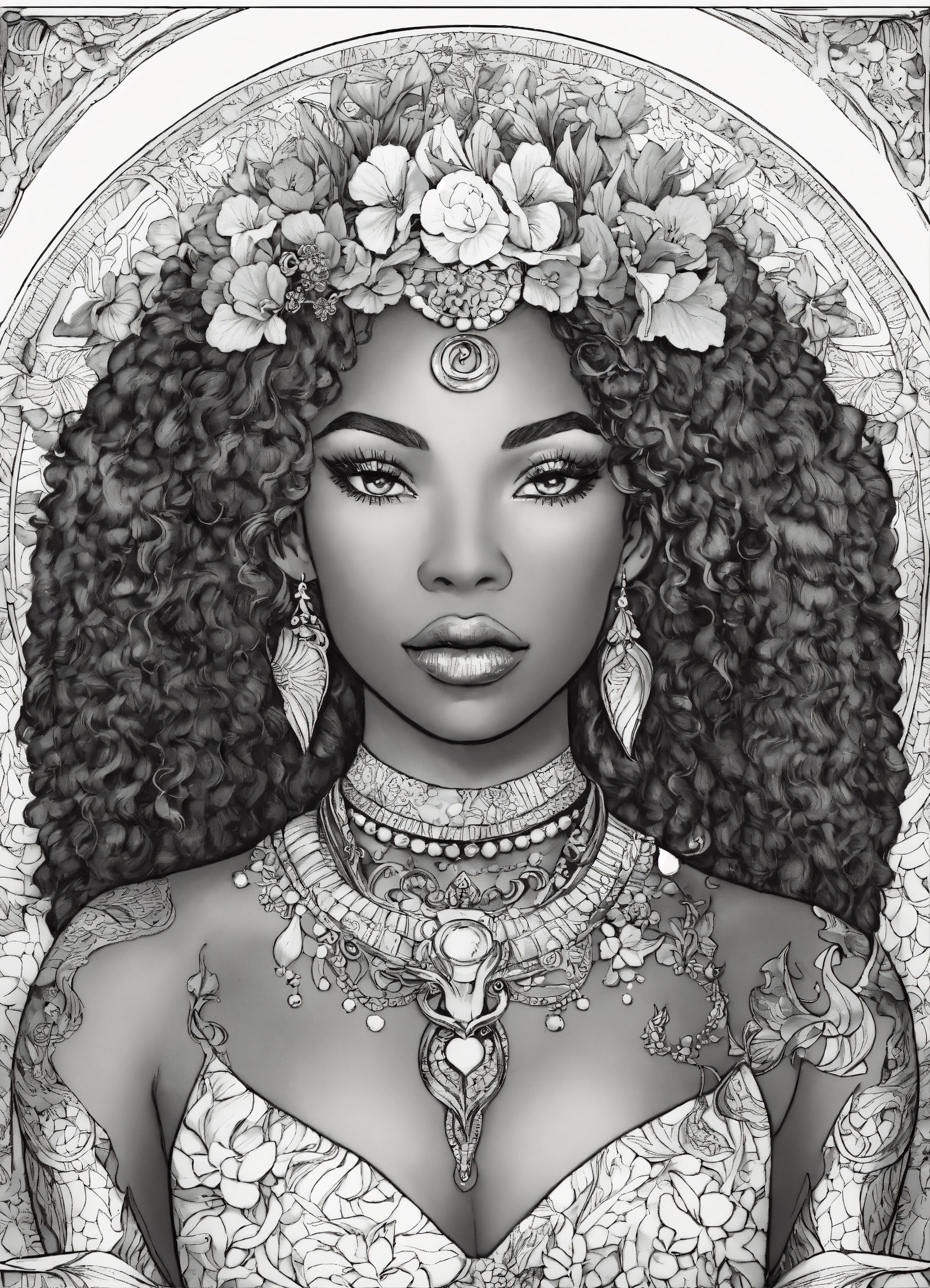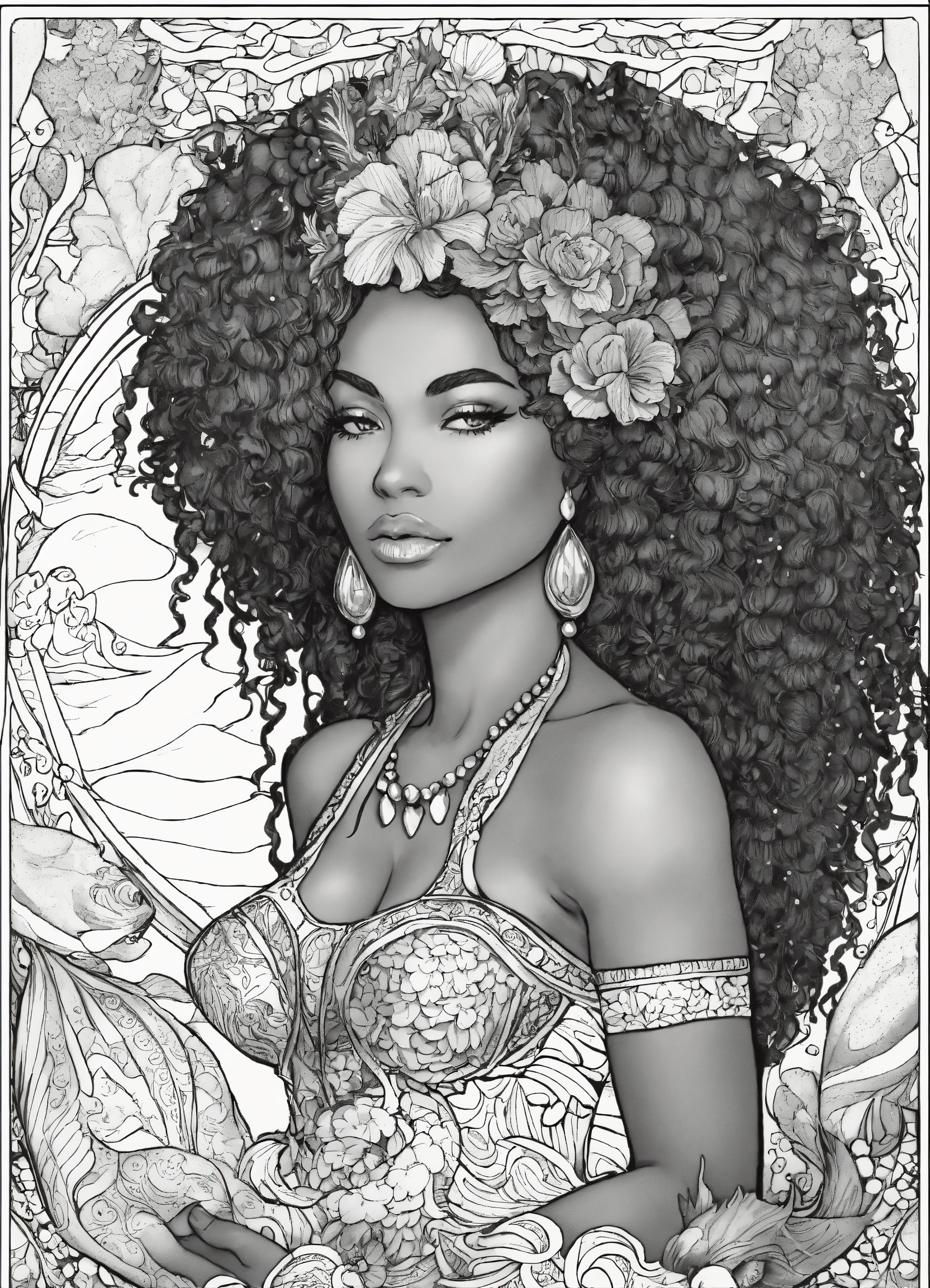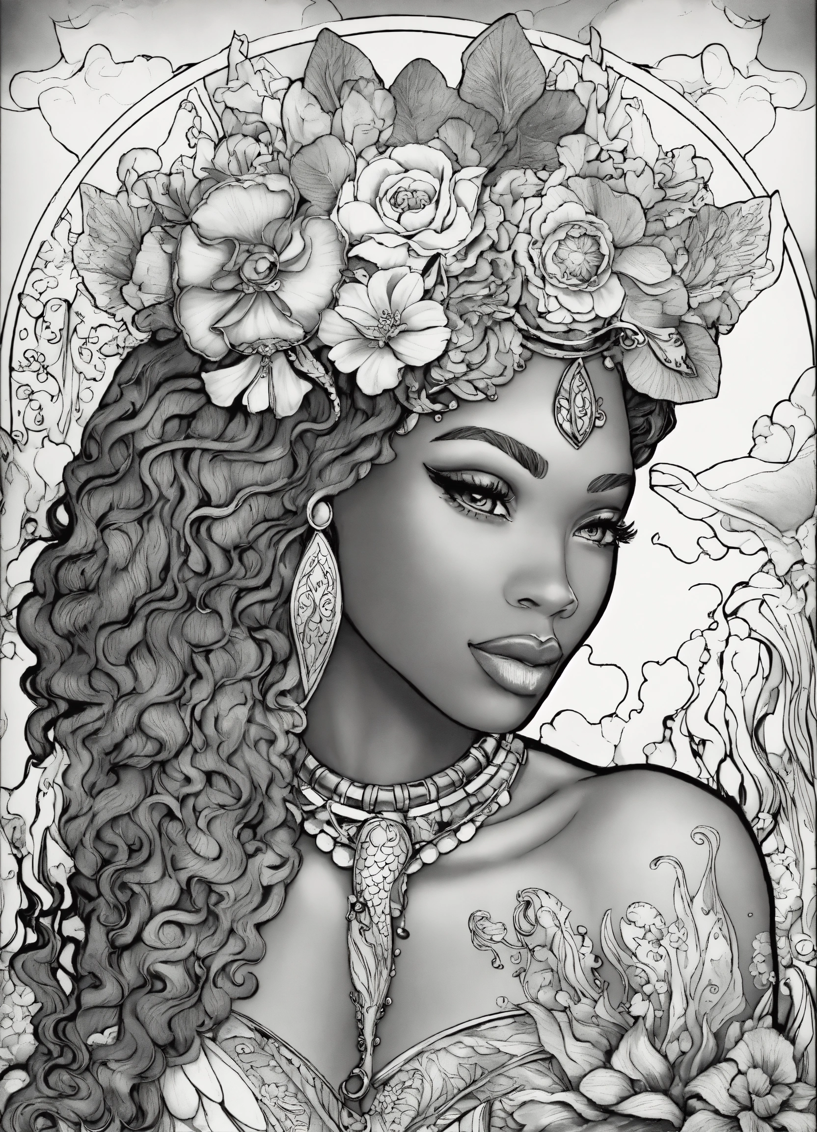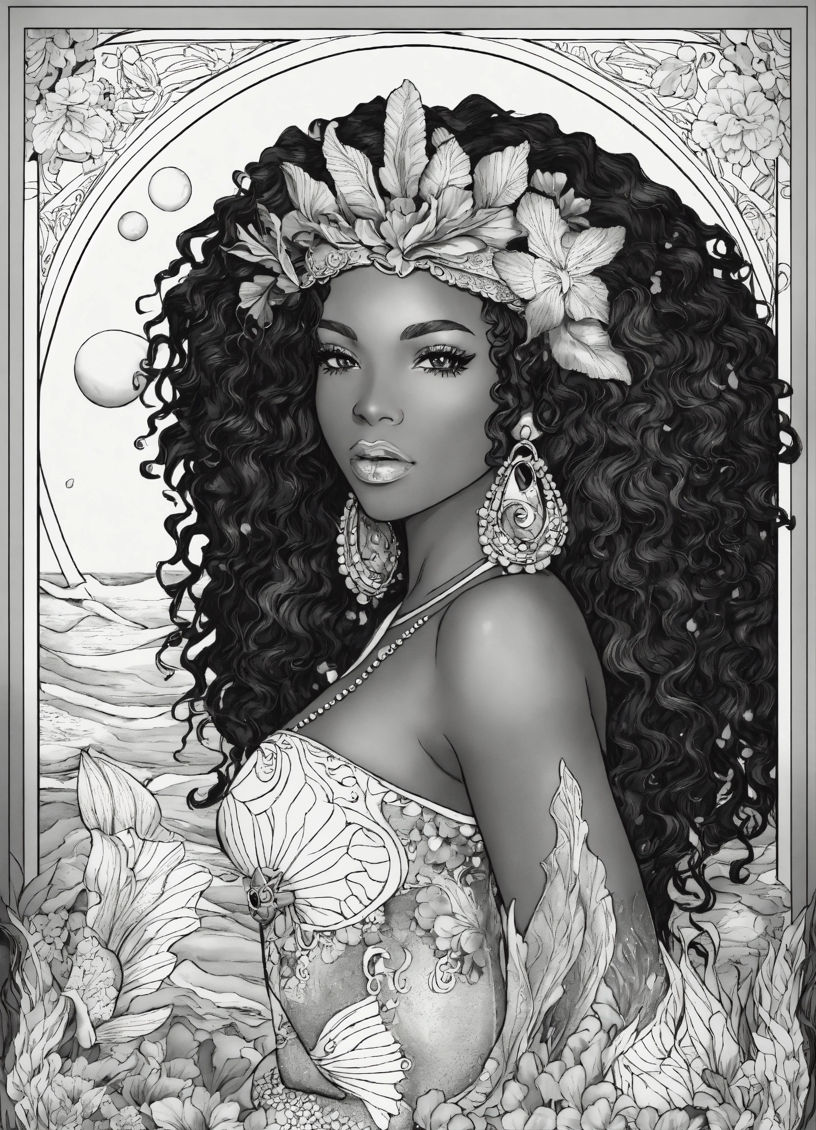 Black woman, melanin "goddess of the sea" is a coloring page featuring a detailed, mermaid-themed design with intricate patterns and decorations.