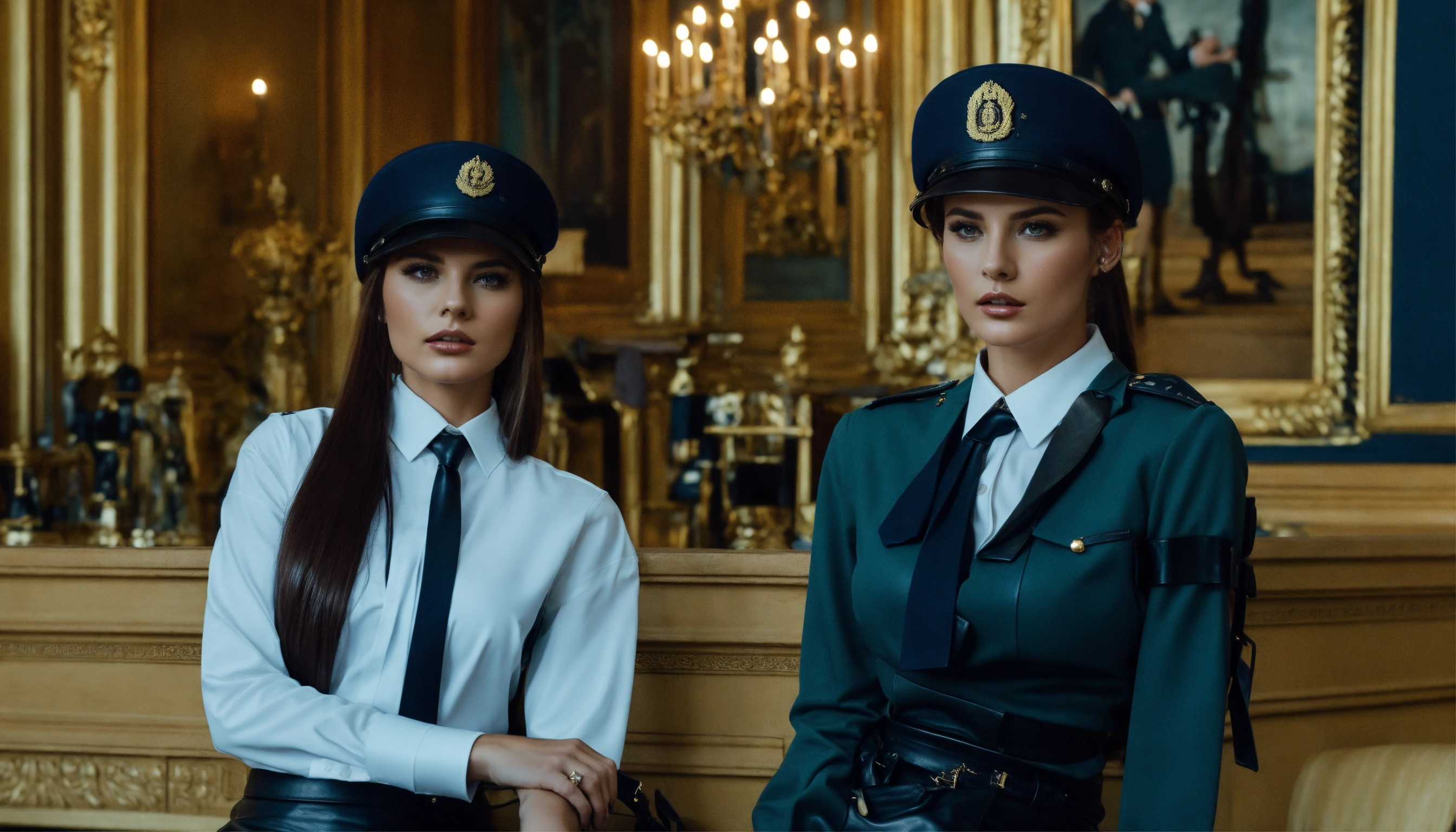 Two stunning european mistress women fashion models sitting, brunette straight high ponytail, strict business leather skirt, white shirt and leather long necktie, leather black big military cap, mansion room, shirt and tie