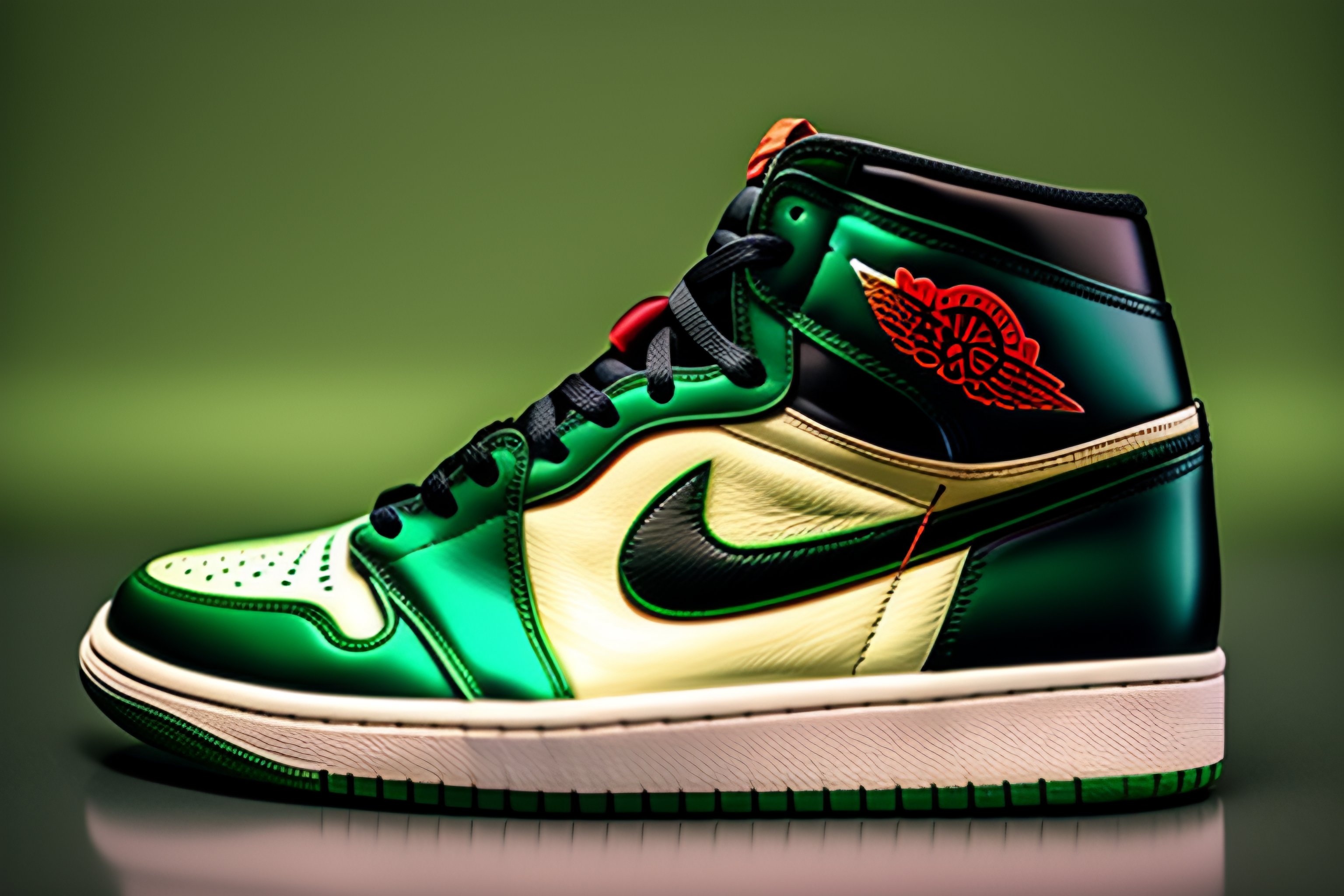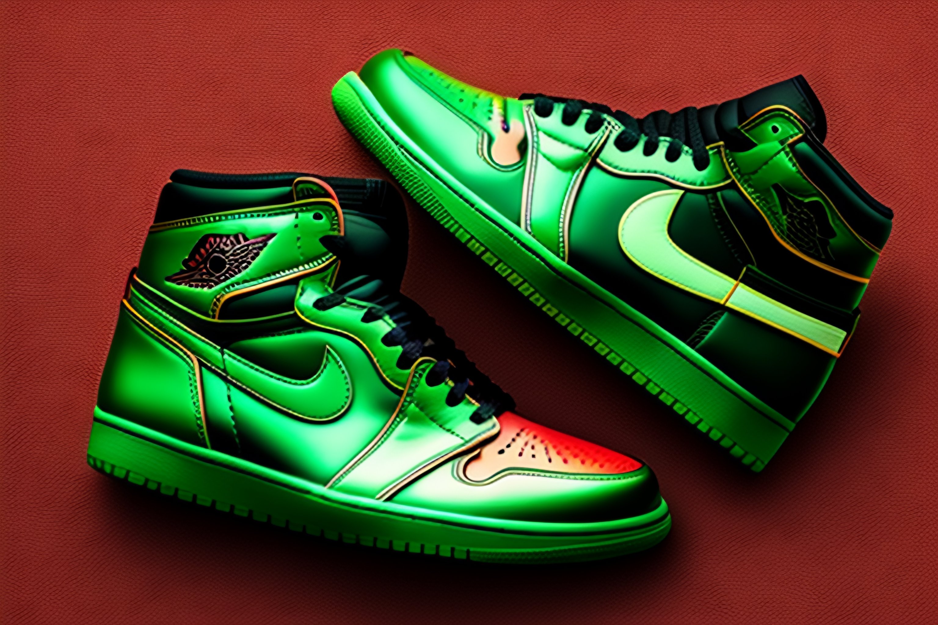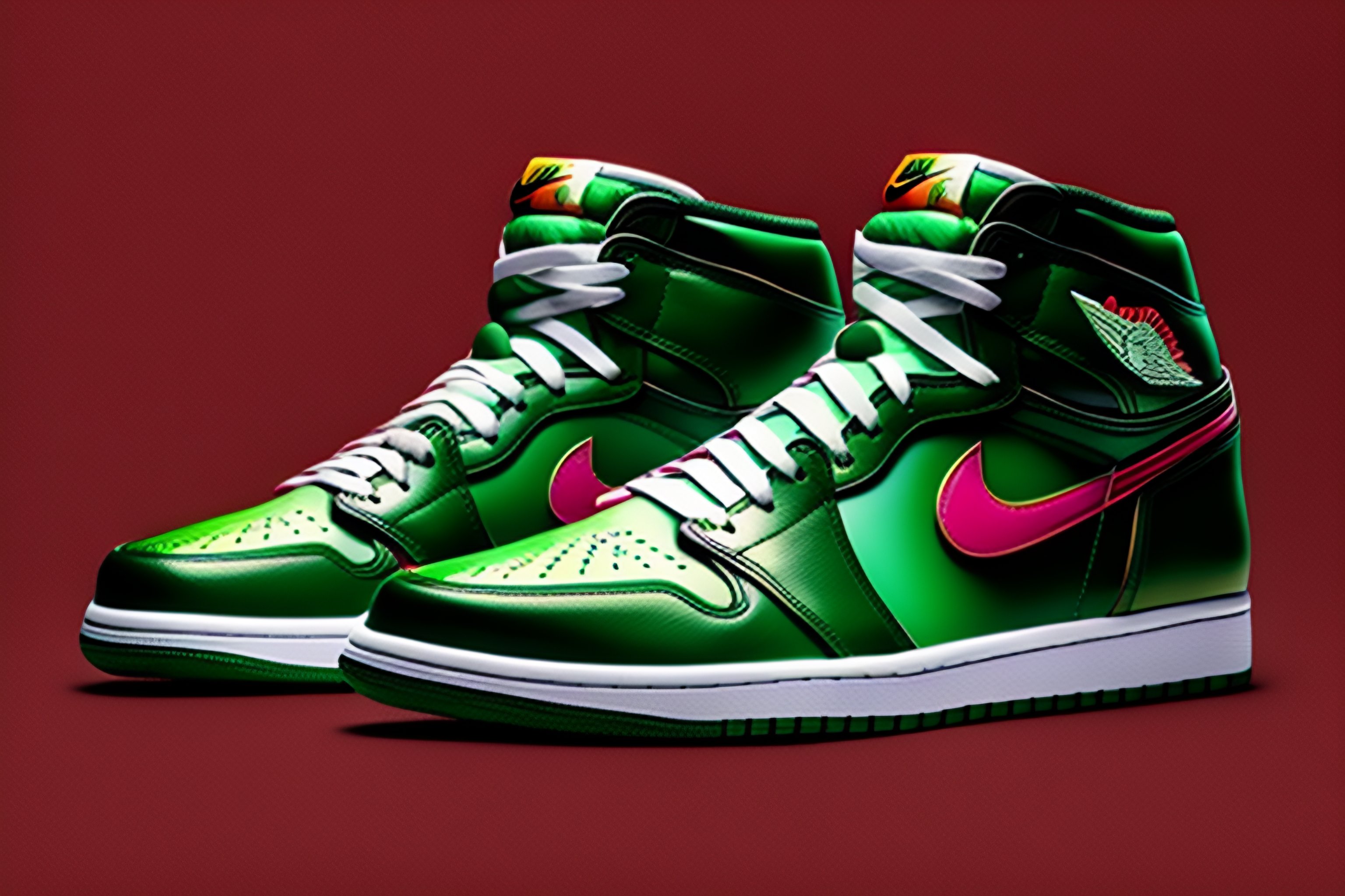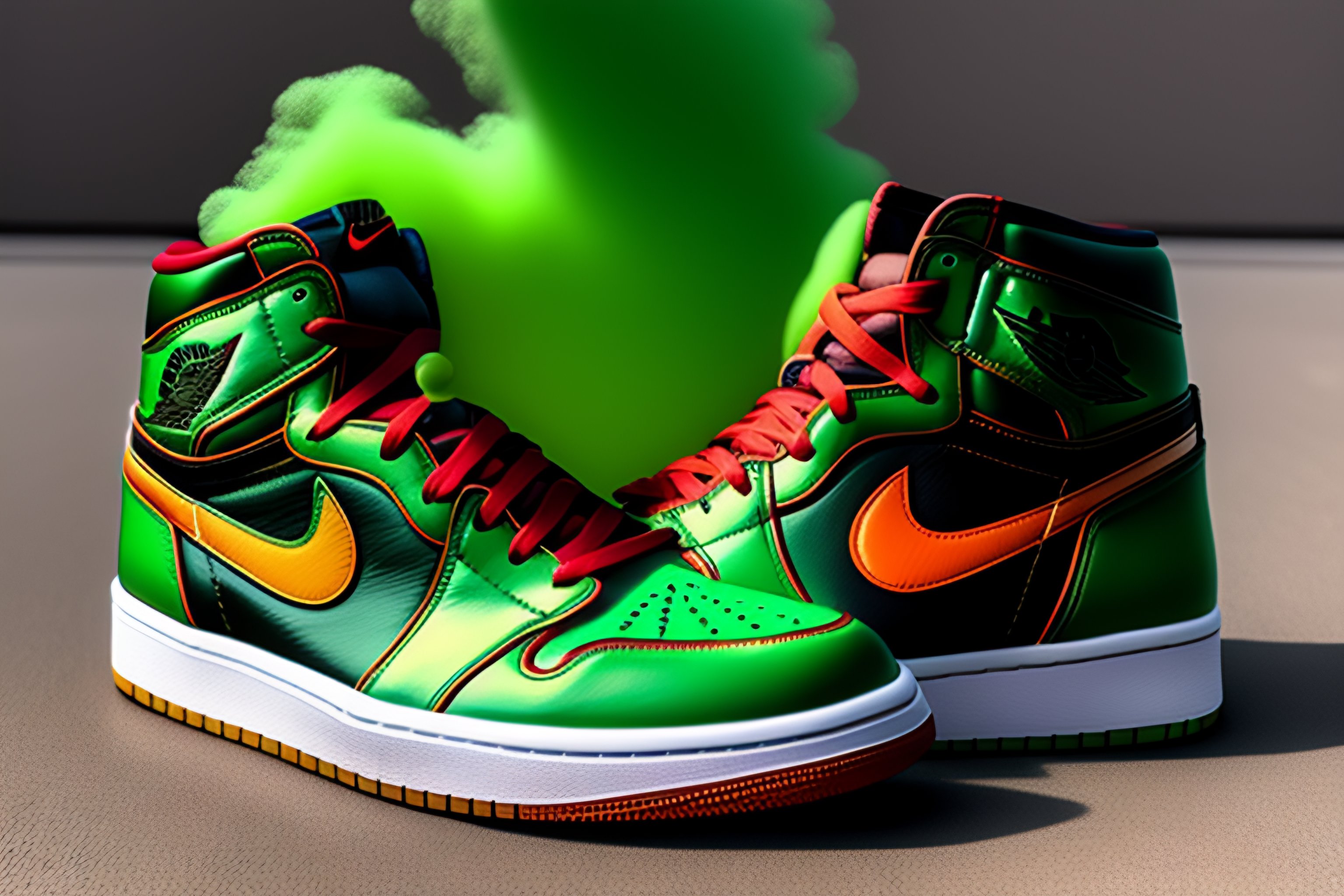 Nike jordan 1 "chicago" colorway made of marijuana leaves, marijuana leaf pattern on shoe, green cloud background, green smoke, cannabis