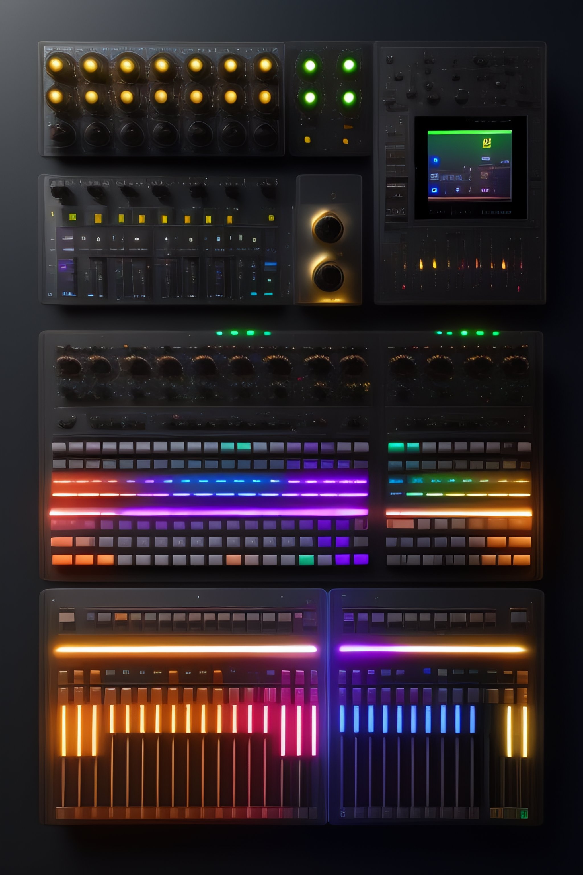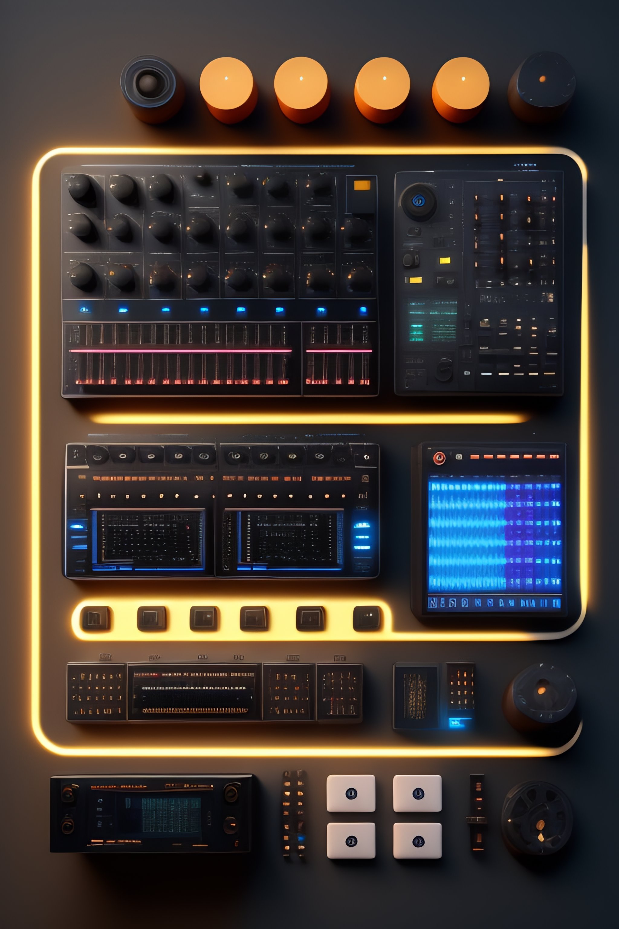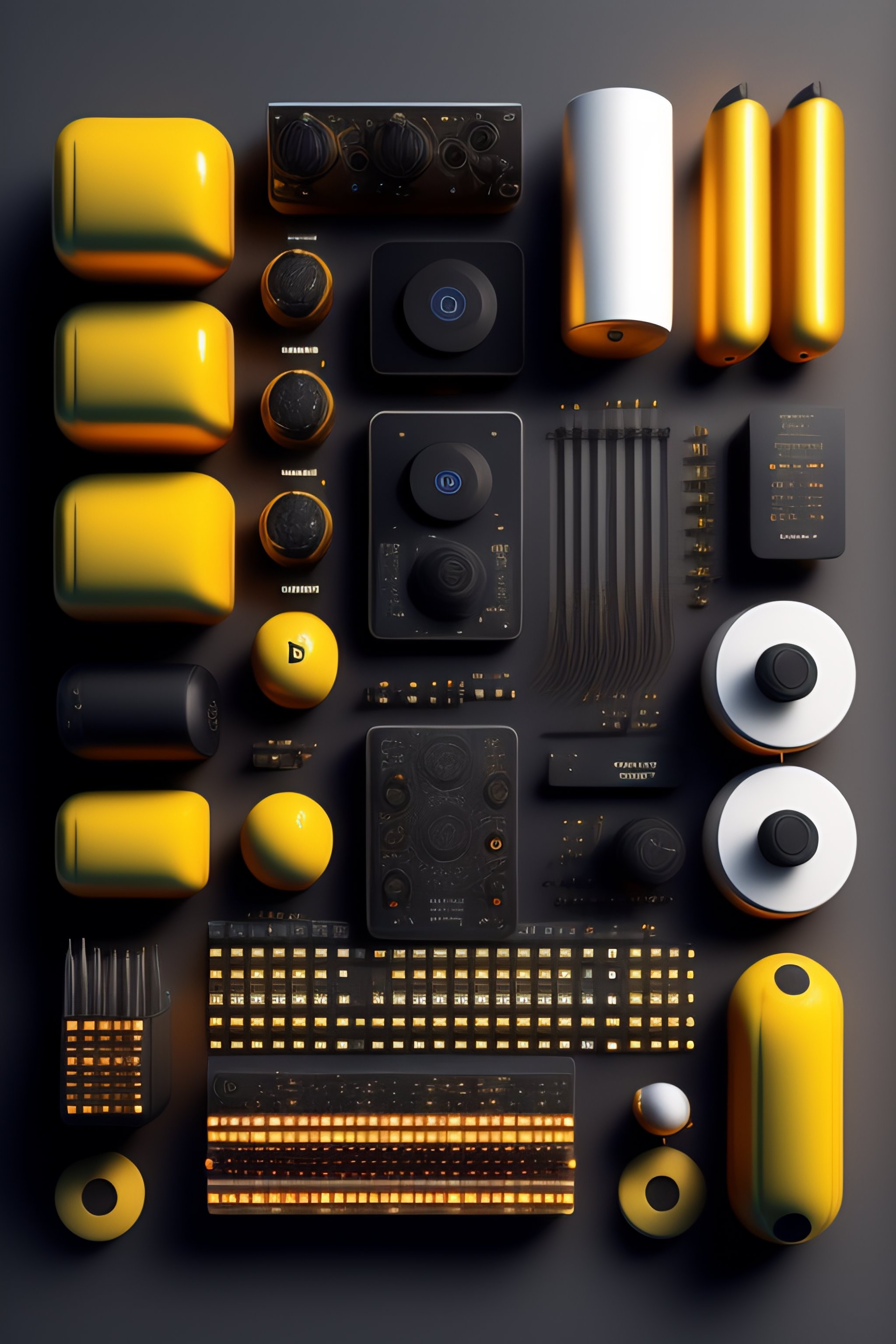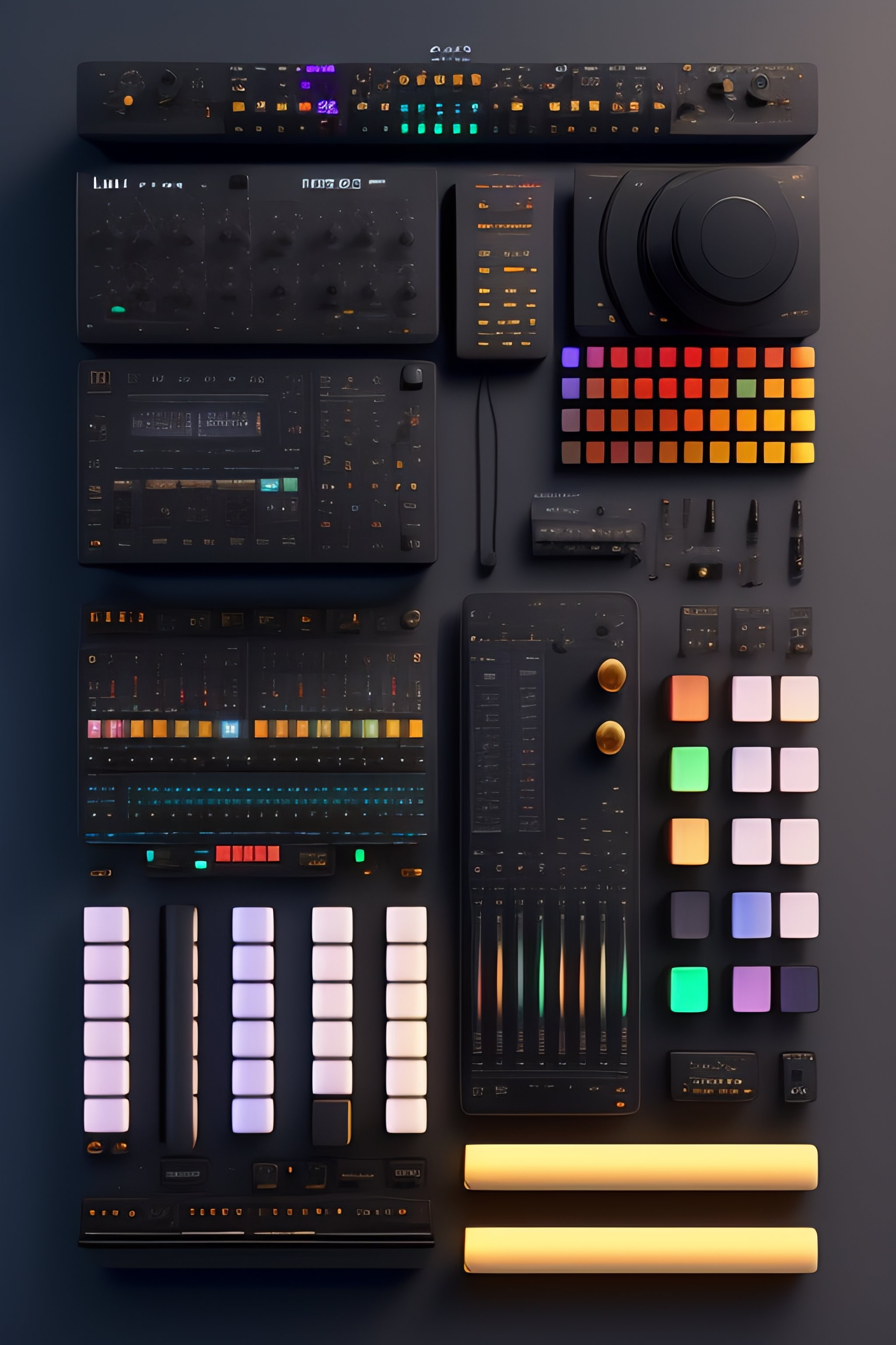 Midi controller cdj, costumes and props, knolling, knolling layout, deconstruction, highly detailed, depth, many parts, lumen render, 8k