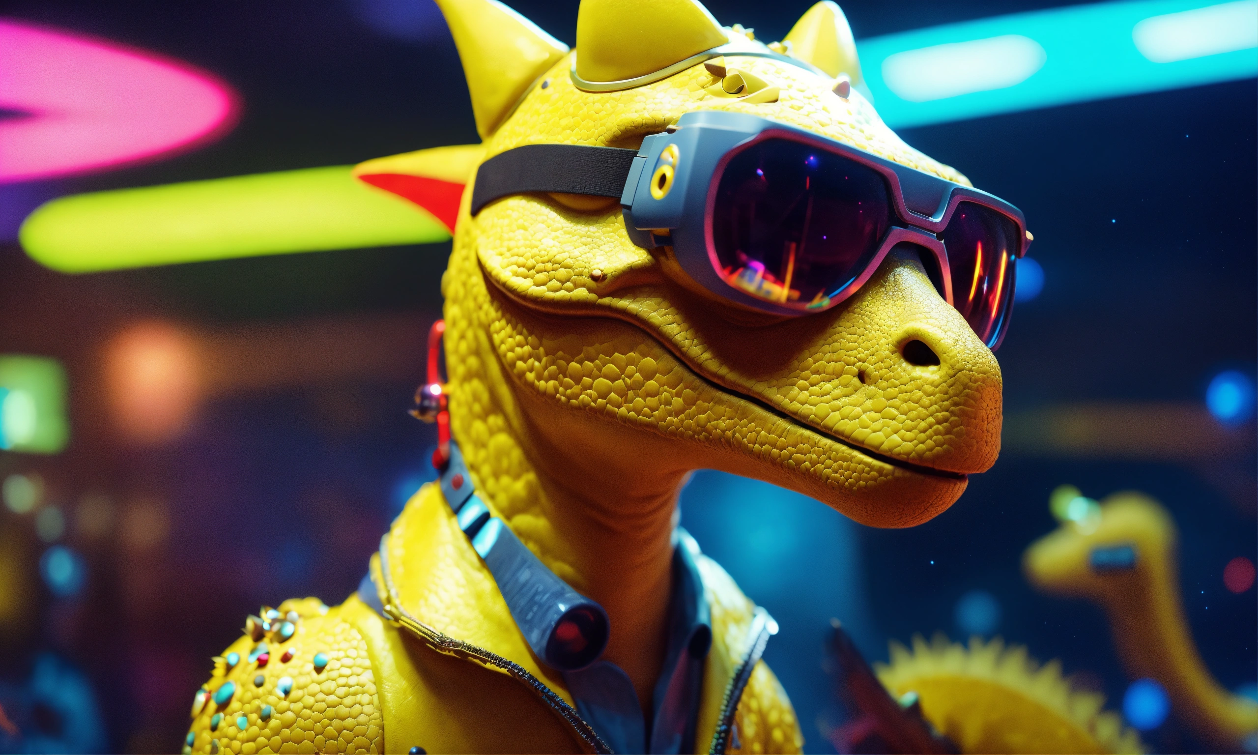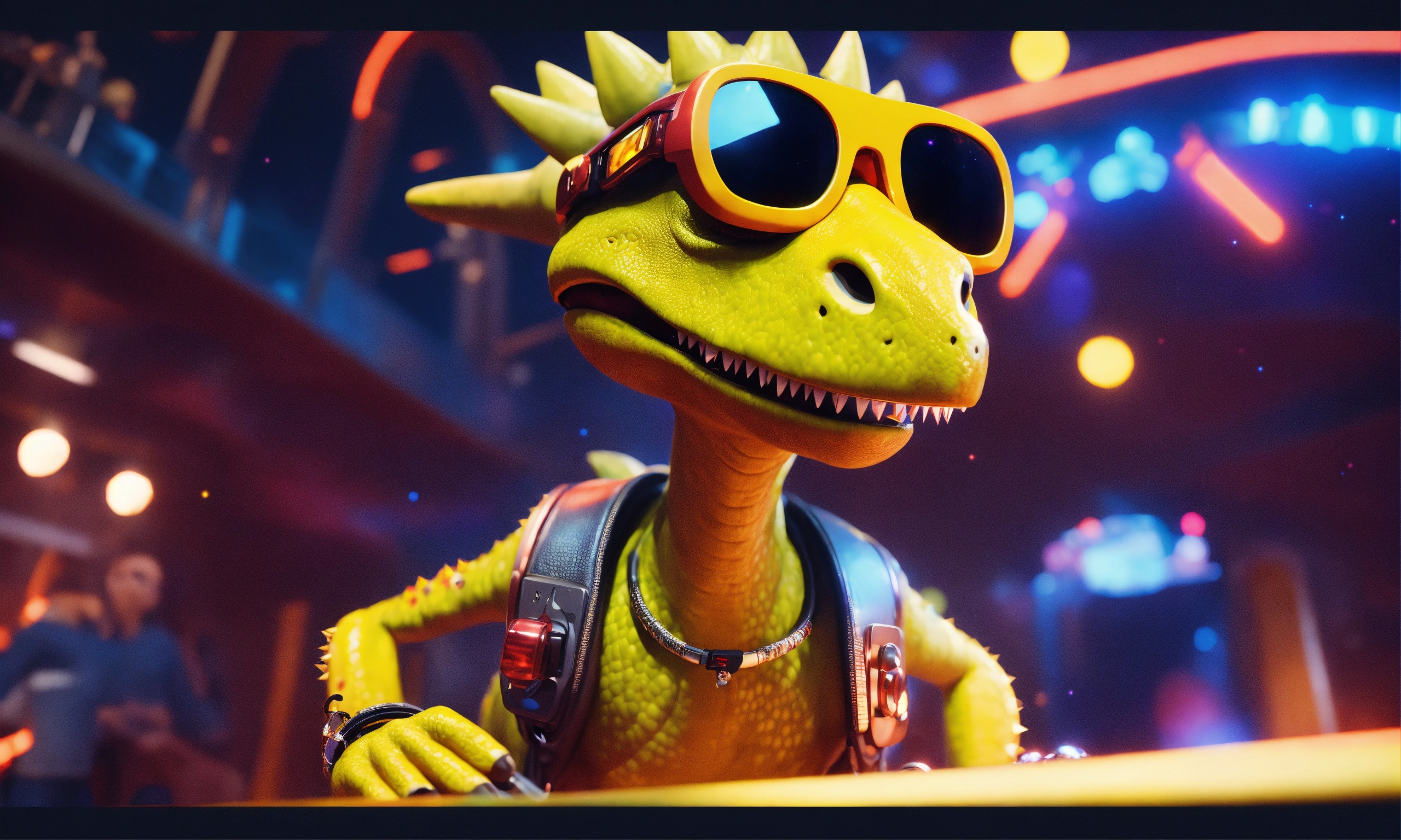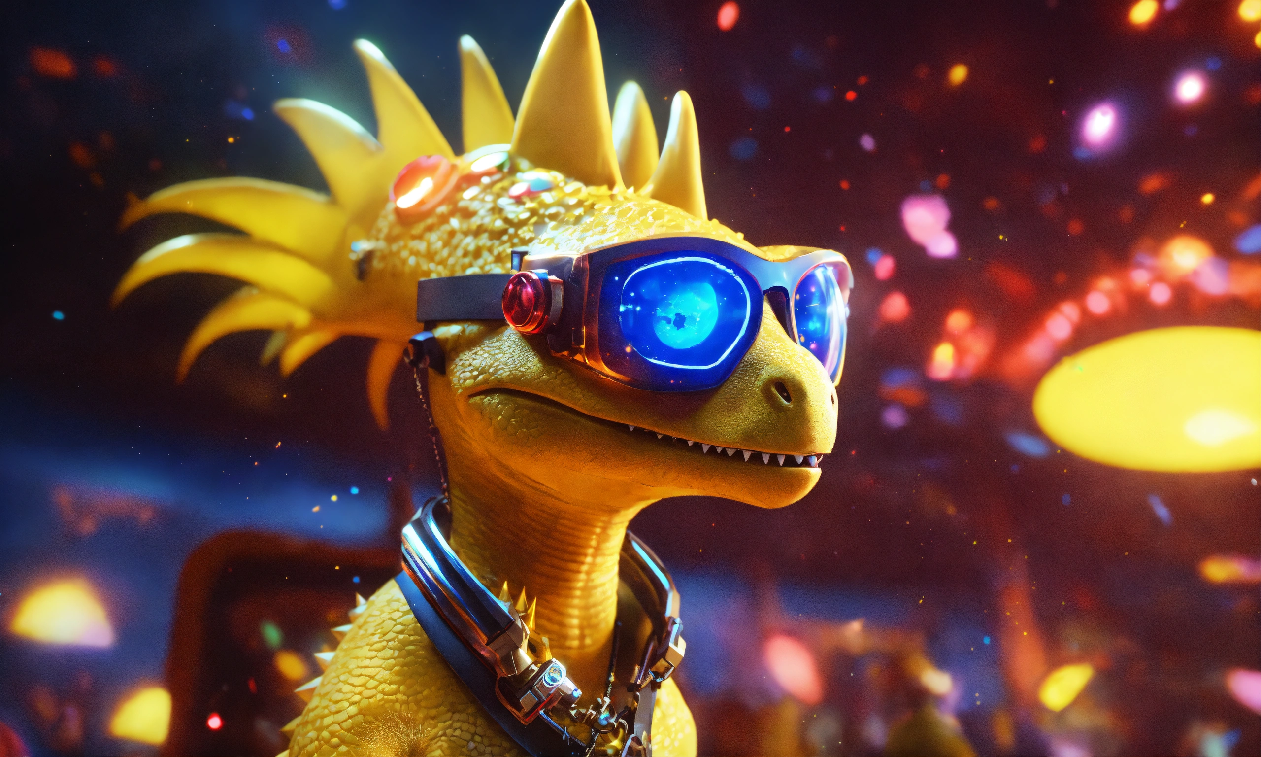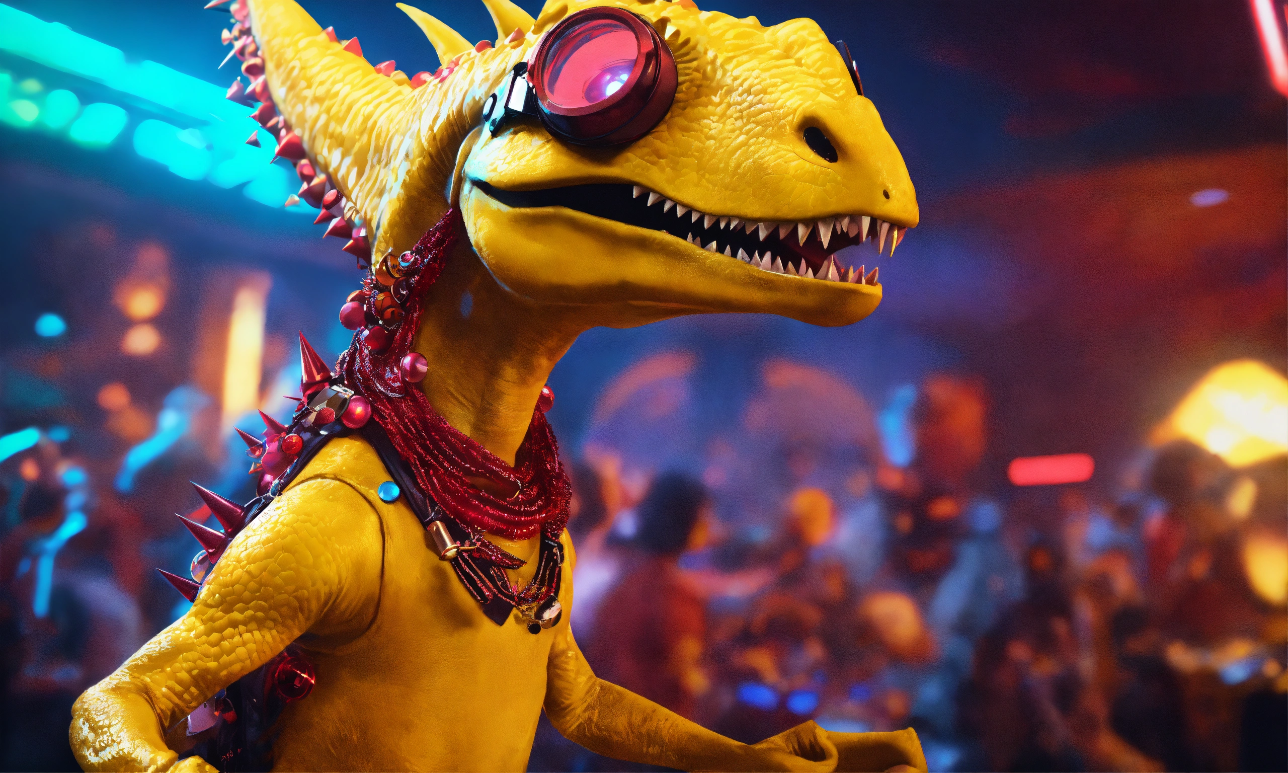 Close up on huge adorable stylish yellow alien cartoon dinosaur with red spots and spikes, and wearing hi-tech jewelry and cool space glasses, playing a long frequency blaster with his band in a cosmic nightclub on mercury, people from different galaxies dancing and enjoying the beats, pixar, unreal engine, 8k.