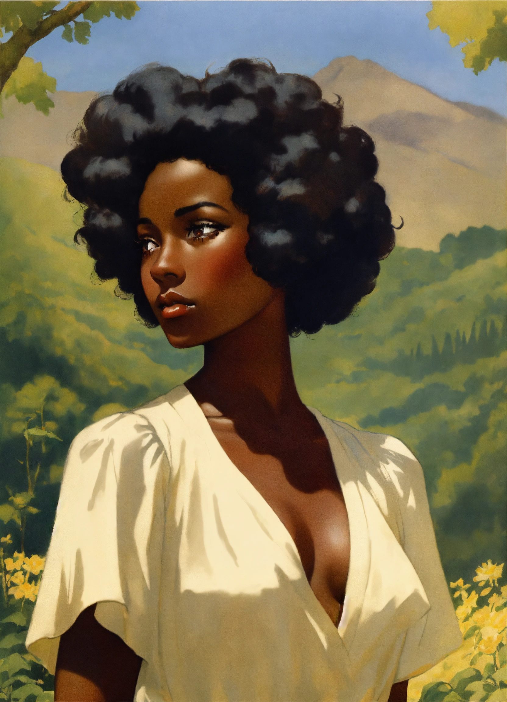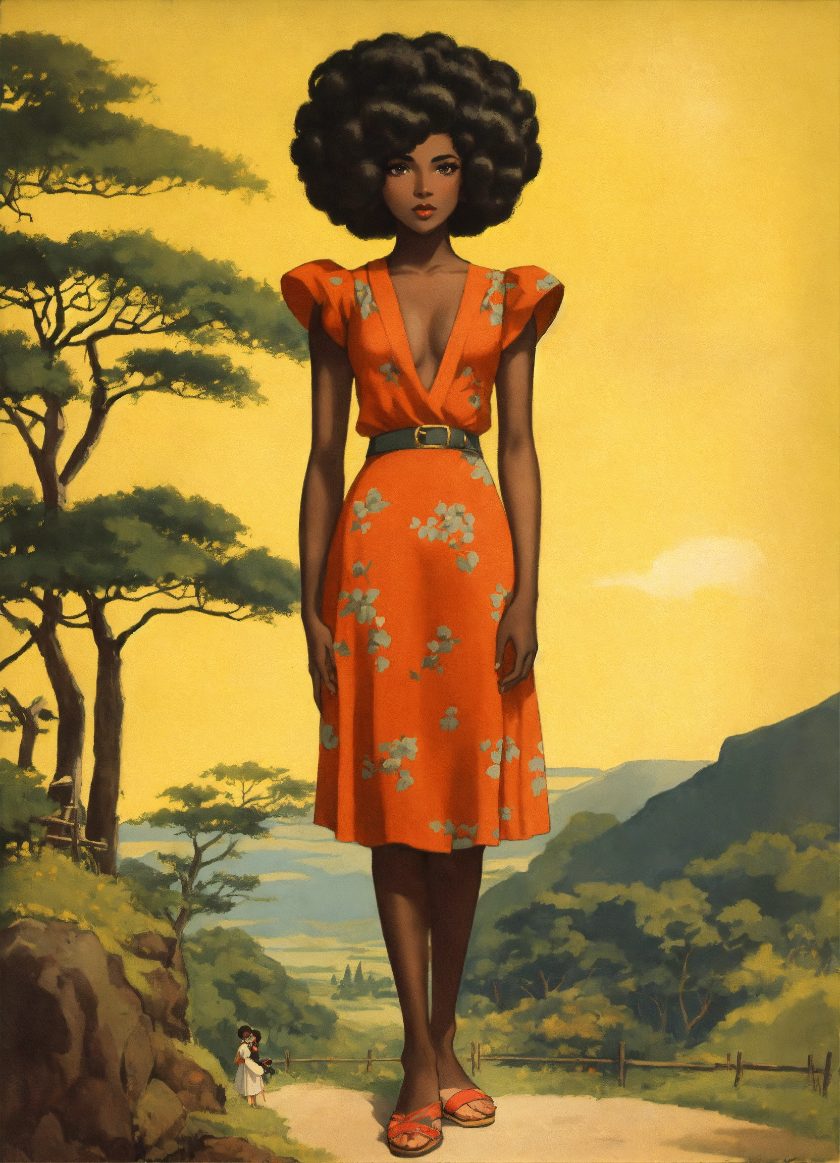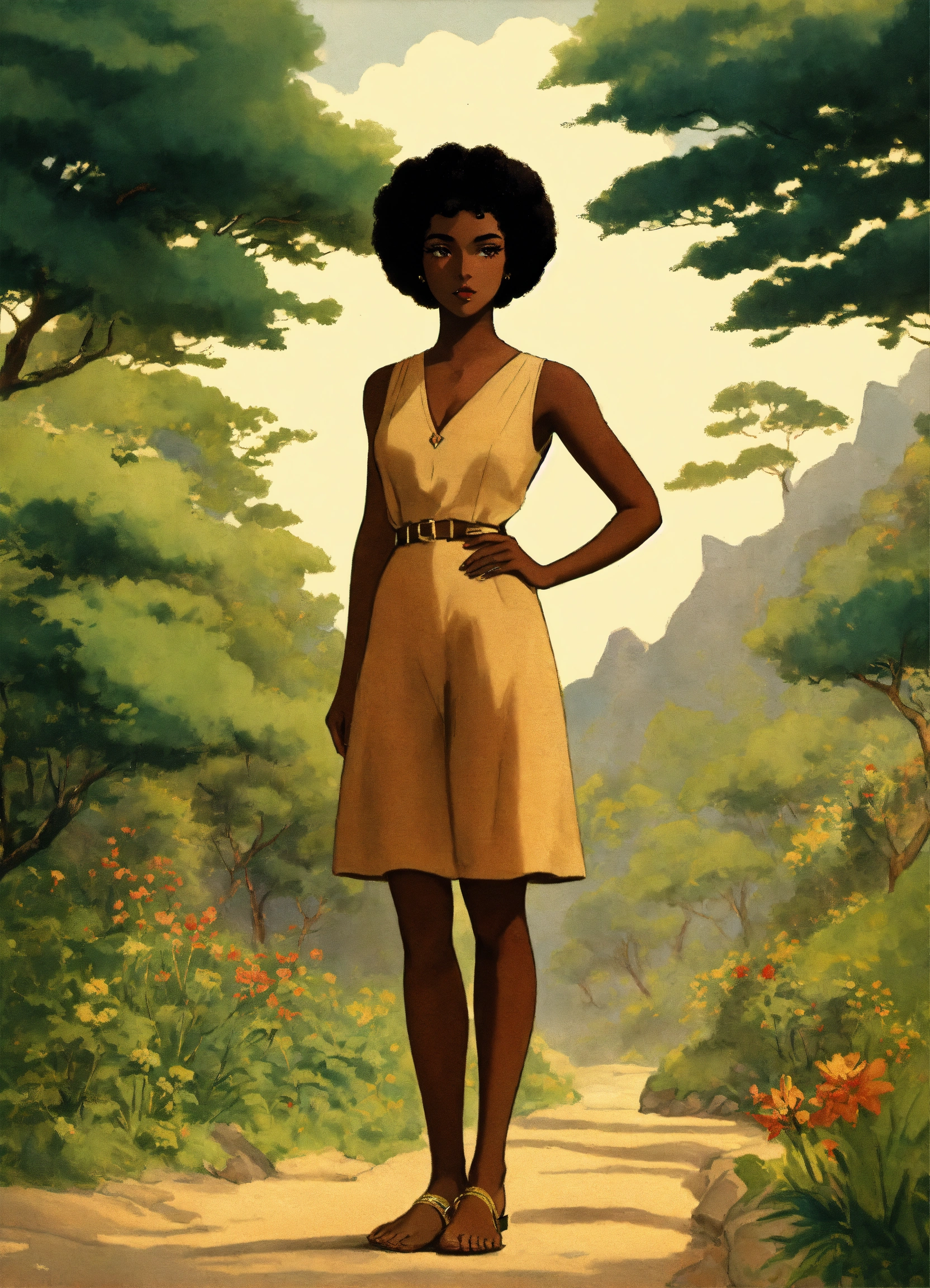 A 1930s head to toe picture of an extremely beautiful dark black-skinned black woman with 1930s afro hairstyle, very wide-nose, doe eyes, full lips standing in a glen with bare feet by studio ghibli.