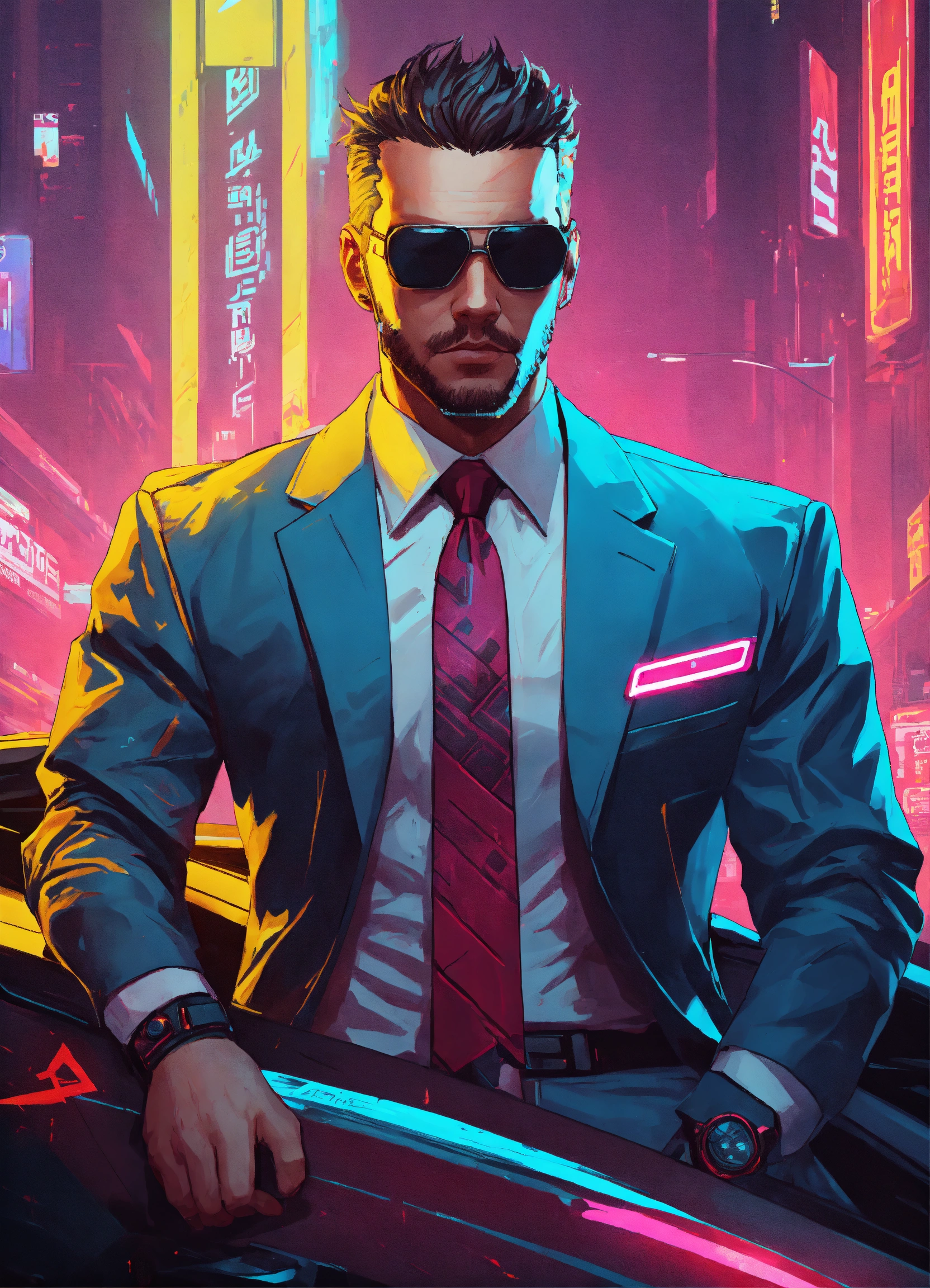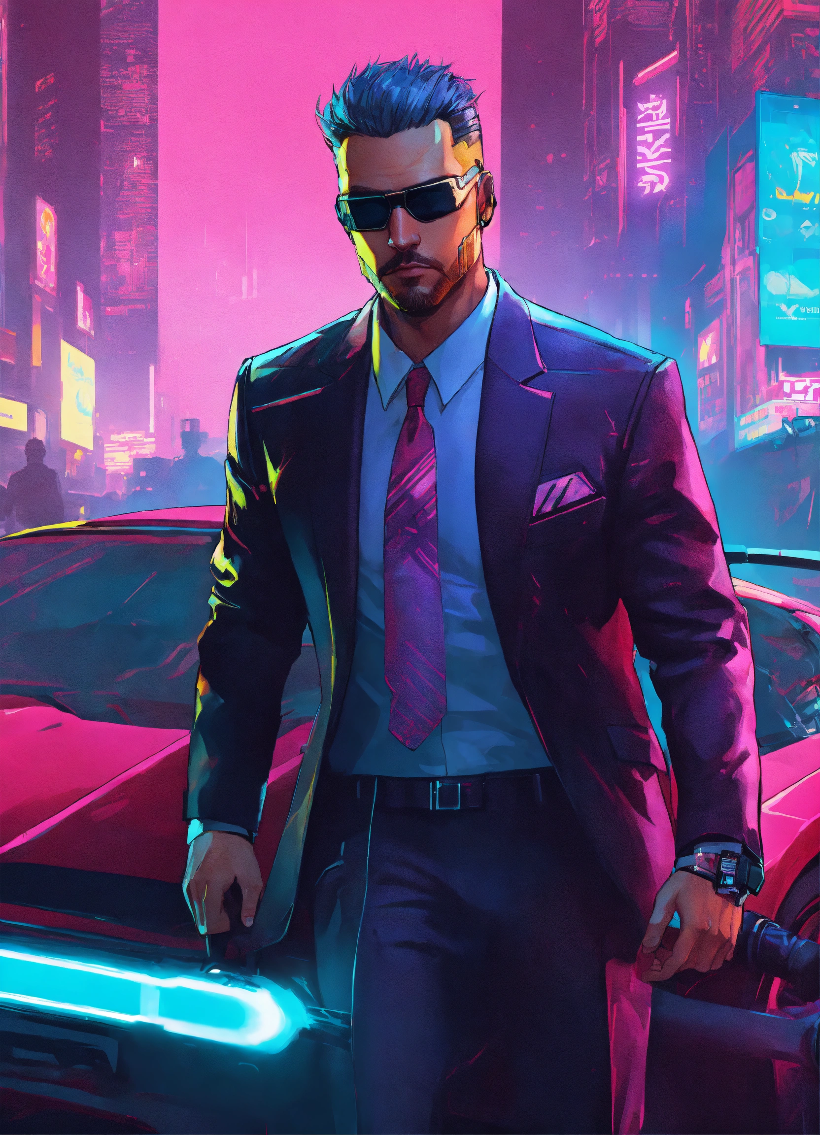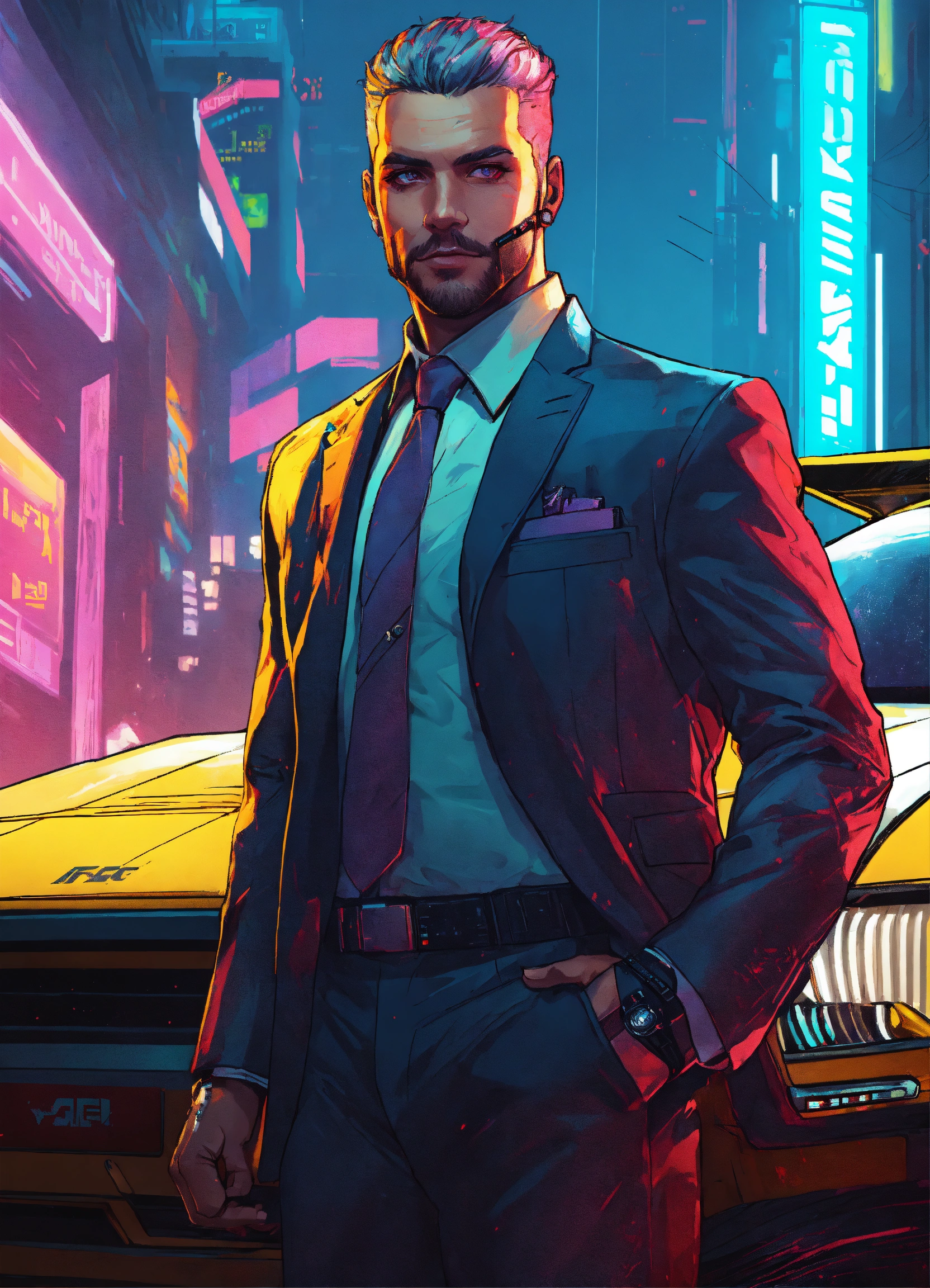 Male cyberpunk corporate driver in a cheap business suit