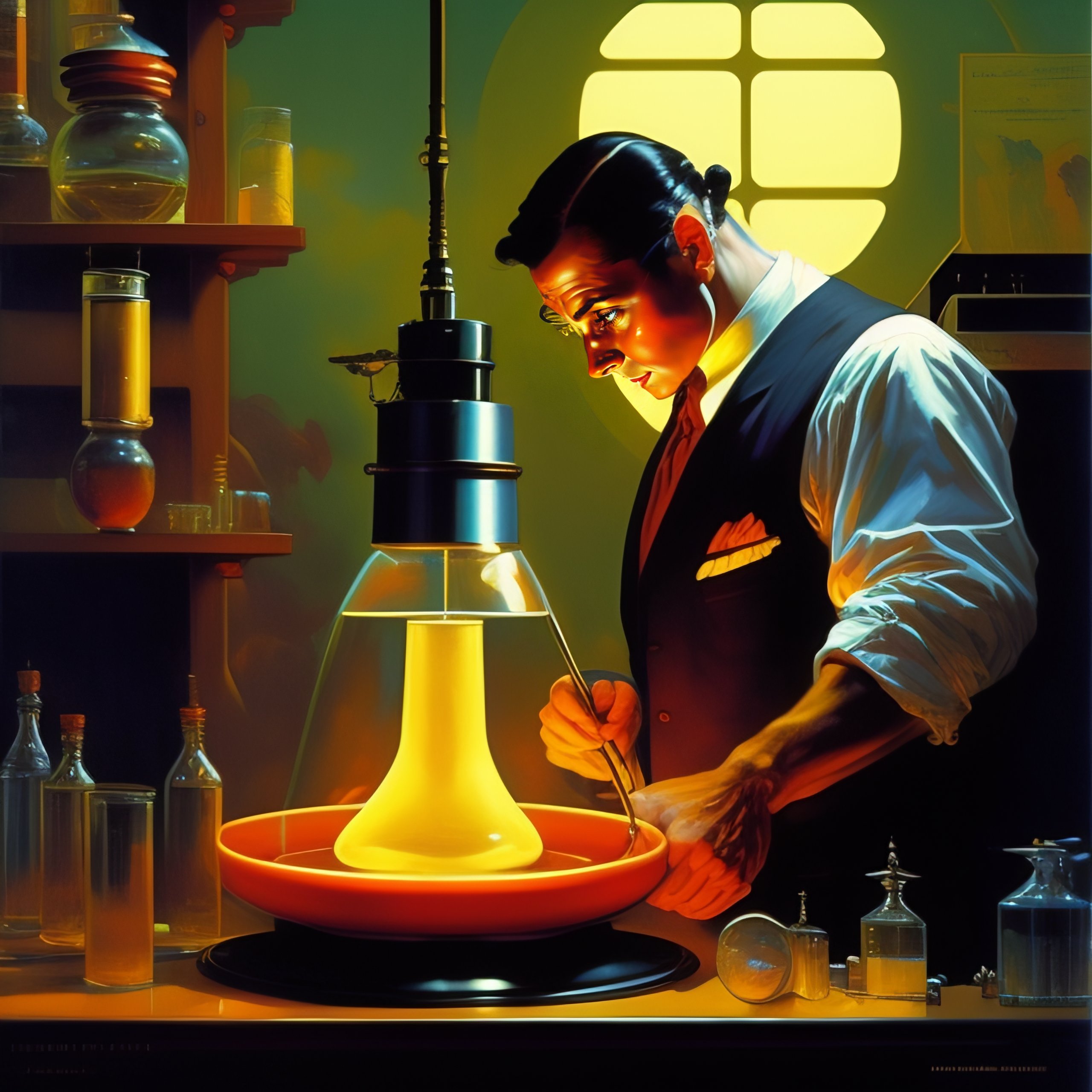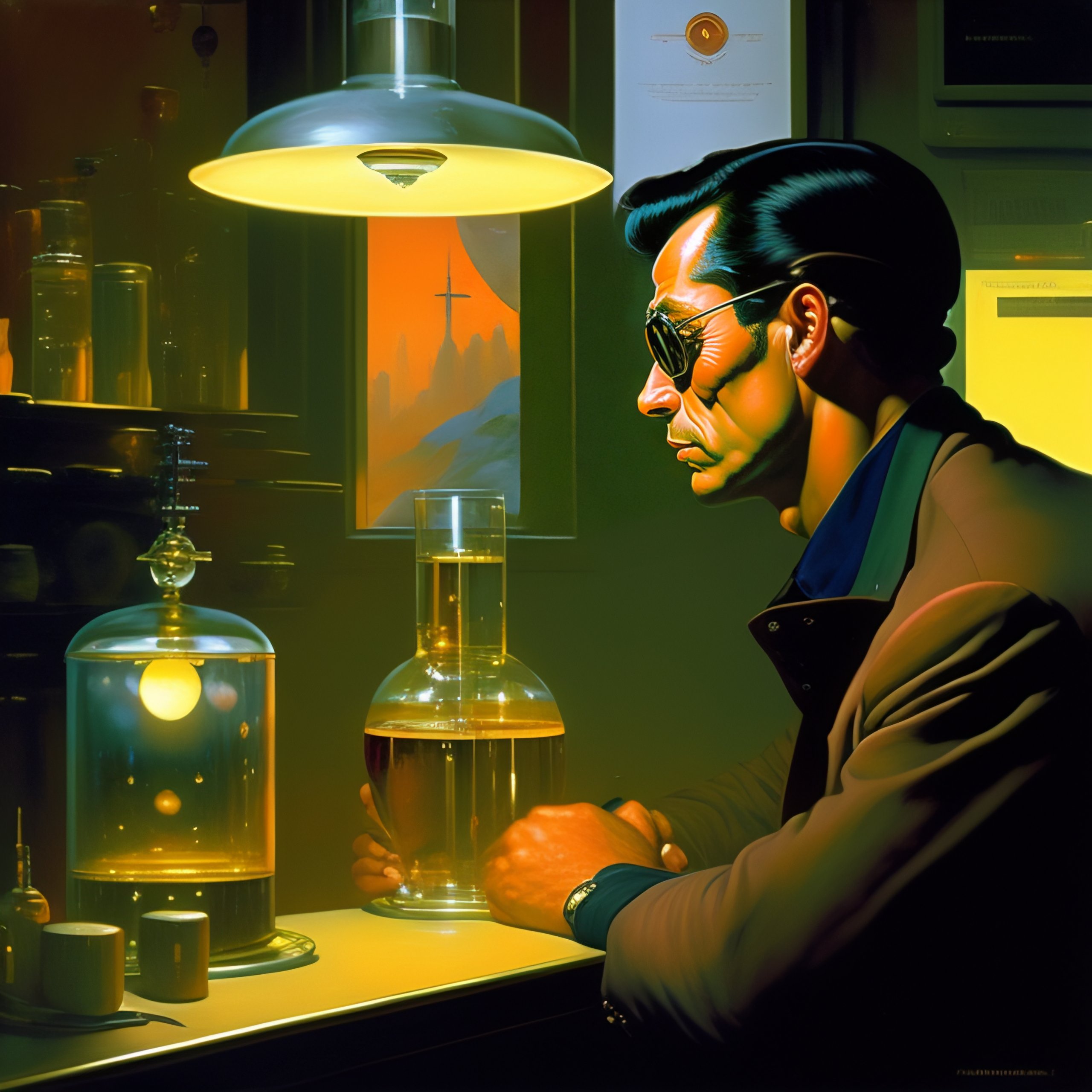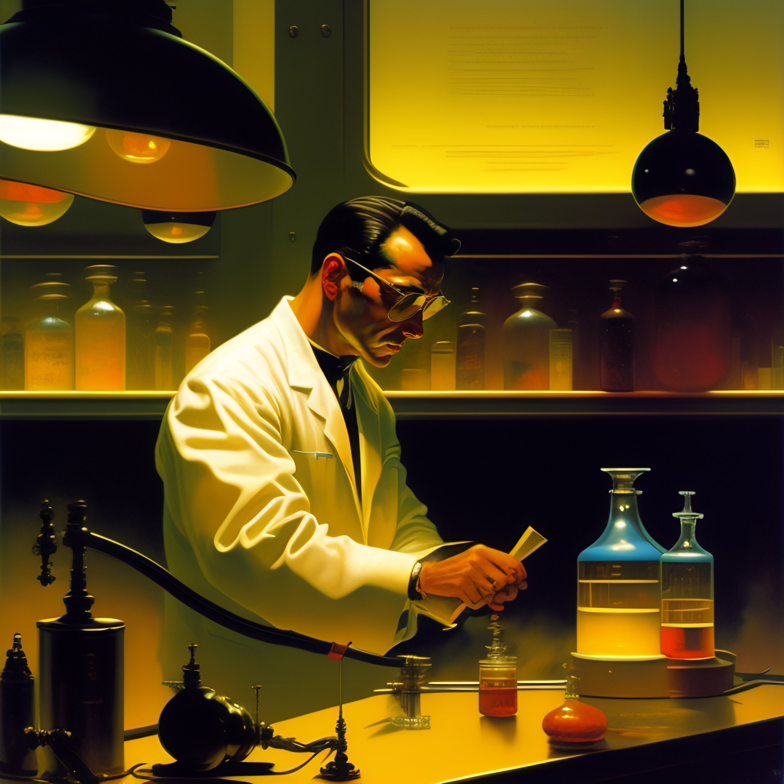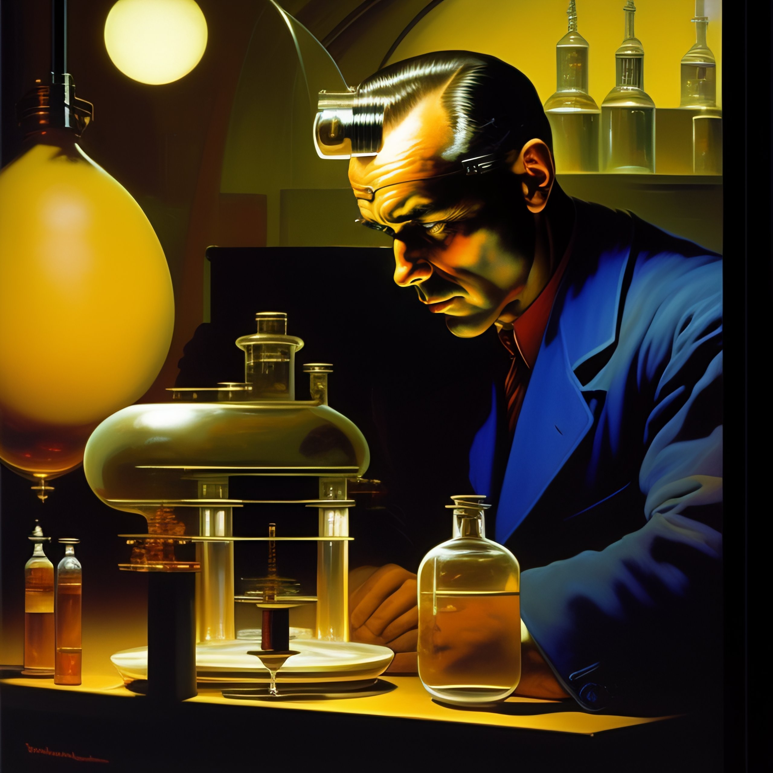A scientist in a laboratory from another universe. painting by norman rockwell, frank frazetta, and syd mead. rich colors, high contrast, gloomy atmosphere, dark background.
