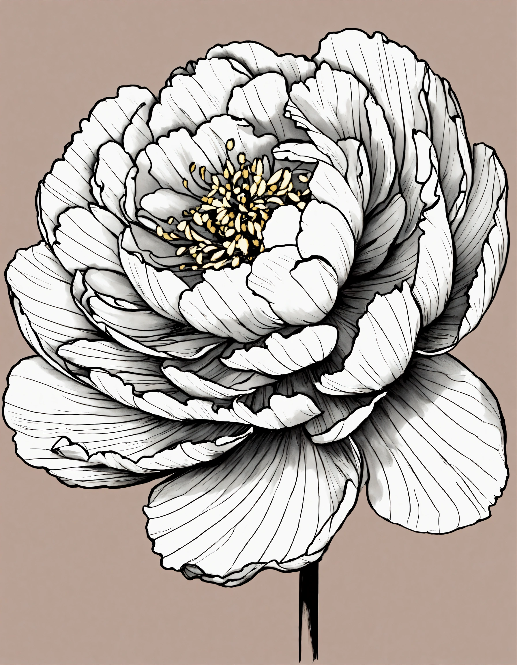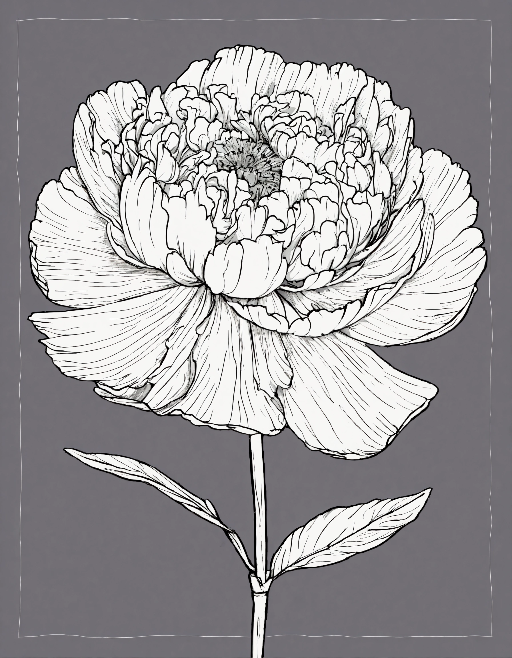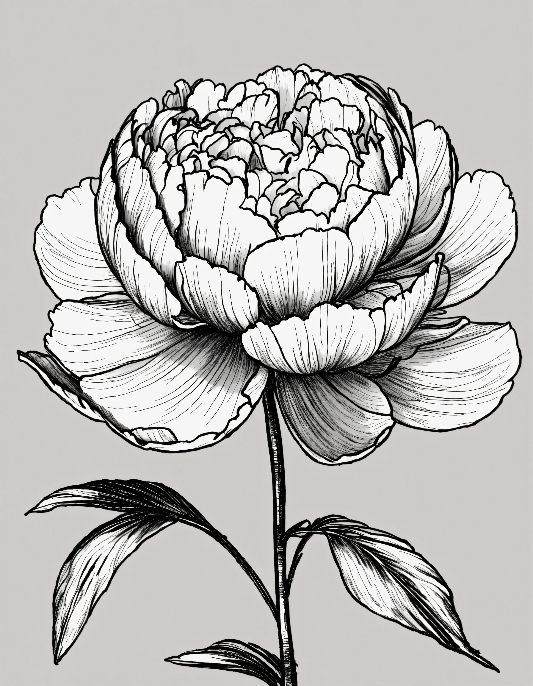 Single peony flower with distinct black outline sketch, white offset shadow of the flower in white scribble line drawing